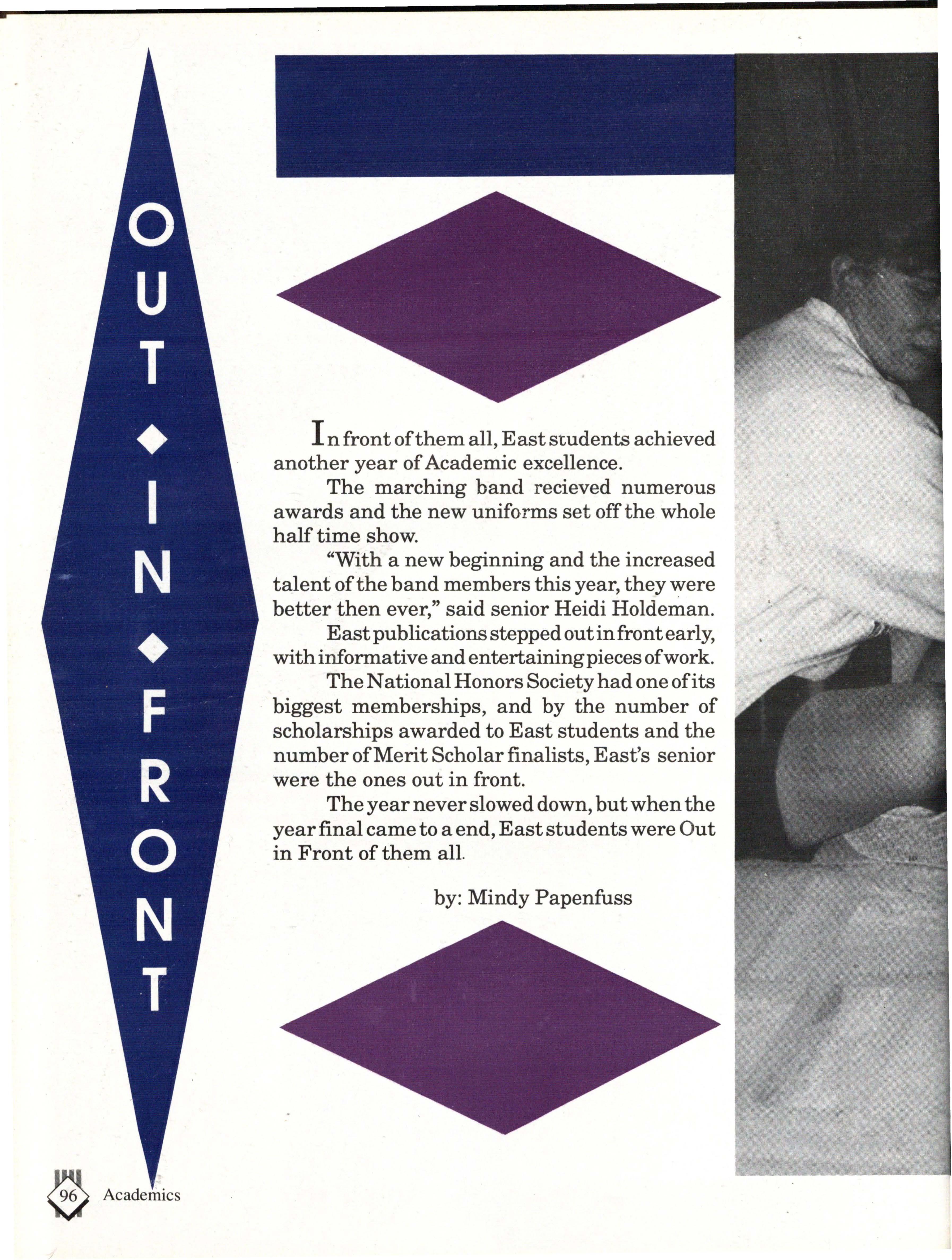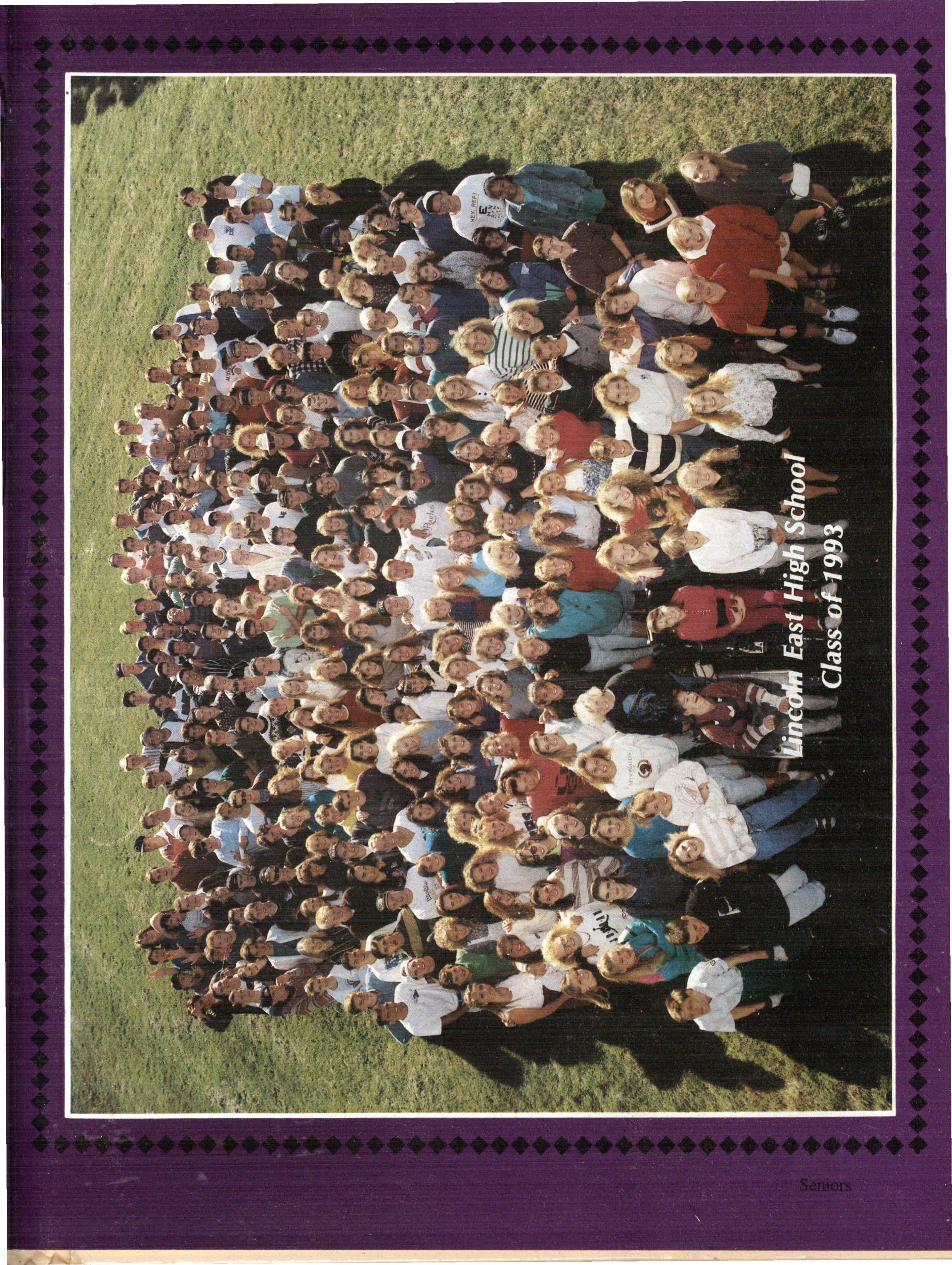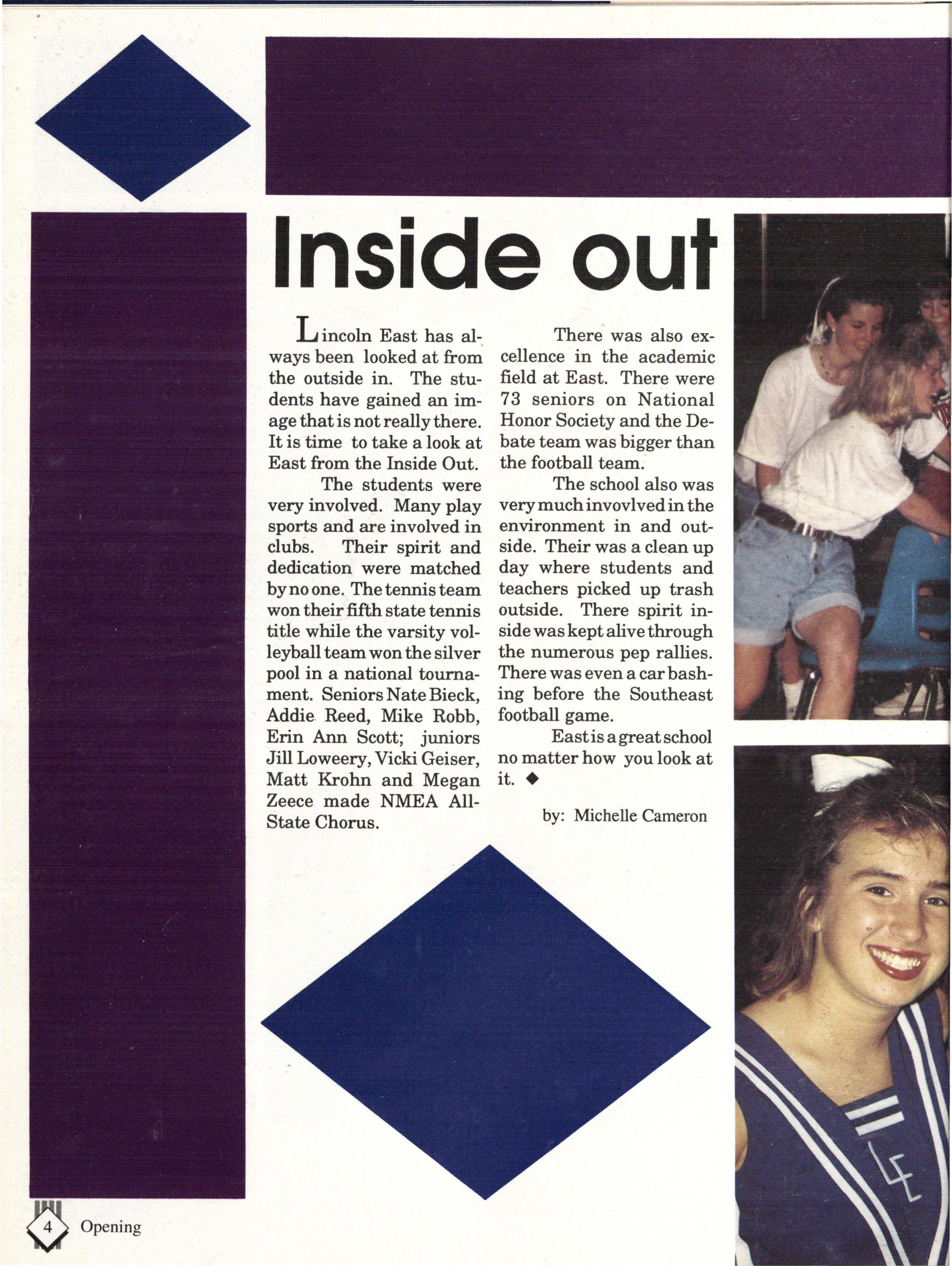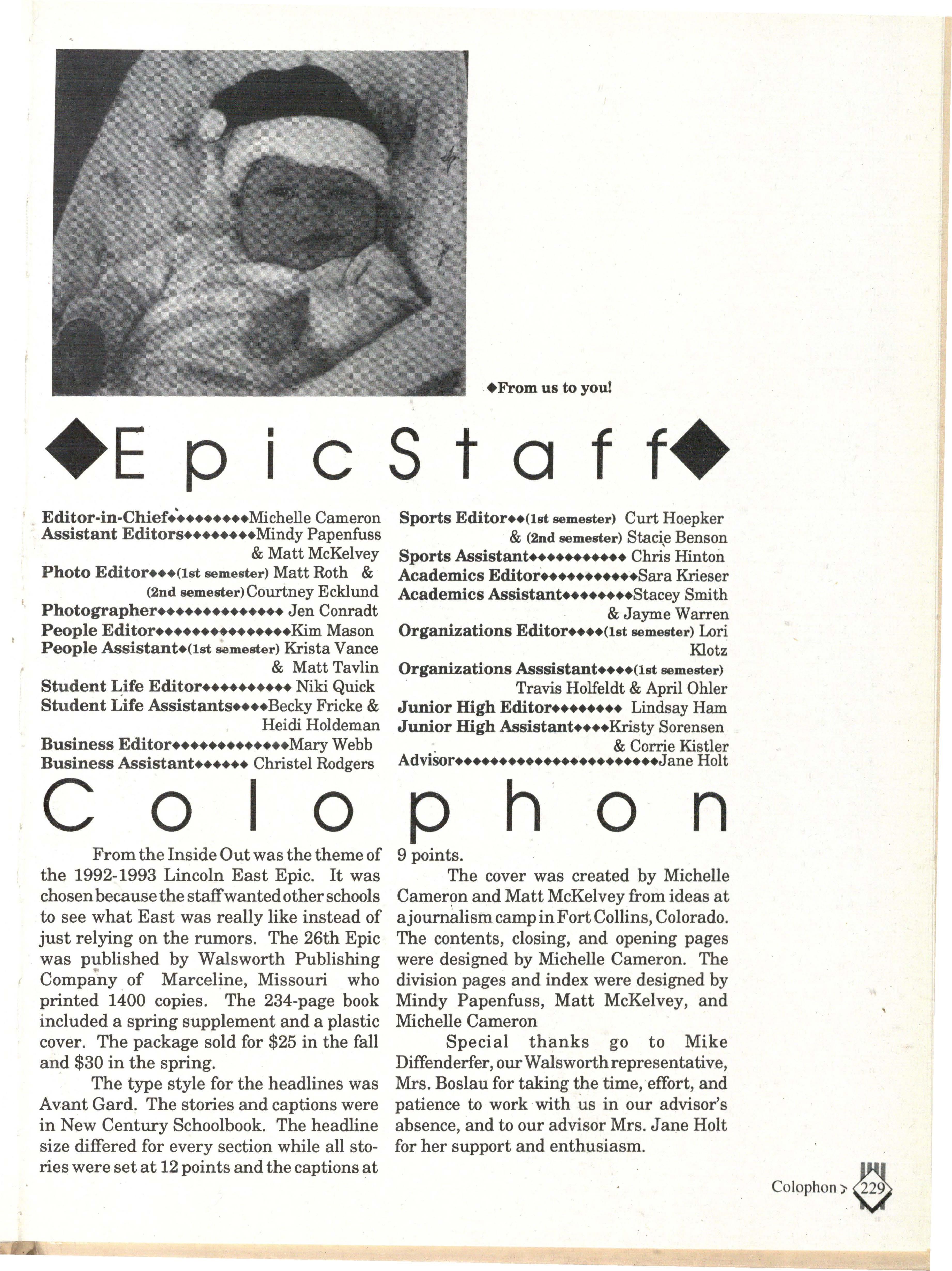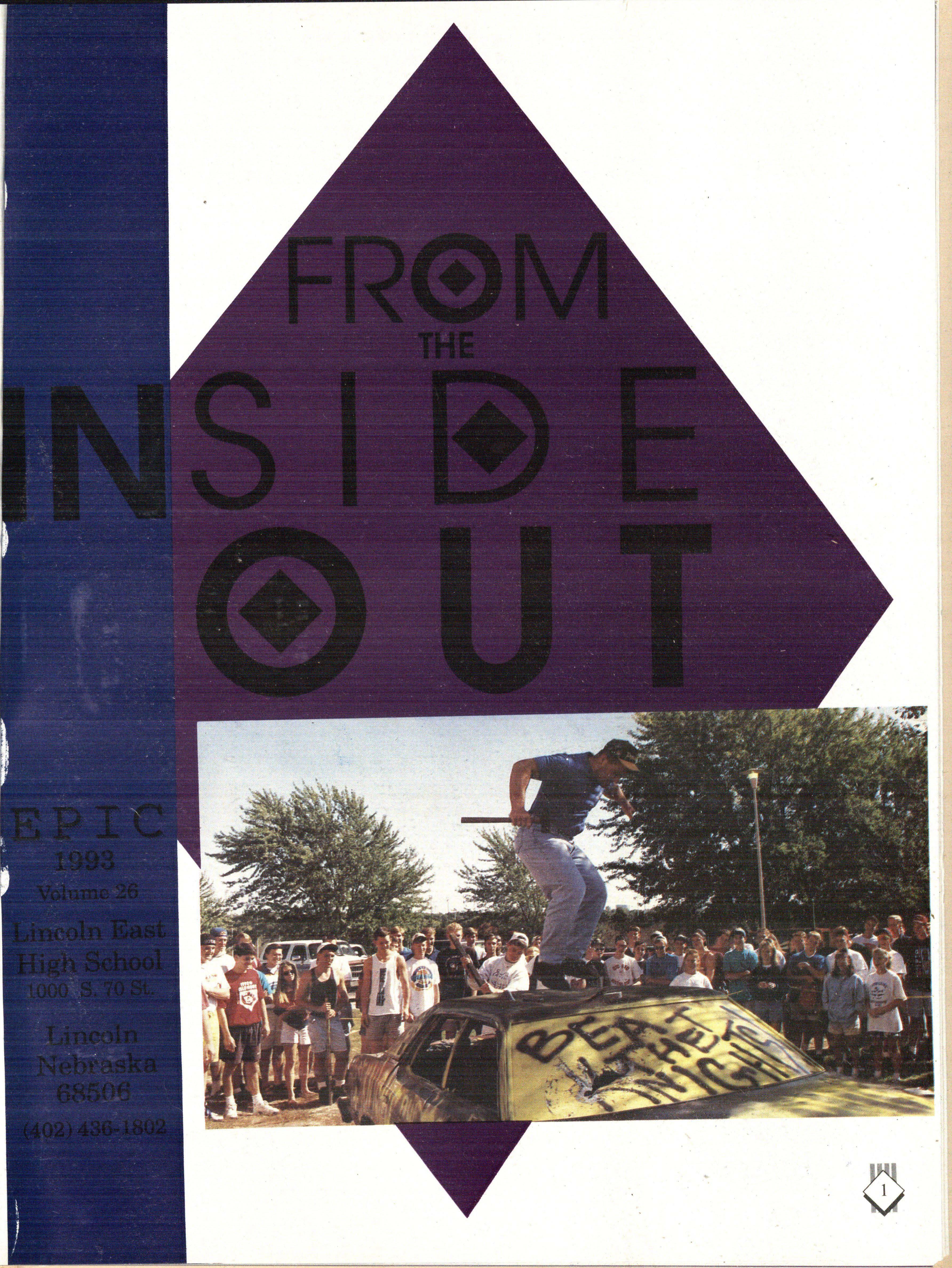 From the Inside Out was the theme of the 1992-1993 Lincoln East Epic. It was chosen because the staffwanted other schools to see what East was really like instead of just relying on the rumors. The 26th Epic was published by Walsworth Publishing 1 Company of Marceline, Missouri who printed 1400 copies. The 234-page book included a spring supplement and a plastic cover. The package sold for $25 in the fall and $30 in the spring.