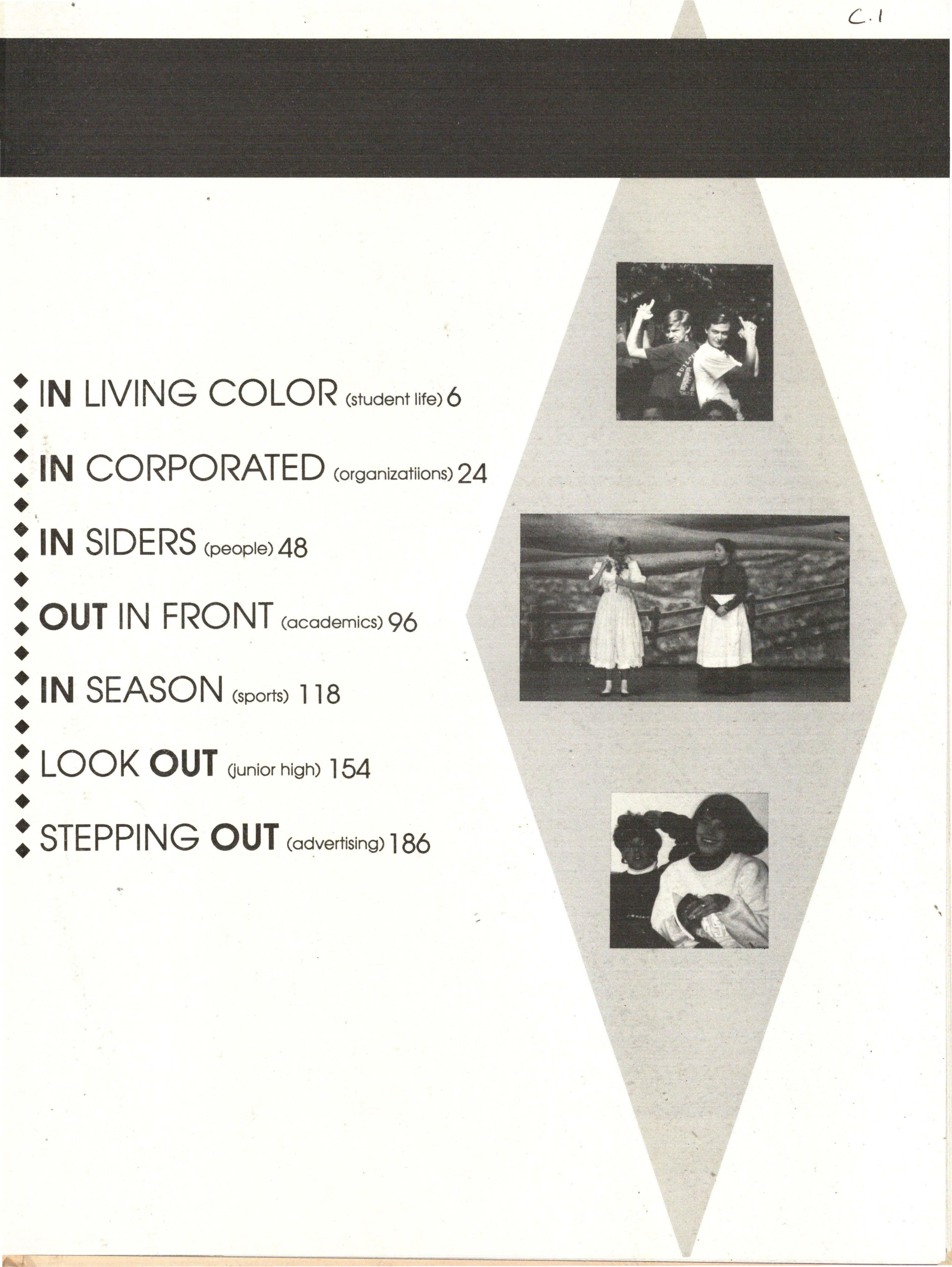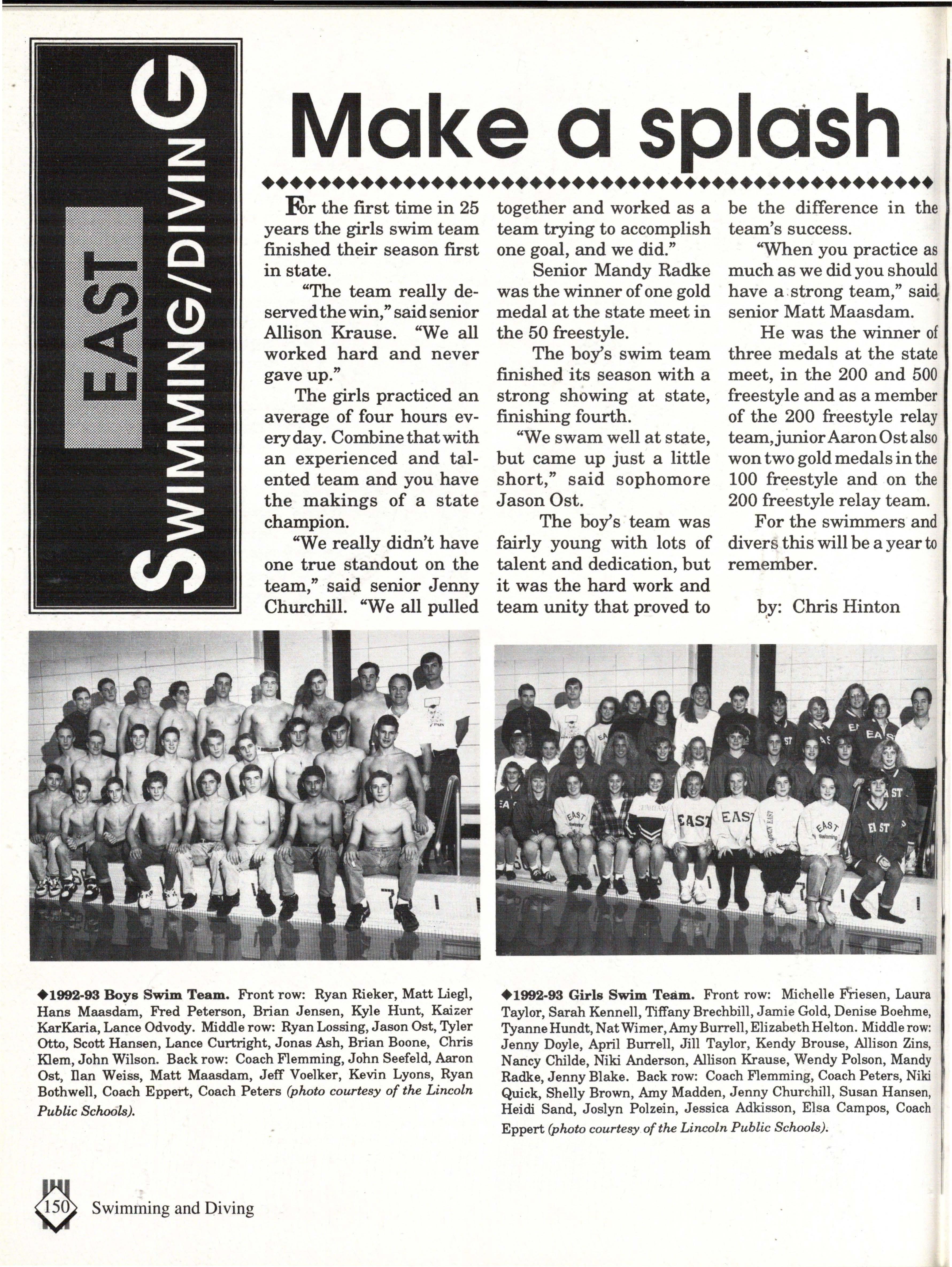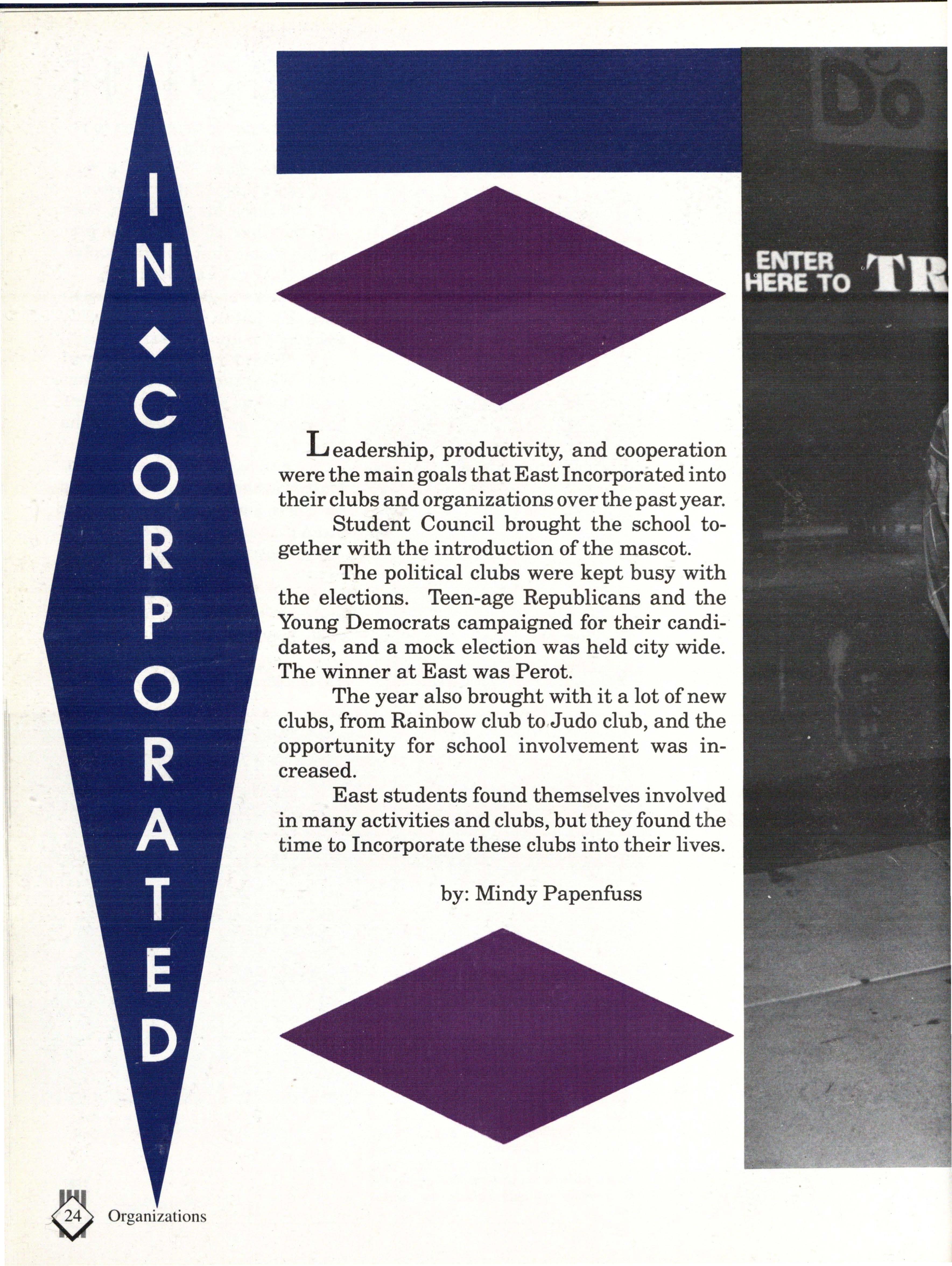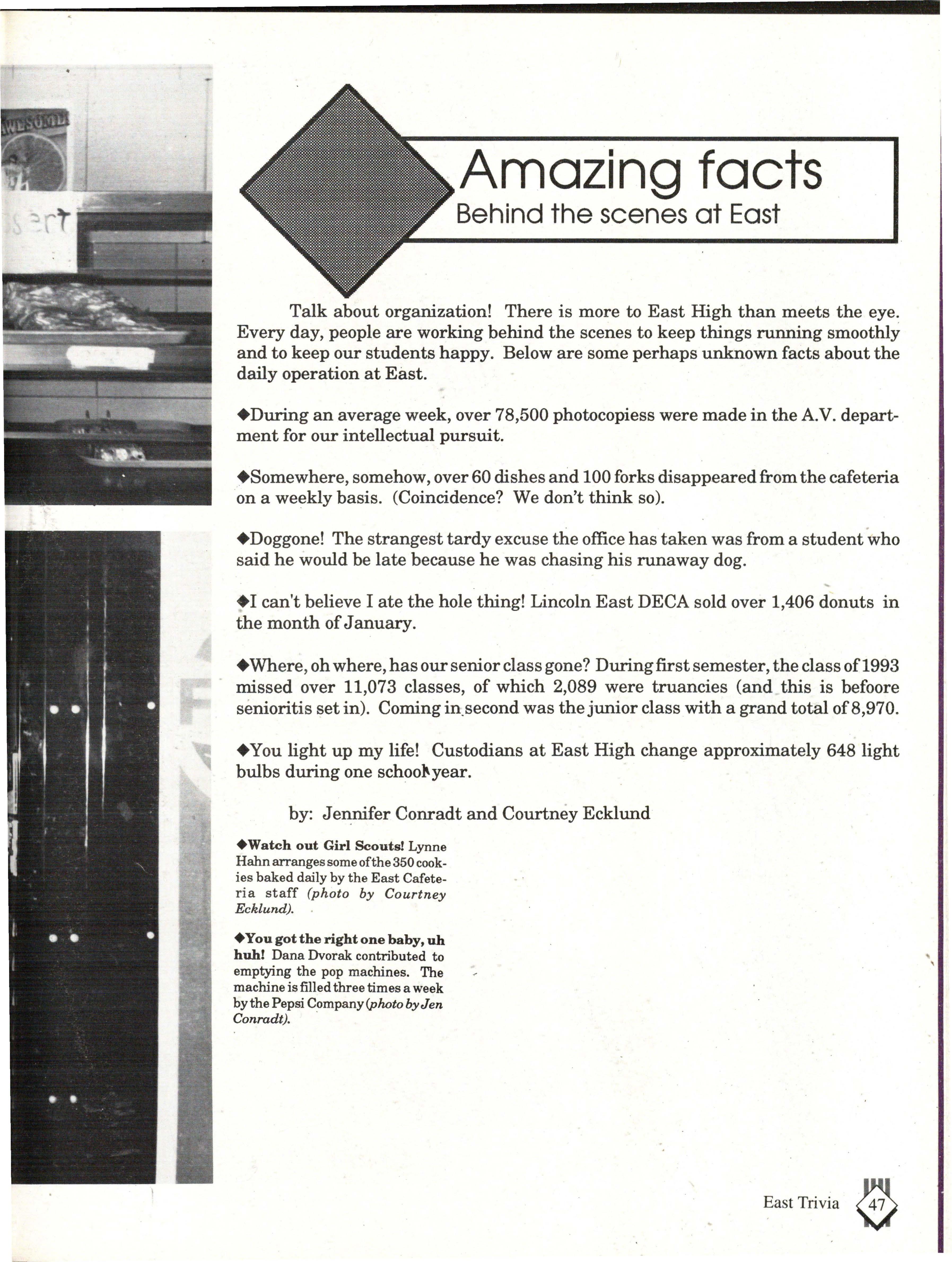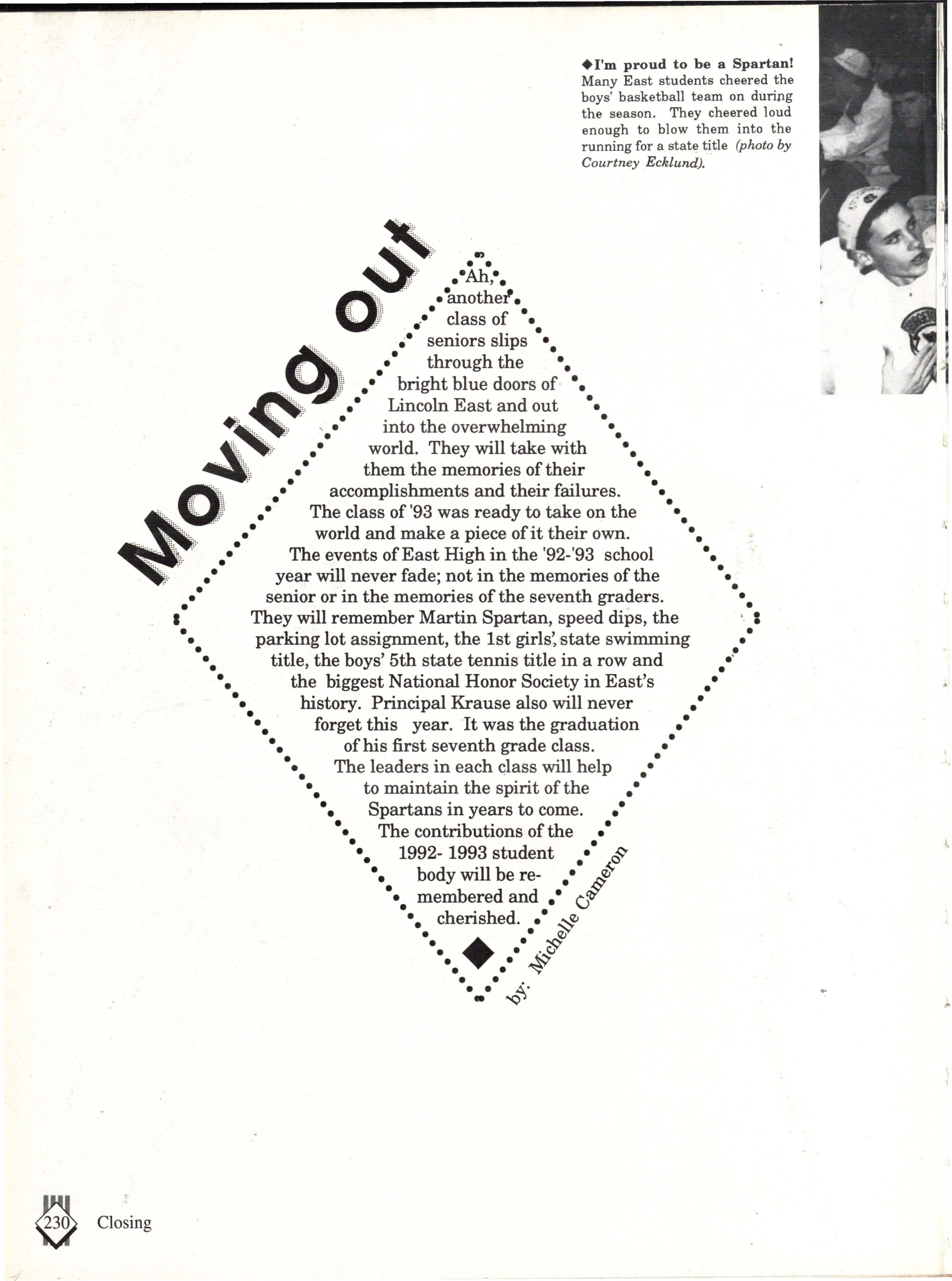 From the Inside Out was the theme of the 1992-1993 Lincoln East Epic. It was chosen because the staffwanted other schools to see what East was really like instead of just relying on the rumors. The 26th Epic was published by Walsworth Publishing 1 Company of Marceline, Missouri who printed 1400 copies. The 234-page book included a spring supplement and a plastic cover. The package sold for $25 in the fall and $30 in the spring.