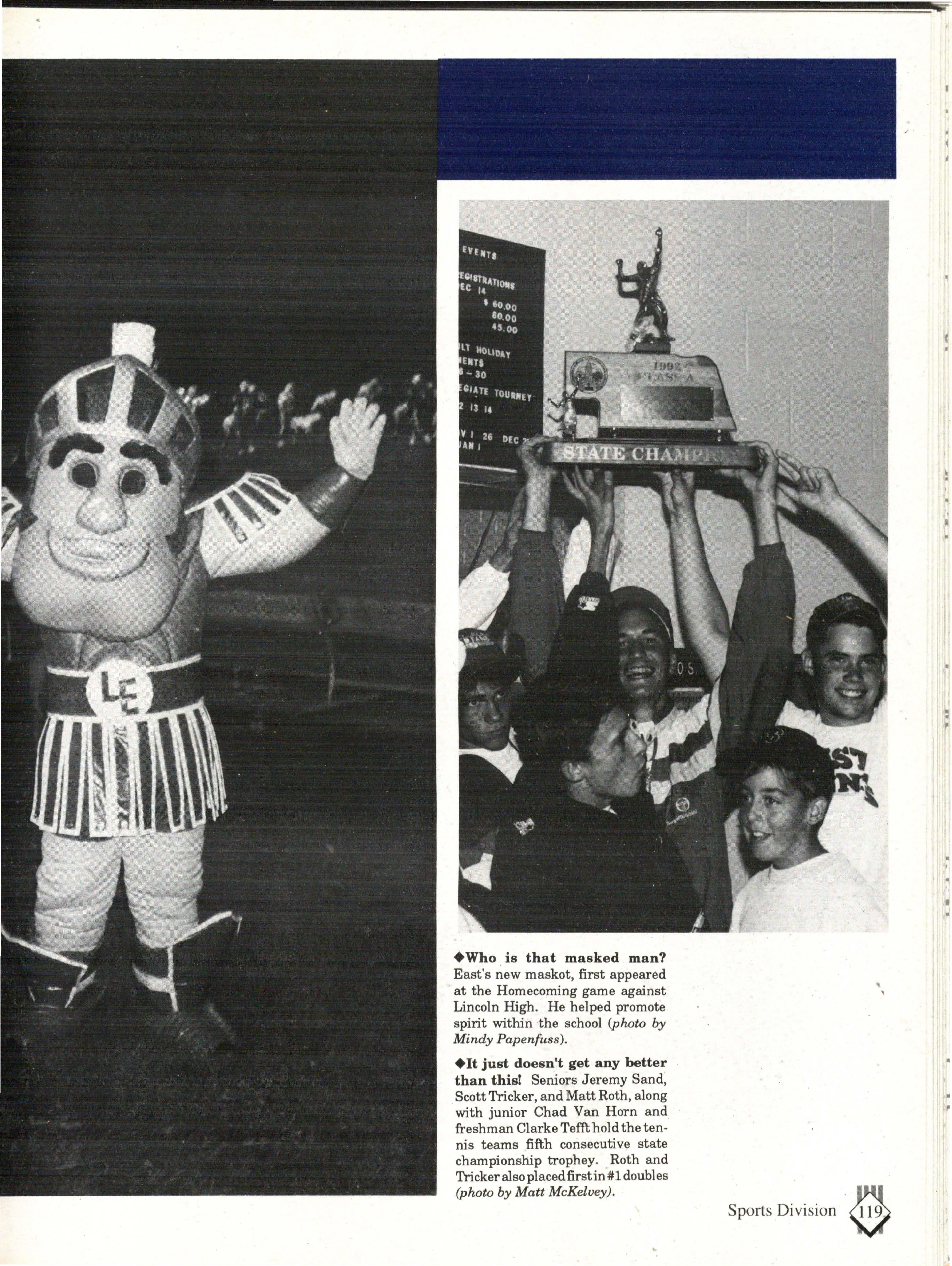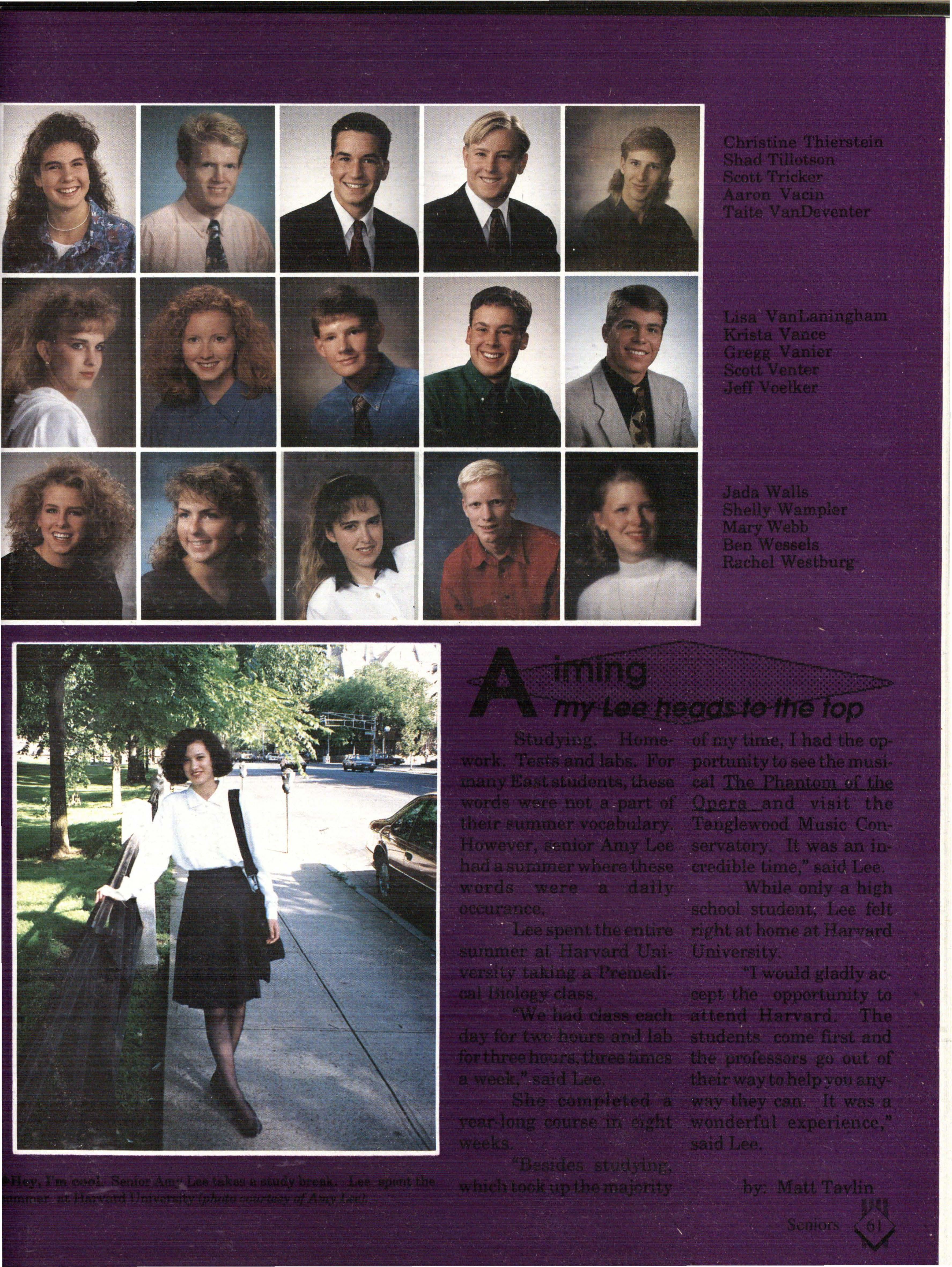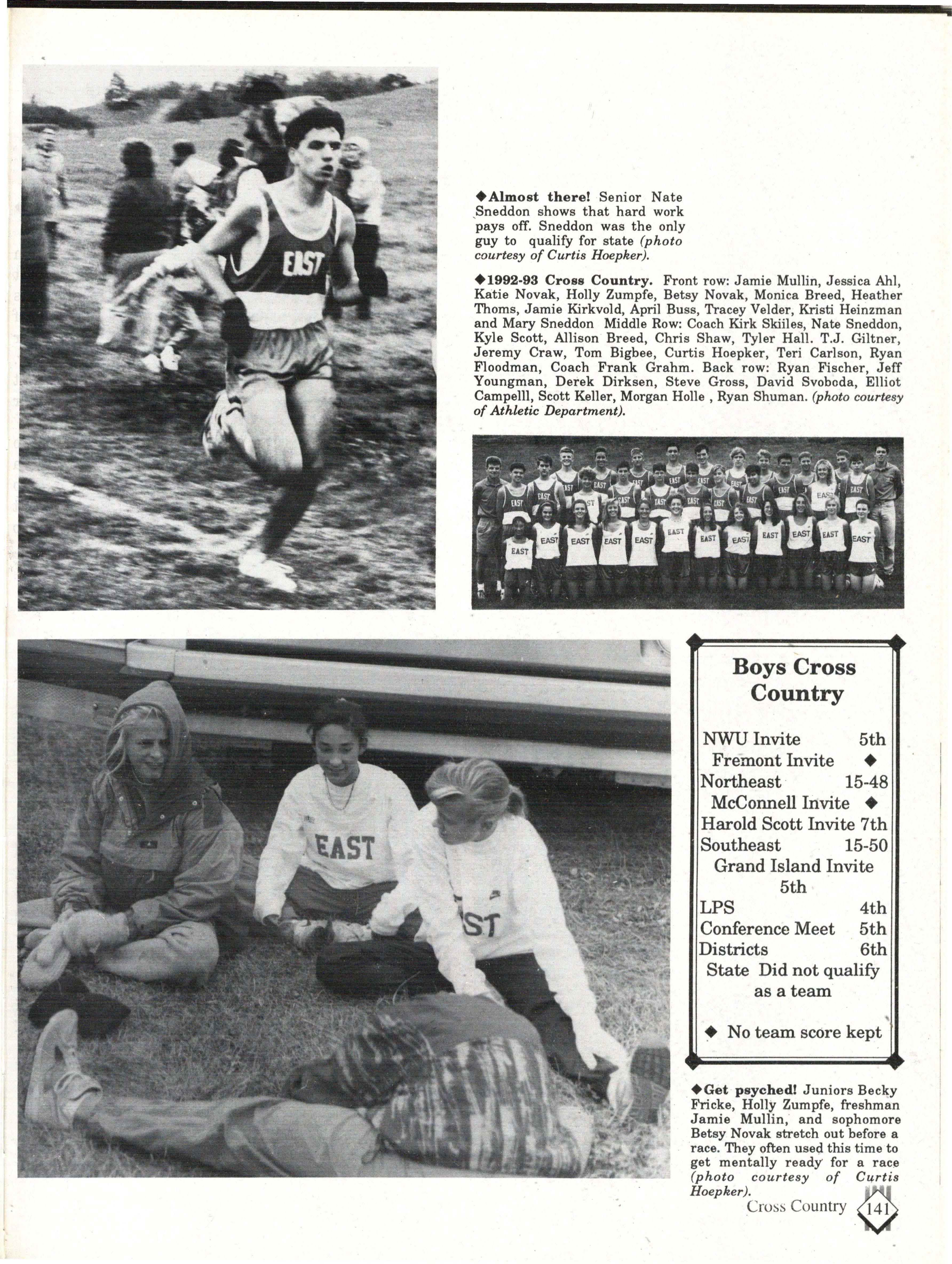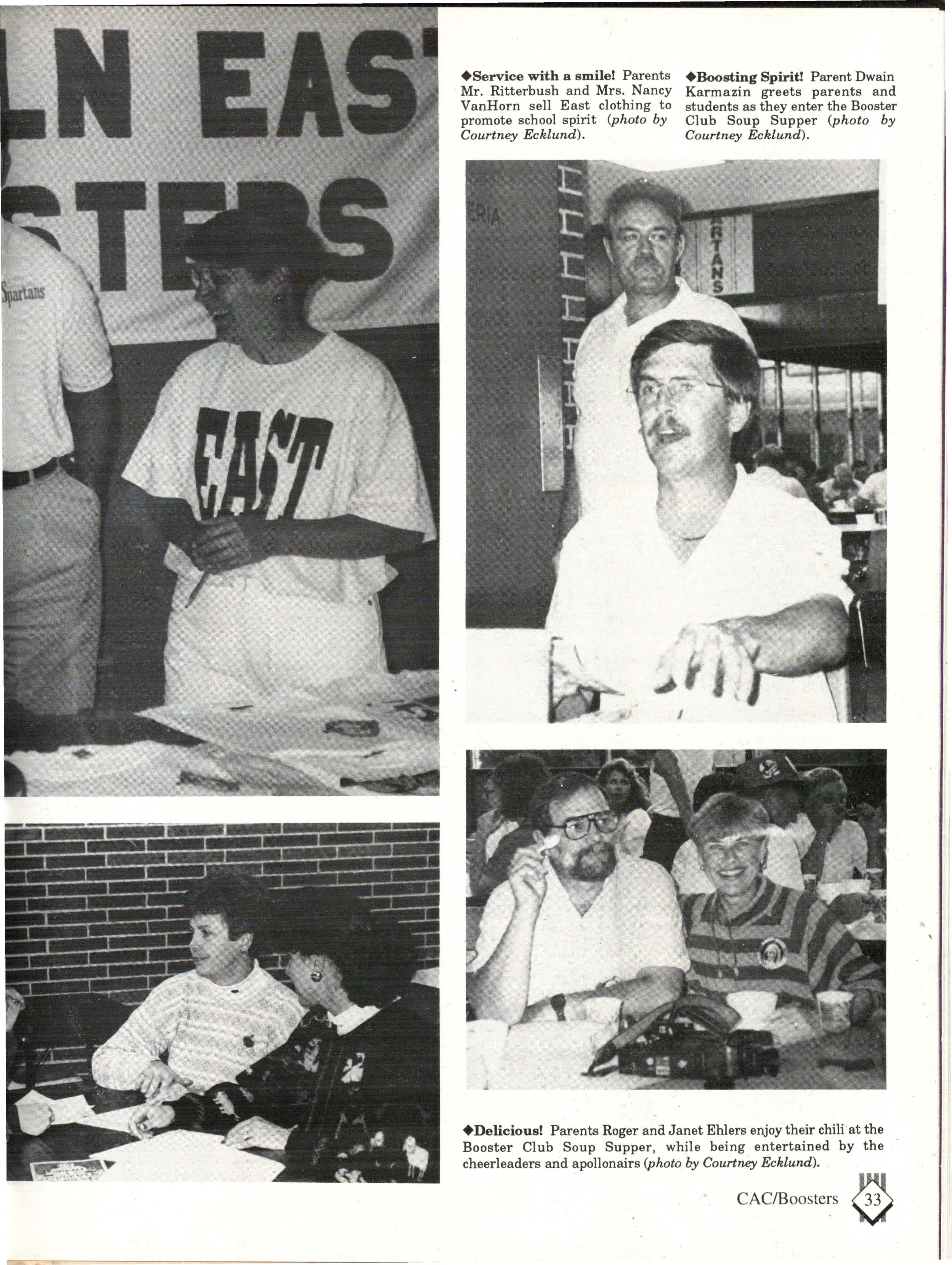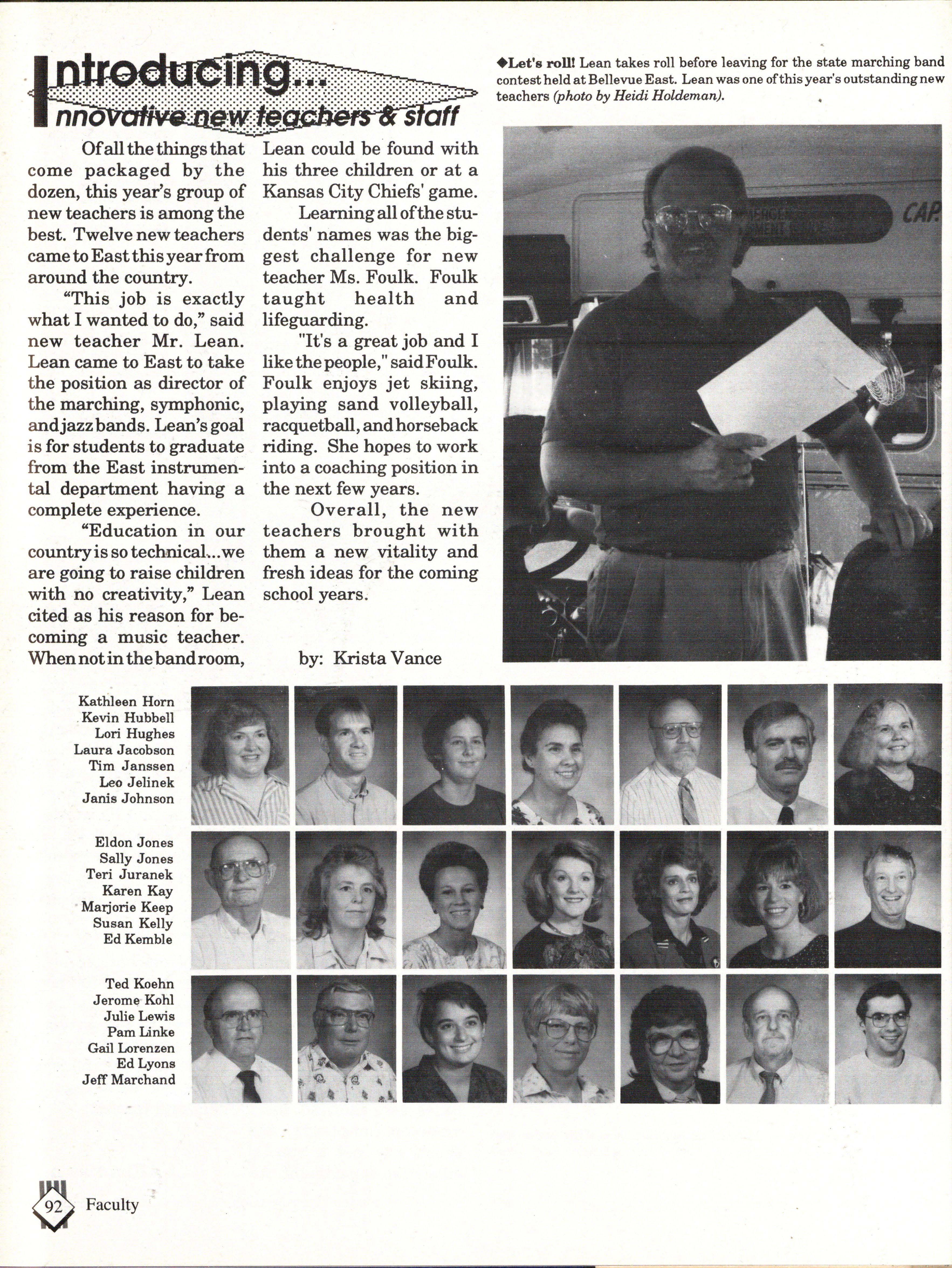 From the Inside Out was the theme of the 1992-1993 Lincoln East Epic. It was chosen because the staffwanted other schools to see what East was really like instead of just relying on the rumors. The 26th Epic was published by Walsworth Publishing 1 Company of Marceline, Missouri who printed 1400 copies. The 234-page book included a spring supplement and a plastic cover. The package sold for $25 in the fall and $30 in the spring.