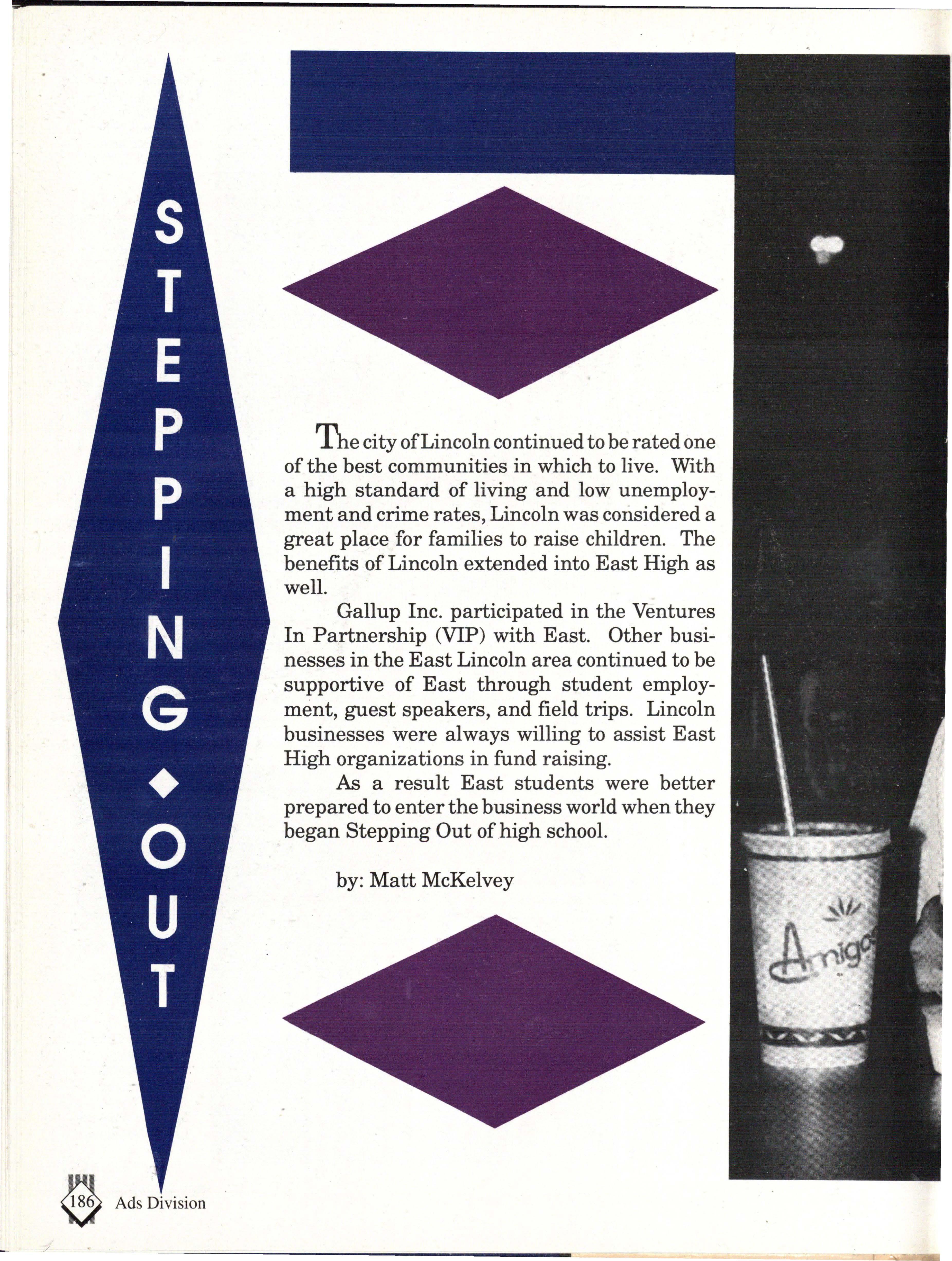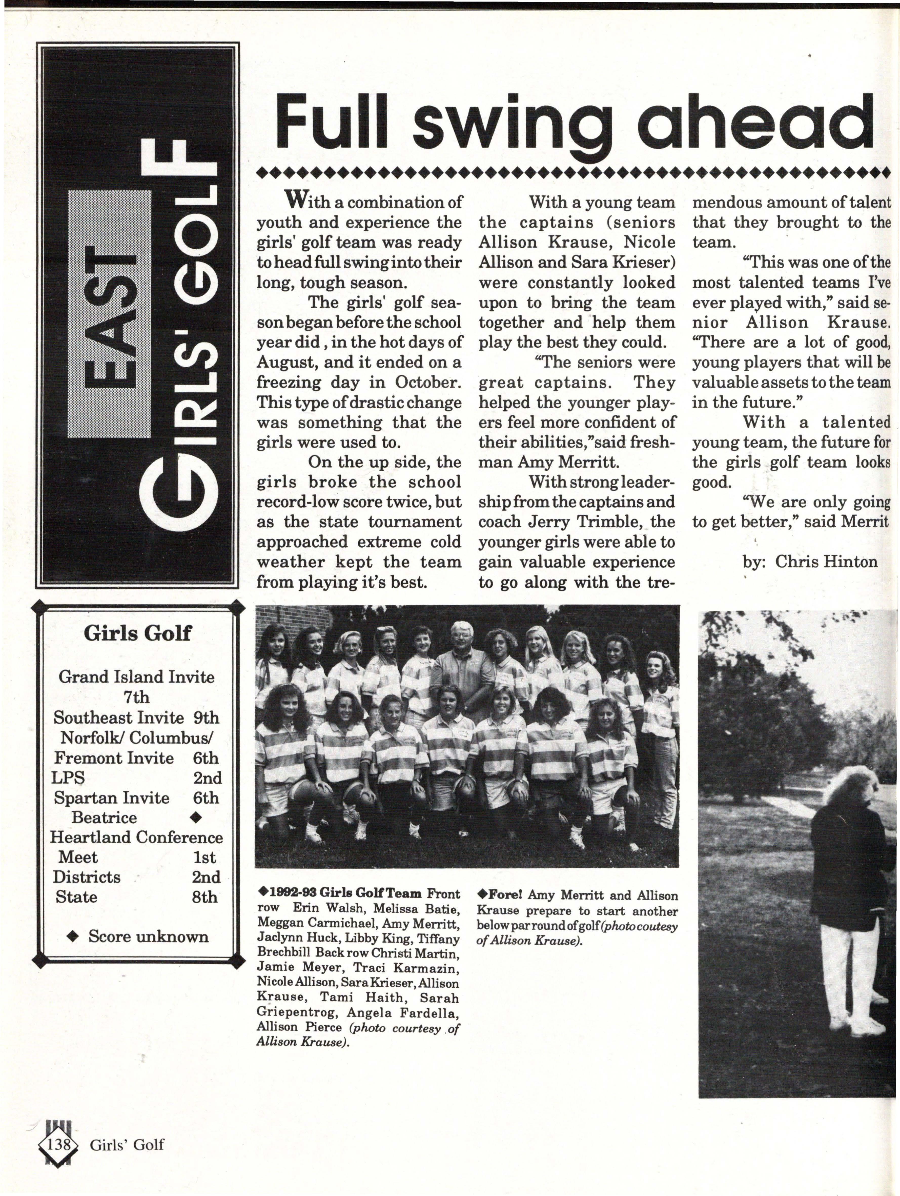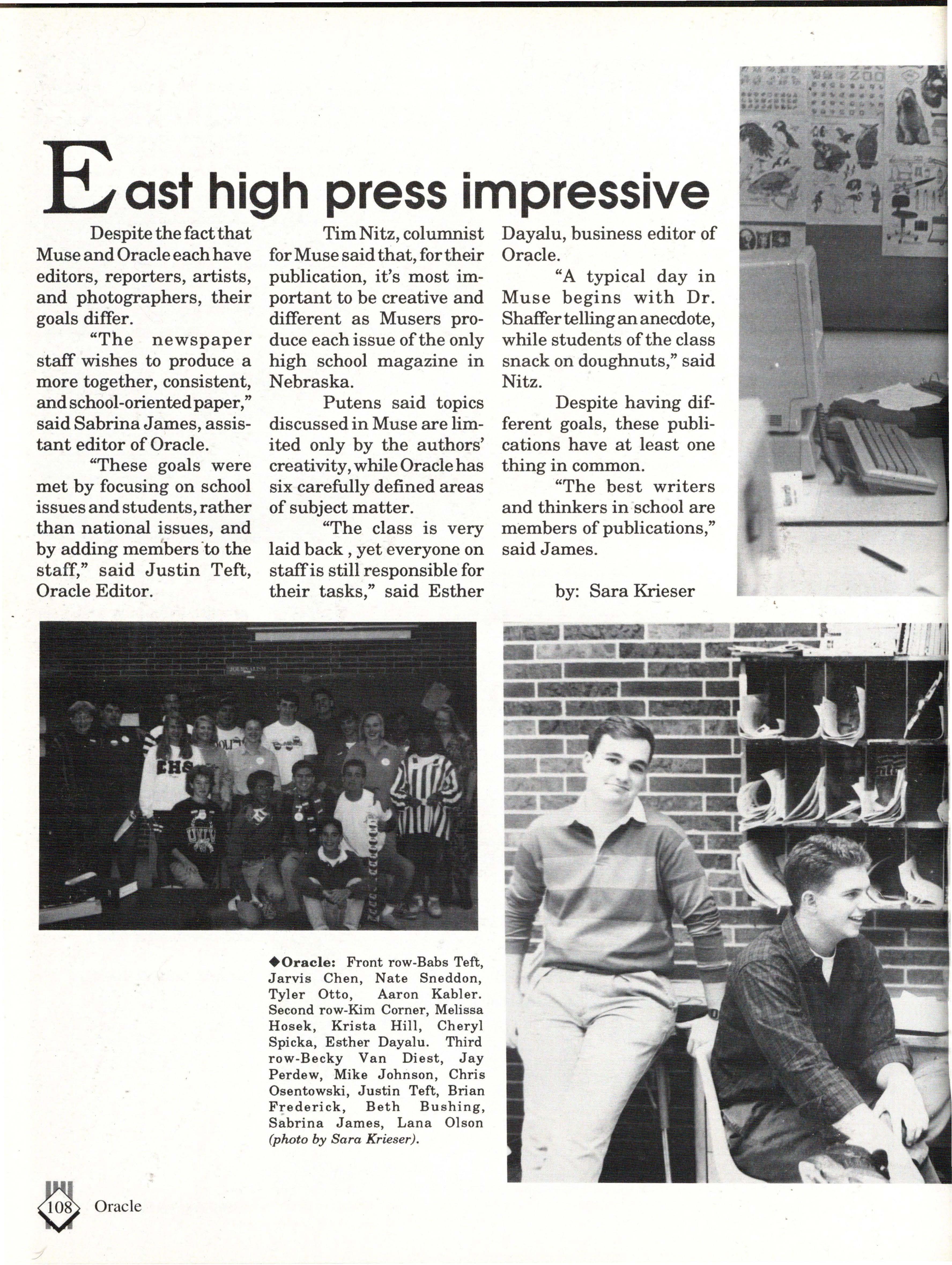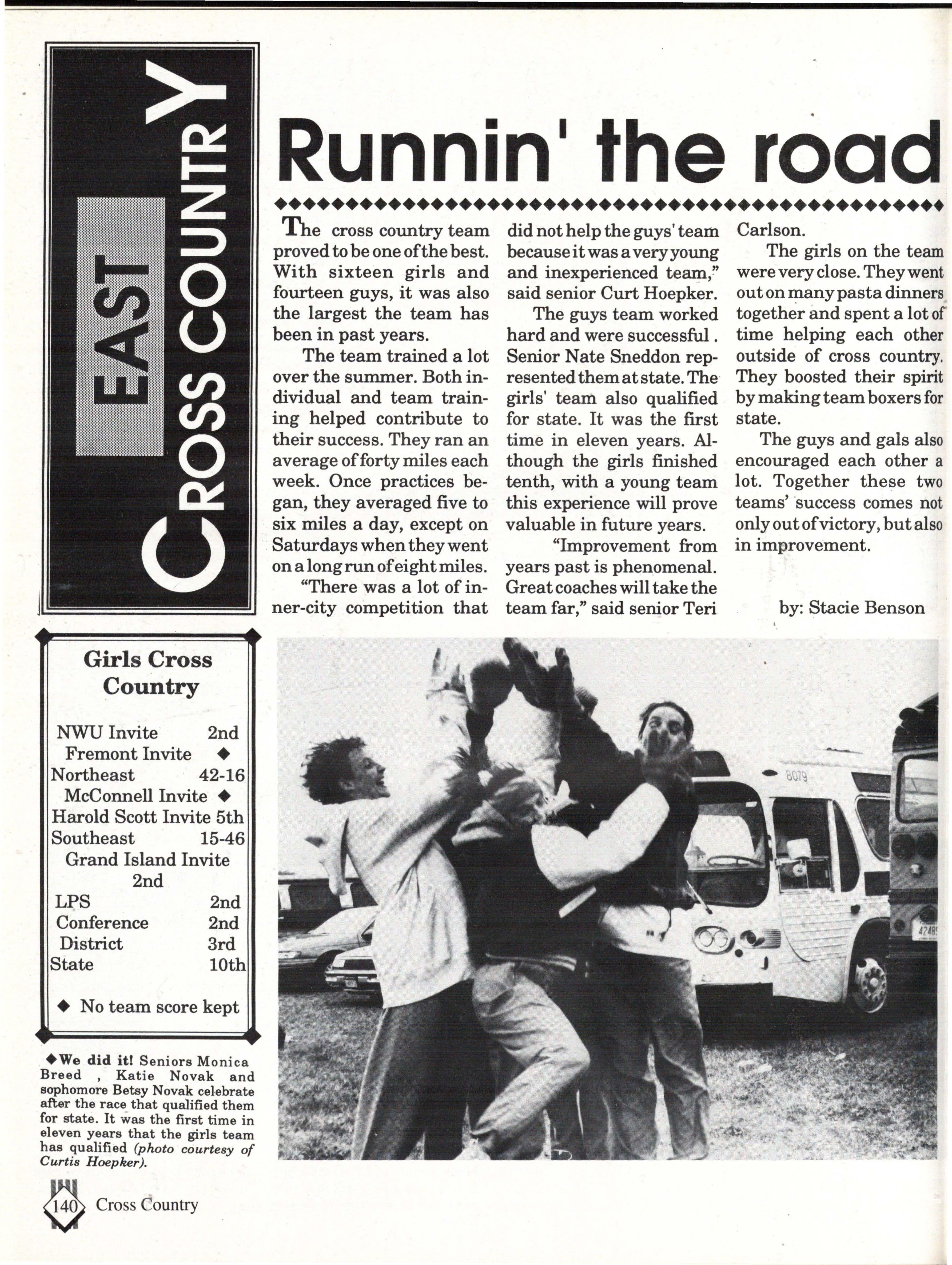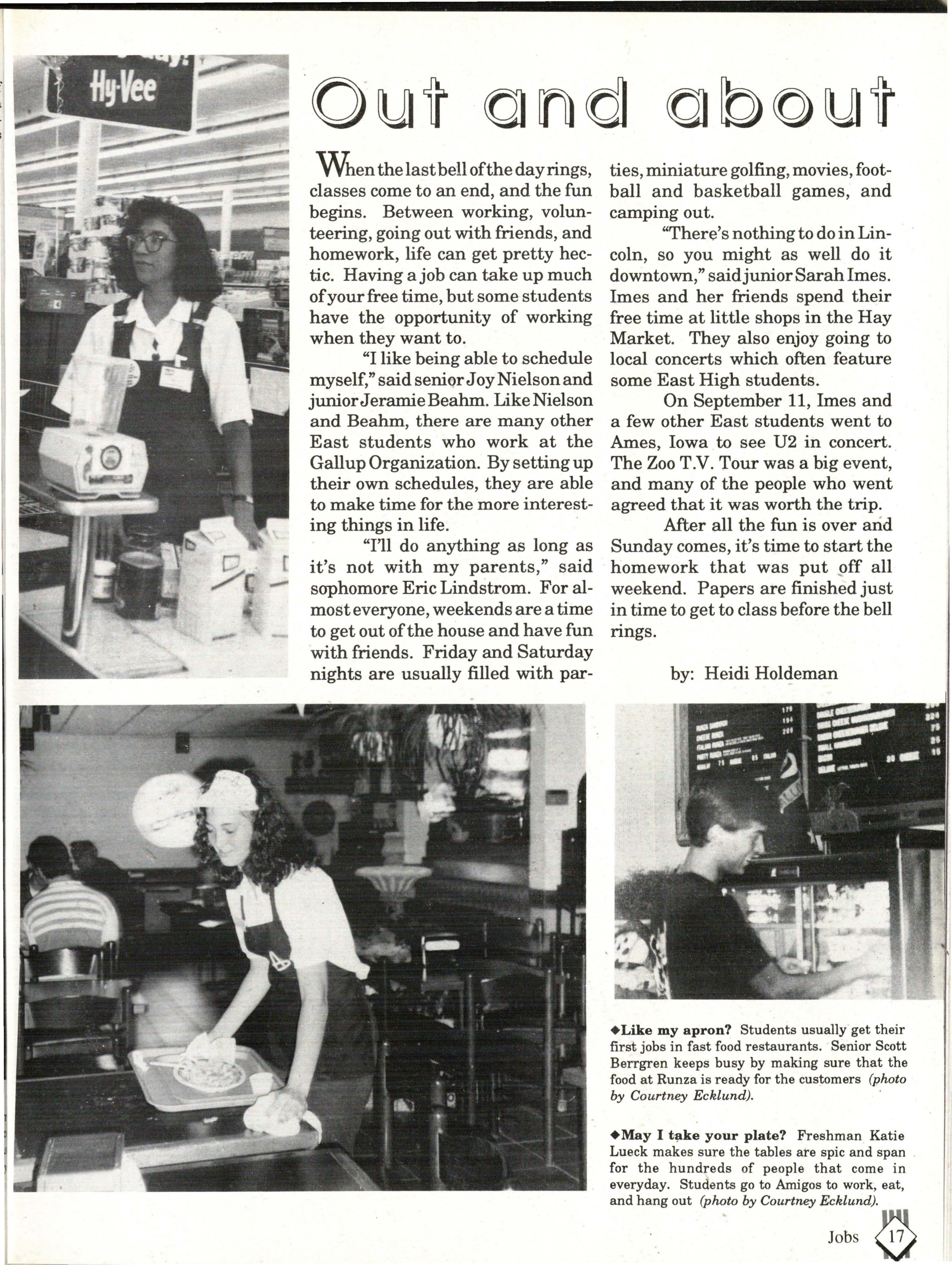 From the Inside Out was the theme of the 1992-1993 Lincoln East Epic. It was chosen because the staffwanted other schools to see what East was really like instead of just relying on the rumors. The 26th Epic was published by Walsworth Publishing 1 Company of Marceline, Missouri who printed 1400 copies. The 234-page book included a spring supplement and a plastic cover. The package sold for $25 in the fall and $30 in the spring.