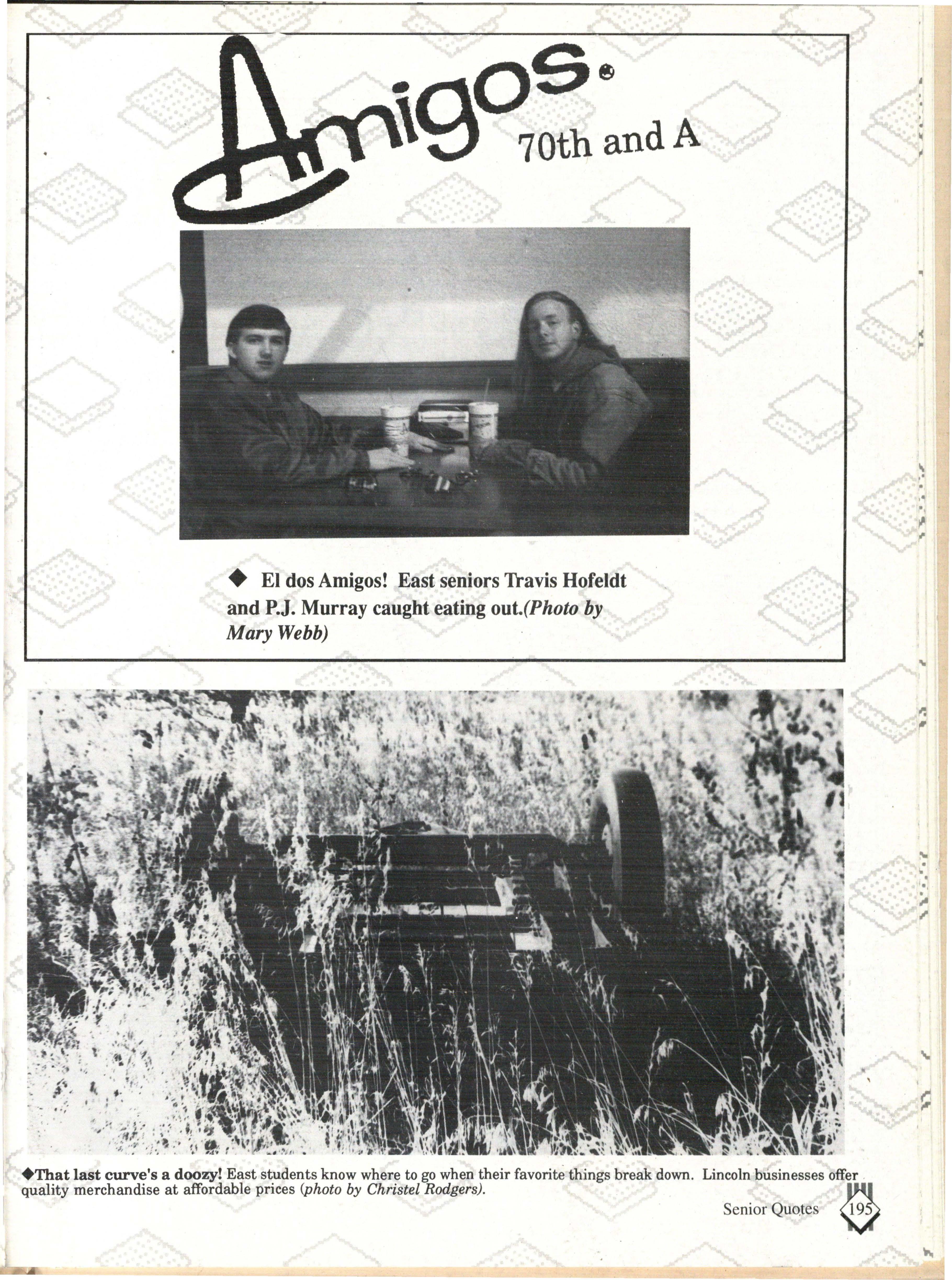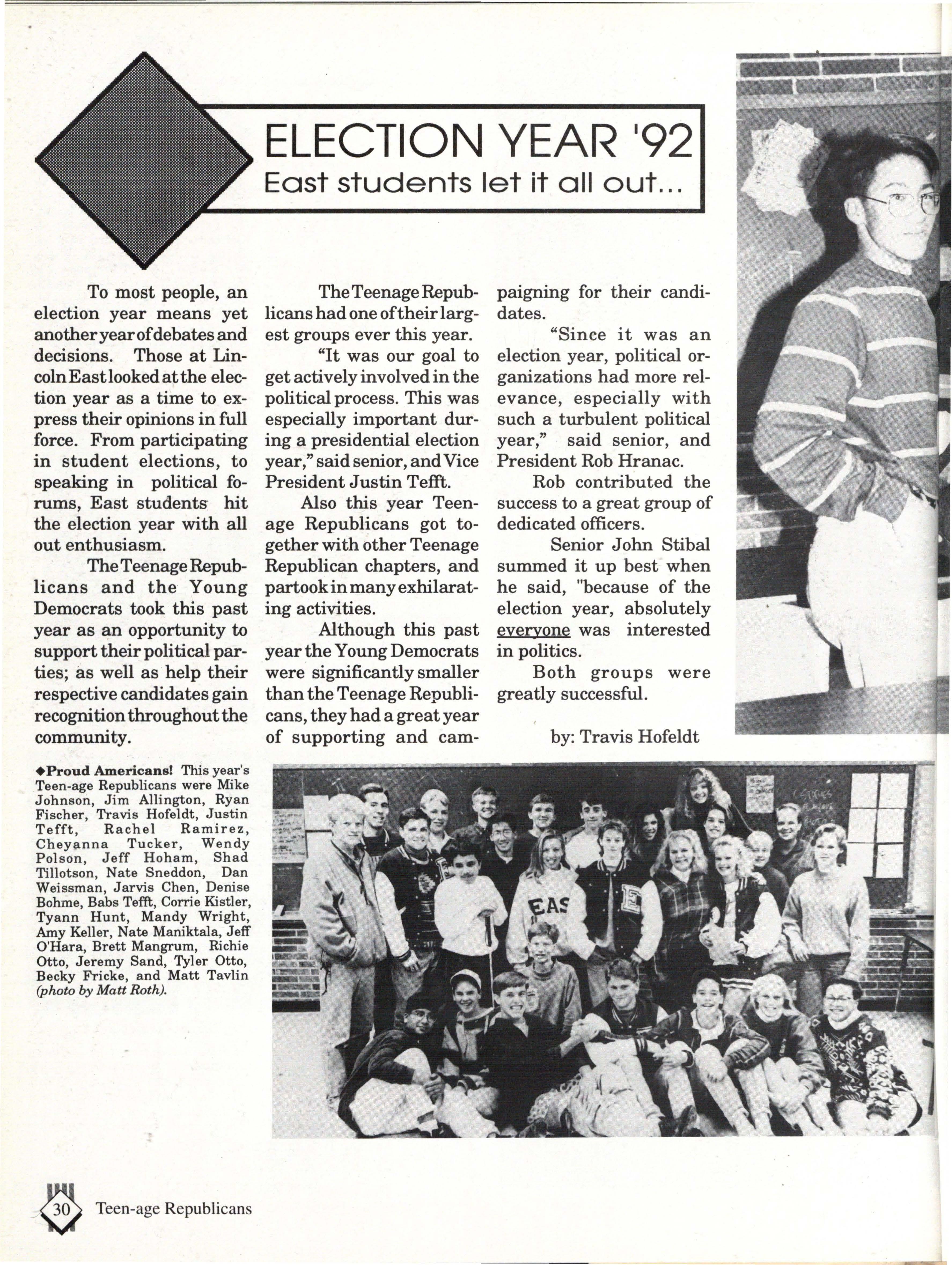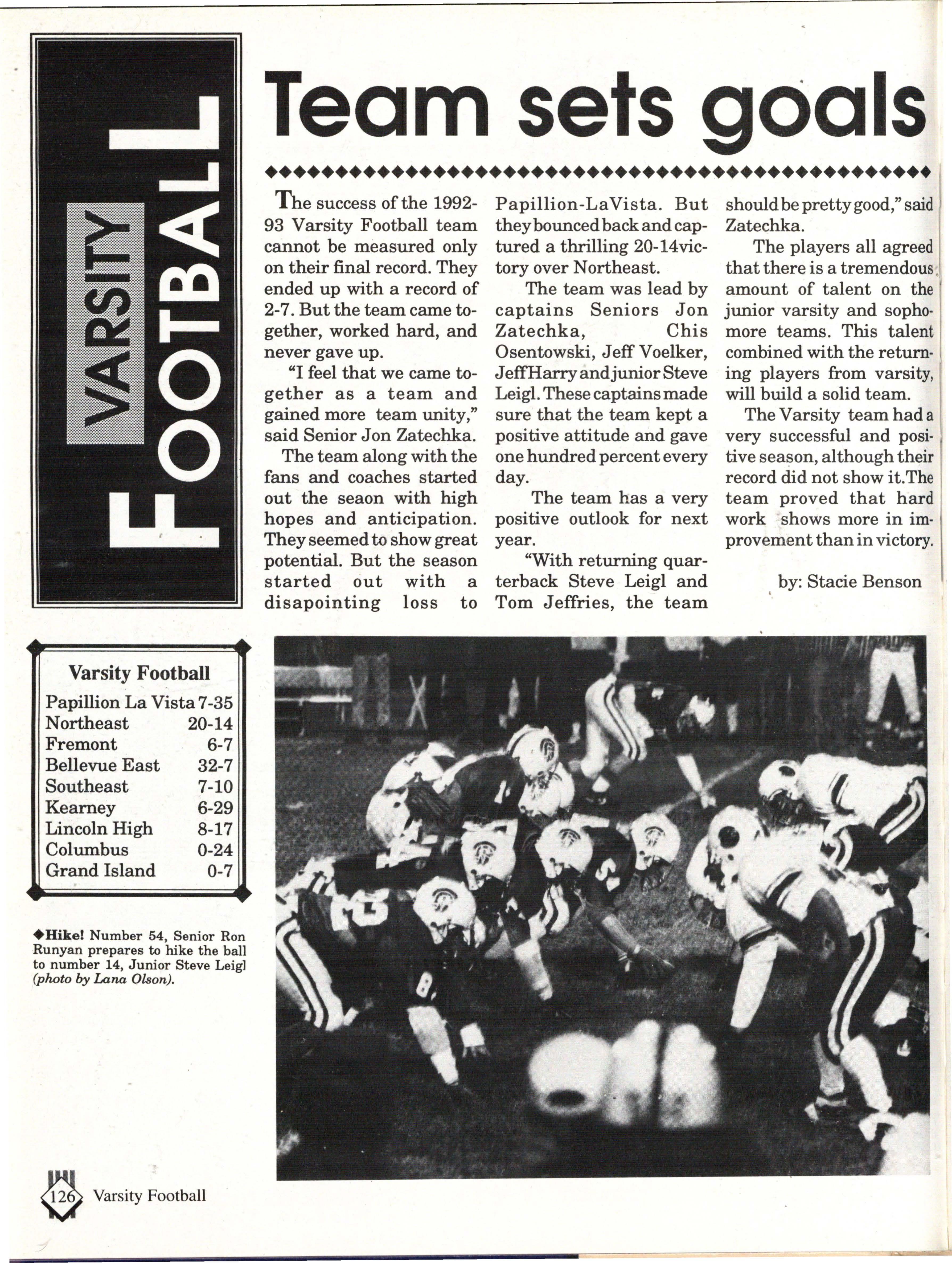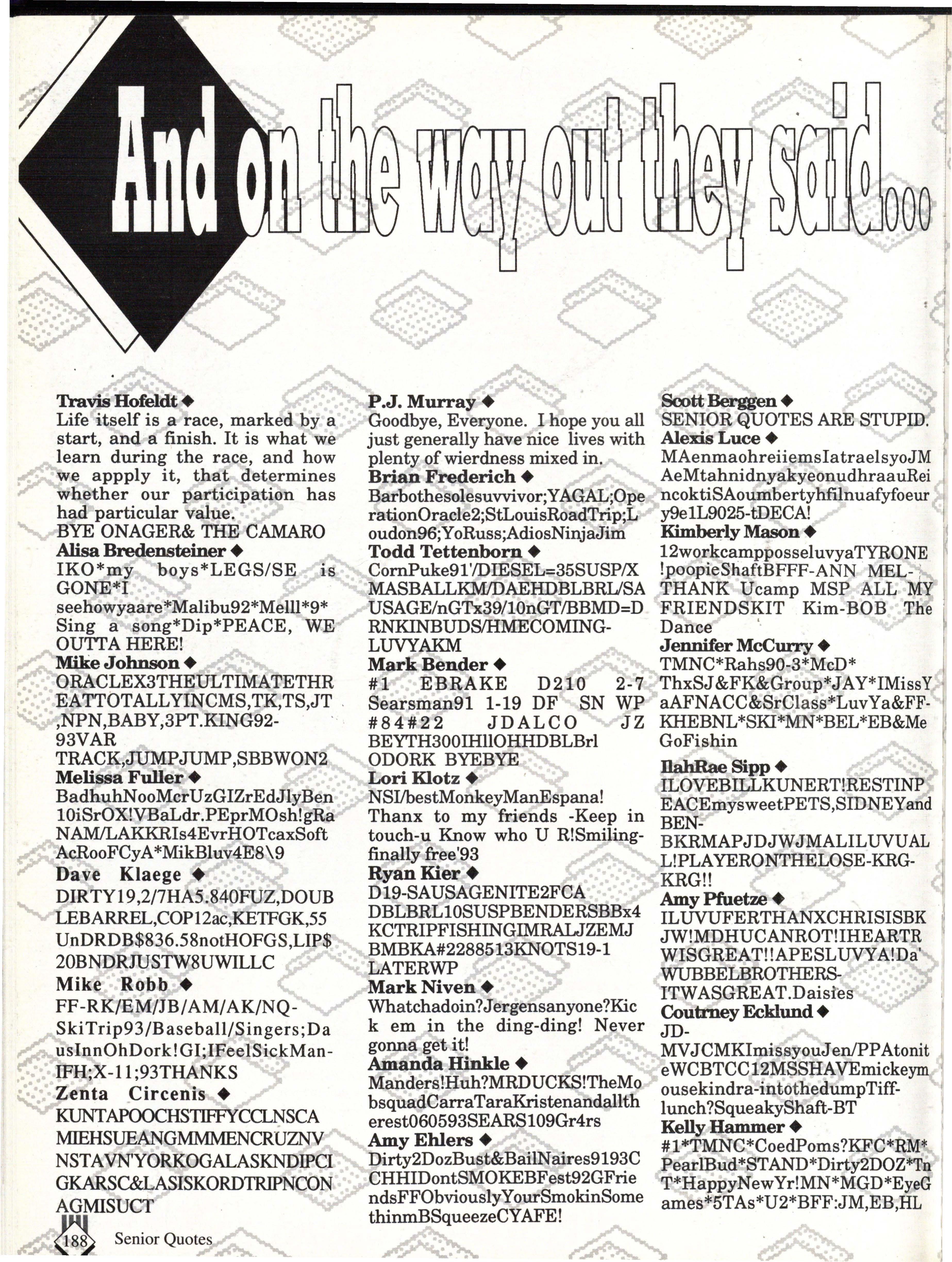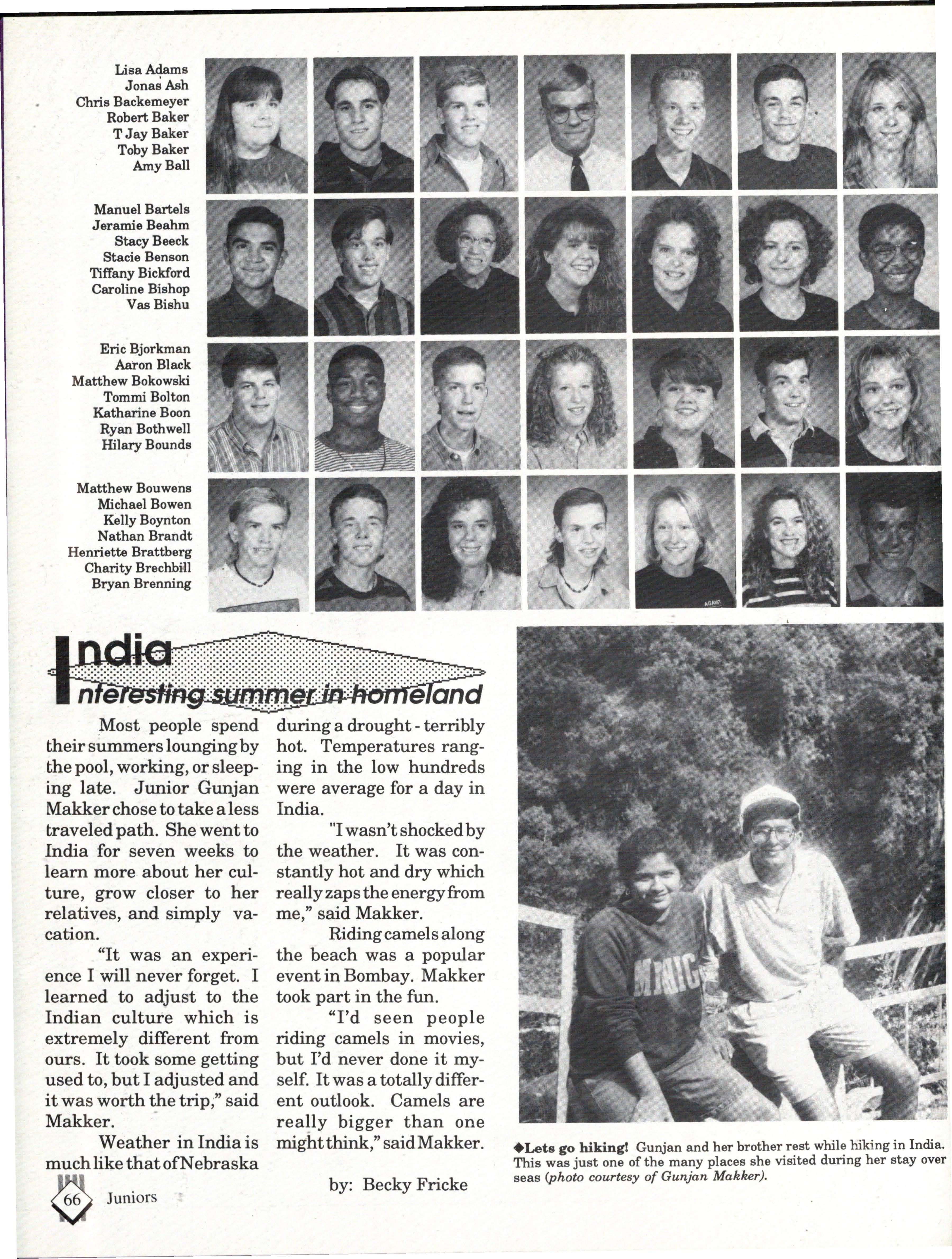 From the Inside Out was the theme of the 1992-1993 Lincoln East Epic. It was chosen because the staffwanted other schools to see what East was really like instead of just relying on the rumors. The 26th Epic was published by Walsworth Publishing 1 Company of Marceline, Missouri who printed 1400 copies. The 234-page book included a spring supplement and a plastic cover. The package sold for $25 in the fall and $30 in the spring.