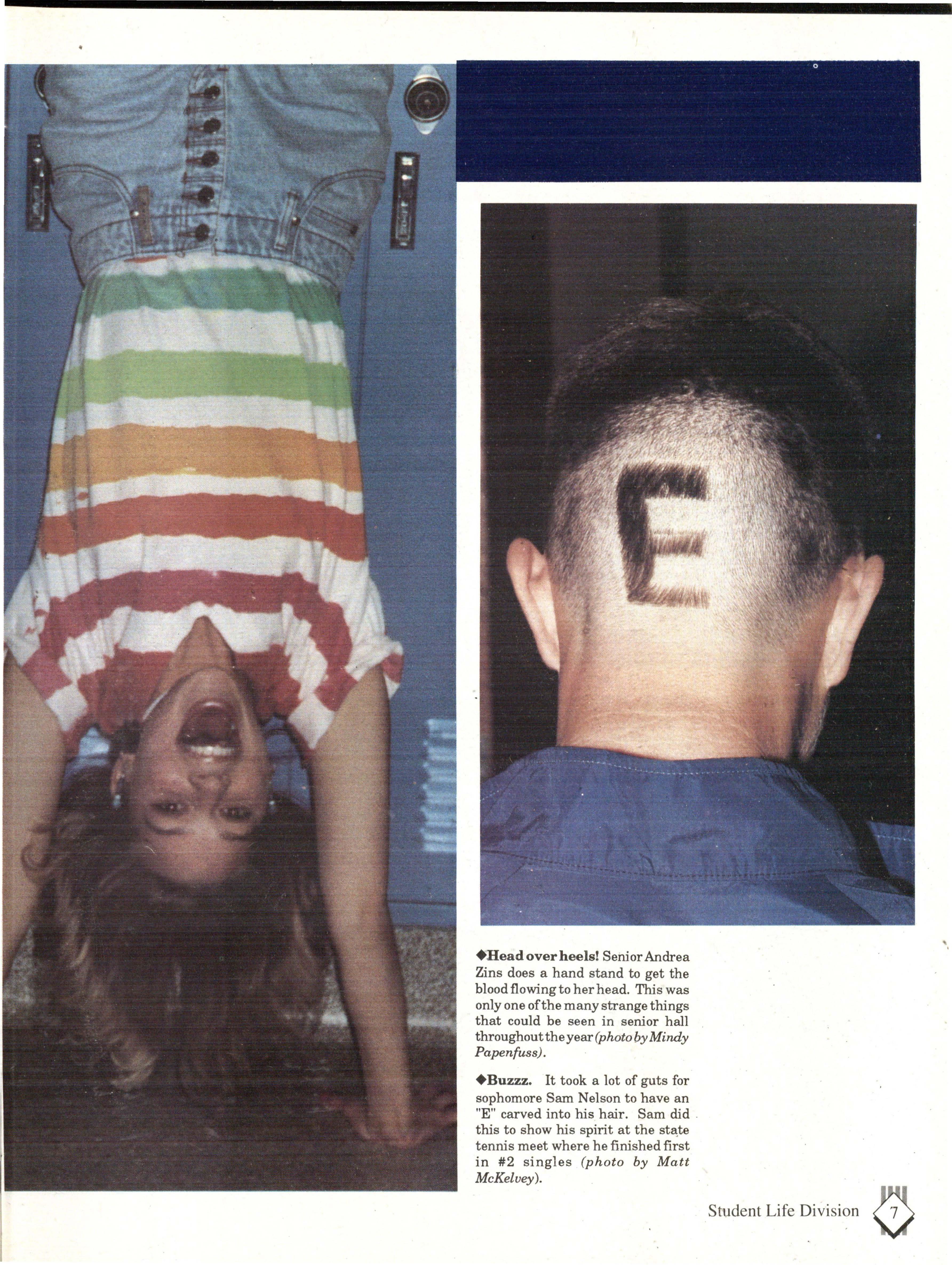 It took a lot of guts for sophomore Sam Nelson to have an "E" carved into his hair. Sam did this to show his spirit at the st~te tennis meet where he finished first in #2 singles (photo by Matt McKeluey).