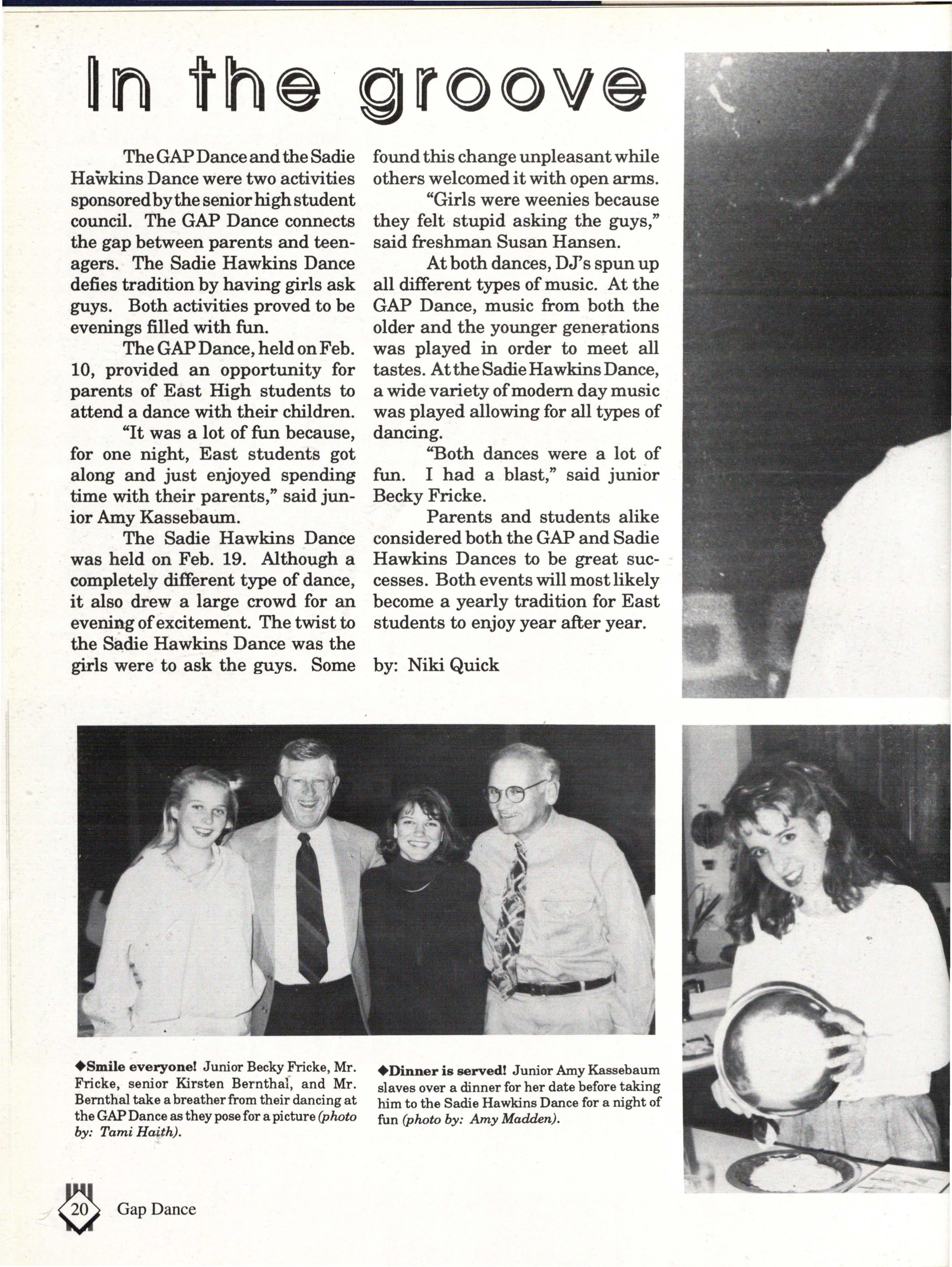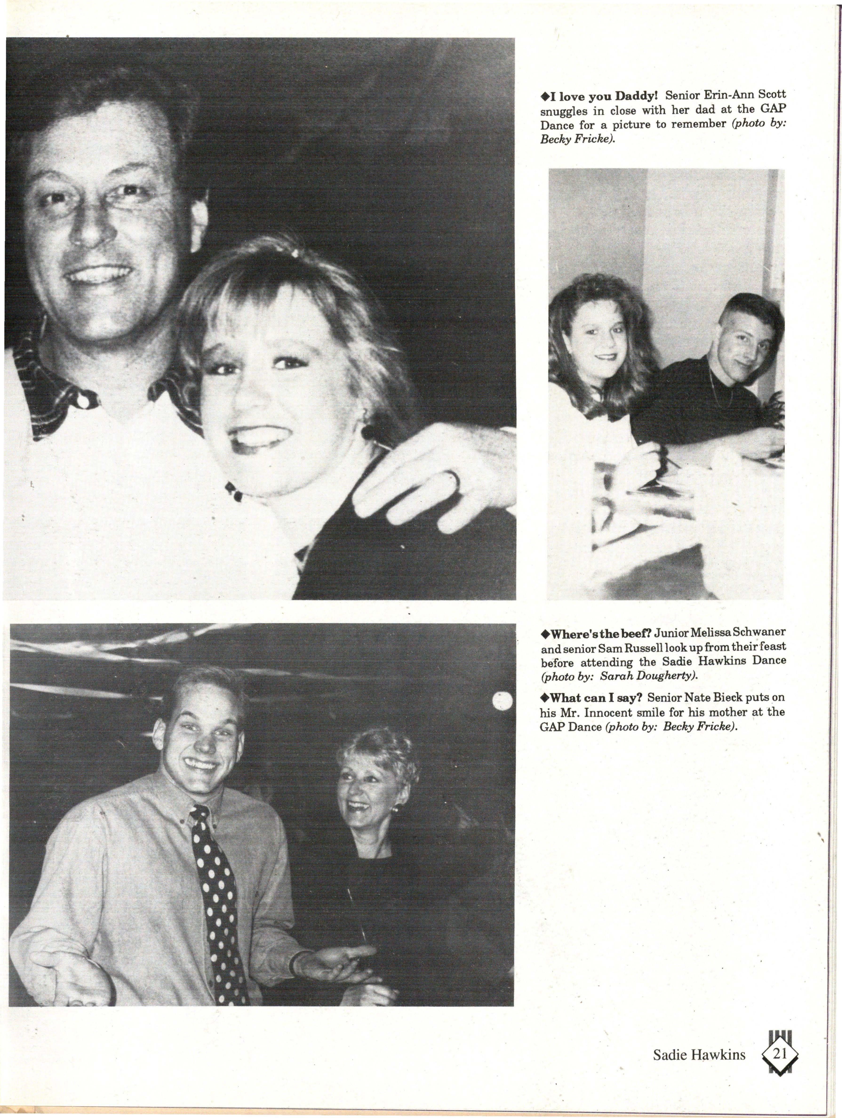 The students enjoyed dancing, socializing, munching on cookies, and drinking pop. The royalty candidates included: Kirsten Bernthal, Erica Bookstrom, Monica Breed, Sarah Dougherty, J.J. McCurry, Nate Bieck, Brett Mangrum, Chris Osentowski, Sam Russell and JeffVoelker. The king and queen were Monica Breed and Sam Russell.