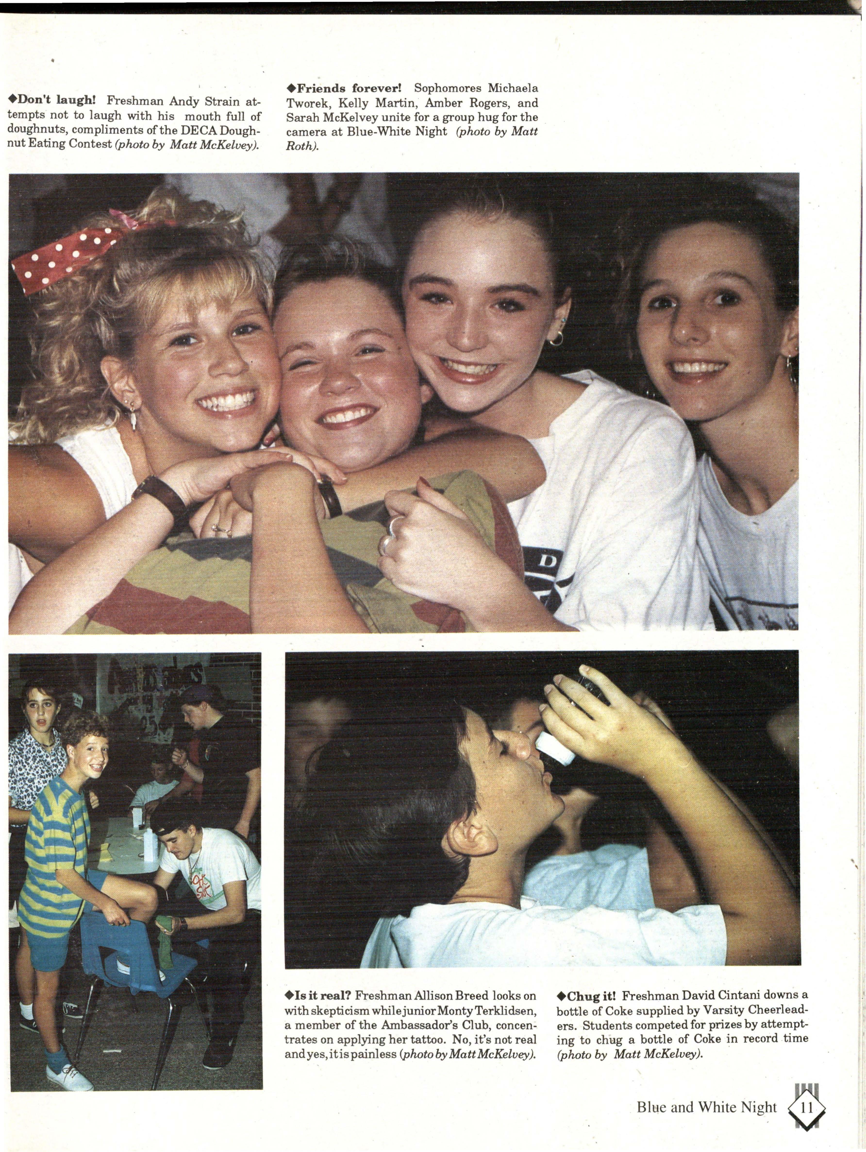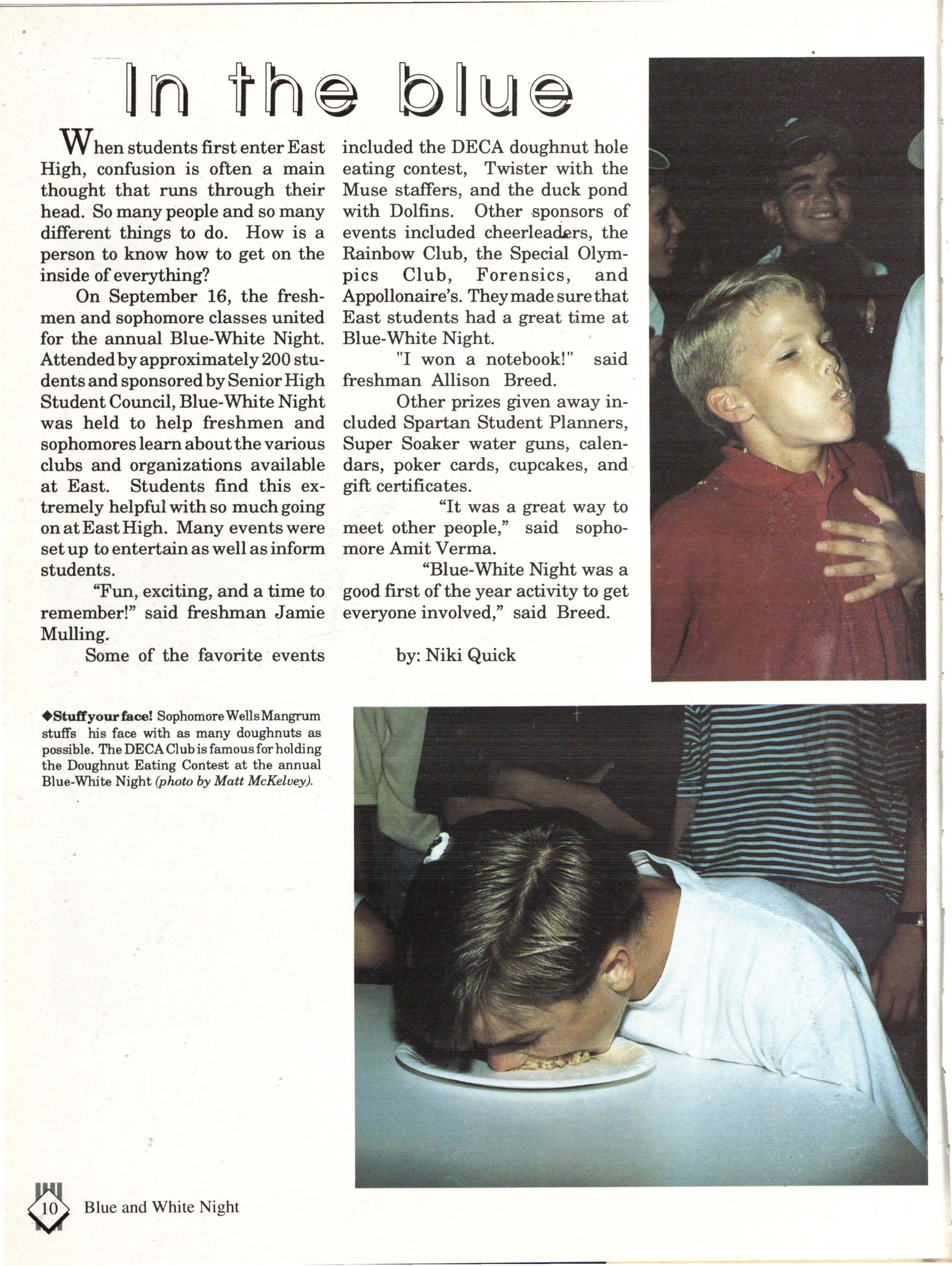 included the DECA doughnut hole eating contest, Twister with the Muse staffers, and the duck pond with Dolfins. Other sponsors of events included cheerleackrs, the Rainbow Club, the Special Olympics Club, Forensics, and Appollonaire's. Theymade sure that East students had a great time at Blue-White Night.