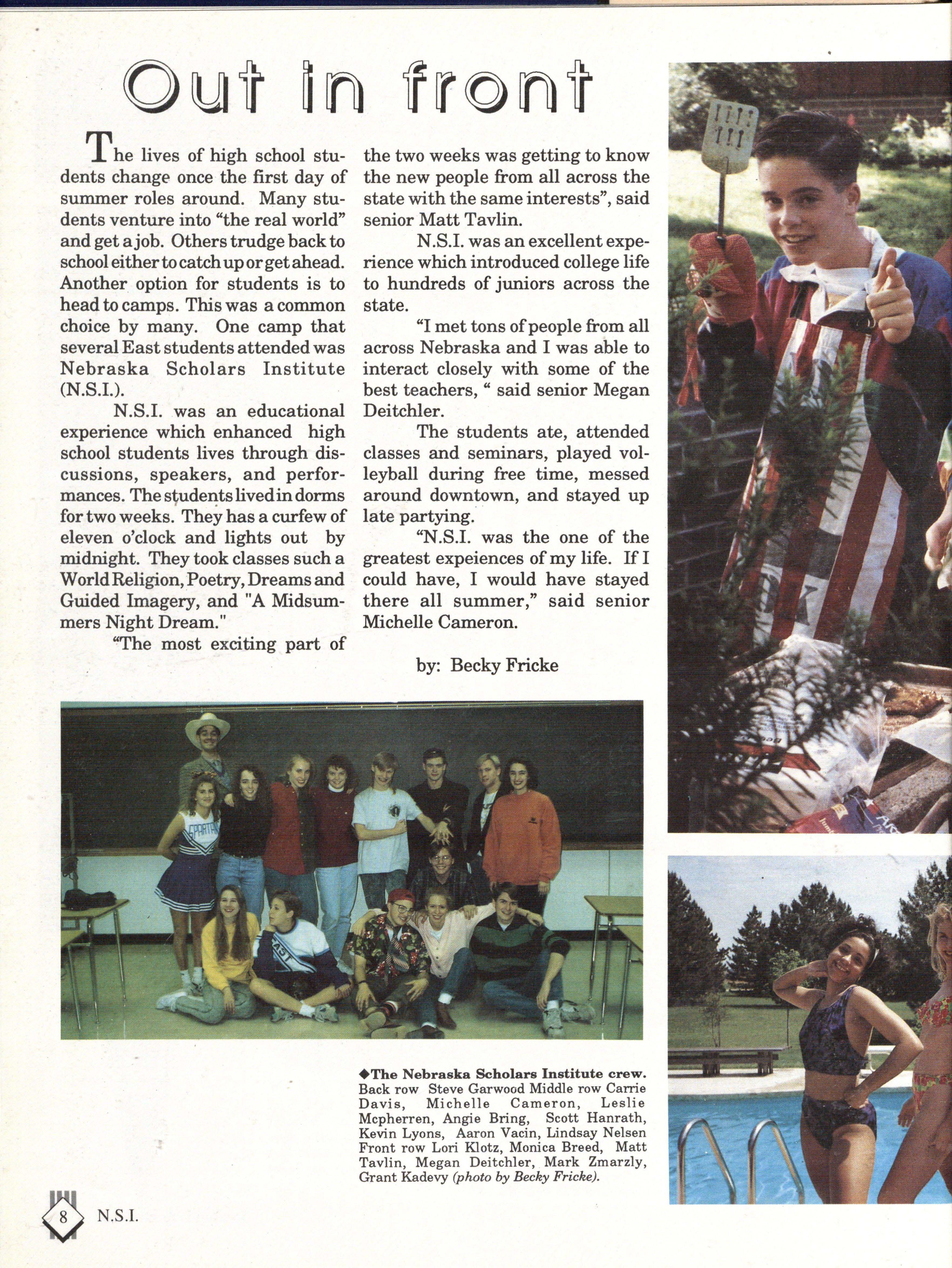 The lives of high school students change once the first day of summer roles around. Many students venture into "the real world" and get ajob. Others trudge back to school either to catch up or get ahead. Another_option for students is to head to camps. This was a common choice by many. One camp that several East students attended was Nebraska Scholars Institute (N.S.I.).