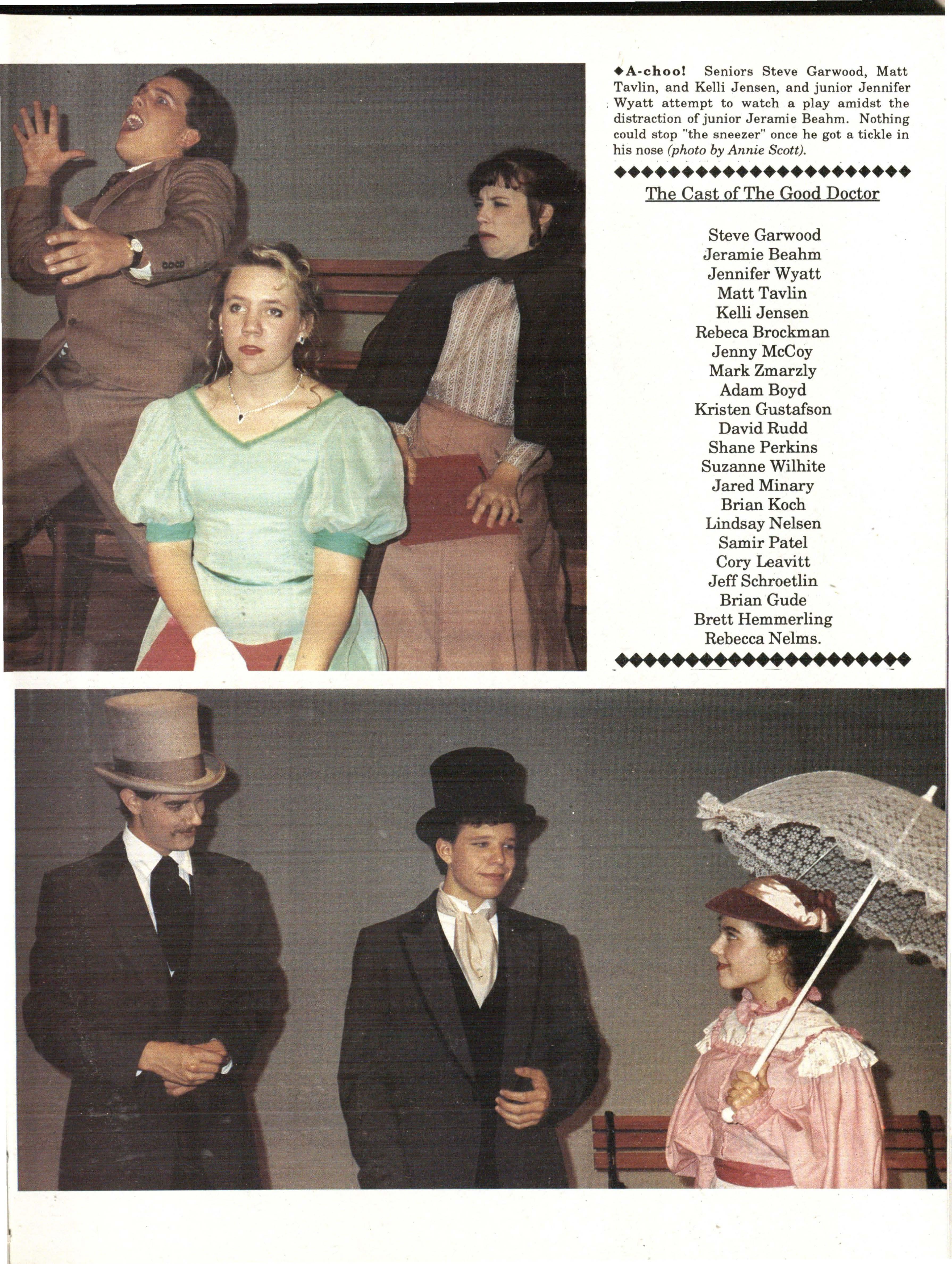 A-choo! Seniors Steve Garwood, Matt Tavlin, and Kelli Jensen, and junior Jennifer : Wyatt attempt to watch a play amidst the distraction of junior Jeramie Beahm. Nothing could stop "the sneezer" once he got a tickle in his nose (photo by Annie Scott)