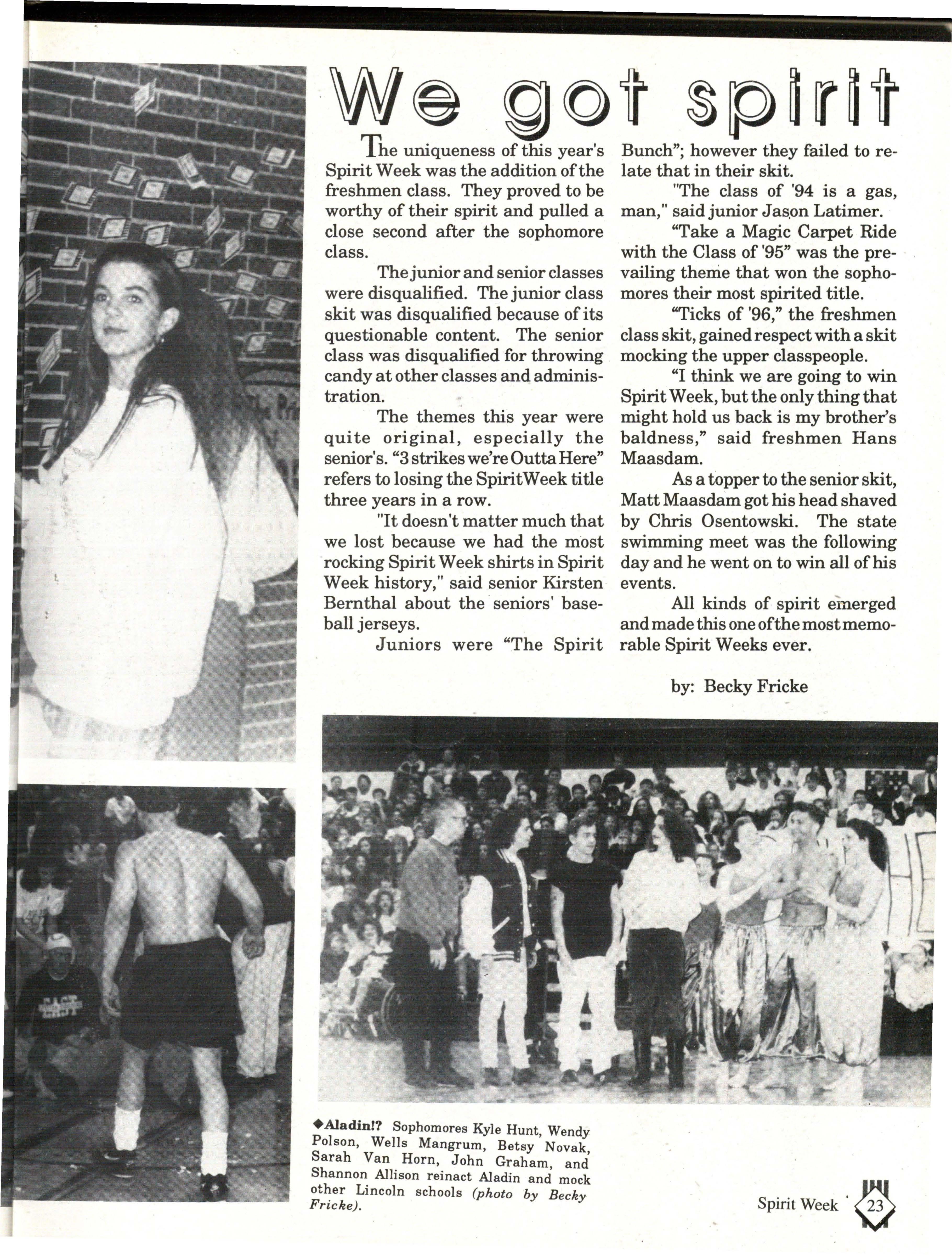To promote school spirit there is a Spirit . Week every year. This year was no different. Each class came up with a theme, skit and t-shirt. Each class preformed their skit at the Spirit Week pep-rally.