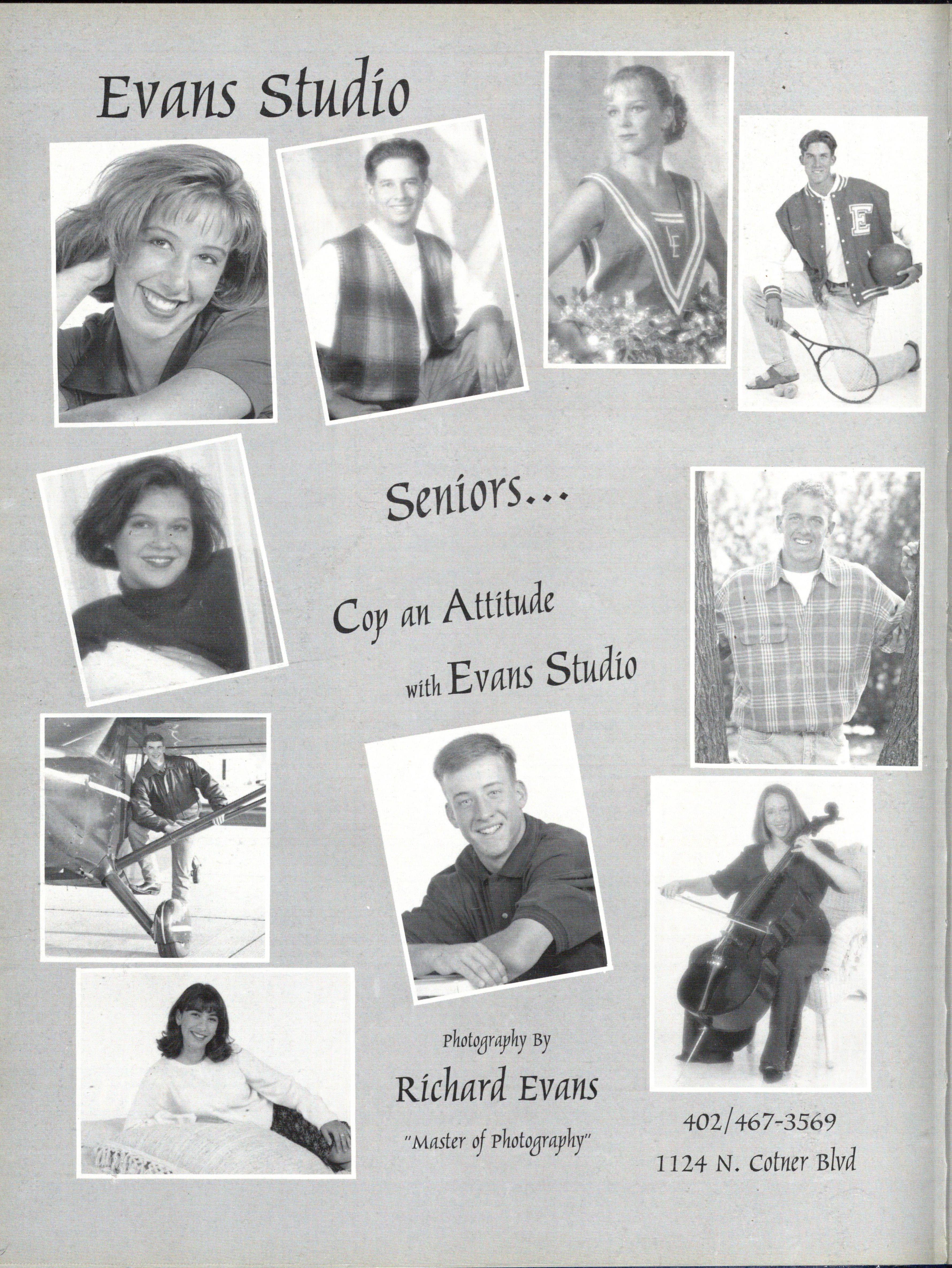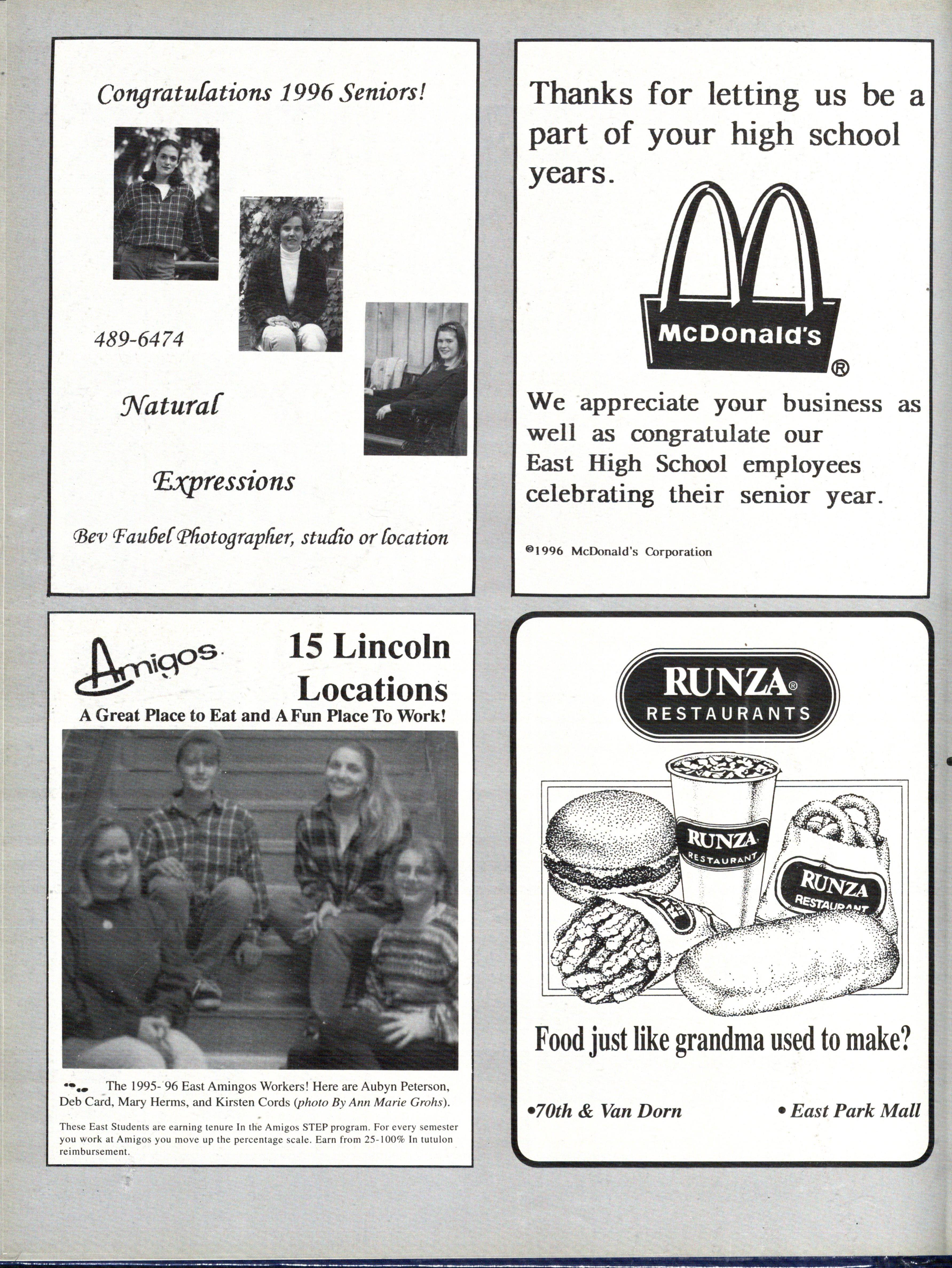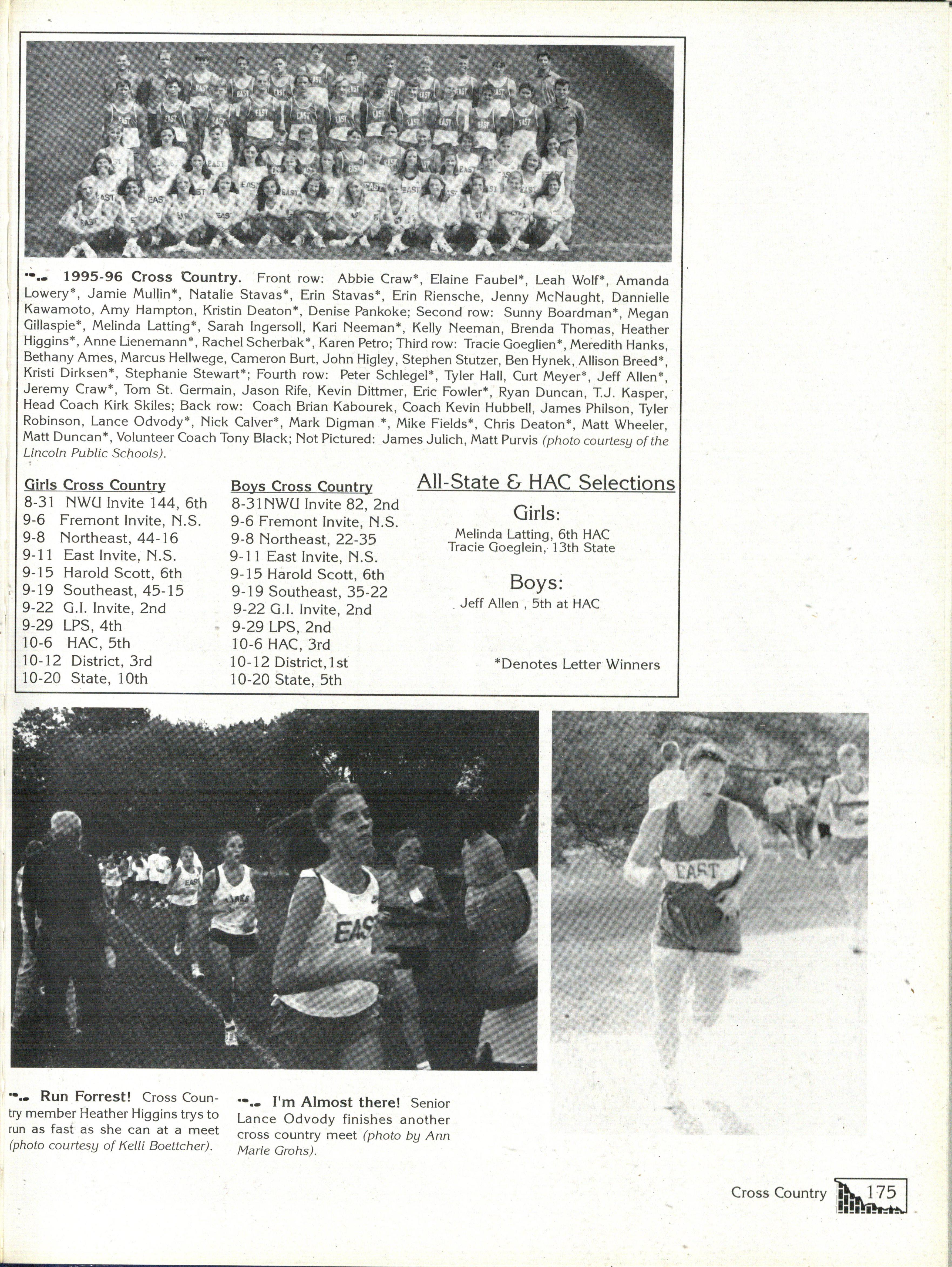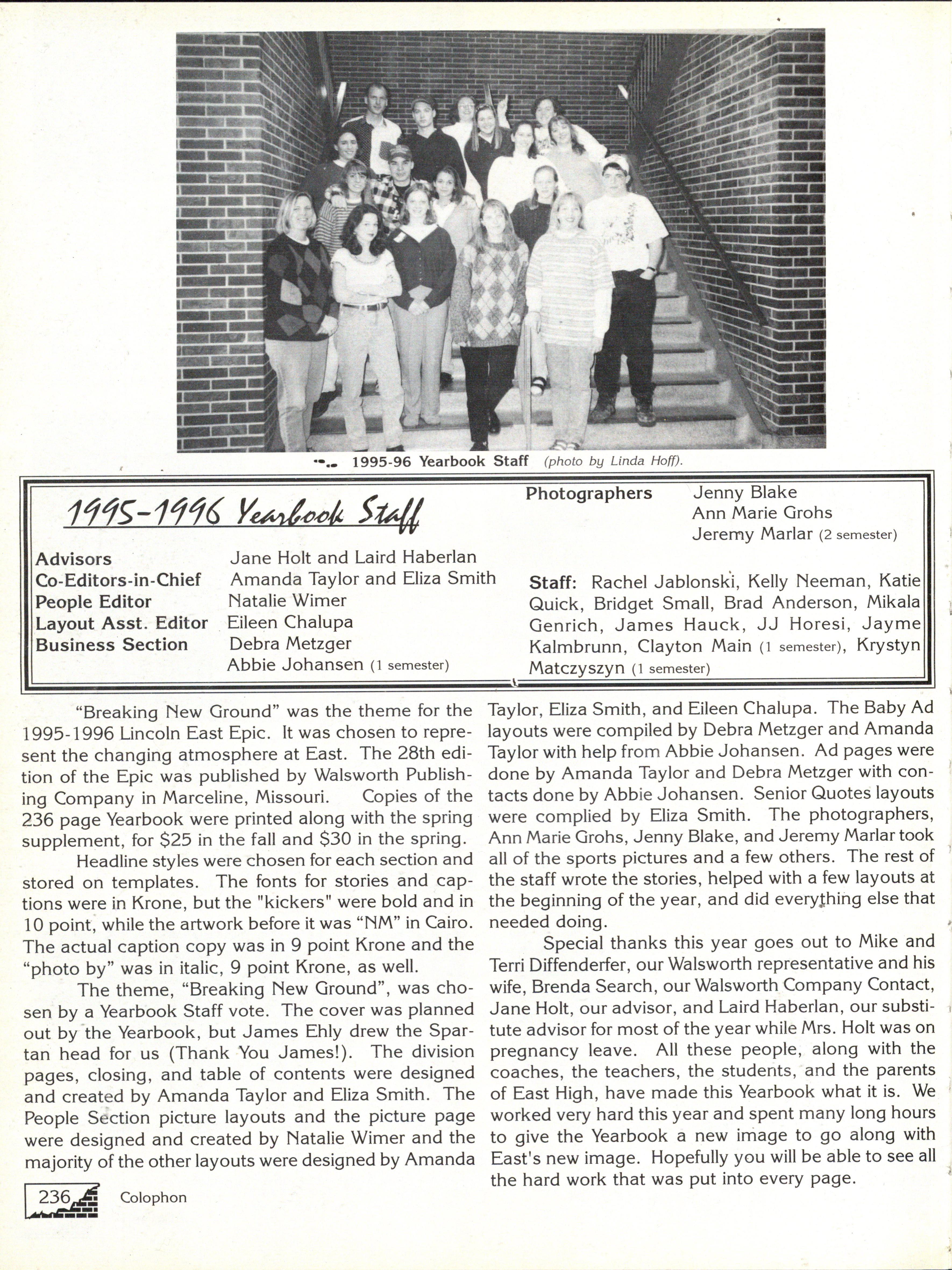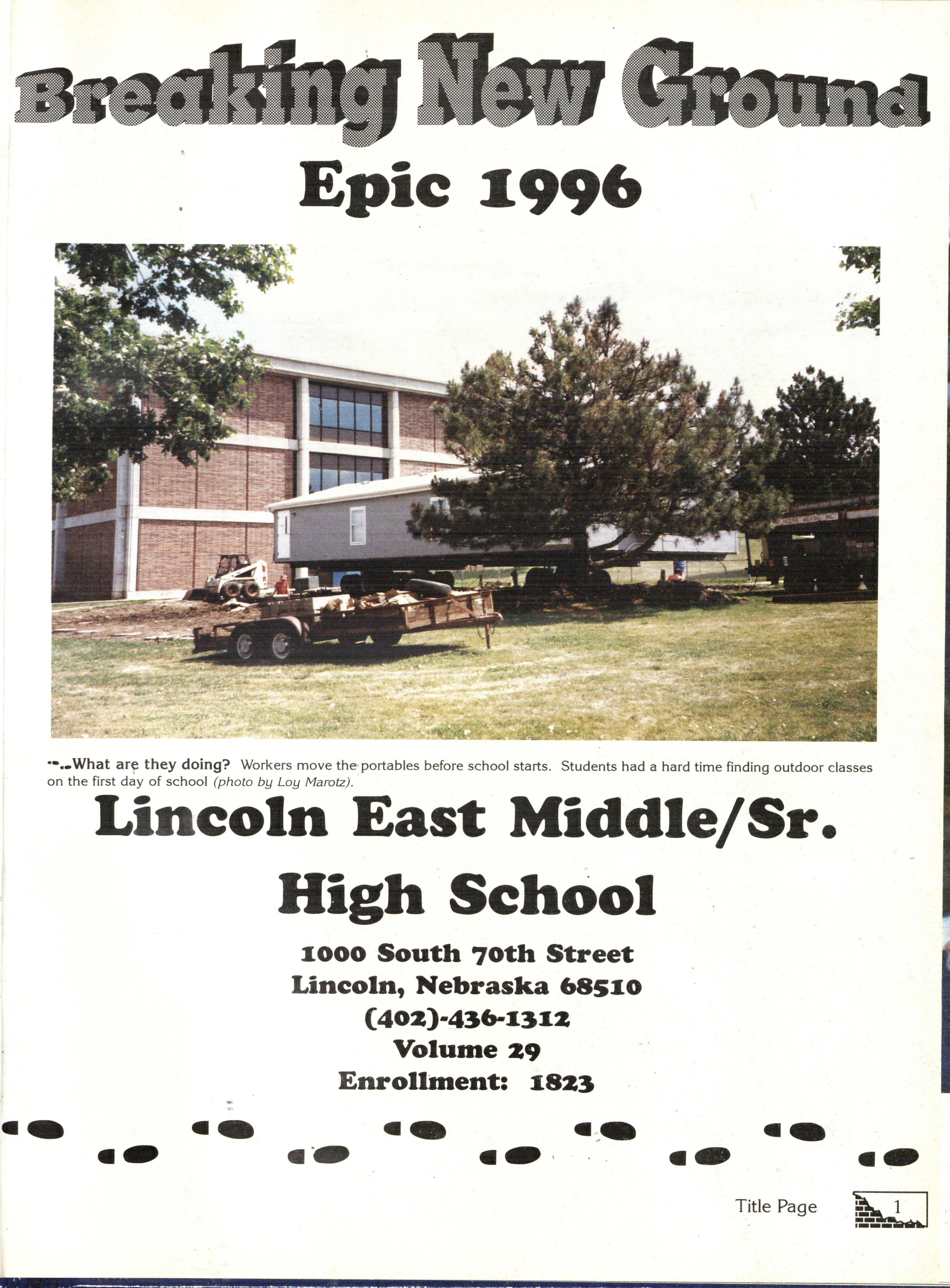 "Breaking New Ground" was the theme for the 1995-1996 Lincoln East Epic. It was chosen to represent the changing atmosphere at East. The 28th edition of the Epic was published by Walsworth Publishing Company in Marceline, Missouri. Copies of t he 236 page Yearbook were printed along with the spring supplement , for $25 in the fall and $30 in the spring. Headline styles were chosen for each section and stored on templates. The fonts for stories and captions were in Krone, but the "kickers" were bold and in 10 point, while the artwork before it was "NM" in Cairo. The actual caption copy was in 9 point Krone and the "photo by" was in italic, 9 point Krone, as well.