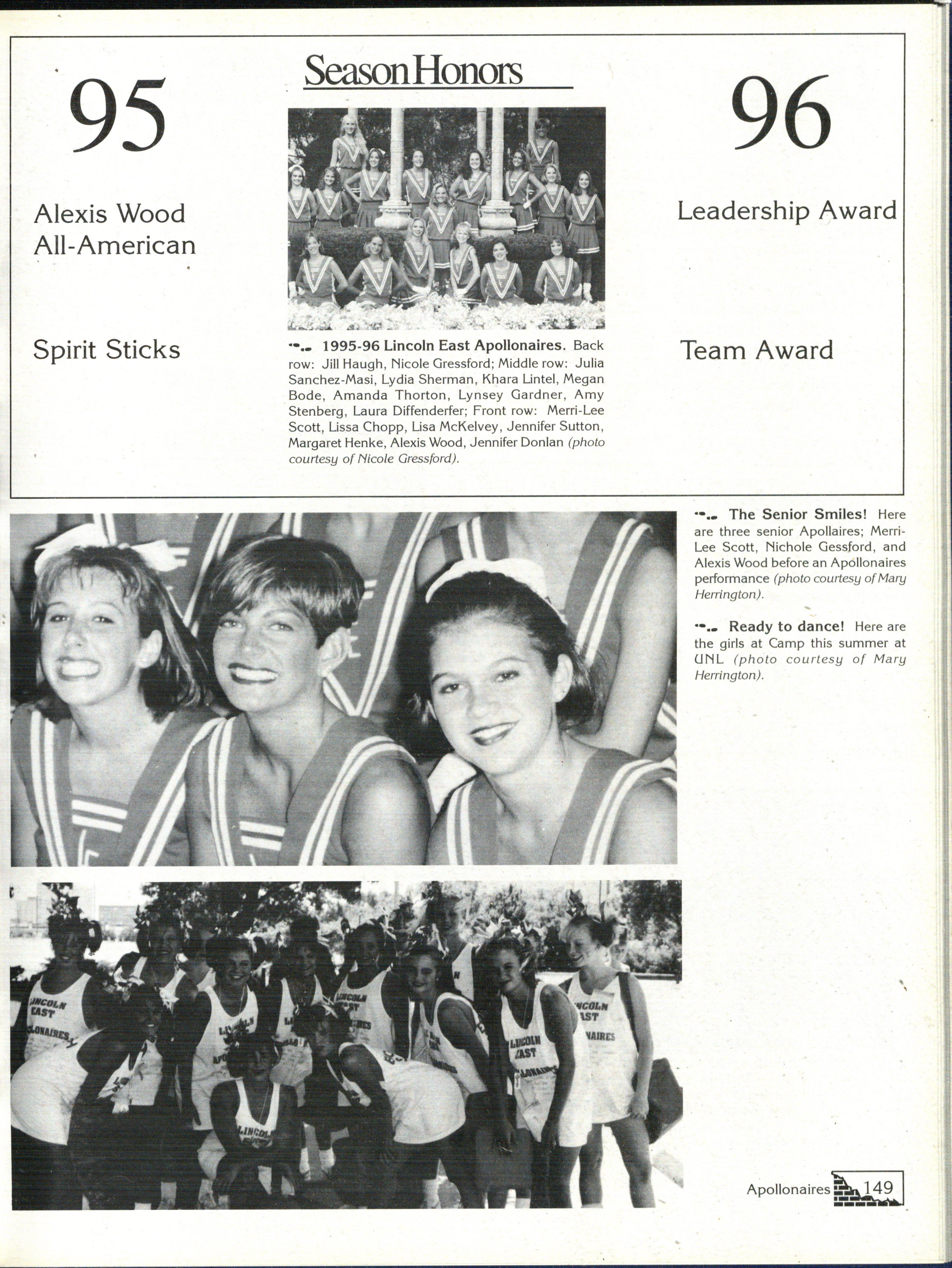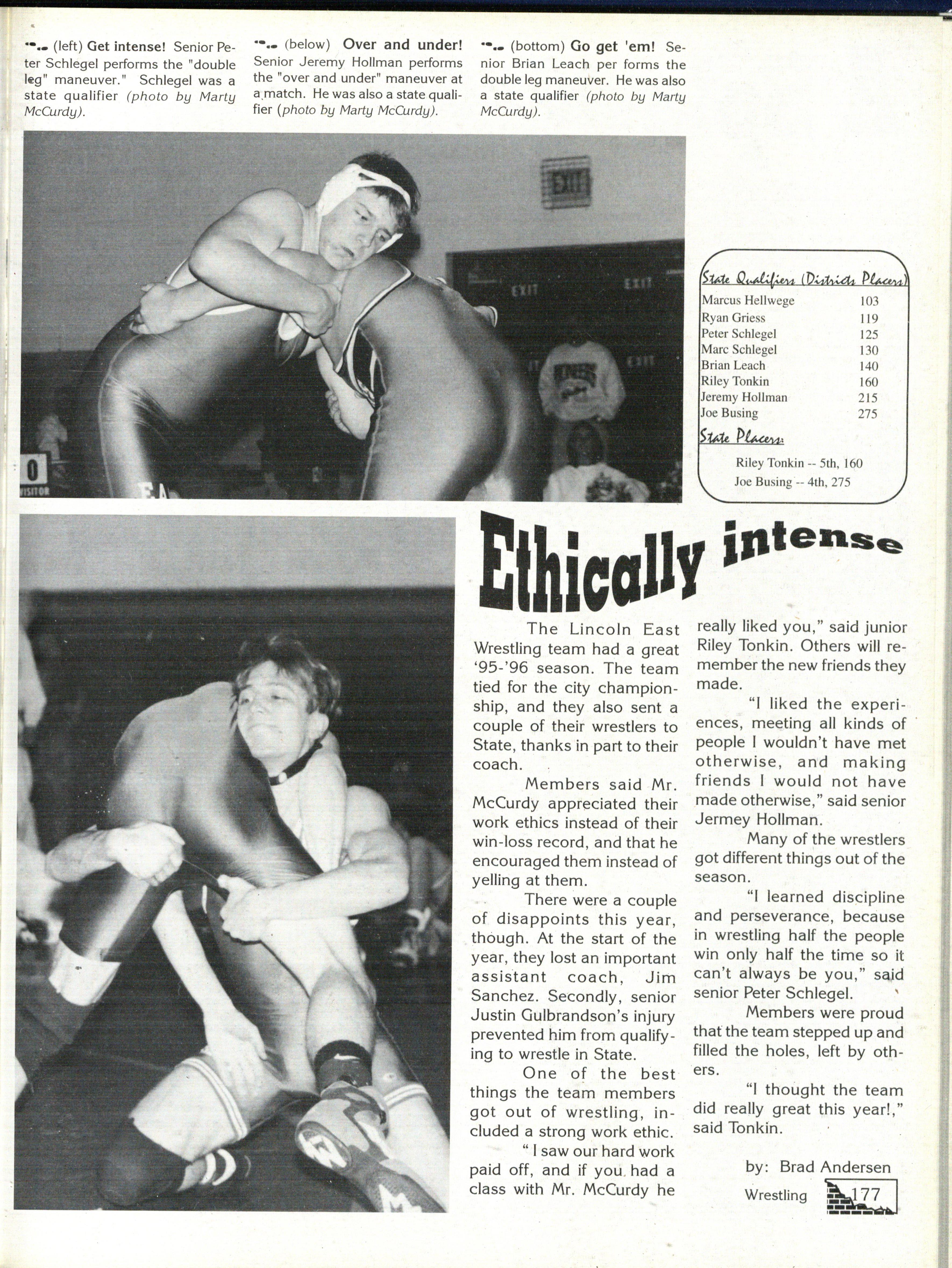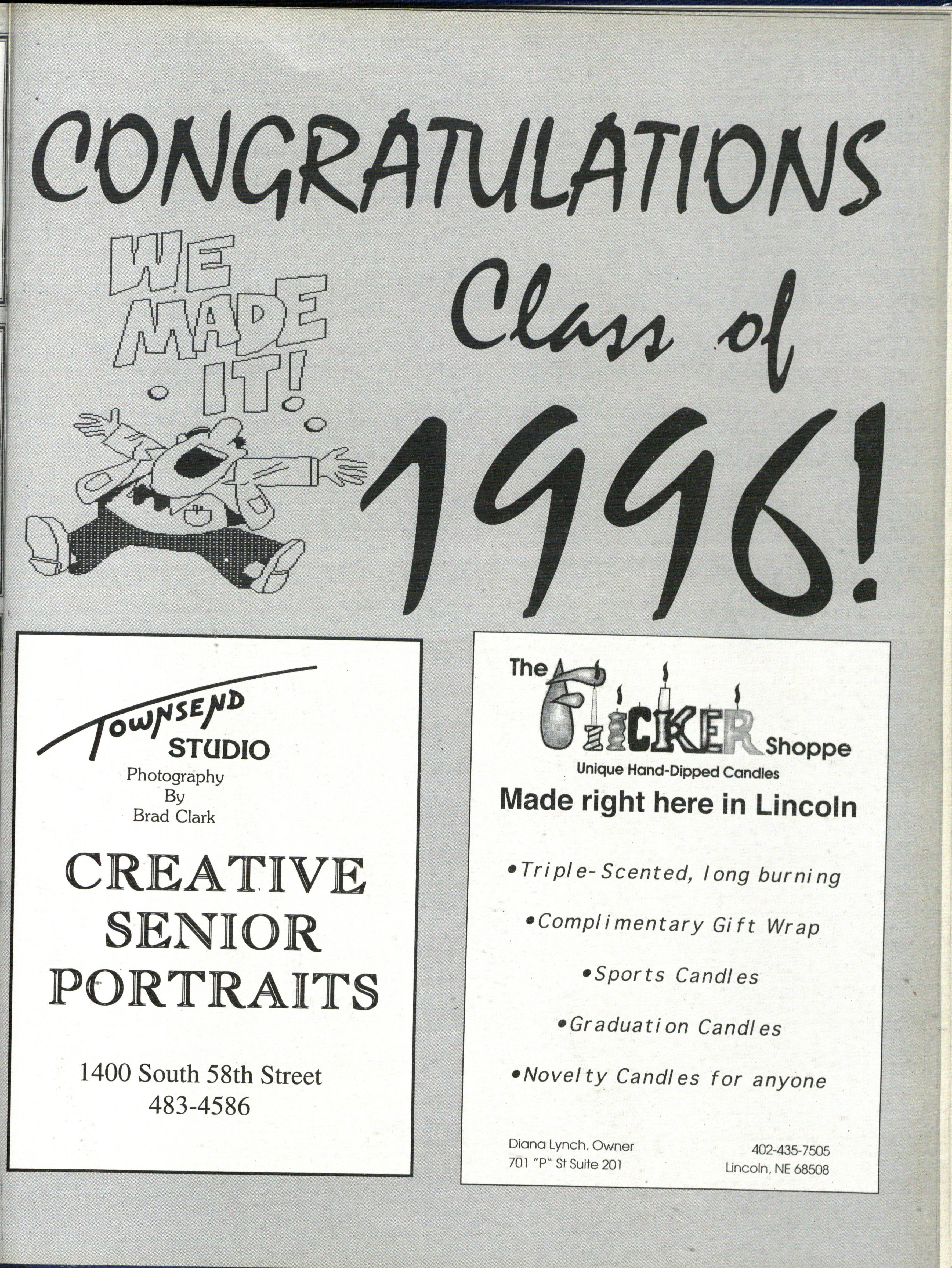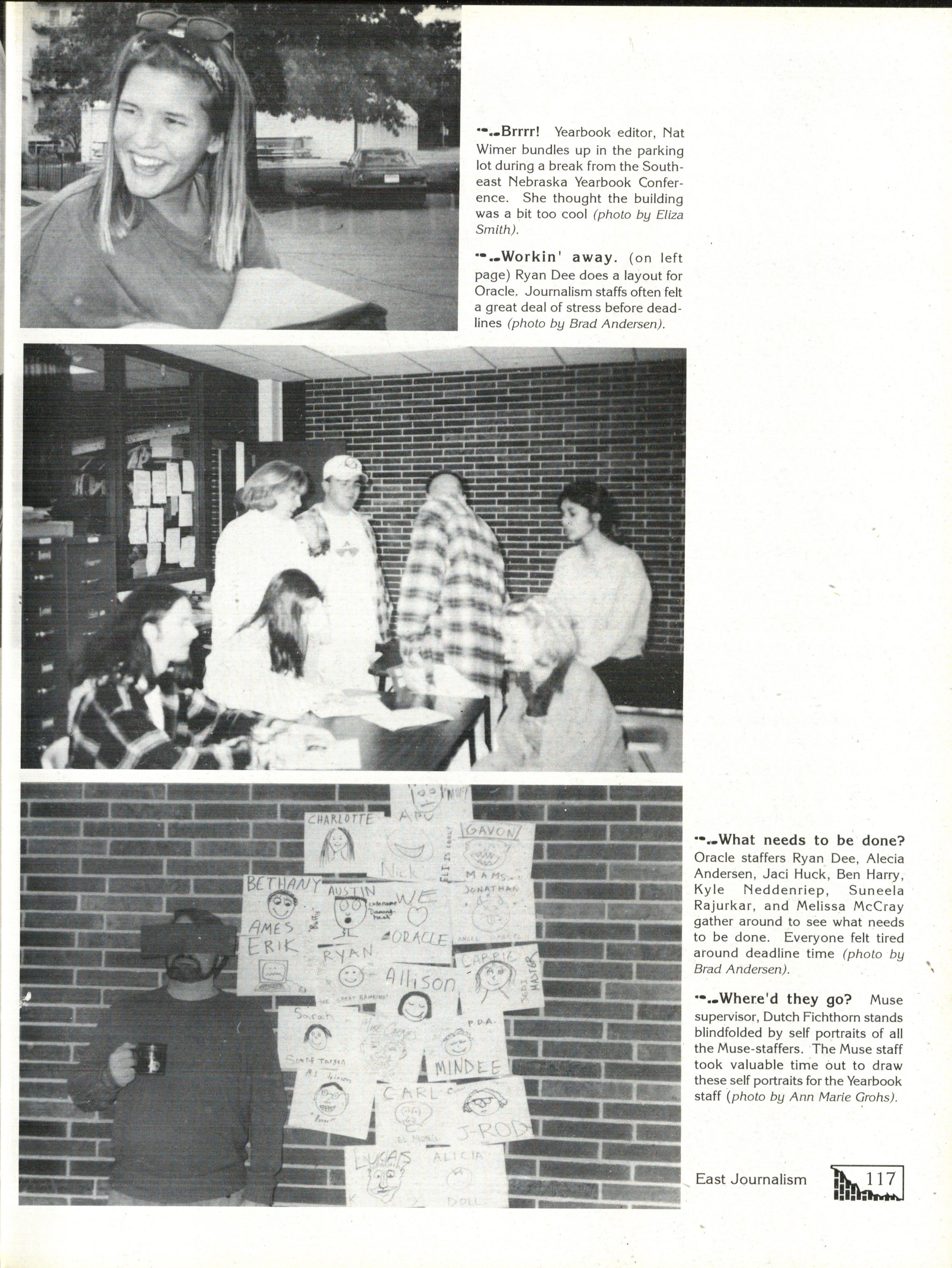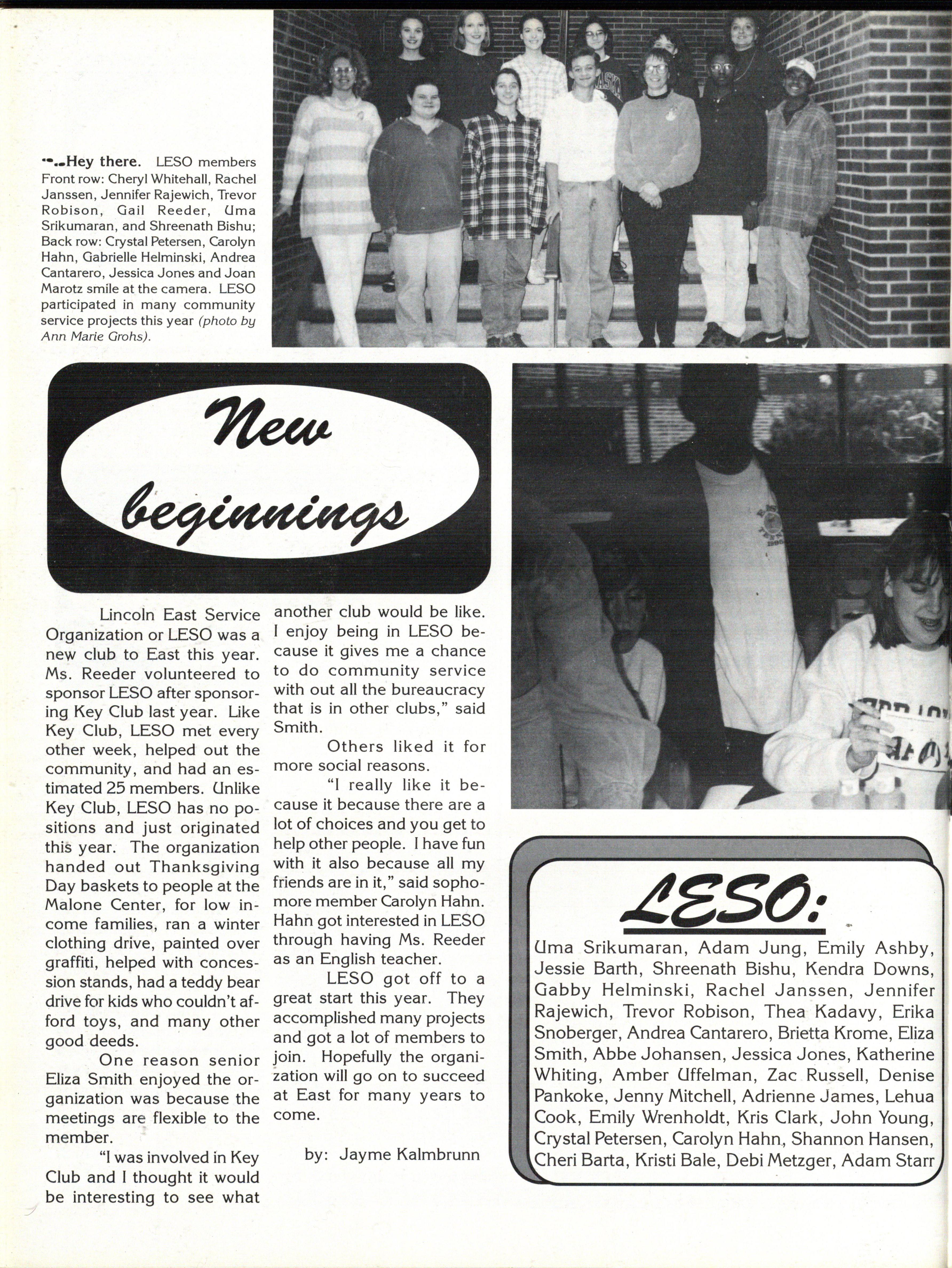 "Breaking New Ground" was the theme for the 1995-1996 Lincoln East Epic. It was chosen to represent the changing atmosphere at East. The 28th edition of the Epic was published by Walsworth Publishing Company in Marceline, Missouri. Copies of t he 236 page Yearbook were printed along with the spring supplement , for $25 in the fall and $30 in the spring. Headline styles were chosen for each section and stored on templates. The fonts for stories and captions were in Krone, but the "kickers" were bold and in 10 point, while the artwork before it was "NM" in Cairo. The actual caption copy was in 9 point Krone and the "photo by" was in italic, 9 point Krone, as well.