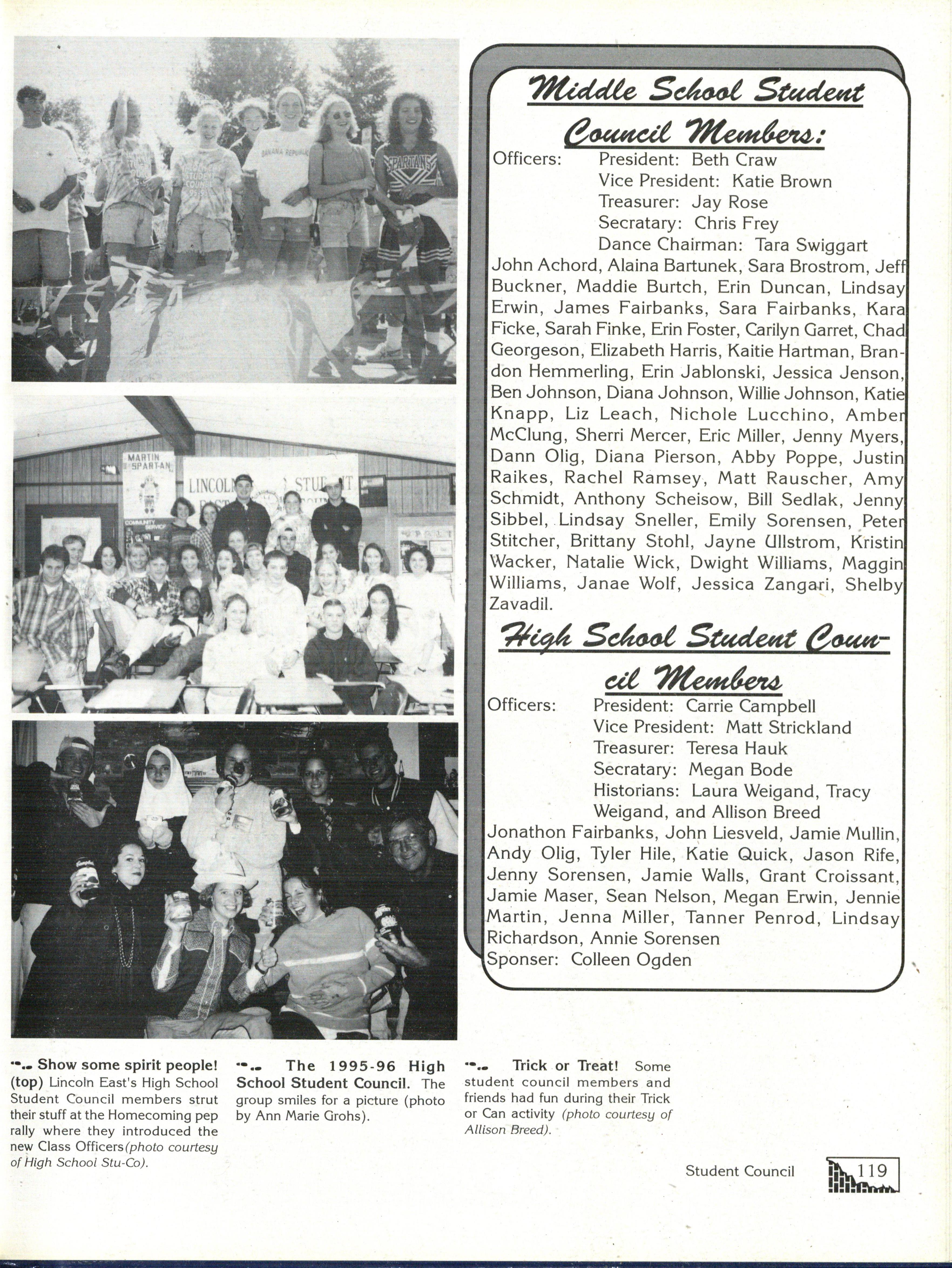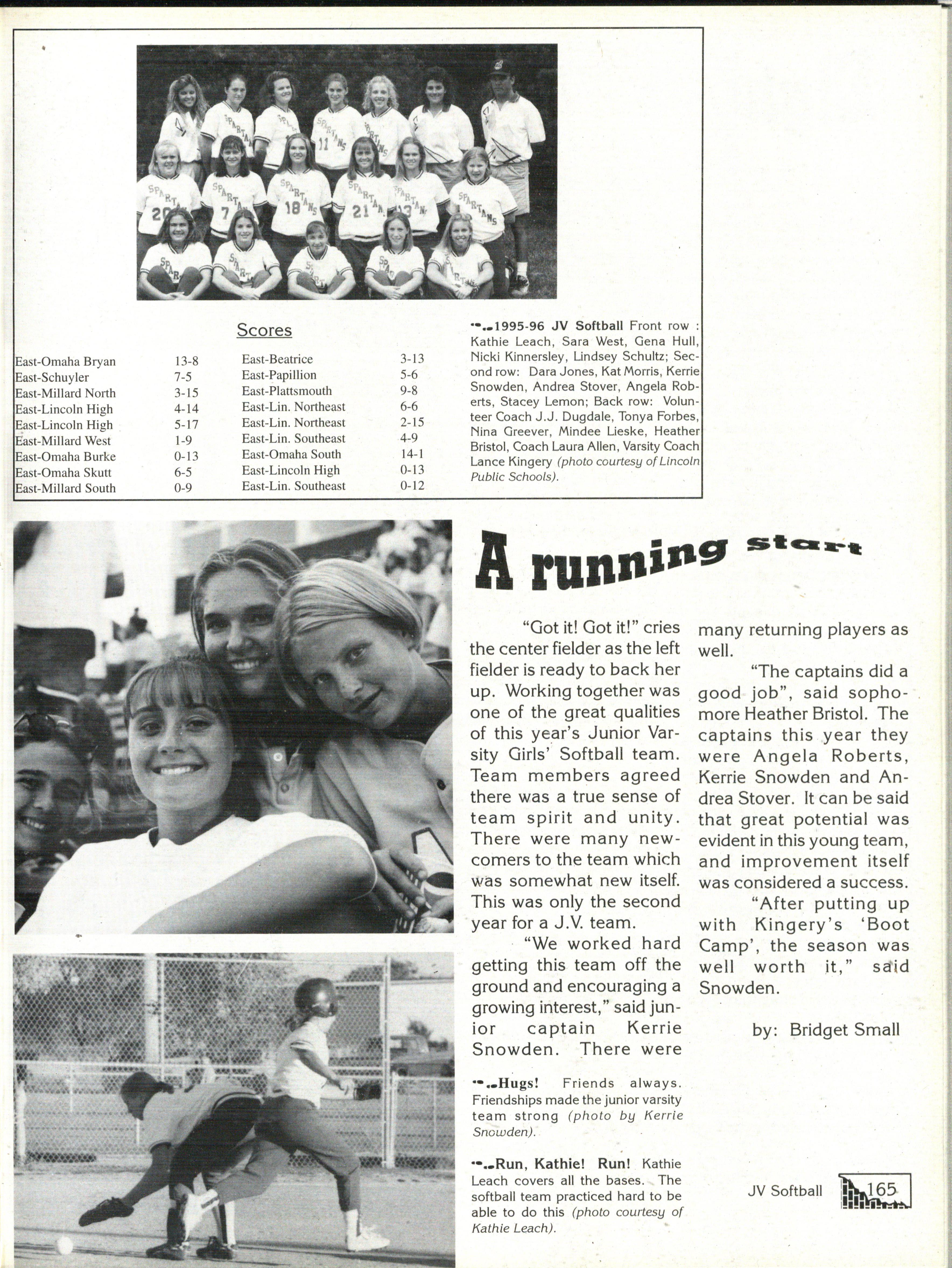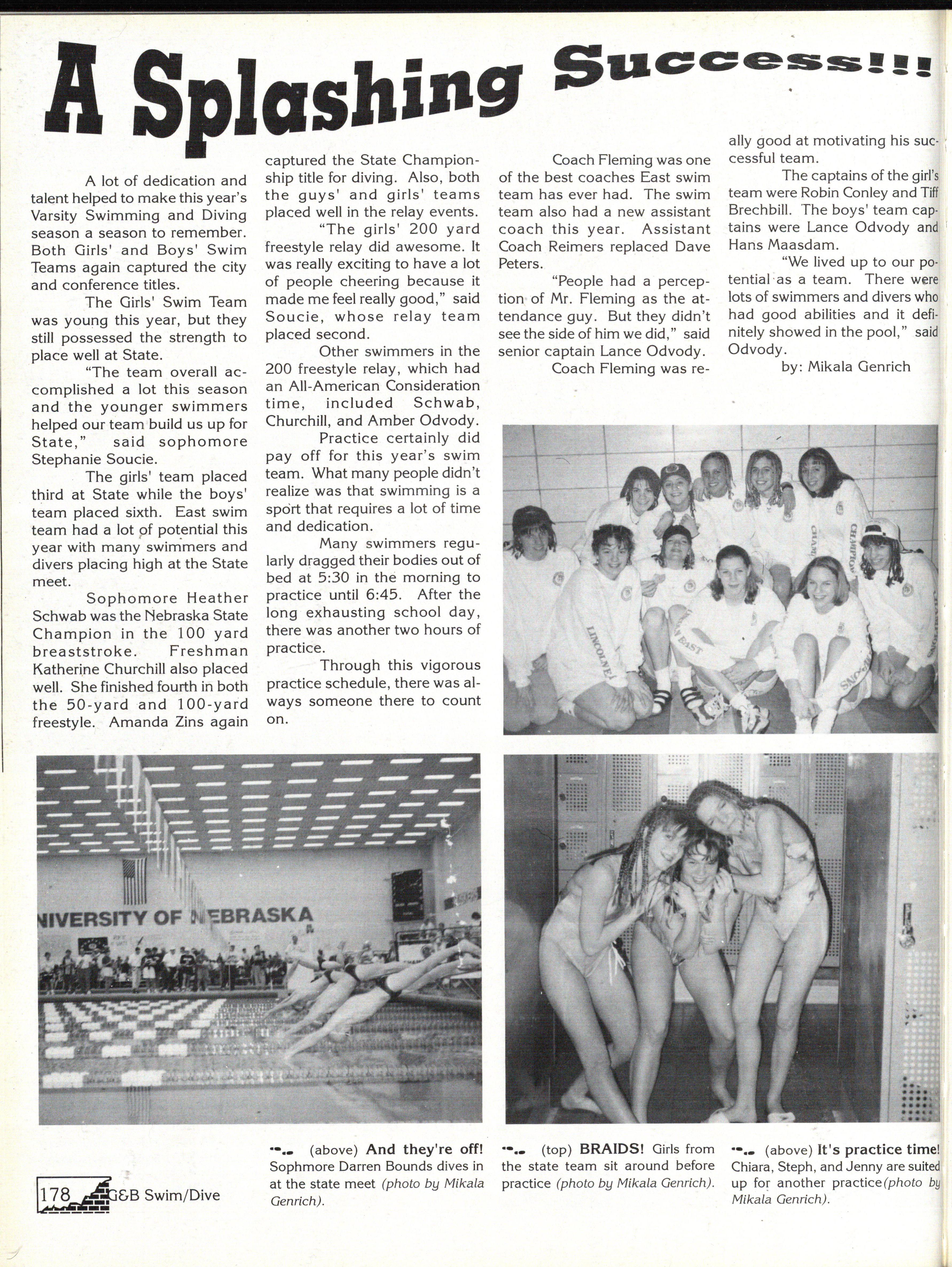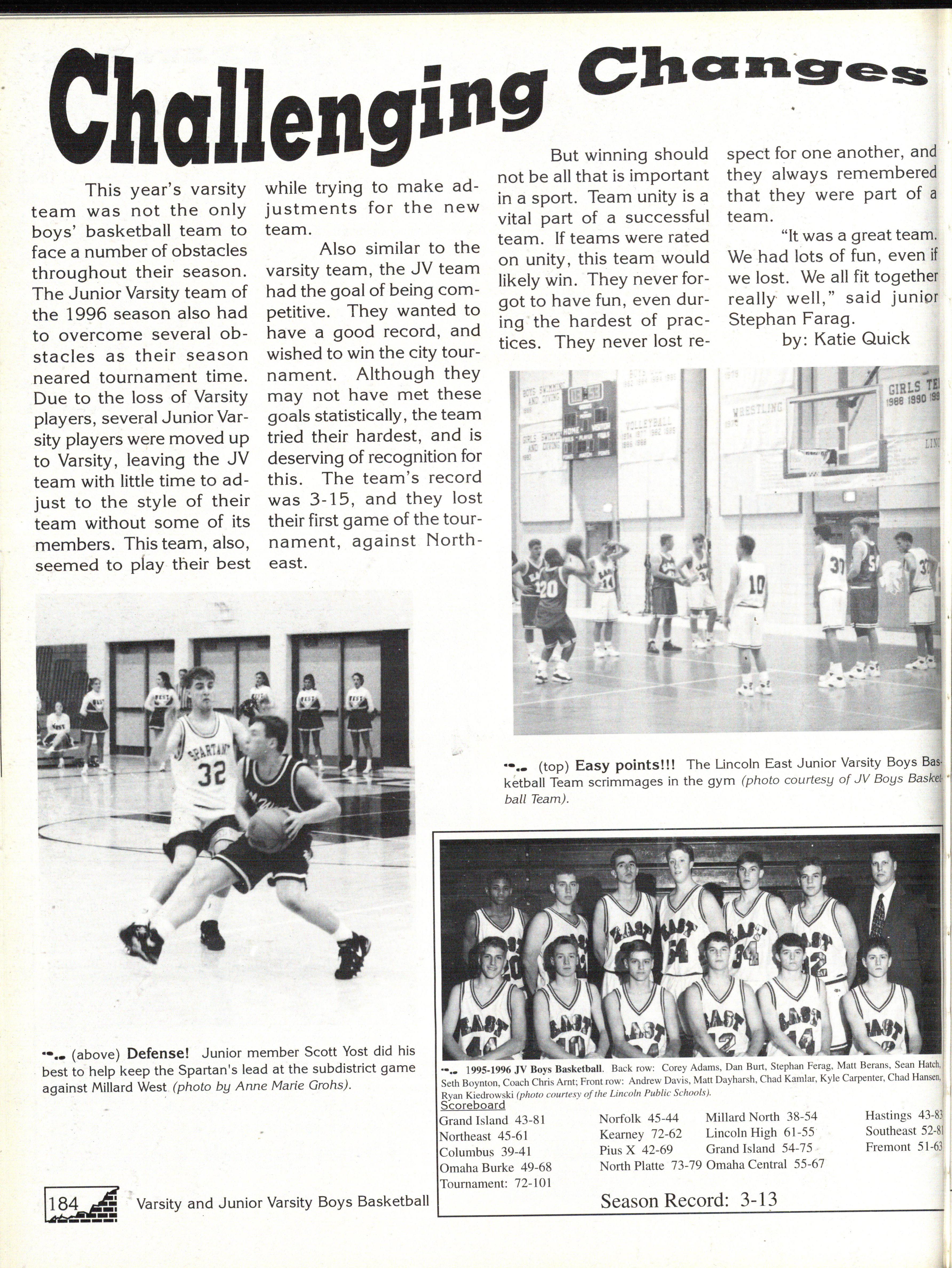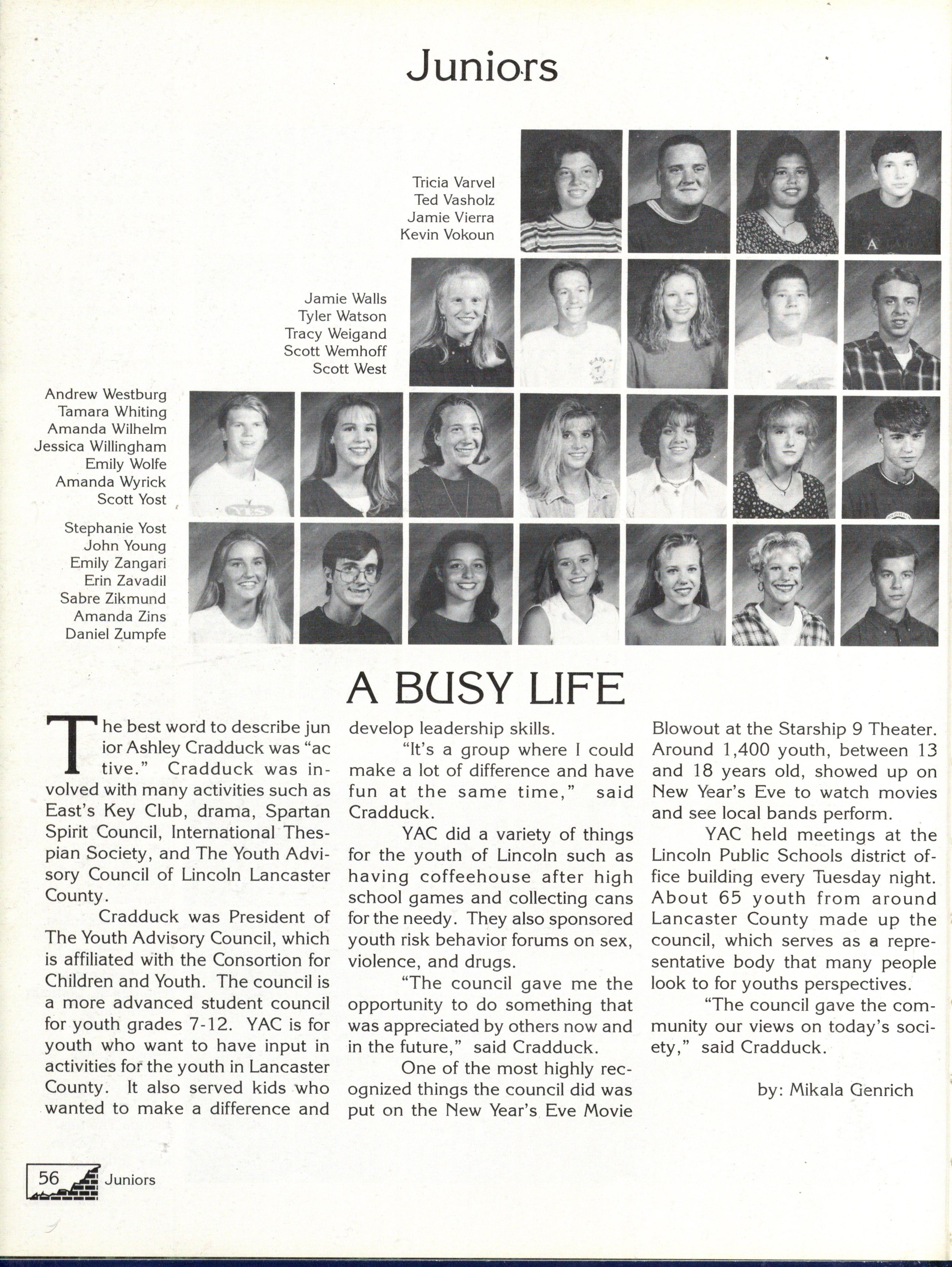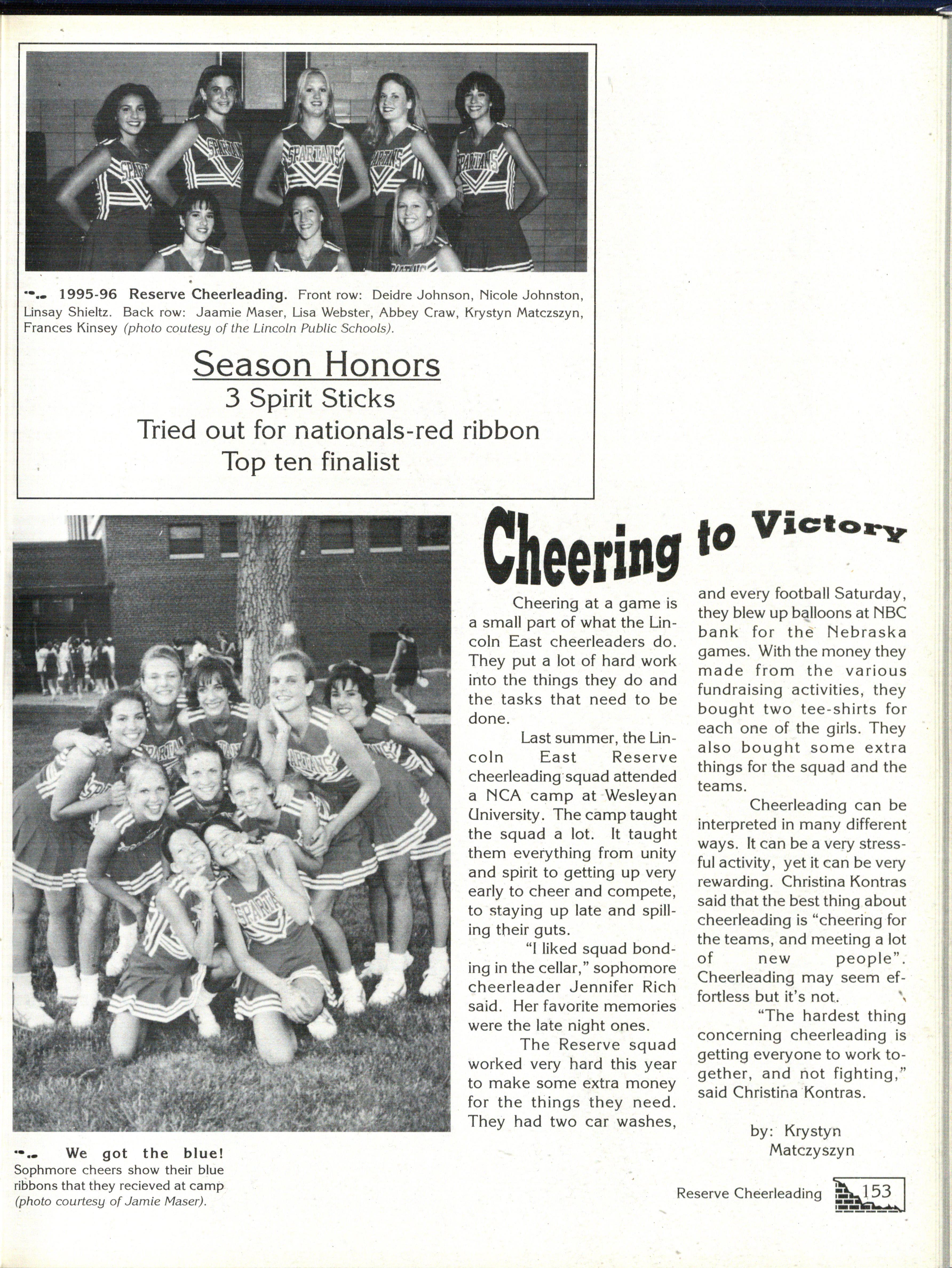 "Breaking New Ground" was the theme for the 1995-1996 Lincoln East Epic. It was chosen to represent the changing atmosphere at East. The 28th edition of the Epic was published by Walsworth Publishing Company in Marceline, Missouri. Copies of t he 236 page Yearbook were printed along with the spring supplement , for $25 in the fall and $30 in the spring. Headline styles were chosen for each section and stored on templates. The fonts for stories and captions were in Krone, but the "kickers" were bold and in 10 point, while the artwork before it was "NM" in Cairo. The actual caption copy was in 9 point Krone and the "photo by" was in italic, 9 point Krone, as well.