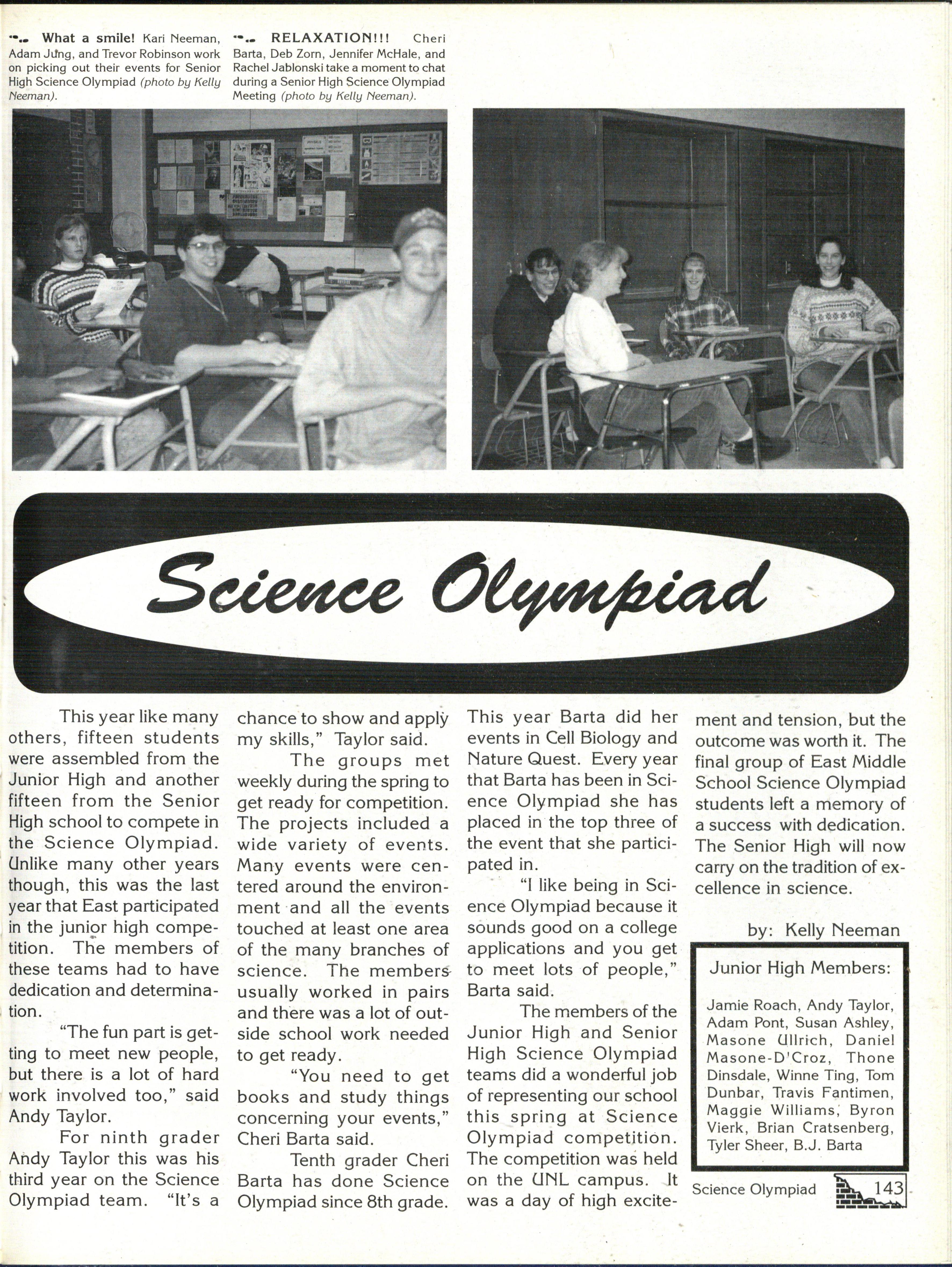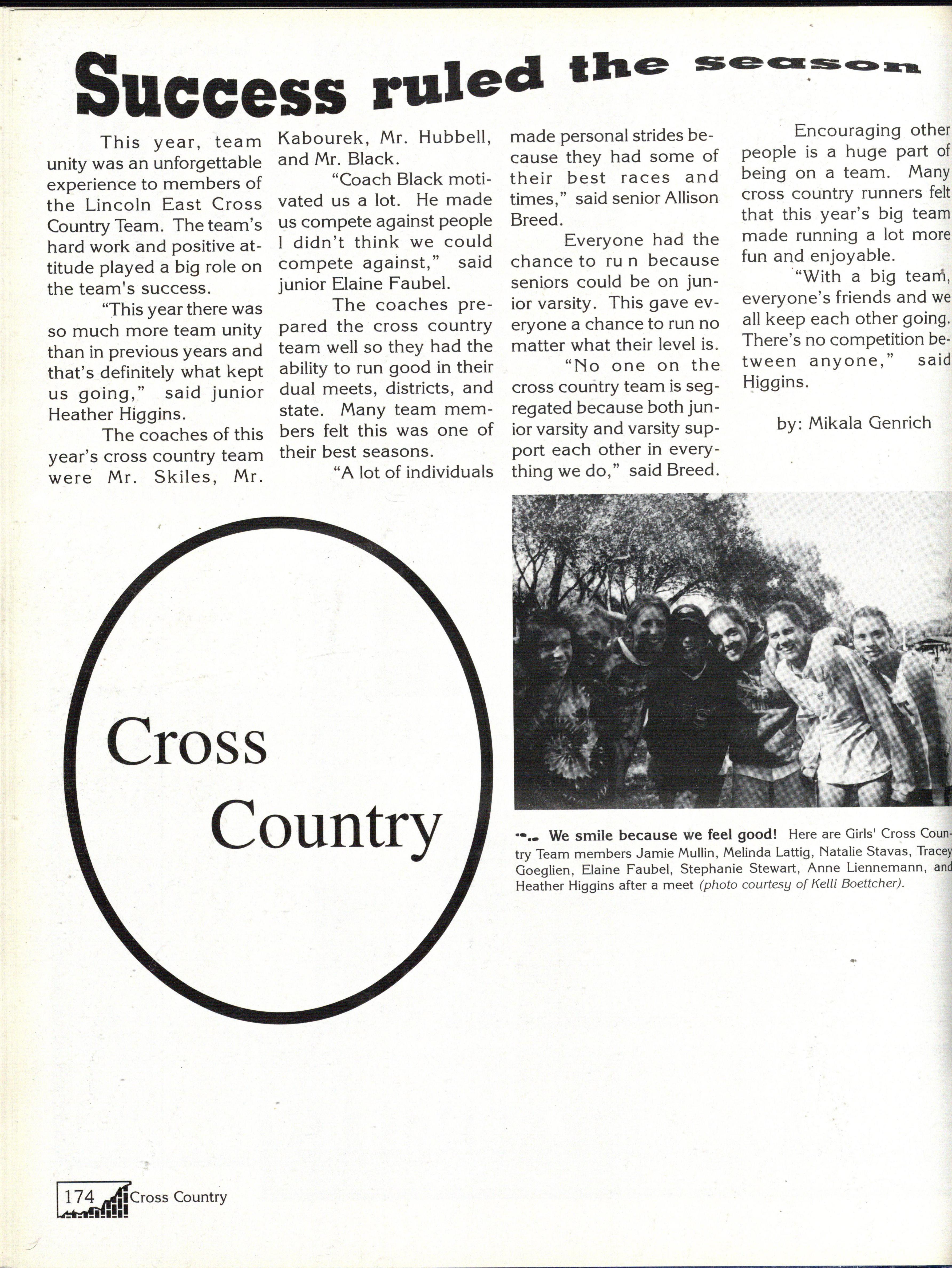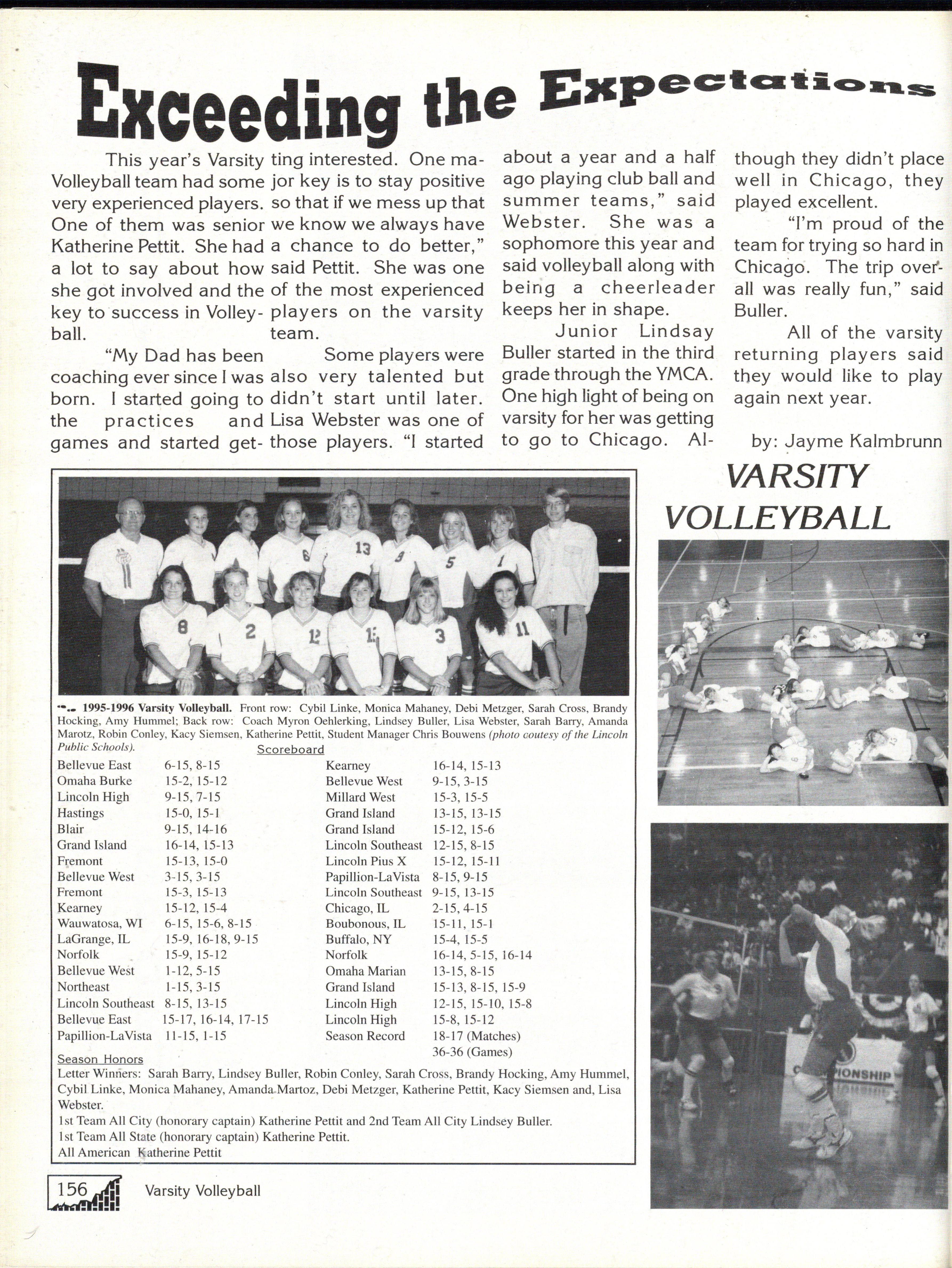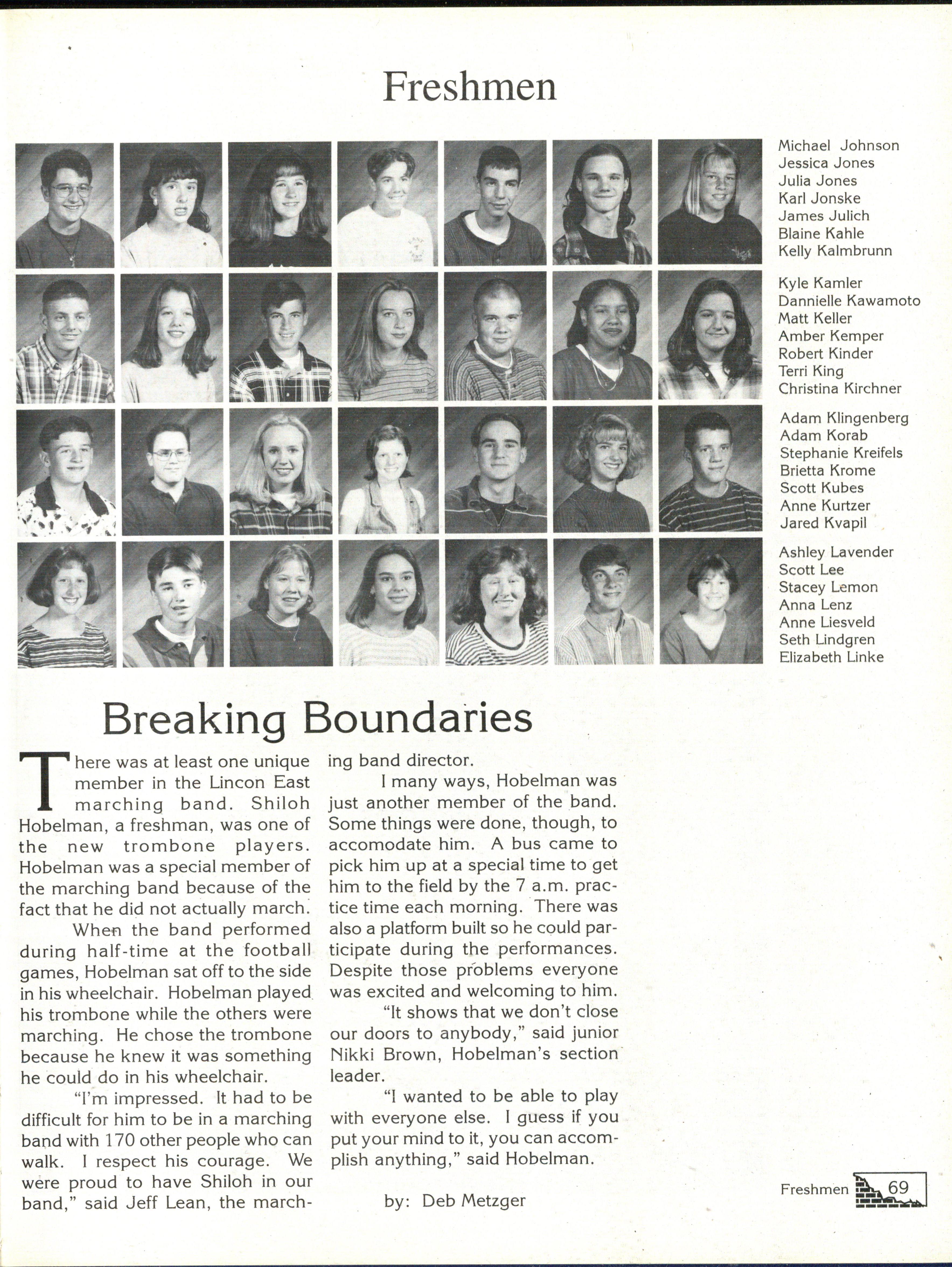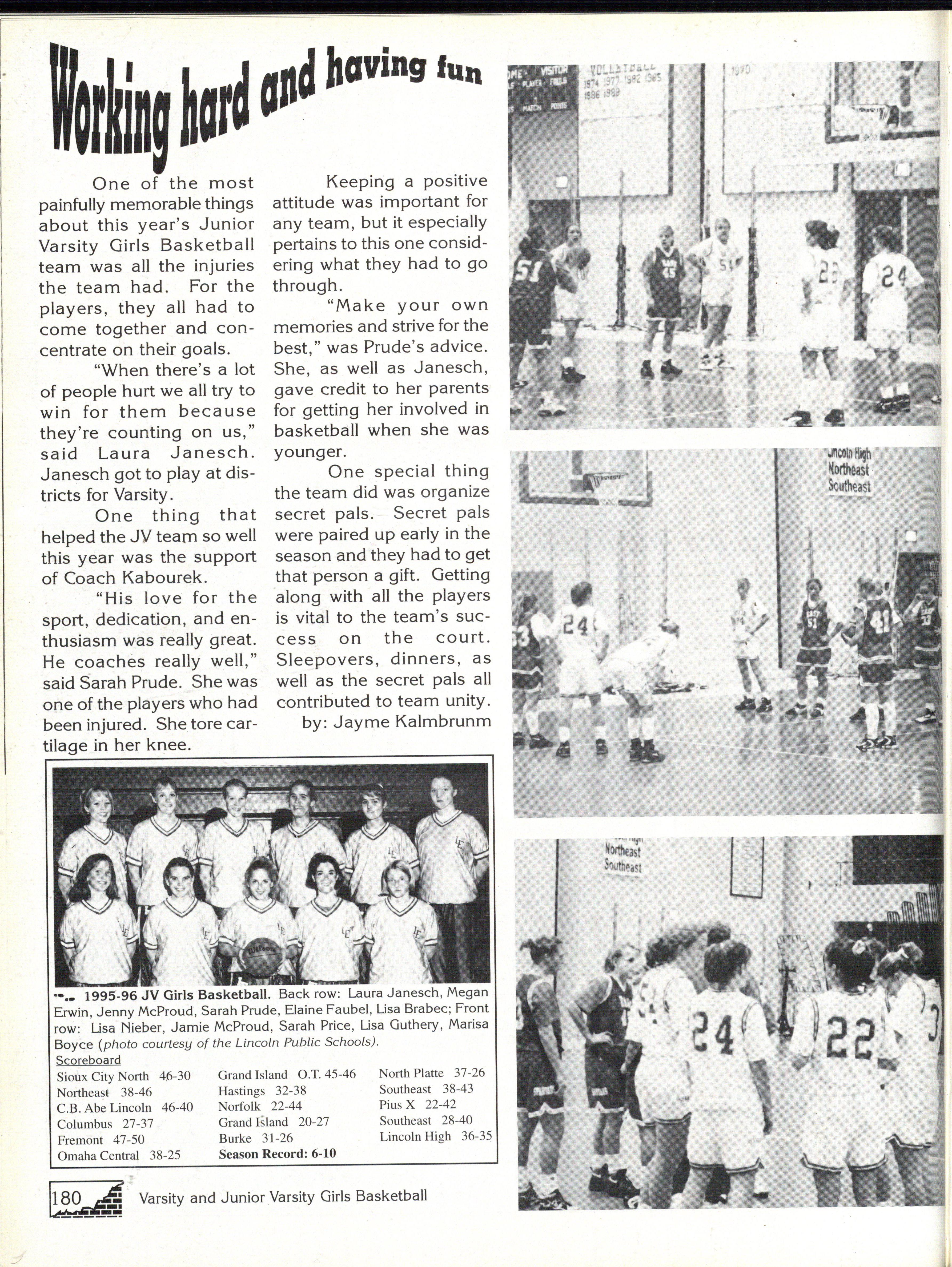"Breaking New Ground" was the theme for the 1995-1996 Lincoln East Epic. It was chosen to represent the changing atmosphere at East. The 28th edition of the Epic was published by Walsworth Publishing Company in Marceline, Missouri. Copies of t he 236 page Yearbook were printed along with the spring supplement , for $25 in the fall and $30 in the spring. Headline styles were chosen for each section and stored on templates. The fonts for stories and captions were in Krone, but the "kickers" were bold and in 10 point, while the artwork before it was "NM" in Cairo. The actual caption copy was in 9 point Krone and the "photo by" was in italic, 9 point Krone, as well.