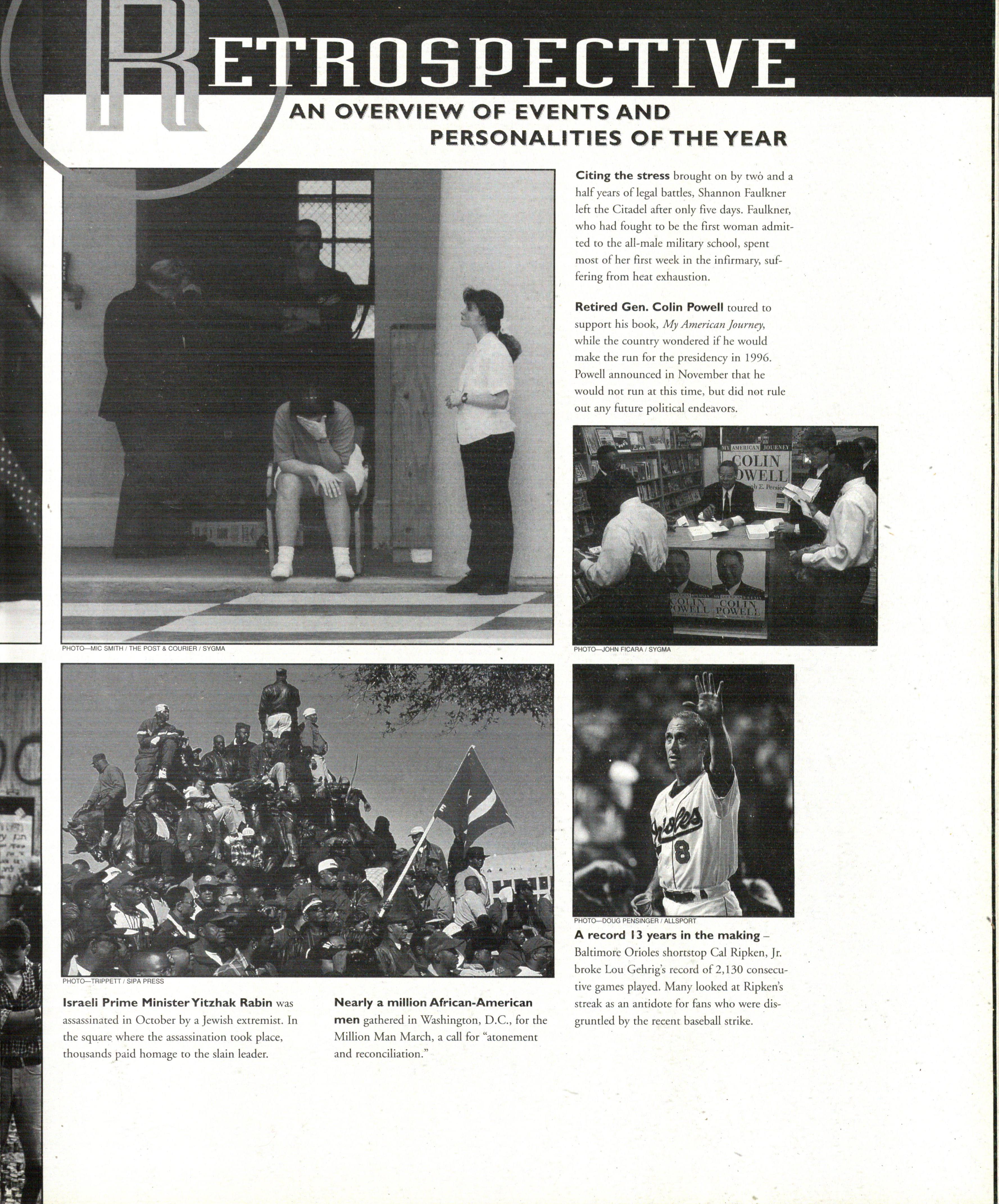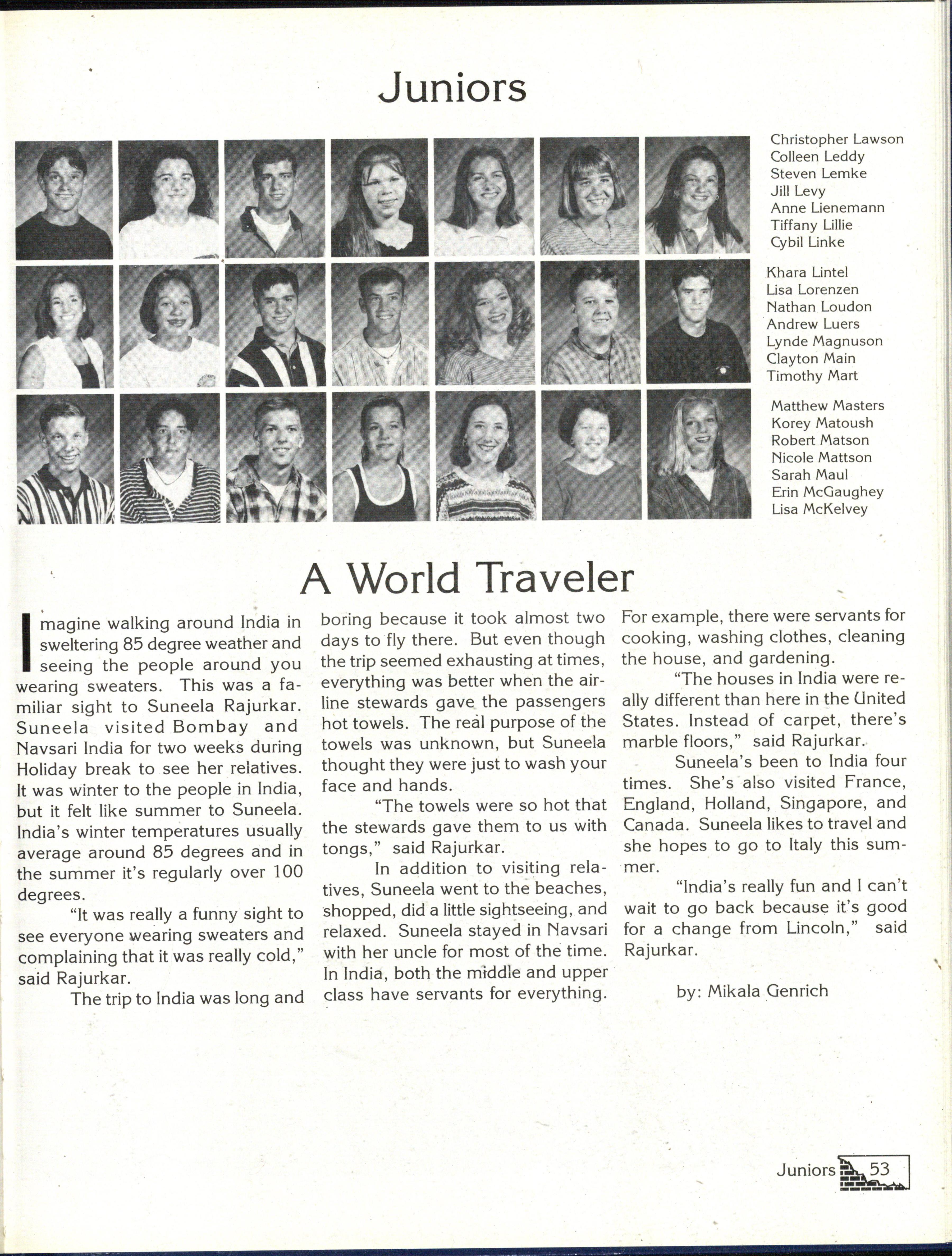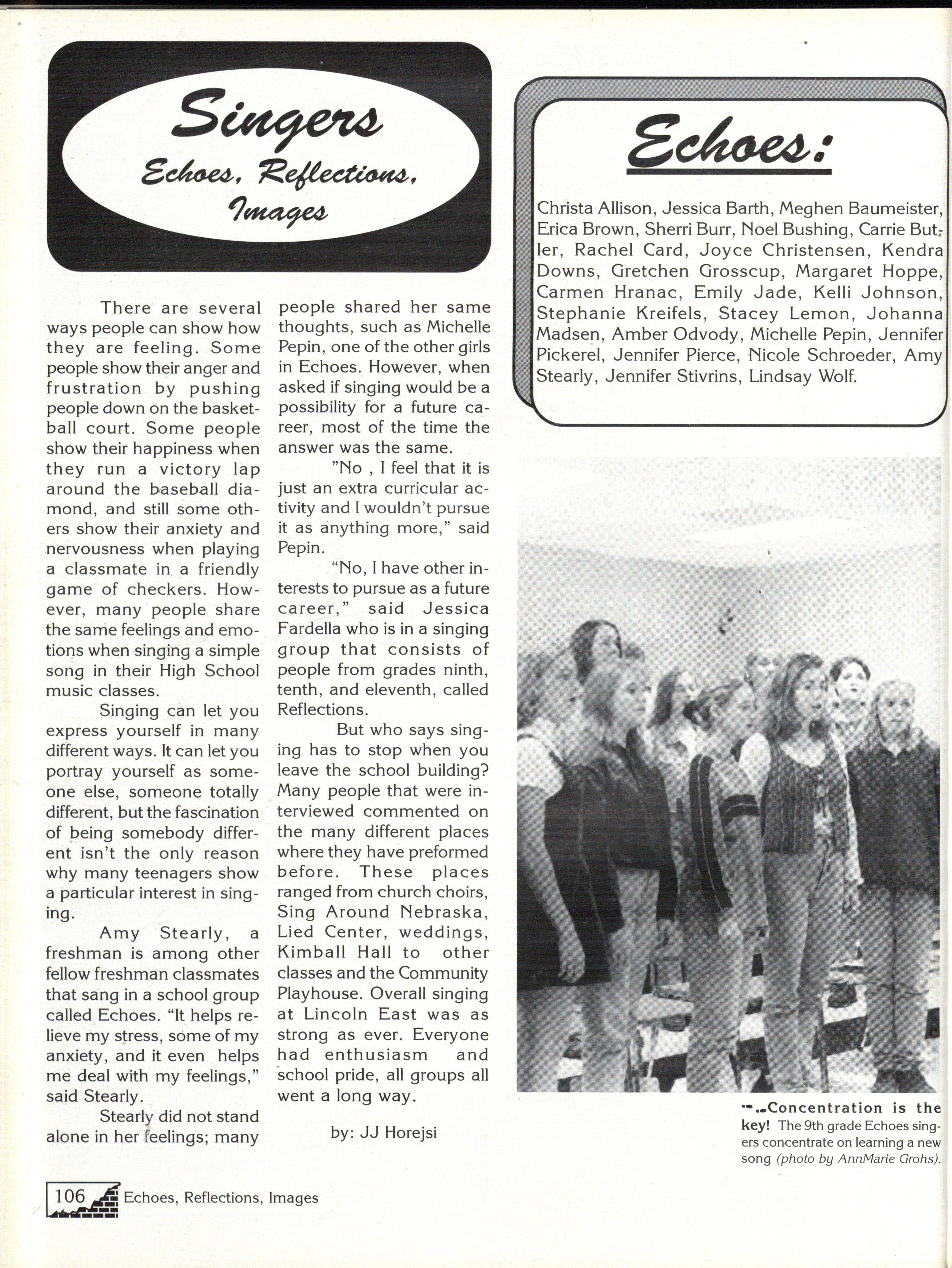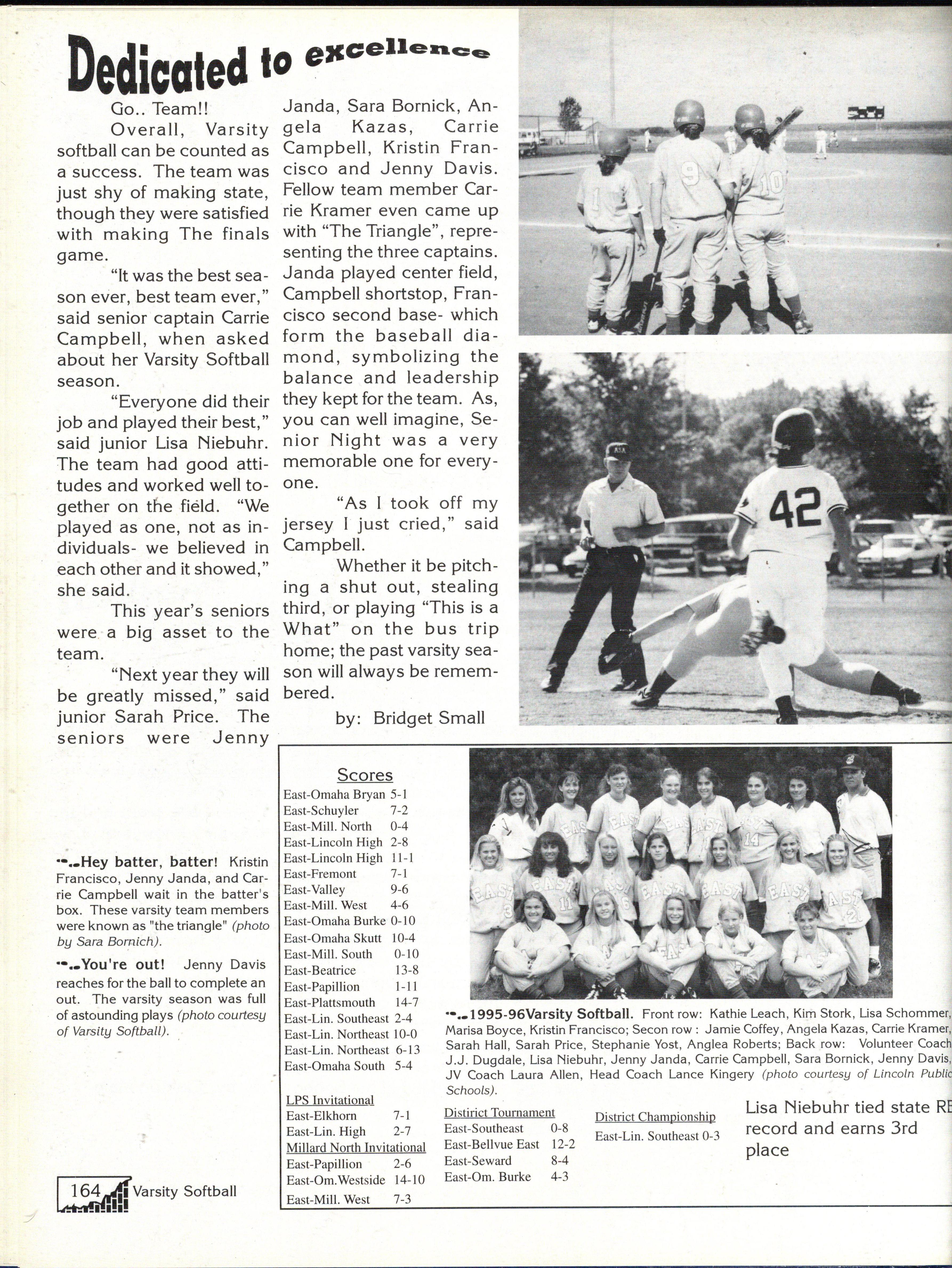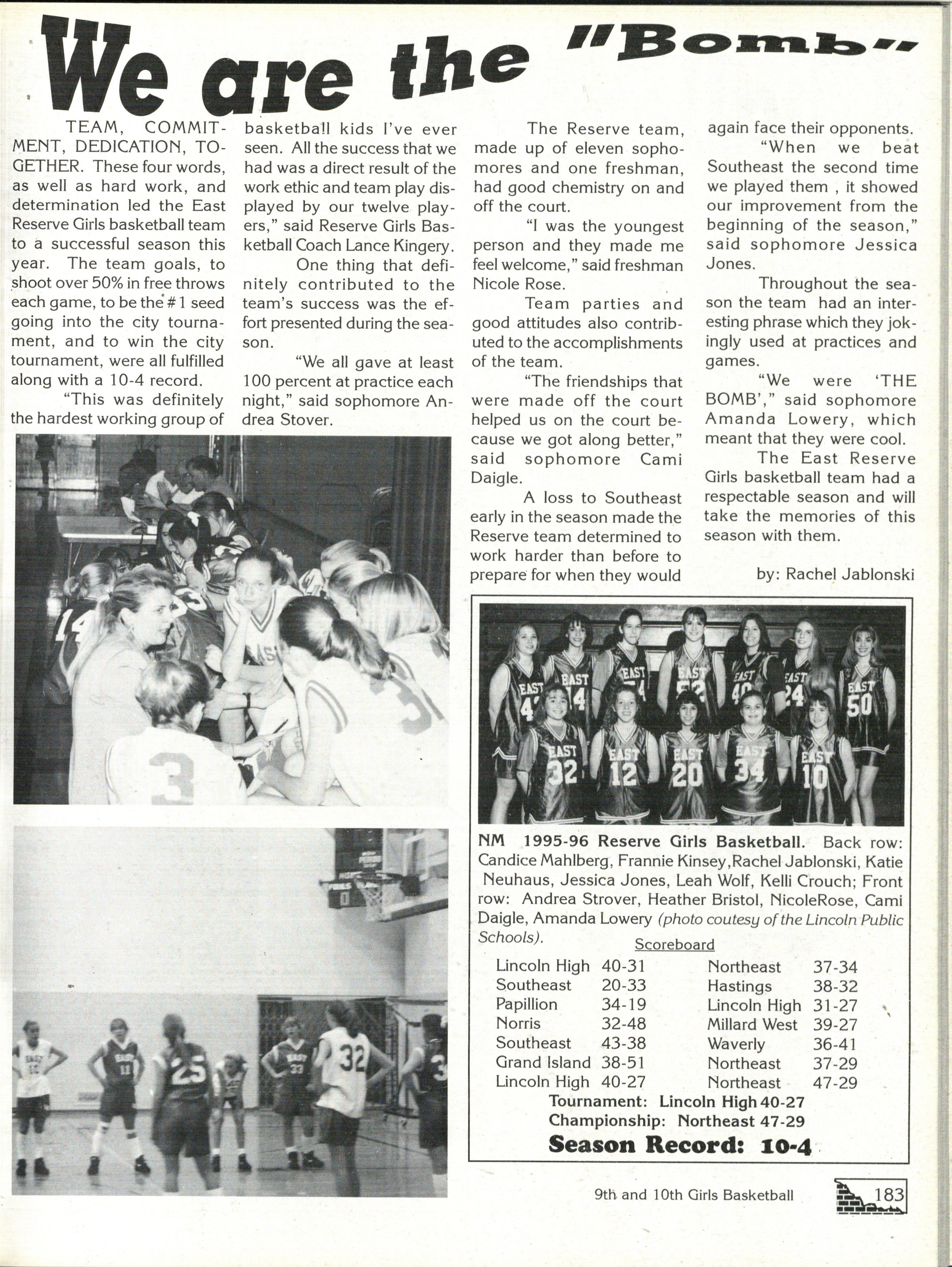 "Breaking New Ground" was the theme for the 1995-1996 Lincoln East Epic. It was chosen to represent the changing atmosphere at East. The 28th edition of the Epic was published by Walsworth Publishing Company in Marceline, Missouri. Copies of t he 236 page Yearbook were printed along with the spring supplement , for $25 in the fall and $30 in the spring. Headline styles were chosen for each section and stored on templates. The fonts for stories and captions were in Krone, but the "kickers" were bold and in 10 point, while the artwork before it was "NM" in Cairo. The actual caption copy was in 9 point Krone and the "photo by" was in italic, 9 point Krone, as well.