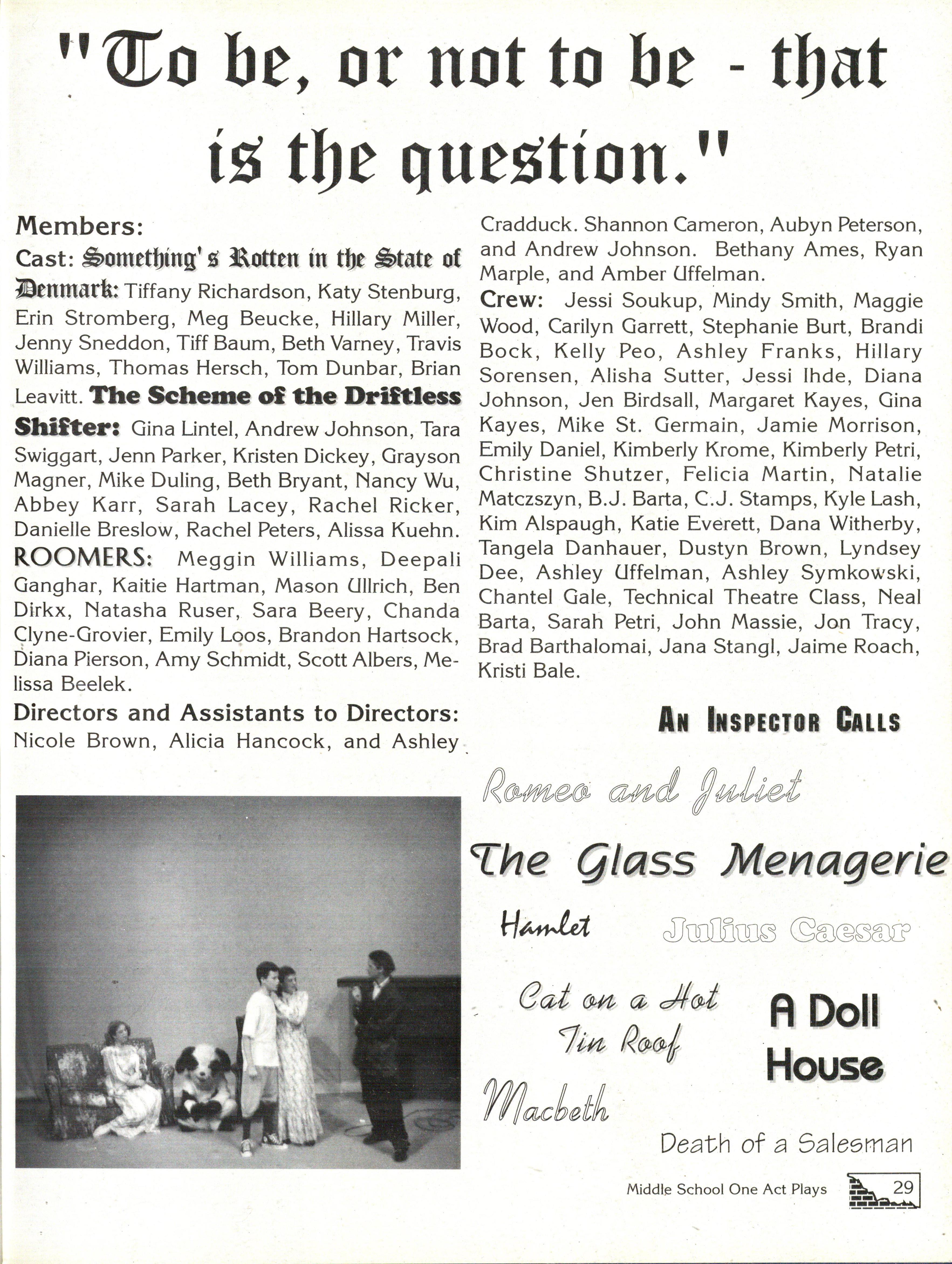 The Cast: Oluwatoui Alabi, Max Antoine, Matt Baumeister, Chris Bouwens, Kelly Bowen, Tiffany Brechbill, Melissa Breslow, Jon Brolhorst, Jennifer Bruning, Amy Burns, Carrie Campbell, Kristin Clark, Robin Conley, Jeremy Craw, Sarah Cross, Sophie Cumming, Jenny Davis, Kristin Deaton, Tony Demma, Mark Digman, Chris Dougherty, Adam Eppert, Katie Fosnaugh, Alicia Fuss, Lynsey Gardner, T.J. Giltner, Dan Griesen, Chad Hansen, Gabrielle Helminski, Elizabeth Helton, Megan Henry, David Hersch, Karen Higley, J Hocking, Carrie Hoff, Tiffany Hovermale, Amy Hummel, Jason Jedlicka, Jennifer Jenson, Kurt Jonske, Melissa Koehler, Carrie Kramer, John Liesveld, Hans Maasdam, Lynde Magnuson, Monica Mahaney, Naten Maniktala, Judson Martin, Sarah Maul, Marty Melang, Lisa Niebuhr, Amit Patel, Kathleen Pierce, Kristin Rauscher, Trevor Robison, Donald Seacrest, John Sneddon, Matt Strickland, Brenda Thomas, Jamie Walls Tamara Whiting, Amanda Wilhelm, Amanda Zins.