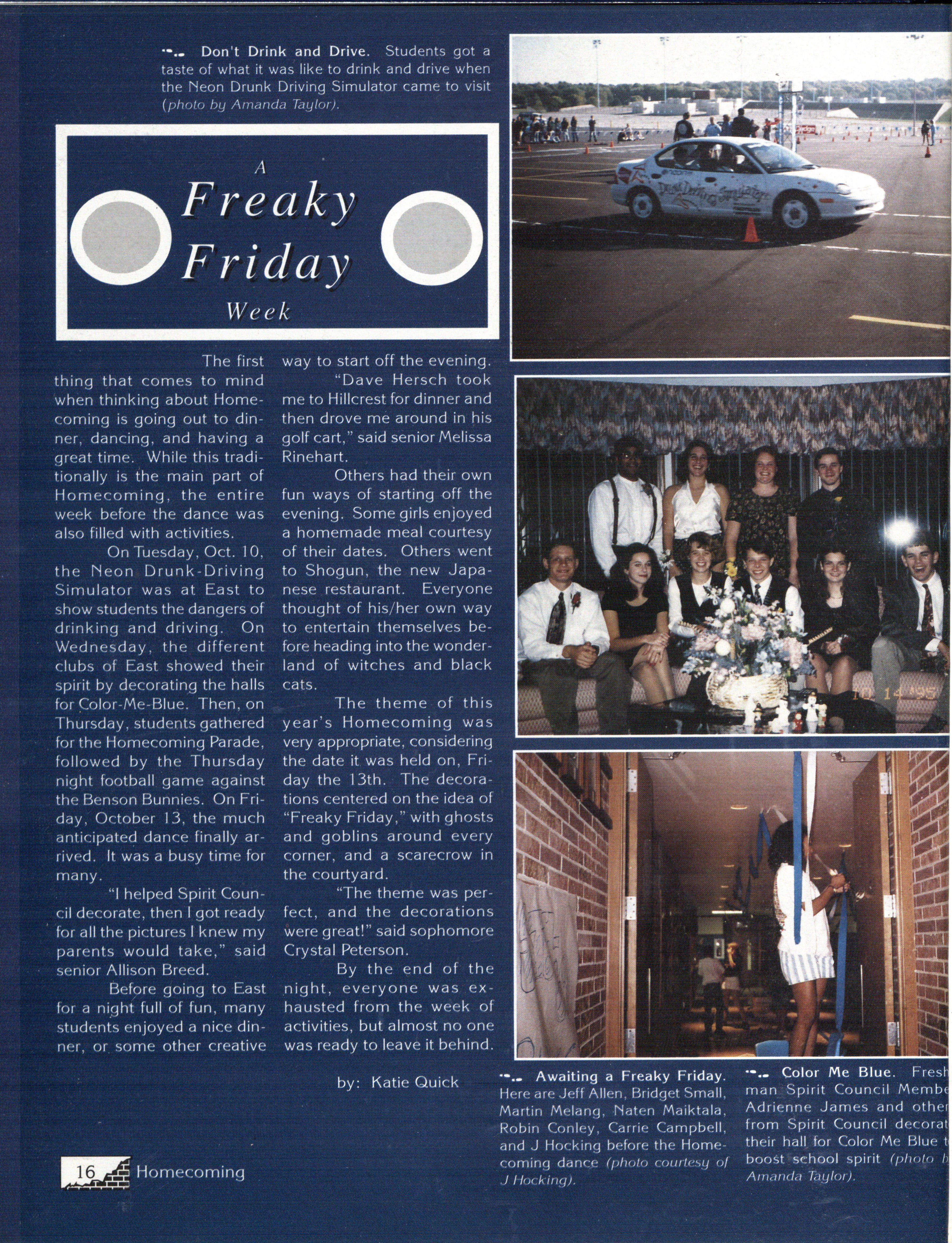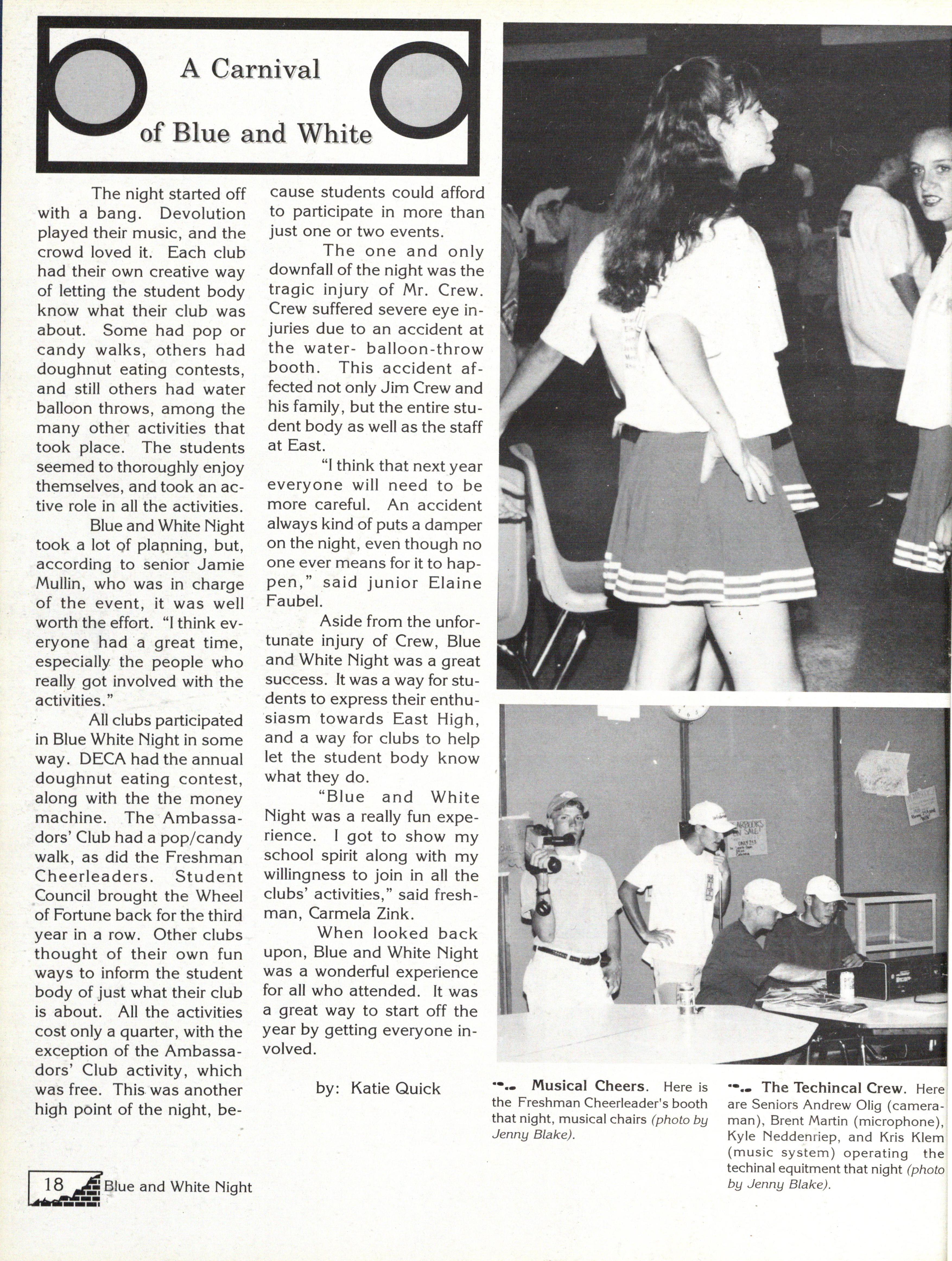 The one and only downfall of the night was the tragic injury of Mr. Crew. Crew suffered severe eye injuries due to an accident at the water- balloon-throw booth. This accident affected not only Jim Crew and his family, but the entire student body as well as the staff at East.