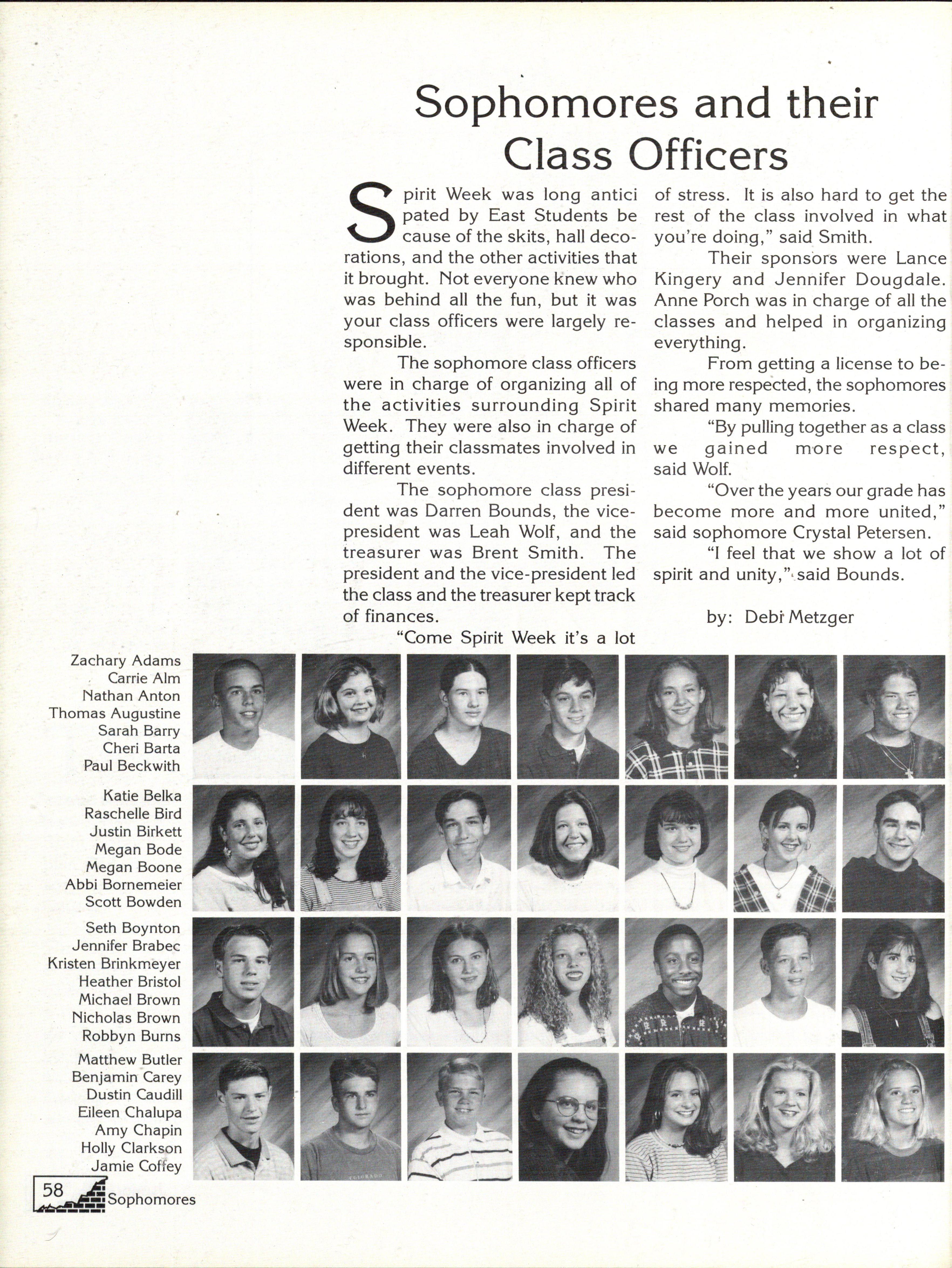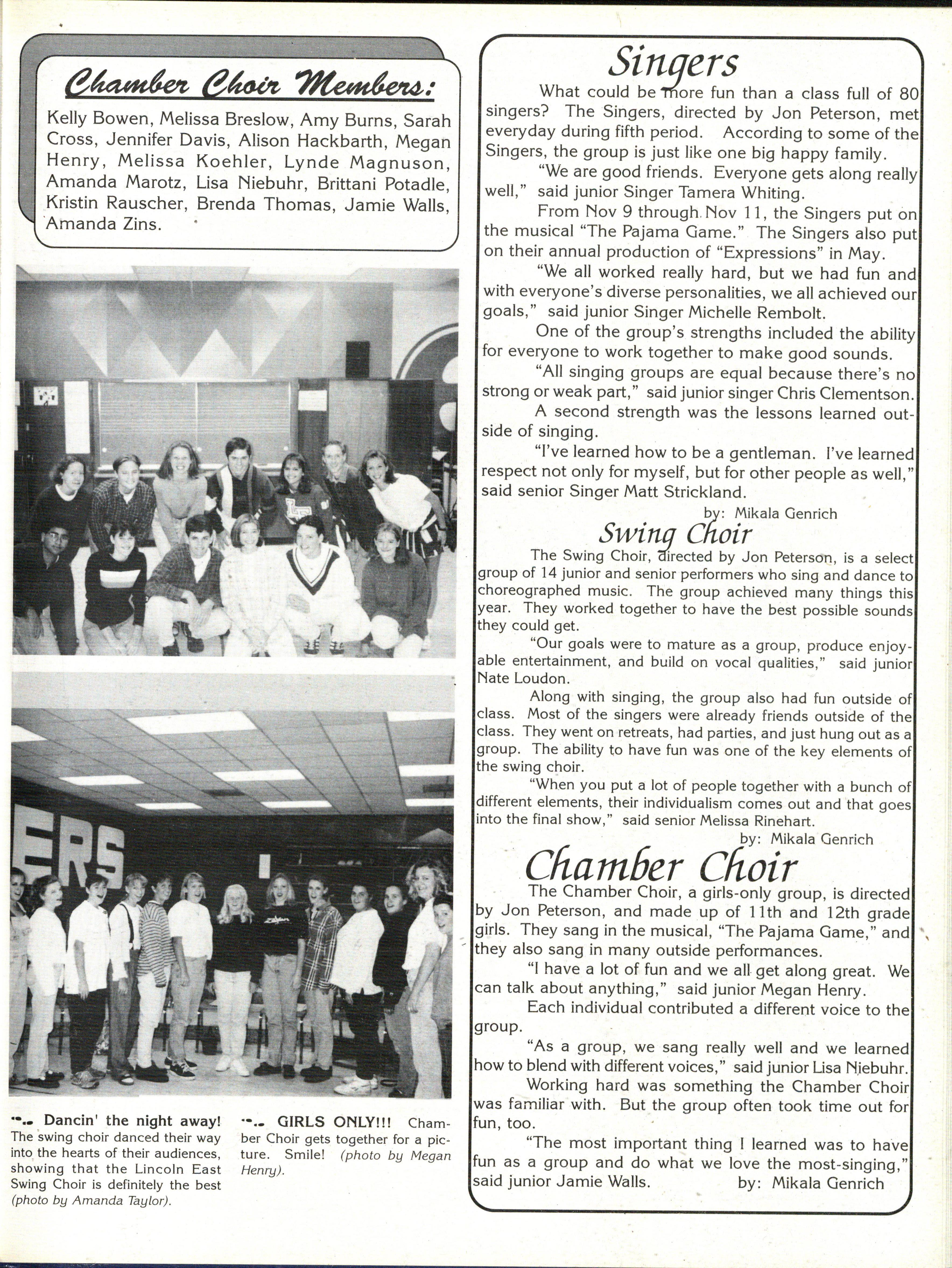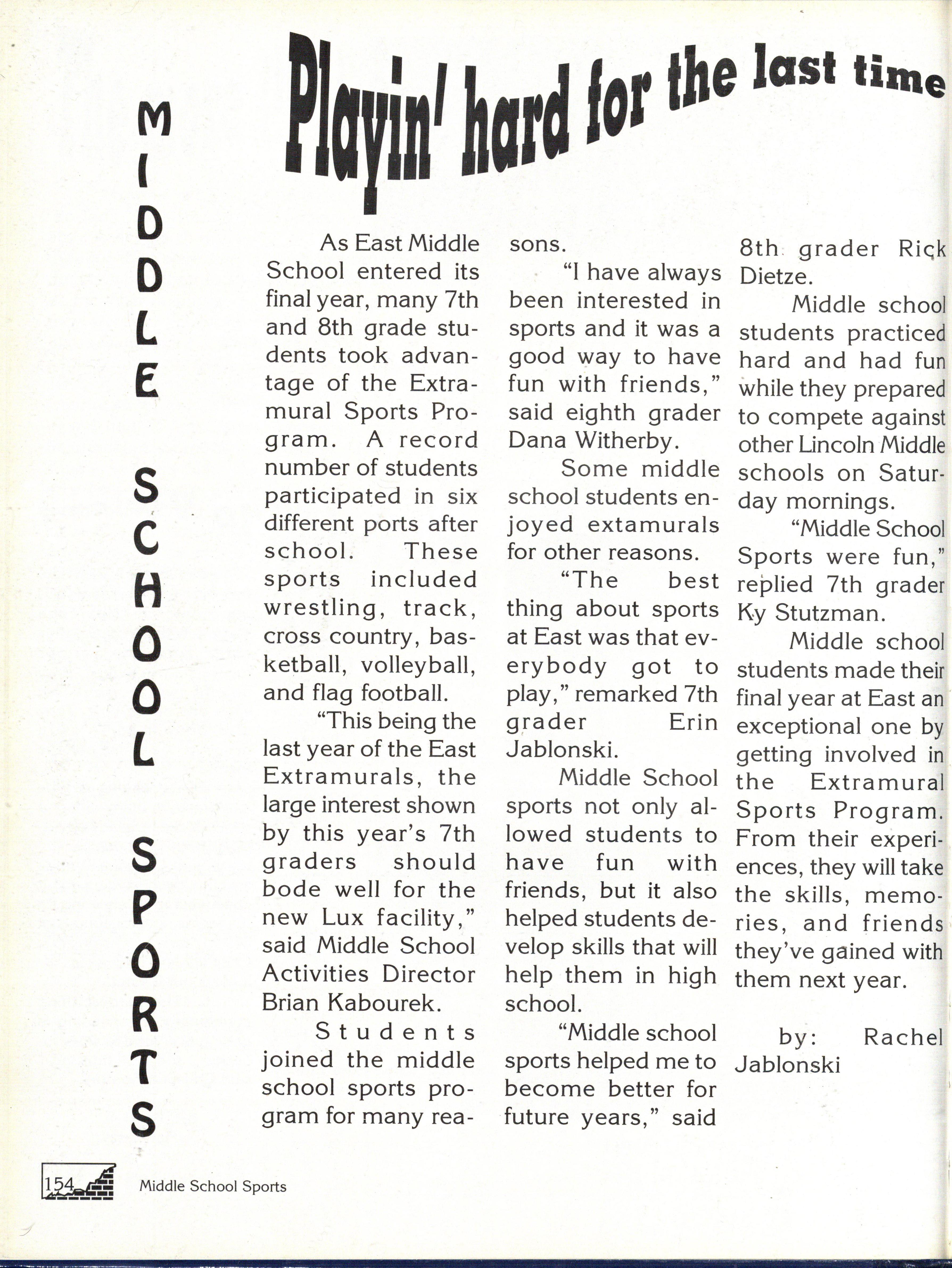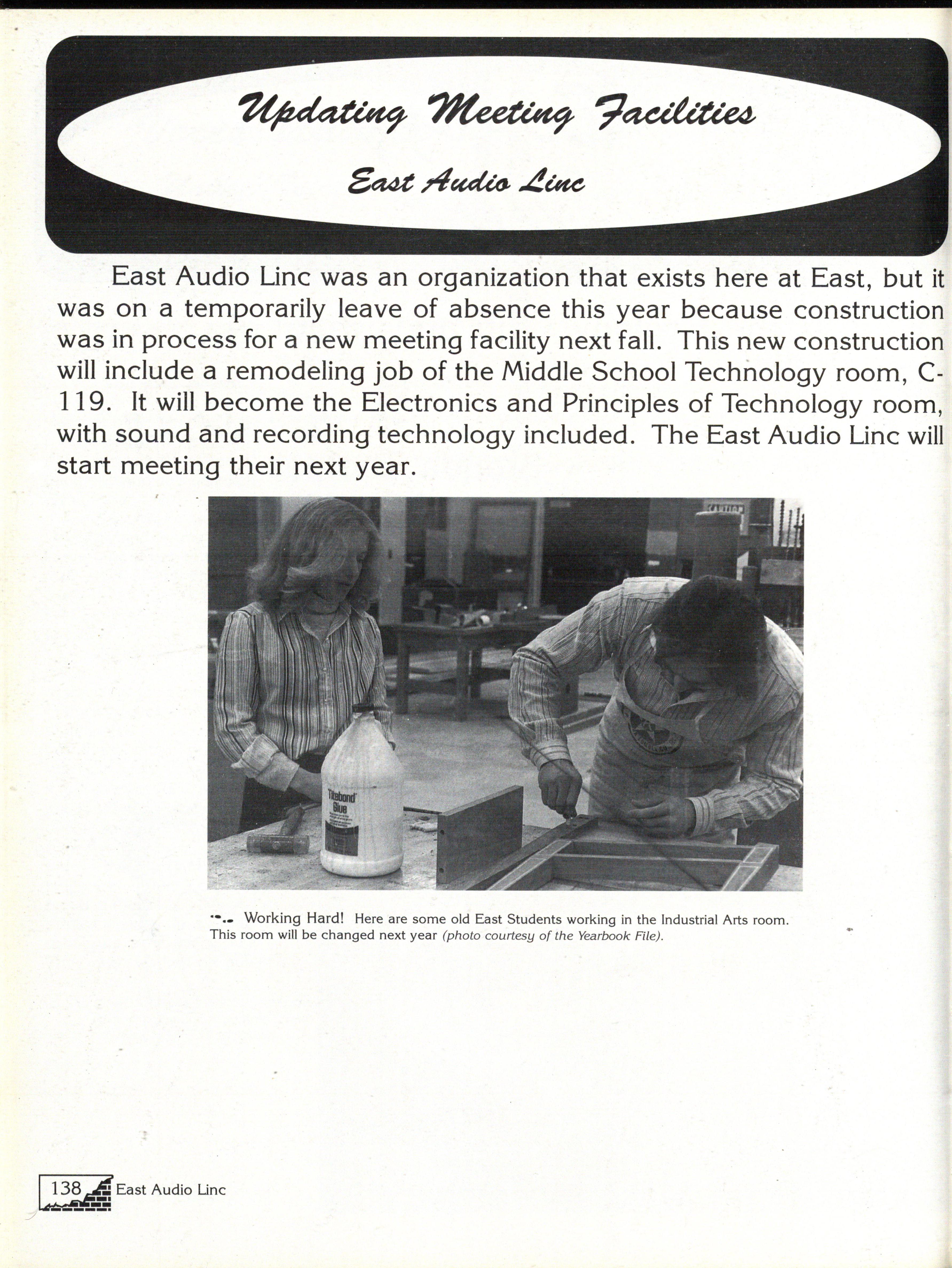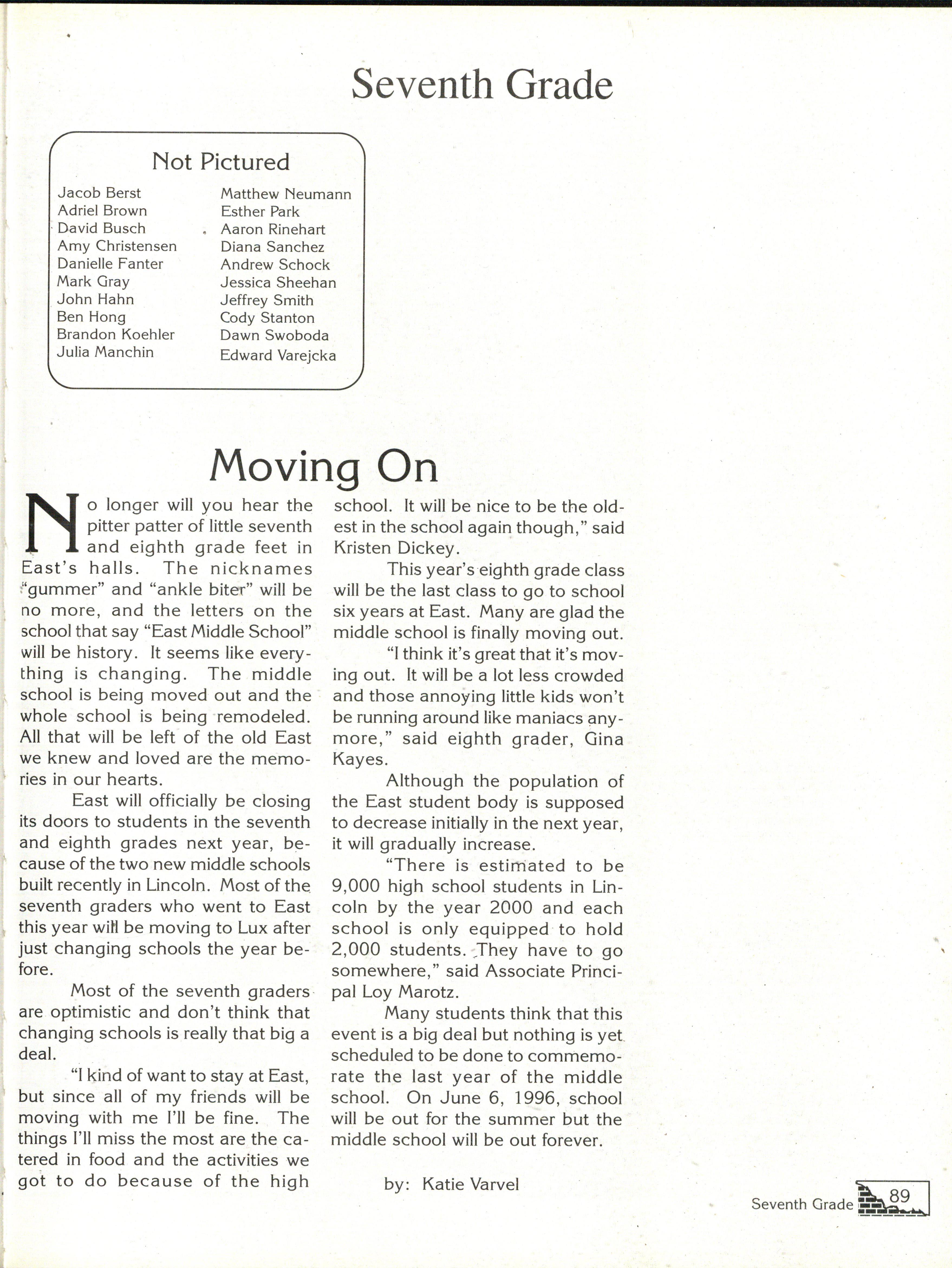 The '95- '96 school year had quite a few lasts, but it had several firsts as well. Everyone spoke of "steps" and of how East was taking a particularly big one. Most assuredly, East is a'changin'. Several teachers who were at East since its beginning retired, and there will no longer be a middle school at East, but there were new programs, new teachers, and other new faces as well.