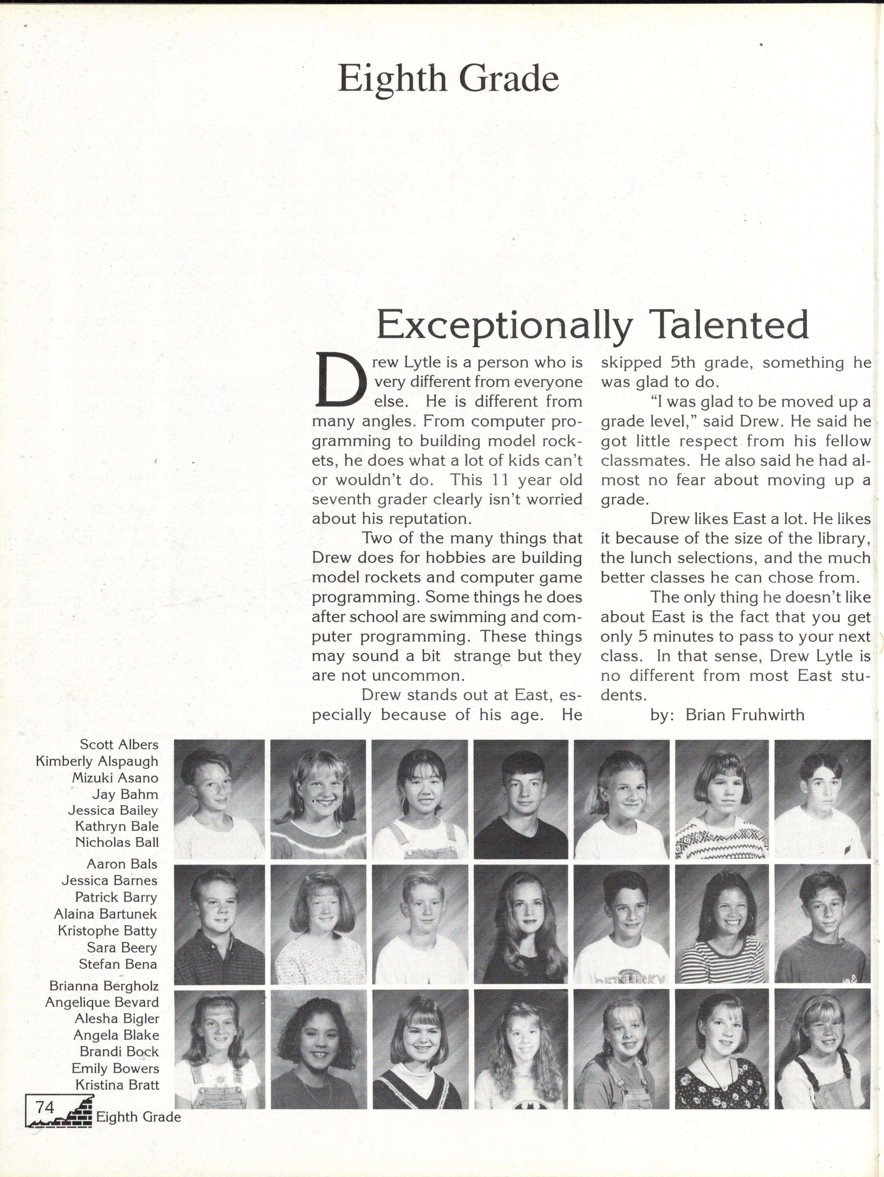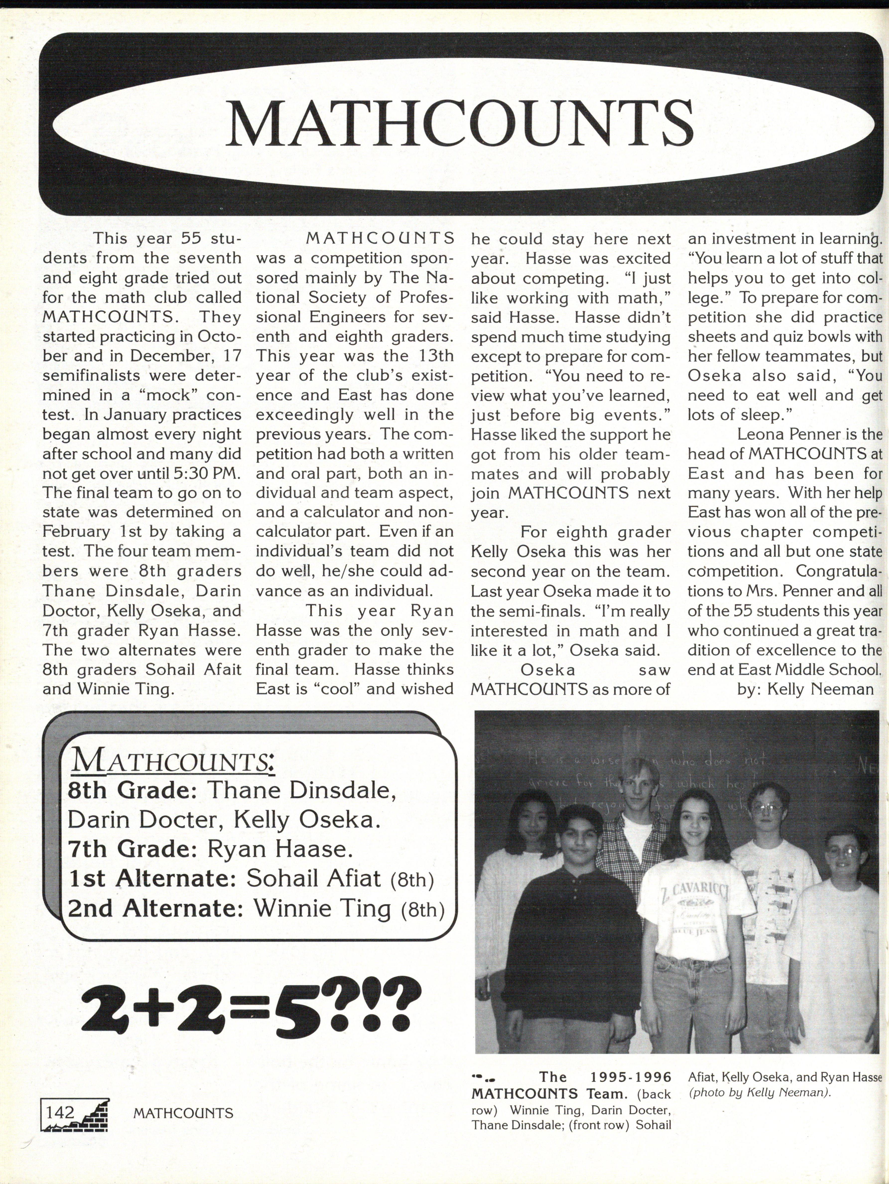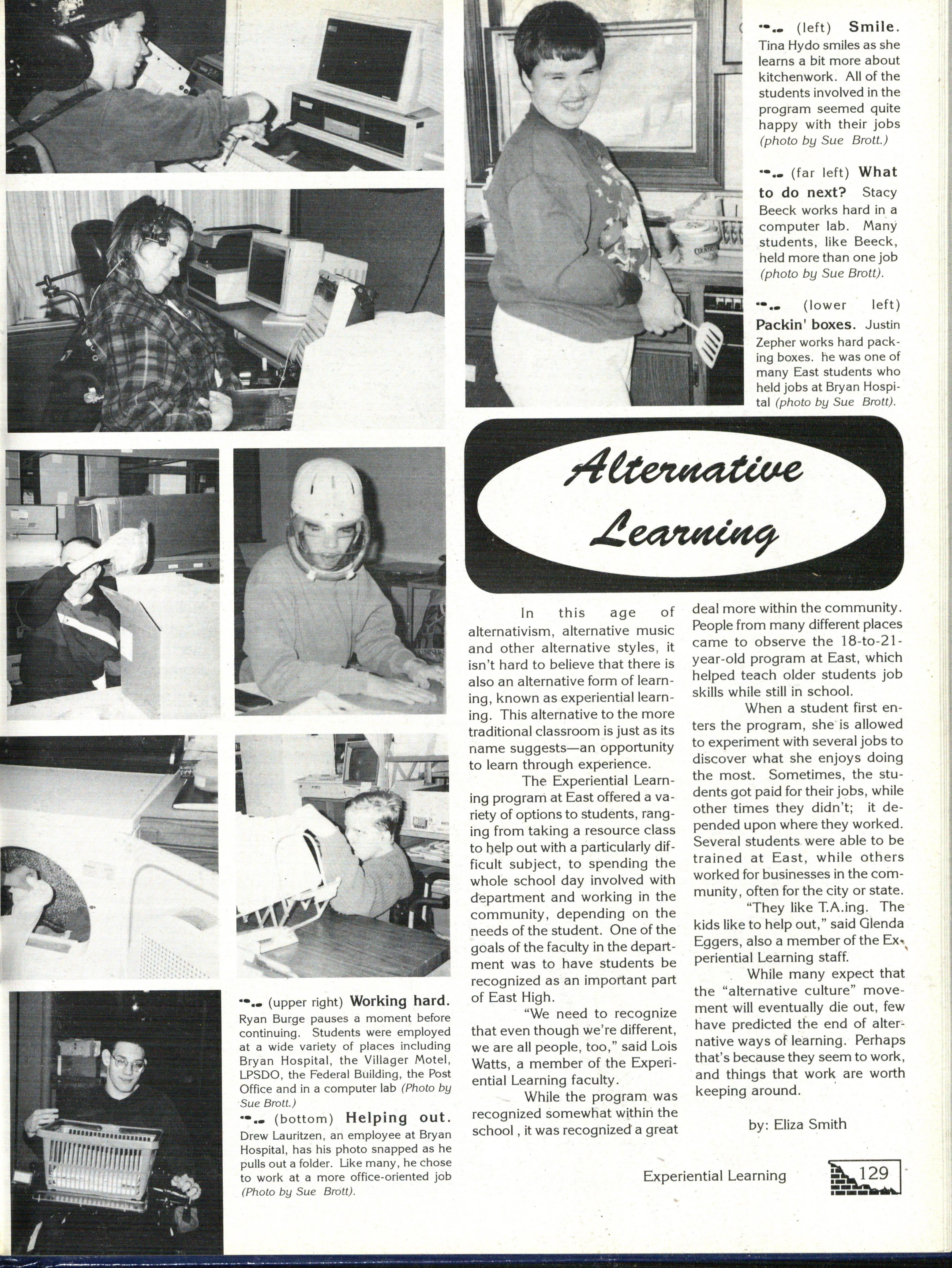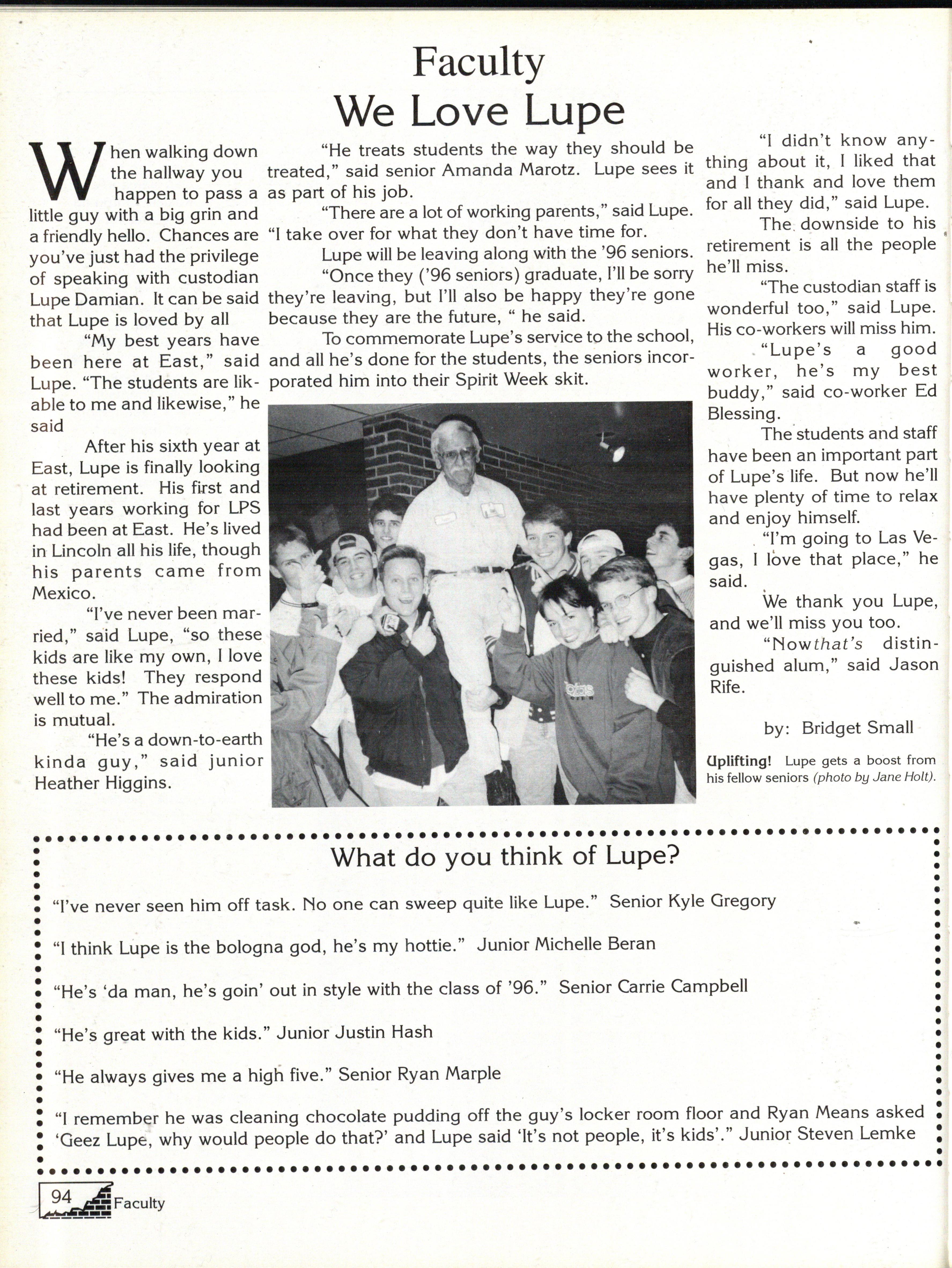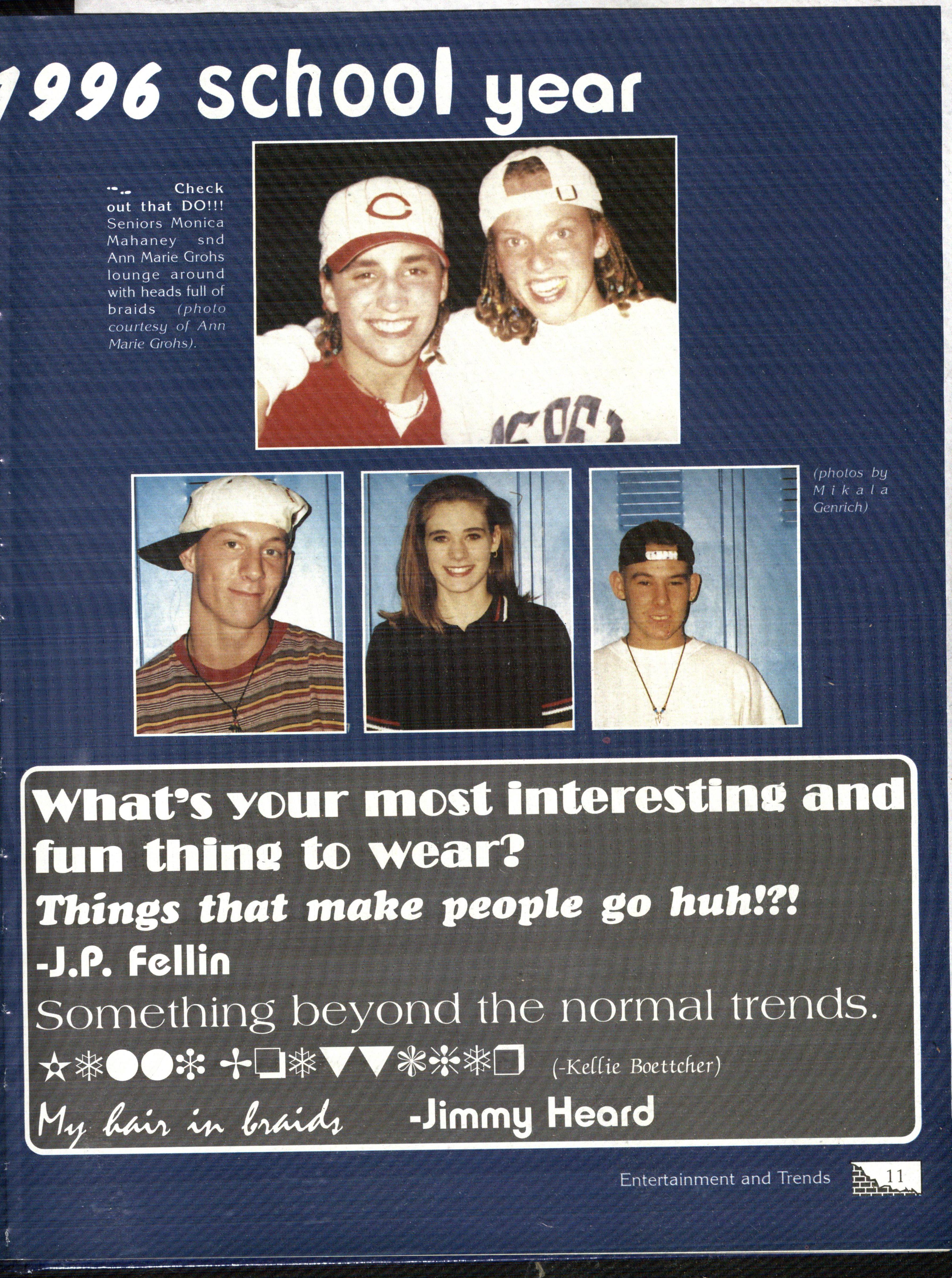 The '95- '96 school year had quite a few lasts, but it had several firsts as well. Everyone spoke of "steps" and of how East was taking a particularly big one. Most assuredly, East is a'changin'. Several teachers who were at East since its beginning retired, and there will no longer be a middle school at East, but there were new programs, new teachers, and other new faces as well.