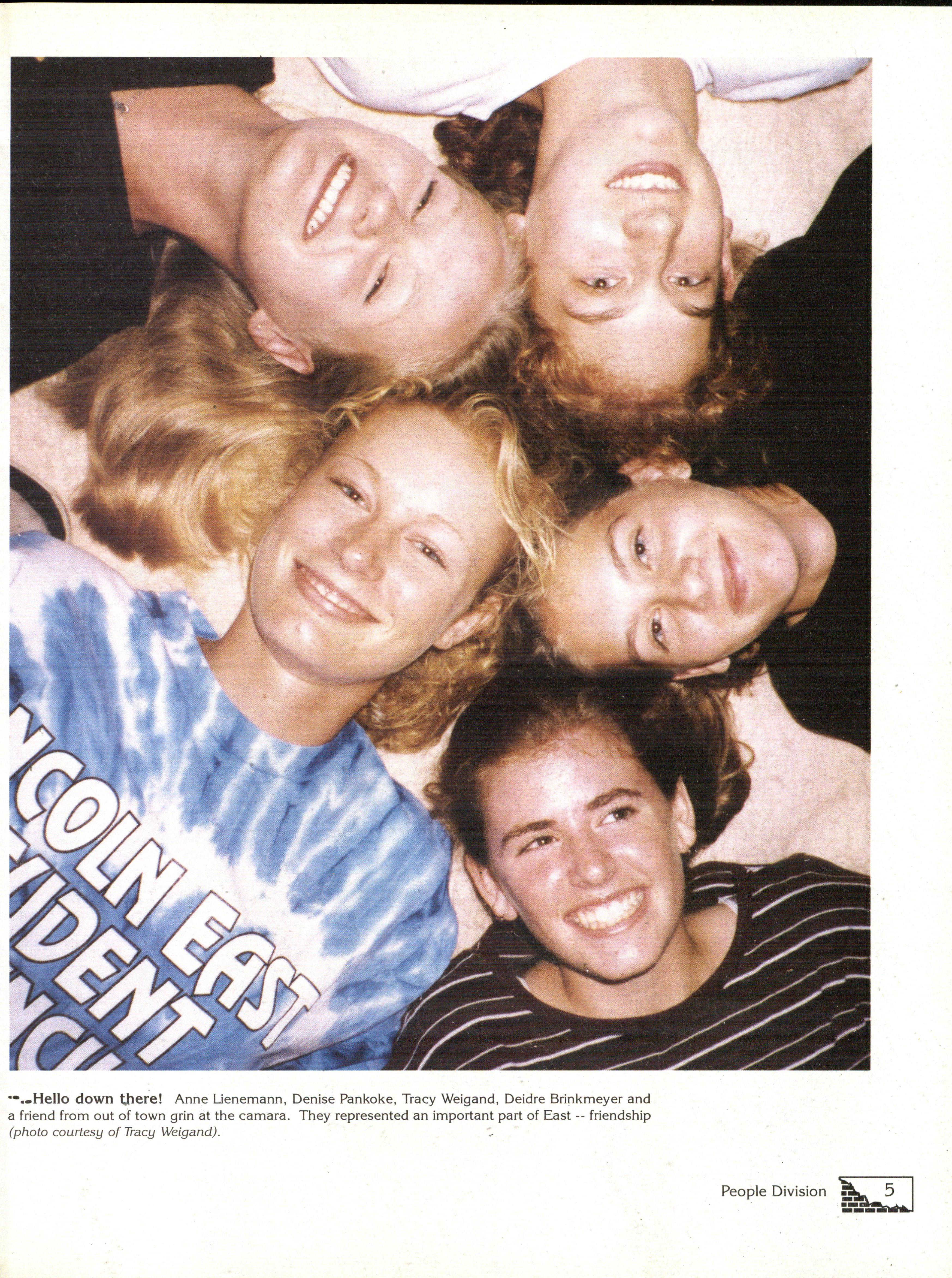 ·•.• Hello down t,Jlere! Anne Lienemann, Denise Pankoke, Tracy Weigand, Deidre Brinkmeyer and a friend from out of town grin at the camara. They represented an important part of East friendship (photo courtesy of Tracy Weigand).
