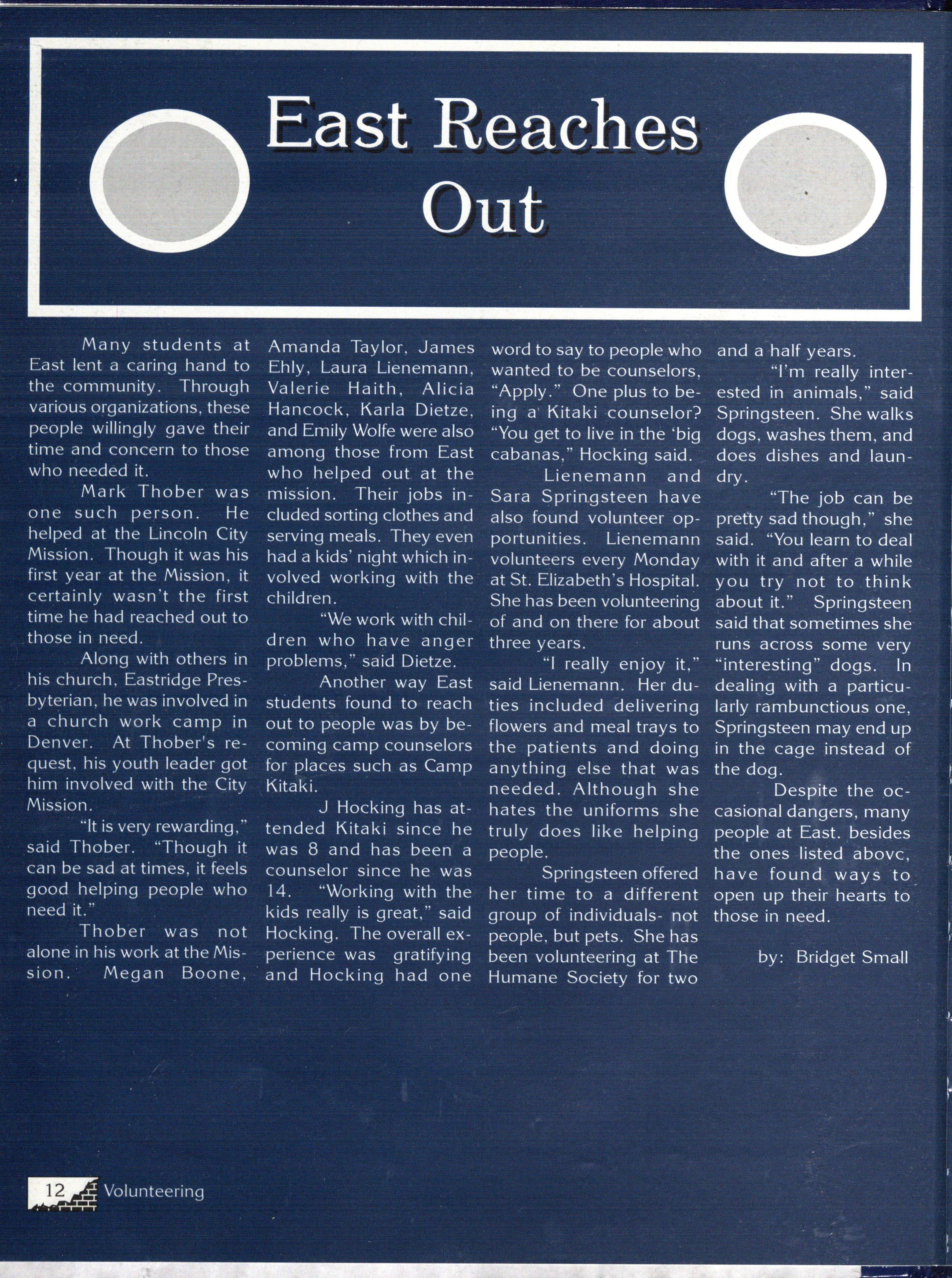 Special thanks this year goes out to Mike and Terri Diffenderfer, our Walsworth representative and his wife, Brenda Search, our Walsworth Company Contact, Jane Holt, our advisor, and Laird Haberlan, our substi- , tute advisor for most of the year while Mrs. Holt was on pregnancy leave. All these people, along with the coaches, the teachers, the students, and the parents of East High, have made this Yearbook what it is. We ' worked very hard this year and spent many long hours to give the Yearbook a new image to go along with East's new image. Hopefully you will be able to see all the hard work that was put into every page.