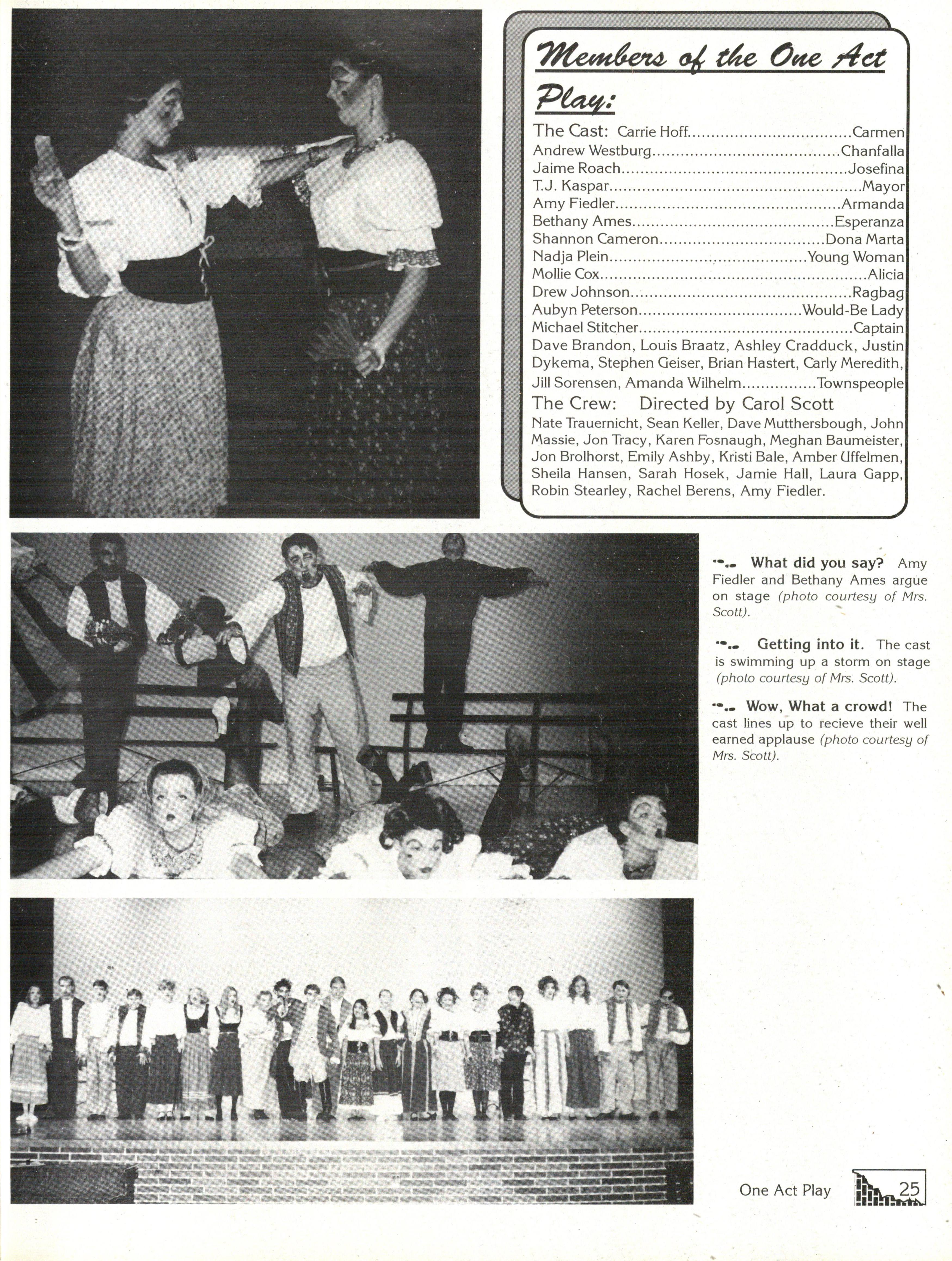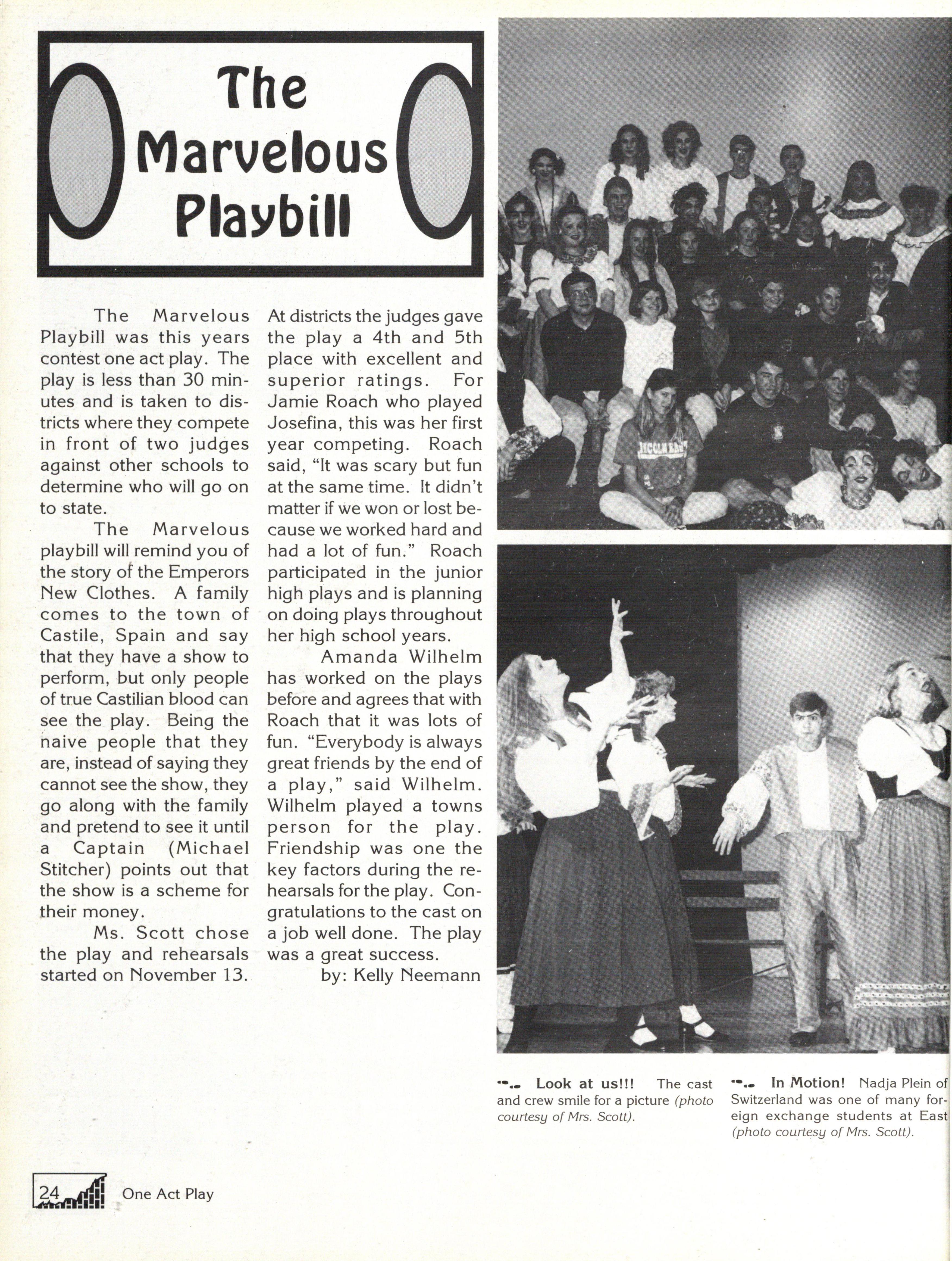 The Fall Play this grade," remarks Brad year, "Scenes and Revela- Bartholomai, one of the tions", was about four sis- few freshman involved ters whose parents died. It with the play. took place in the 1800's. And although they The sisters experience the were all very serious actors trials of life, basically grow- and actresses, everyone ing up and finding love. had a good time putting on "We all went out on the production. stage and we couldn't " ... it was so fun to think of what scene we work with those people on were on. We just sat up stage," said Rinehart. there and smiled until "It's just a neat someone cued us in," said group of kids having fun," junior Jill , Sor~nsen while said Kaspar. describing a slight miss- It may seem easy, hap on the opening night but it's really a lot of hard of Scenes and Revelations. work. All the work was Sophomore T.J. worthwhile on the opening Kaspar said, "One of the night though. "Scenes lights kinda blew up, they and Revelations" cast and never did find out what crew definitely did an ex.was wrong with it." • ceptional job on this year's Even though senior Fall Play. Although some Melissa Rinehart forgot an members of the cast opening line, the cast thought they majorly pulled through. The most messed up on opening obvious reason East's ac- night, no one who attors and actresses were so tended had anything bad good is probably because to say about it. "It was of their experience. excellent," said senior Sa"My older sister was rah Barnick. doing it and it looked like Another senior, Jafun so I did it too. I started son Wenzel, agreed with in the seventh grade with Barnick, " It was the best Junior High plays and the I've ever seen." playhouse," Sorensen For all of you who said. didn't see it, you definitely "I had this music missed out on a great proteacher who said I should duction because this audition for · the part of year's fall play was excepTiny Tim and I really liked tional. it. I got the part and I've been doing it ever since. by: Jayme Kalmbrum • That was in the second