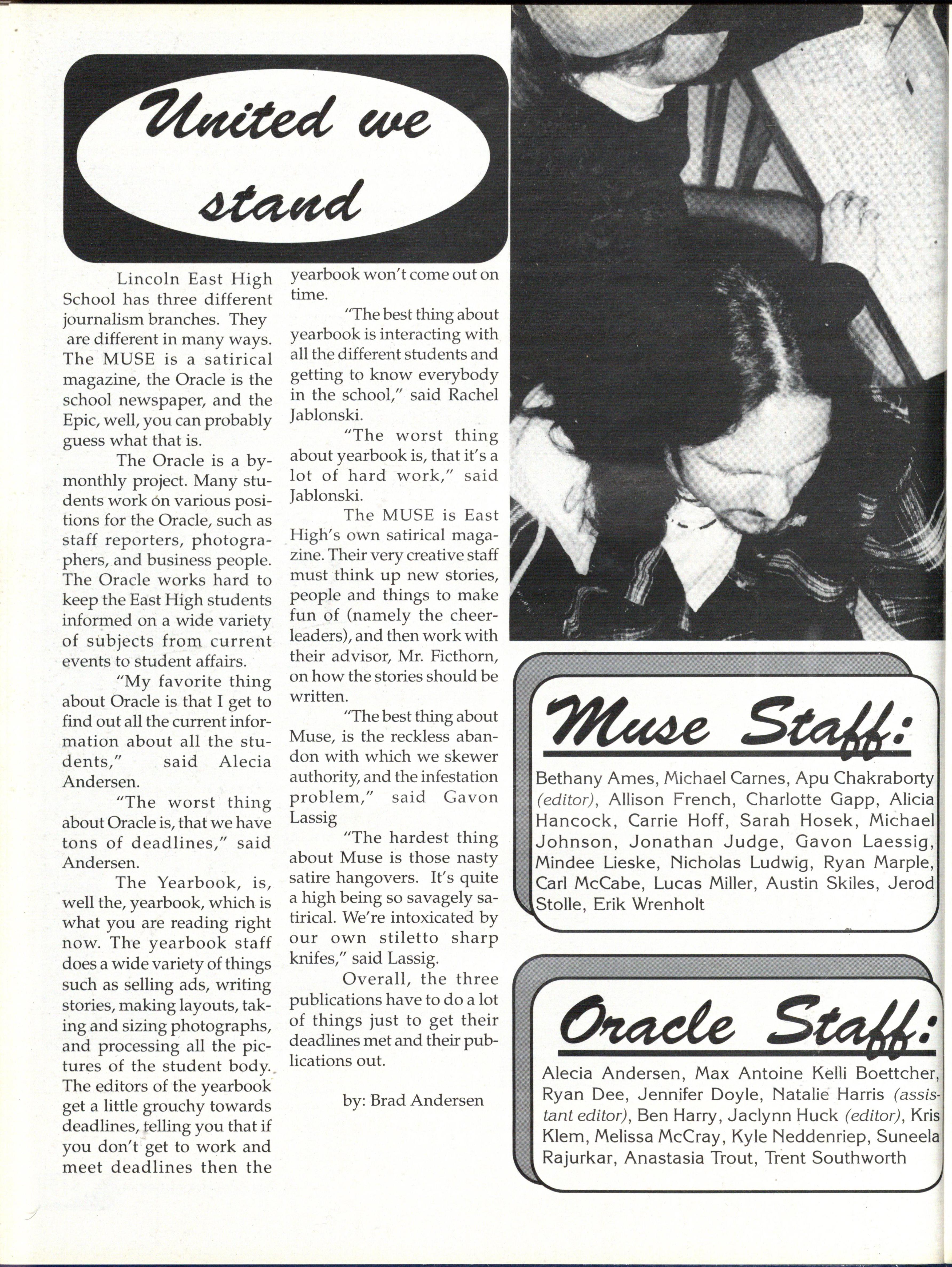 Staff: Rachel Jablonsk'i, Kelly Neeman, Katie Quick, Bridget Small, Brad Anderson, Mikala Genrich, James Hauck, JJ Horesi, Jayme Kalmbrunn, Clayton Main (1 semester), Krystyn Matczyszyn ( 1 semester)