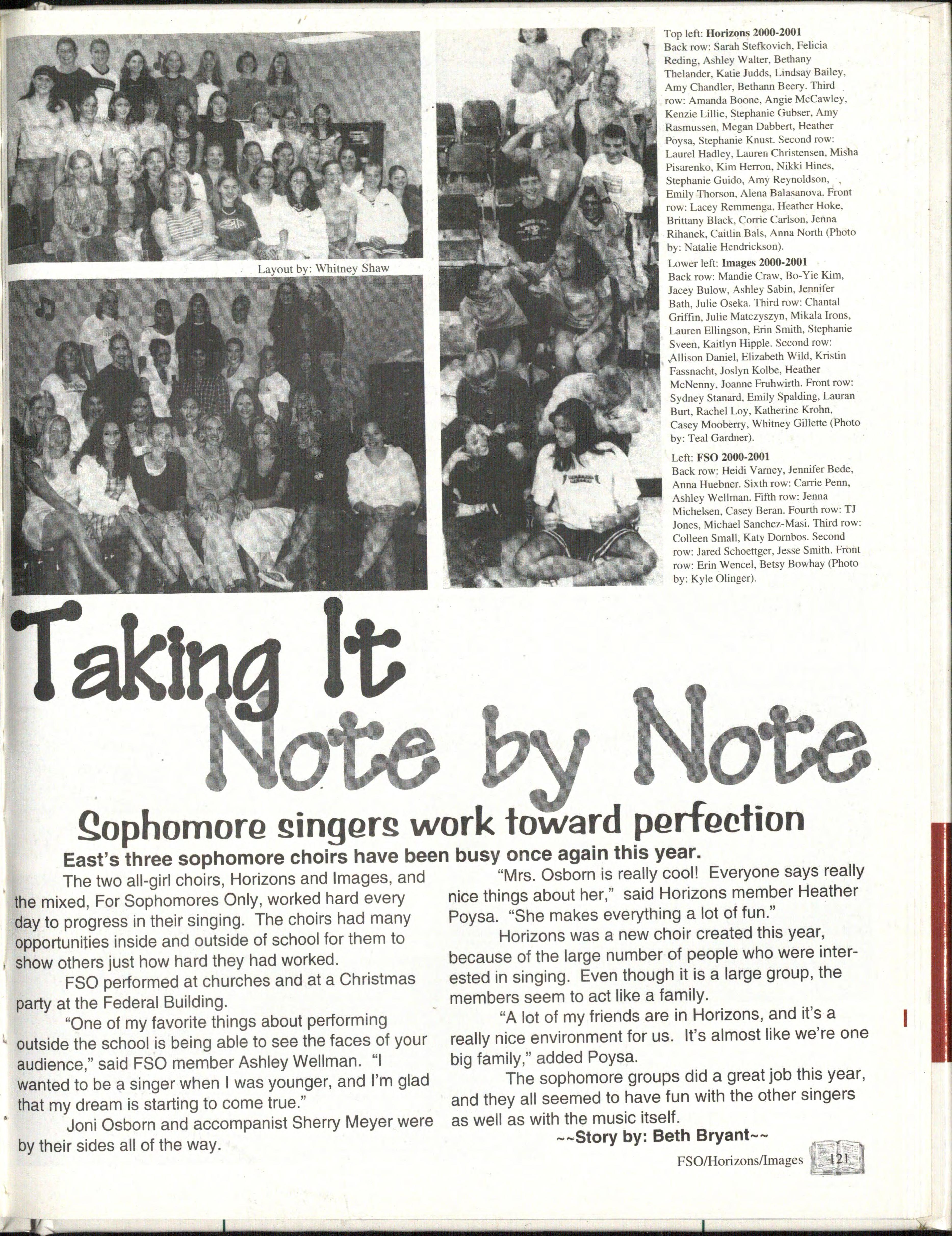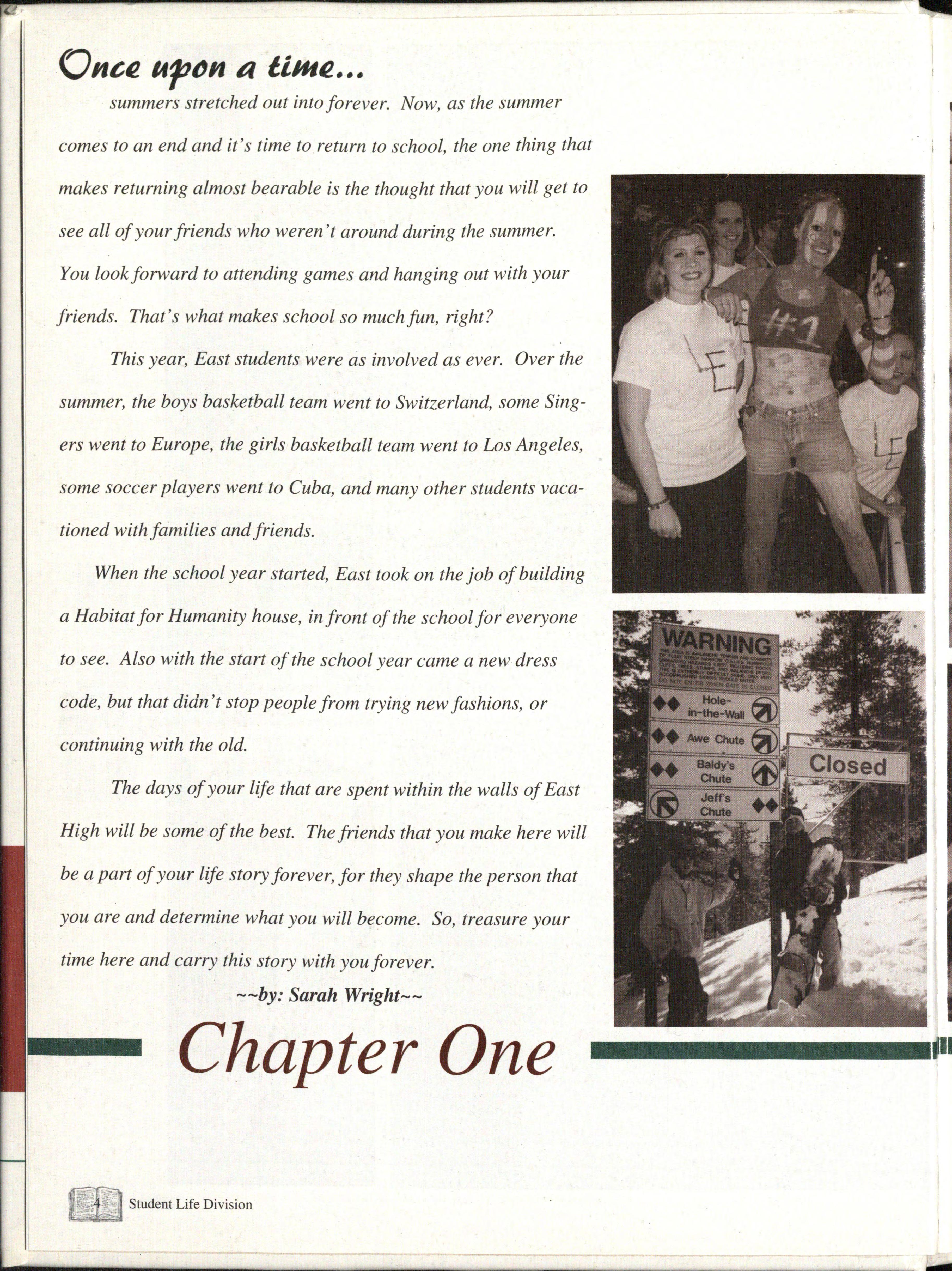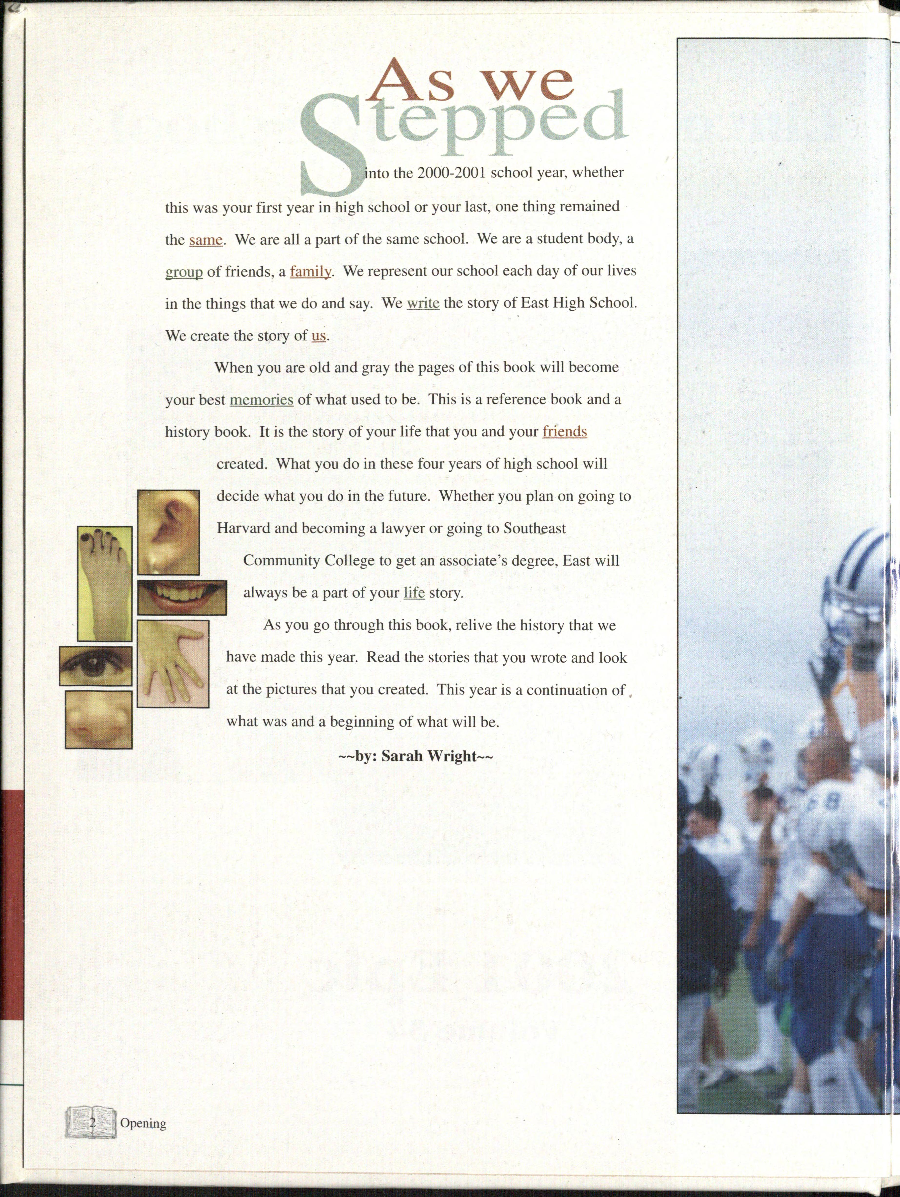 into the 2000-2001 _ school year, whether this was your first year in high school or your last, one thing remained the same We are all a part of the same school. We are a student body, a group of friends, a family We represent our school each day of our lives in the things that we do and say. We write the story of East High School. We create the story of us