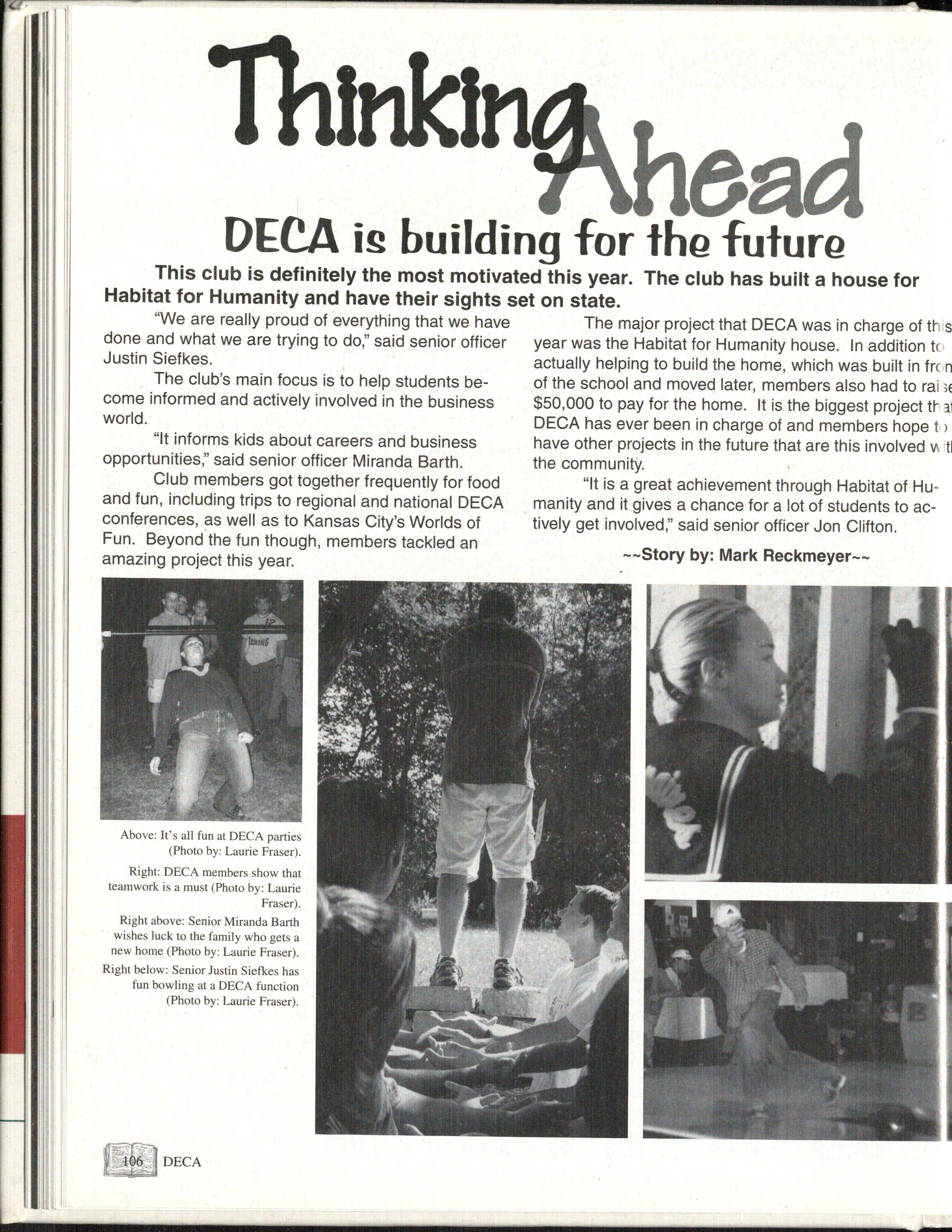 One way that DECA raised money was by placing cardboard house banks in the classrooms and other rooms in the school. Students and teachers were encouraged to help out their school and community b ' ' dropping their spare change into the banks.