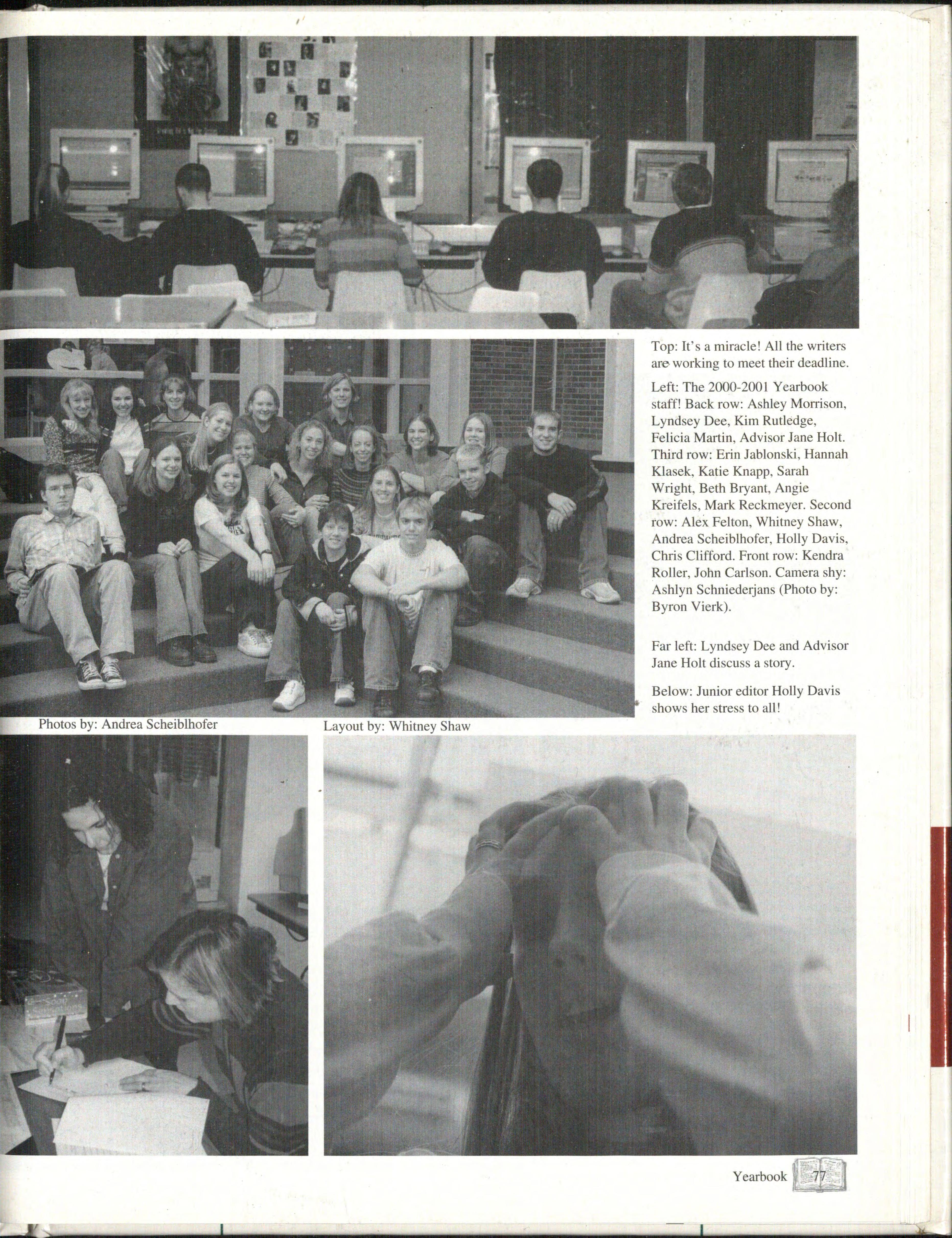 Our hope for the 2001 Epic was to create a yearbook that was different from any other yea r. Our staff wanted this yearbook to represent the entire student body. This is why we chose the theme "The Story of Us." The theme was chosen by the editor at the Nebraska Journalism Summer Workshop and implemented on the first day of class in August.
