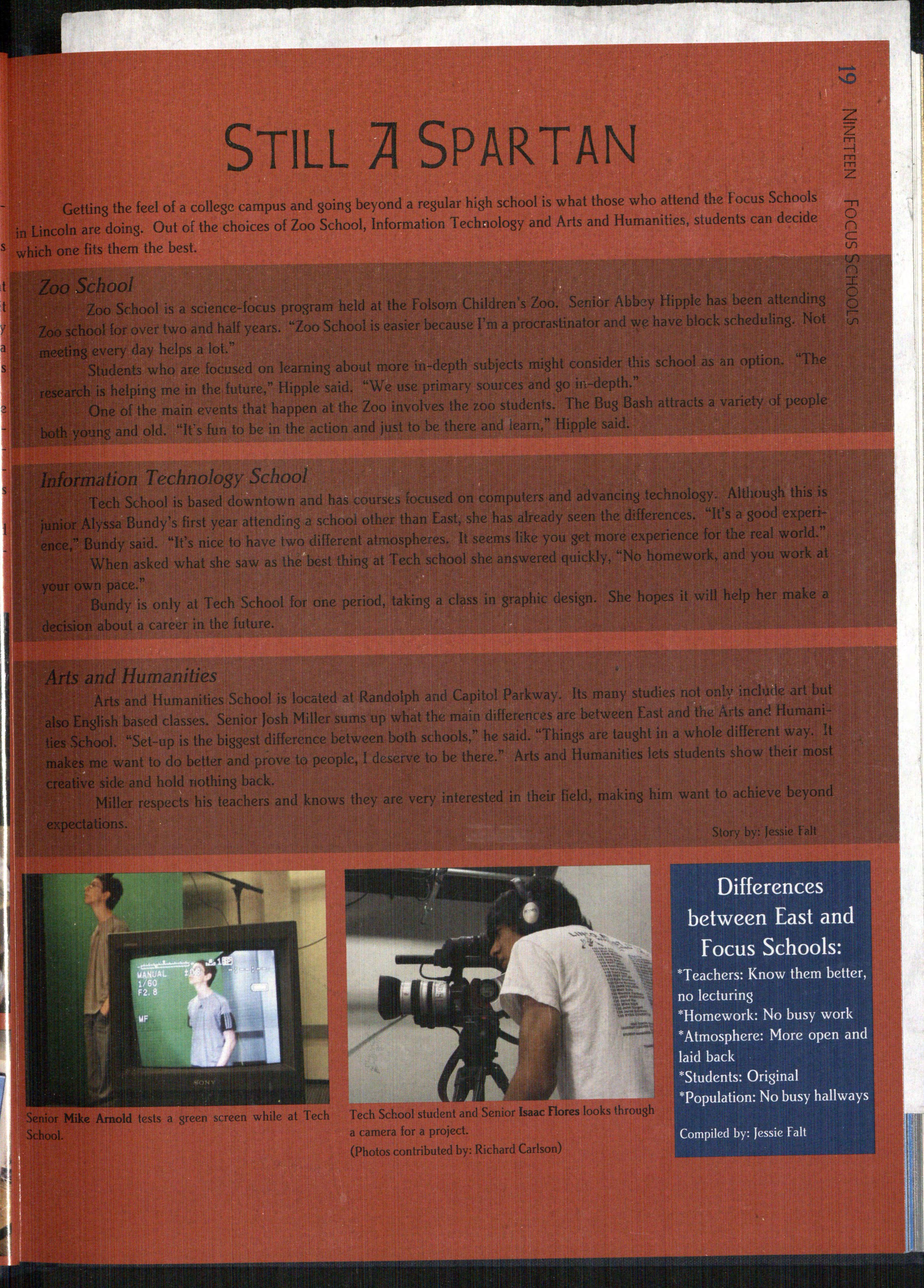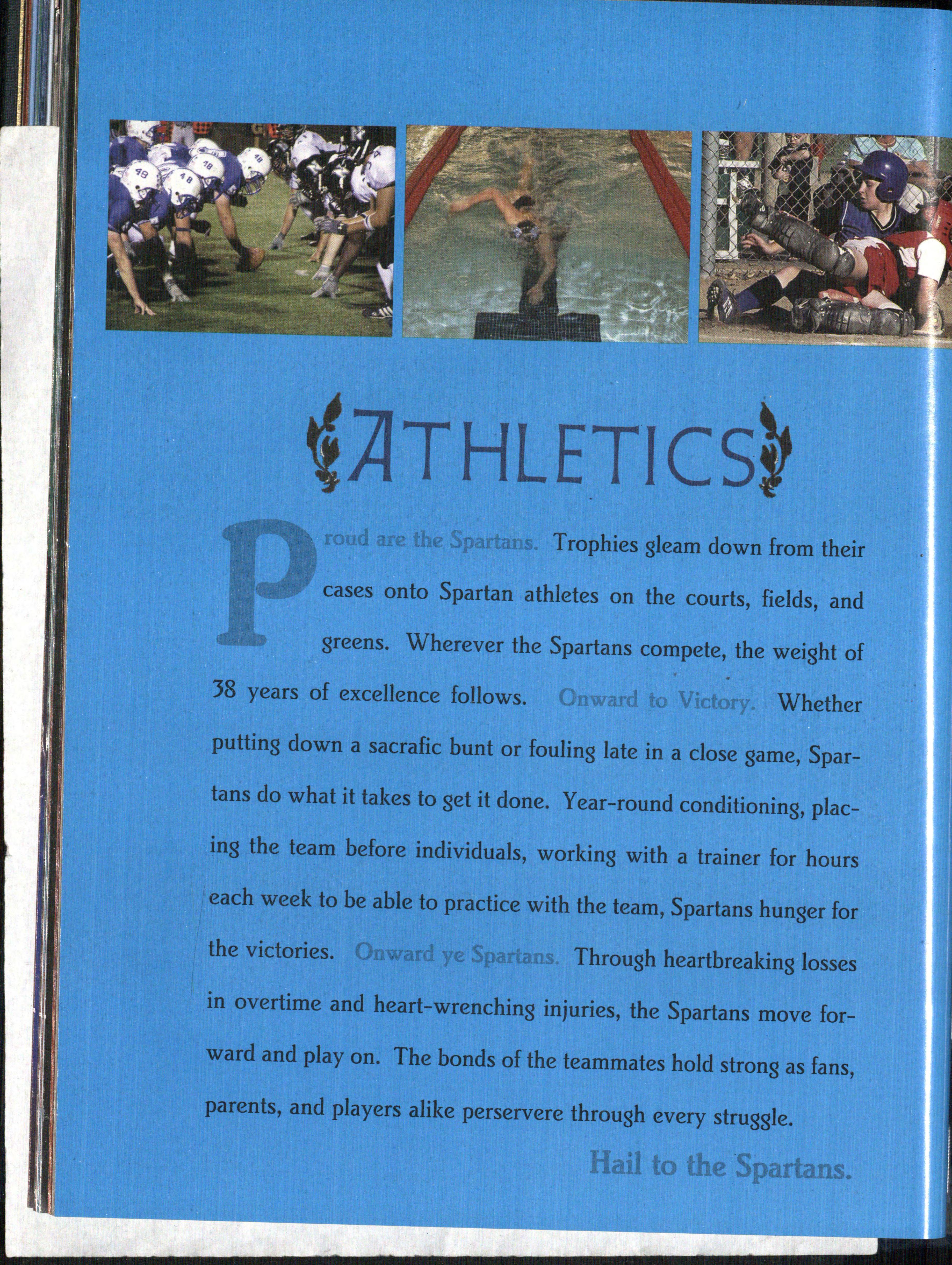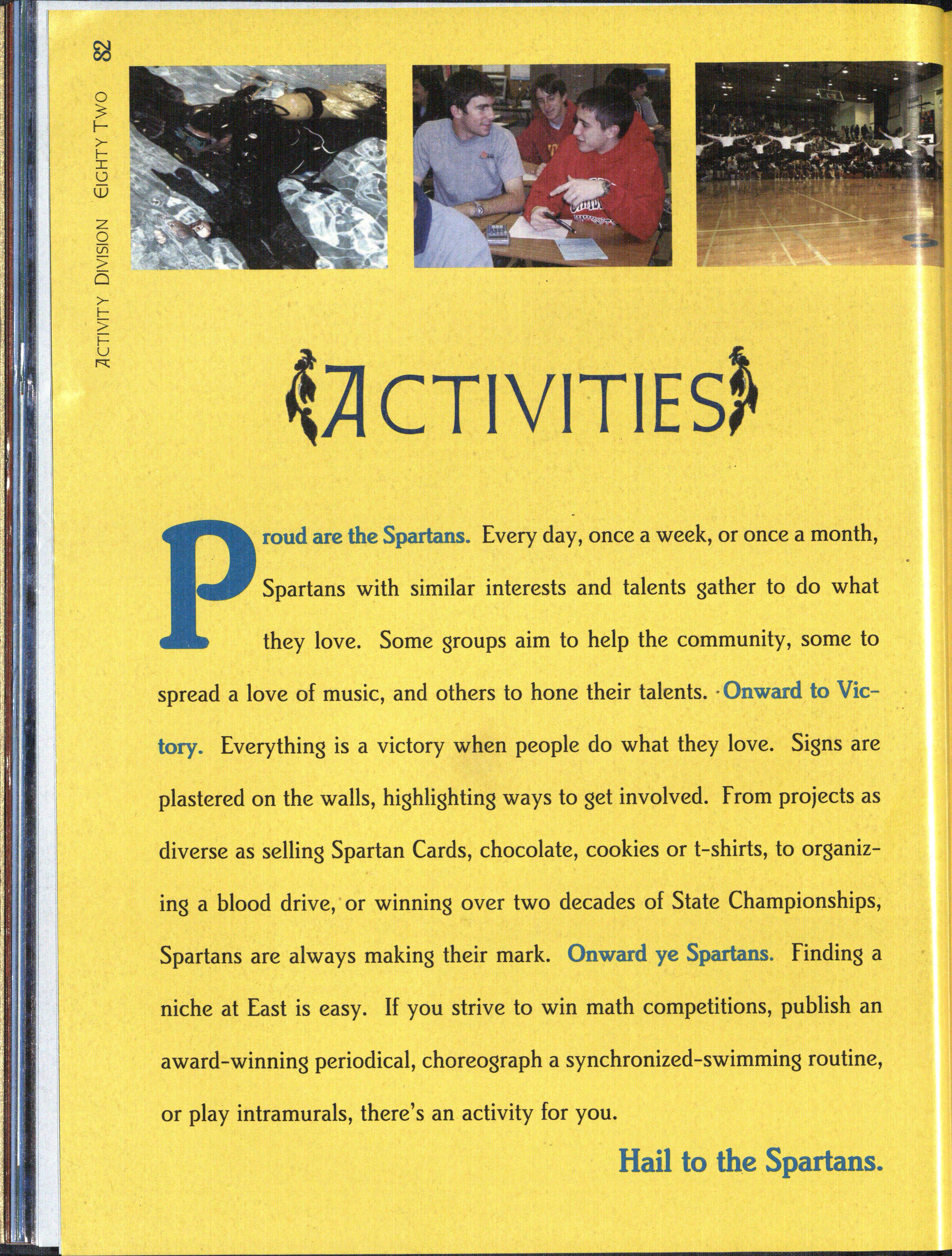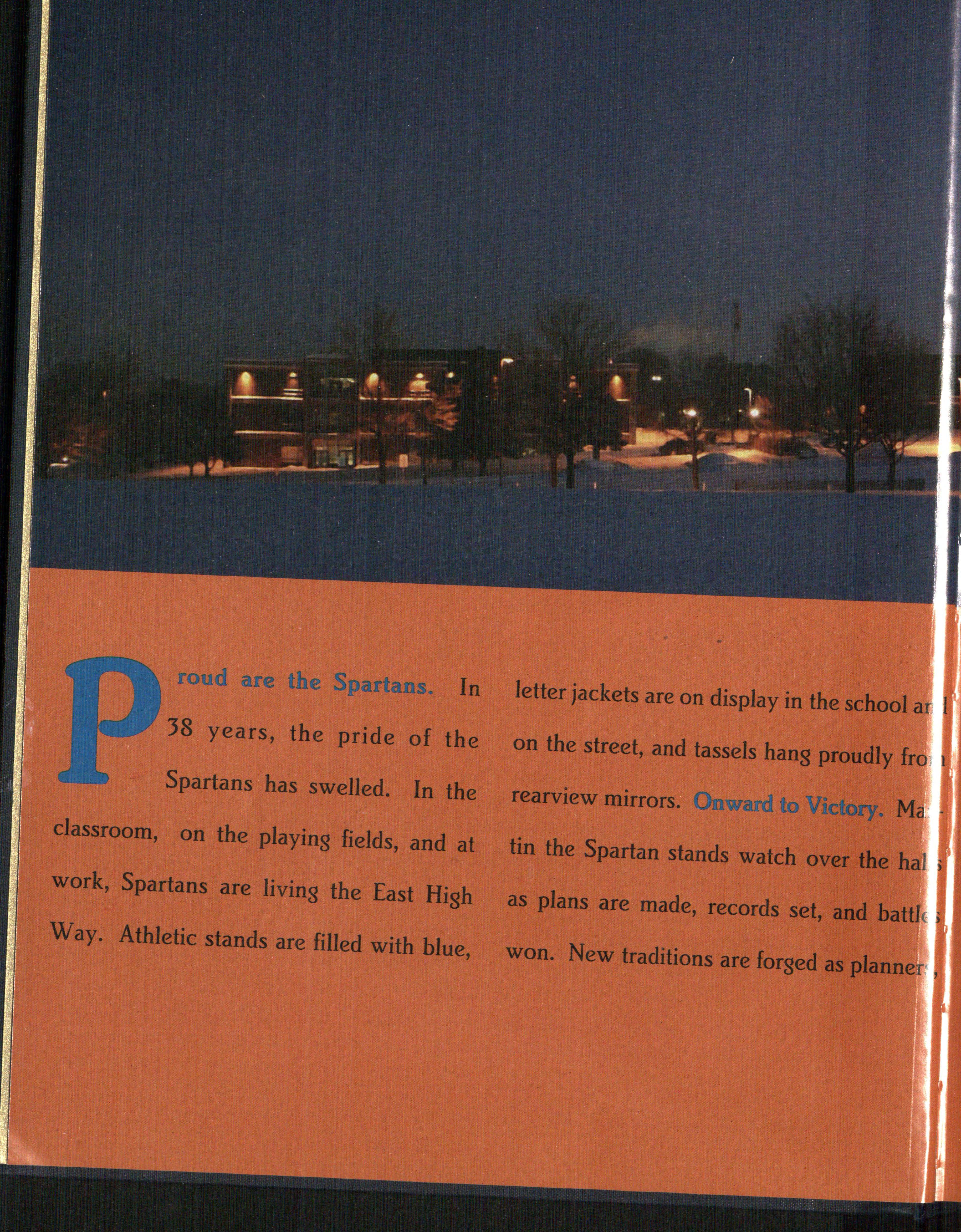 roud are the Spartans. In 38 years, the pride of the Spartans has swelled. In the classroom, on the playing fields, and at work, Spartans are living the East High Way. Athletic stands are filled with blue,