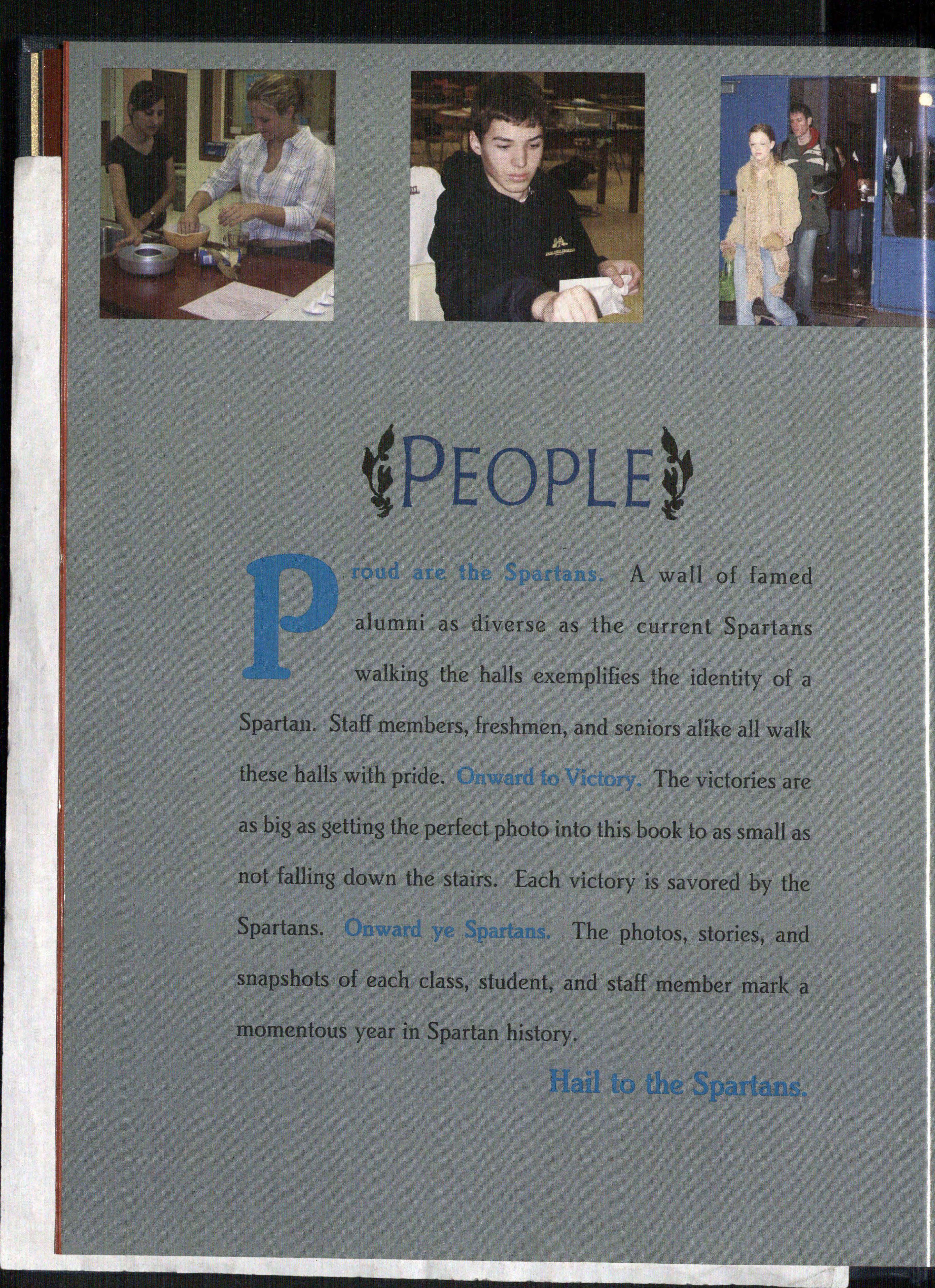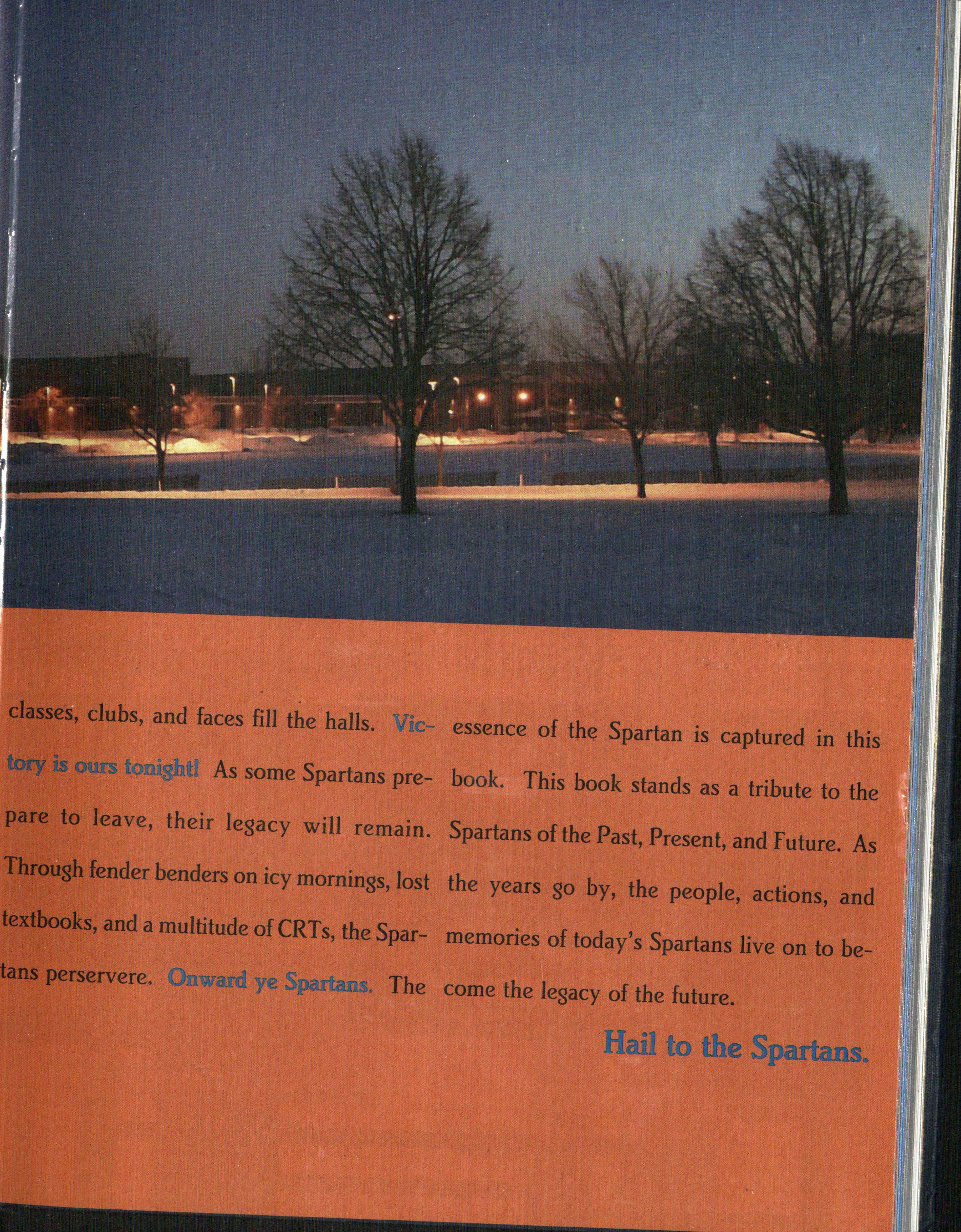 , and faces fill the halls. Vic- essence of the Spartan i tonishU As some Spartans pre- hook. This book stan ave, their legacy will remain. Spartans of the Past, Pr der benders on icy mornings, lost the years go by, the p ad a multitude of CRTs, the Spar- memories of today's Smmt= re. Onward ye Spartans. The come the legacy of the f