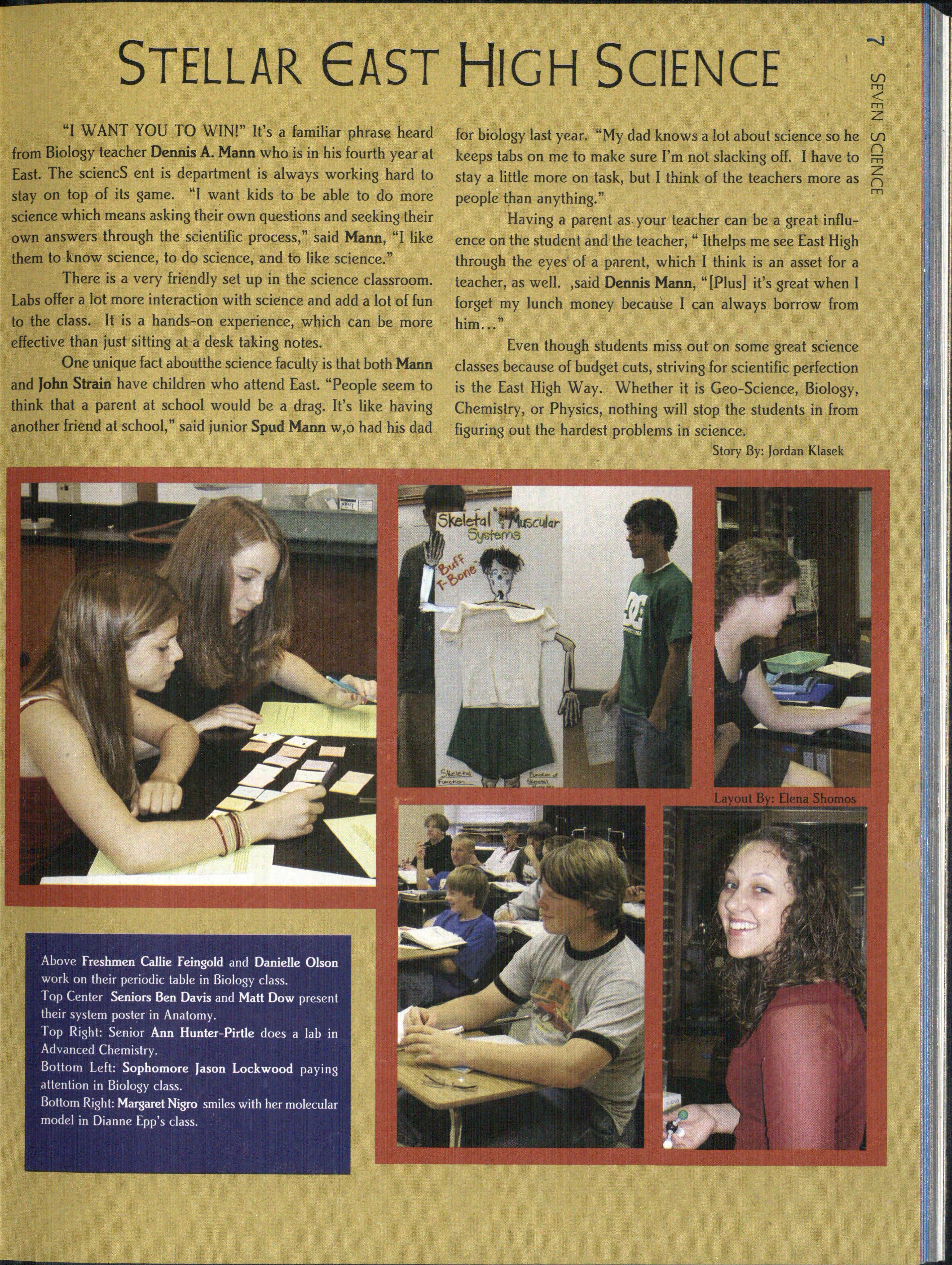 "I WANT YOU TO WIN!" It's a familiar phrase heard from Biology teacher Dennis A. Mann who is in his fourth year at East. The sciencS ent is department is always working hard to stay on top of its game. "I w ant kids to be able to do more· science which means asking their own questions and seeking their own answers through the scientific process," said Mann, "I like them to know science, to do science, and to like science."
