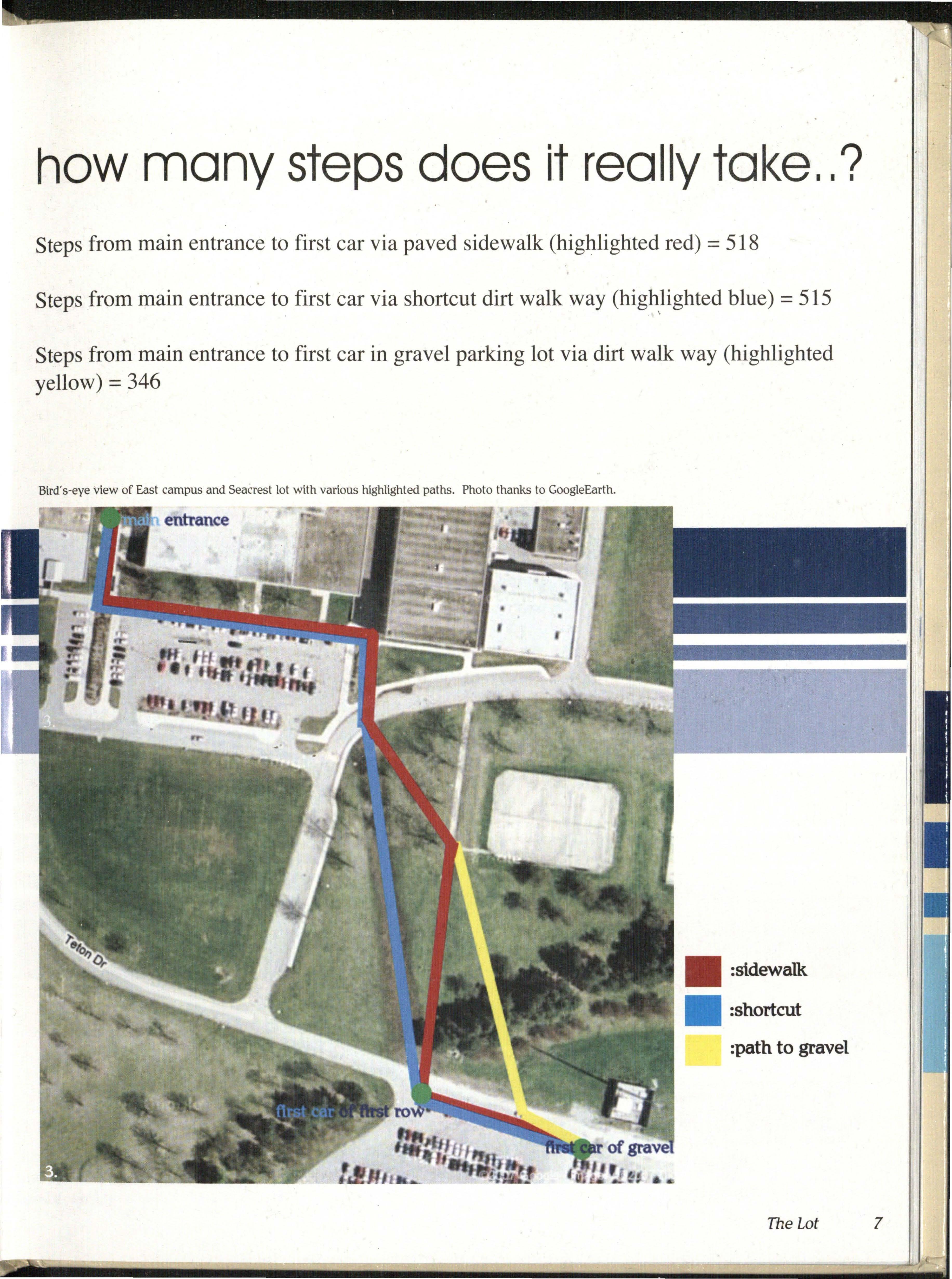 Steps from main entrance to first car in gravel parking lot via dirt walk way (highlighted yellow)= 346