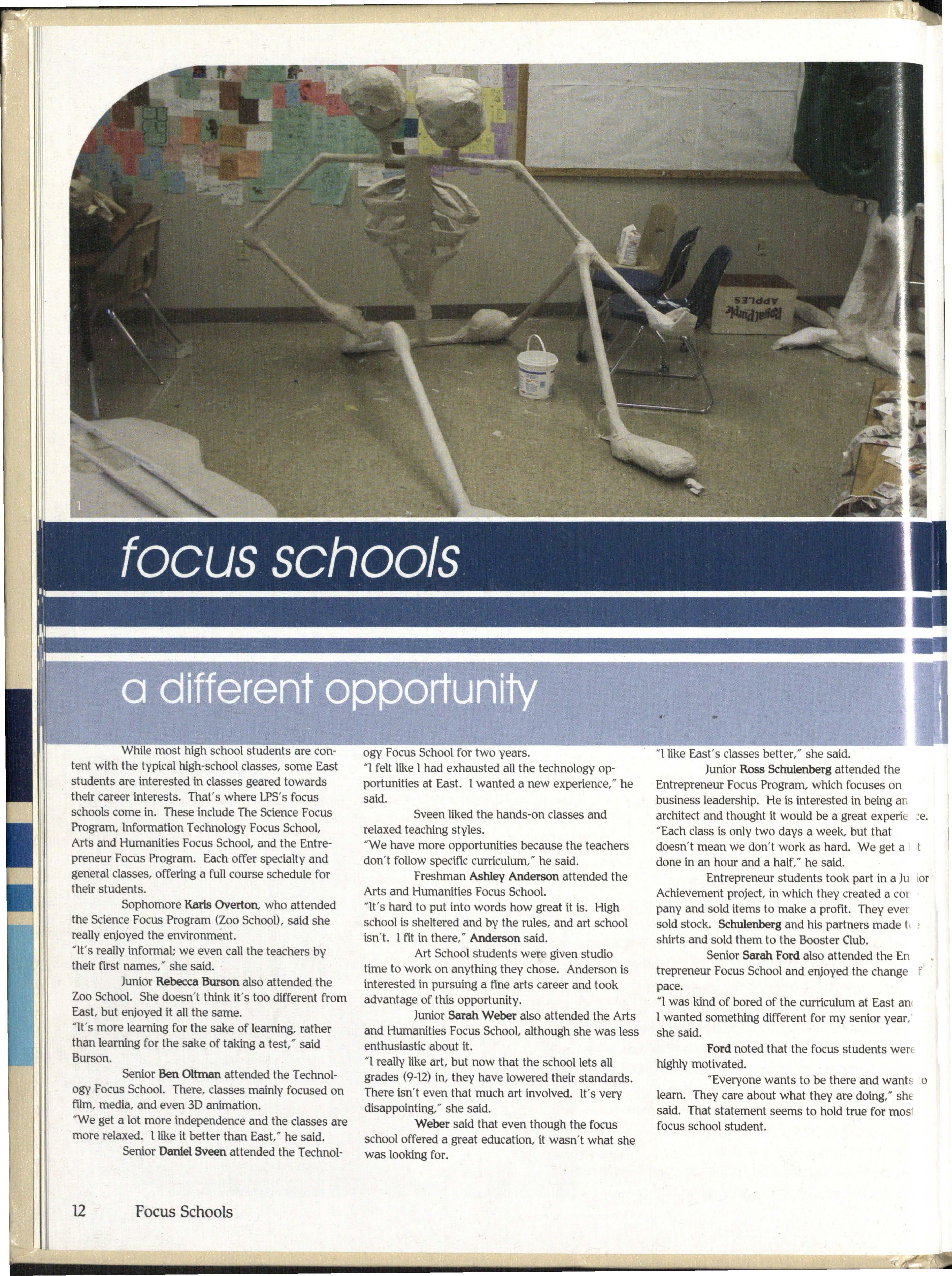 While most high school students are content with the typical high-school classes , some East students are interested in classes geared towards their career interests. That's where LPS ' s focus schools come in. These include The Science Focus Program, Information Technology Focus School, Arts and Humanities Focus School, and the Entrepreneur Focus Program. Each offer specialty and general classes , offerlng a full course schedule for their students.