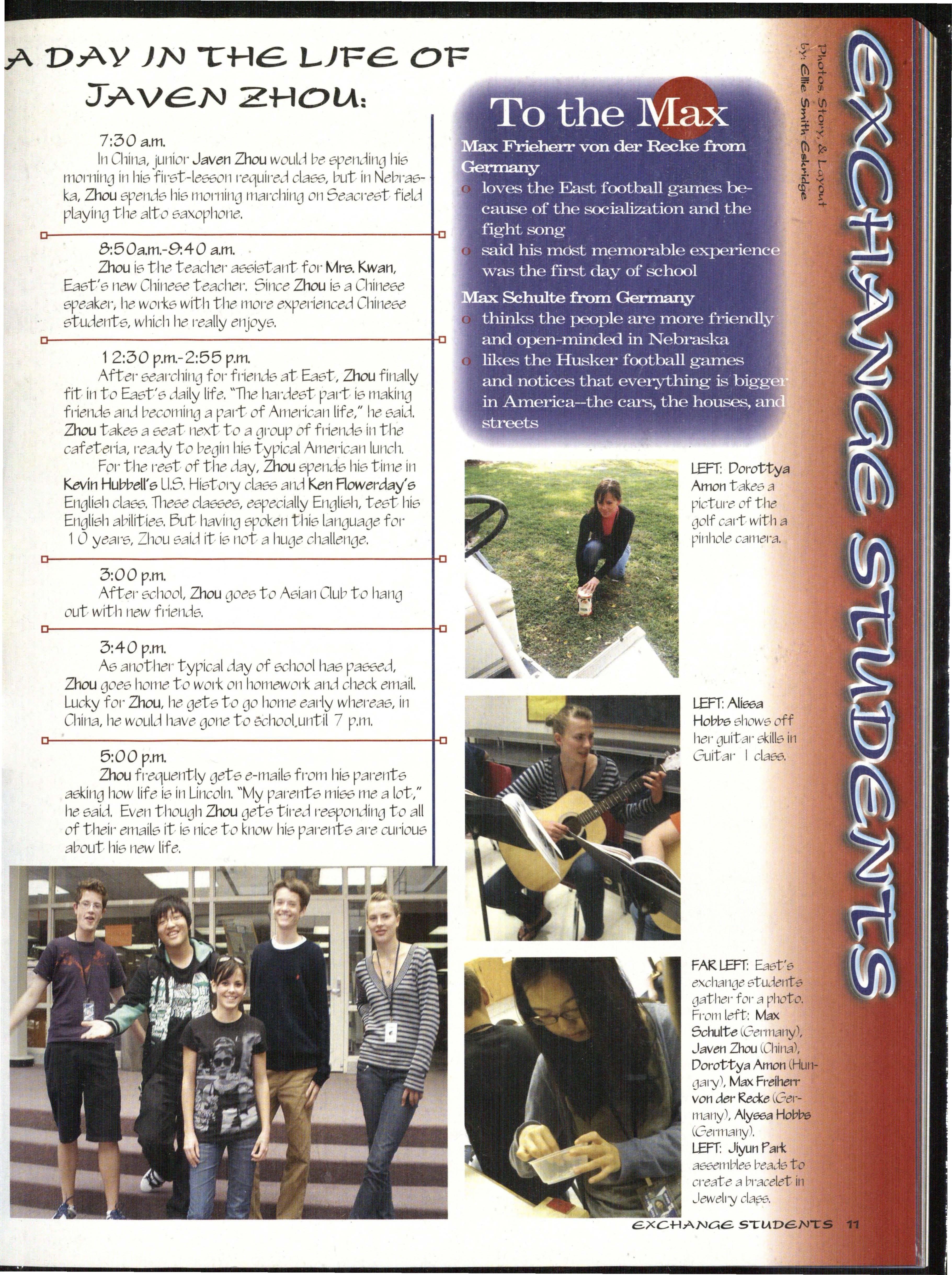 After searching fol · friends at East, Zhou fina lly f it in to East's dail y li fe. "The hardest pa 1·t is making fr iends and becoming a pa 1t of Amedcan li fe, " he sa id Zhou takes a seat next to a group of friends in the cafeteria, rea ..,1y to begin his typical American lunch.