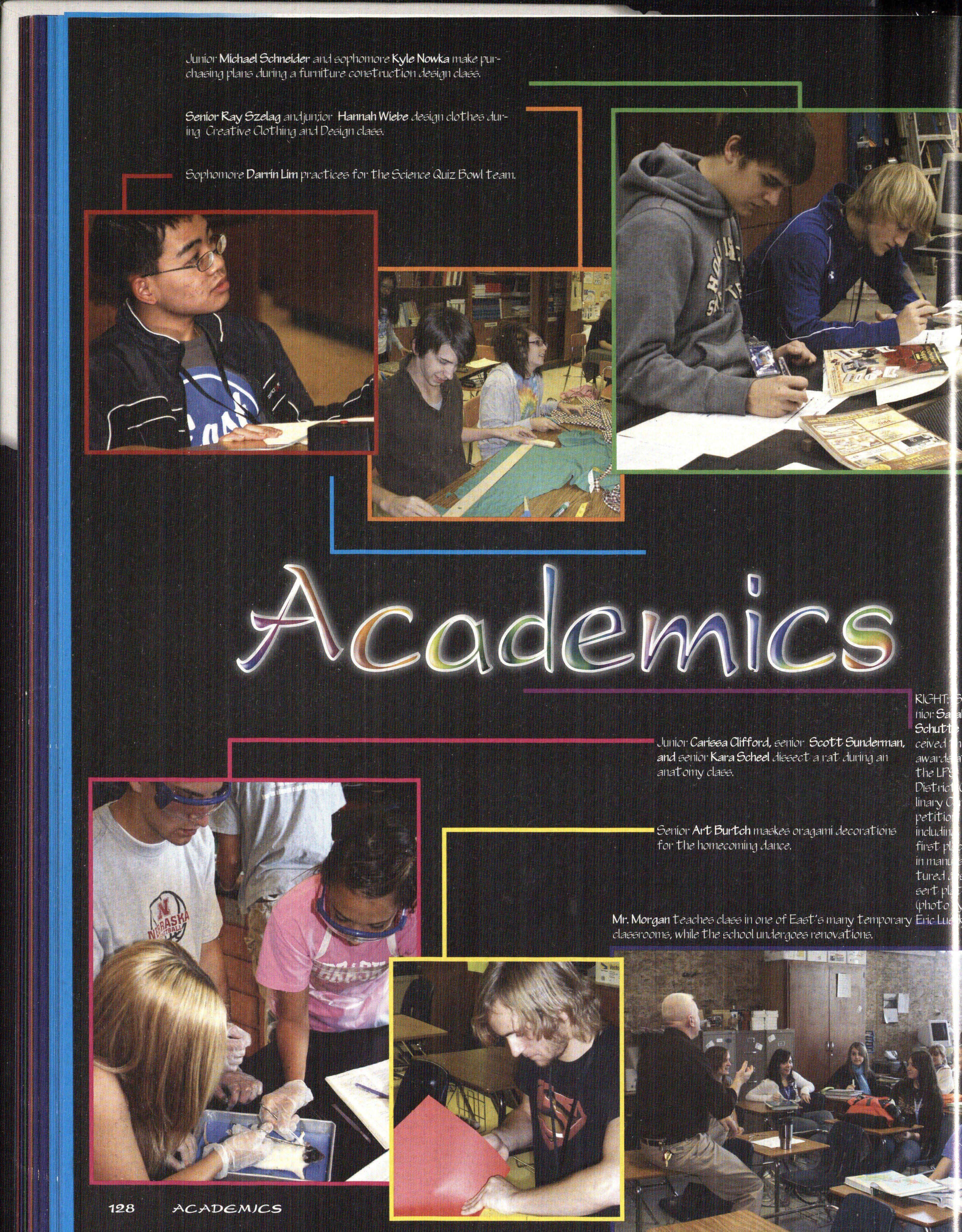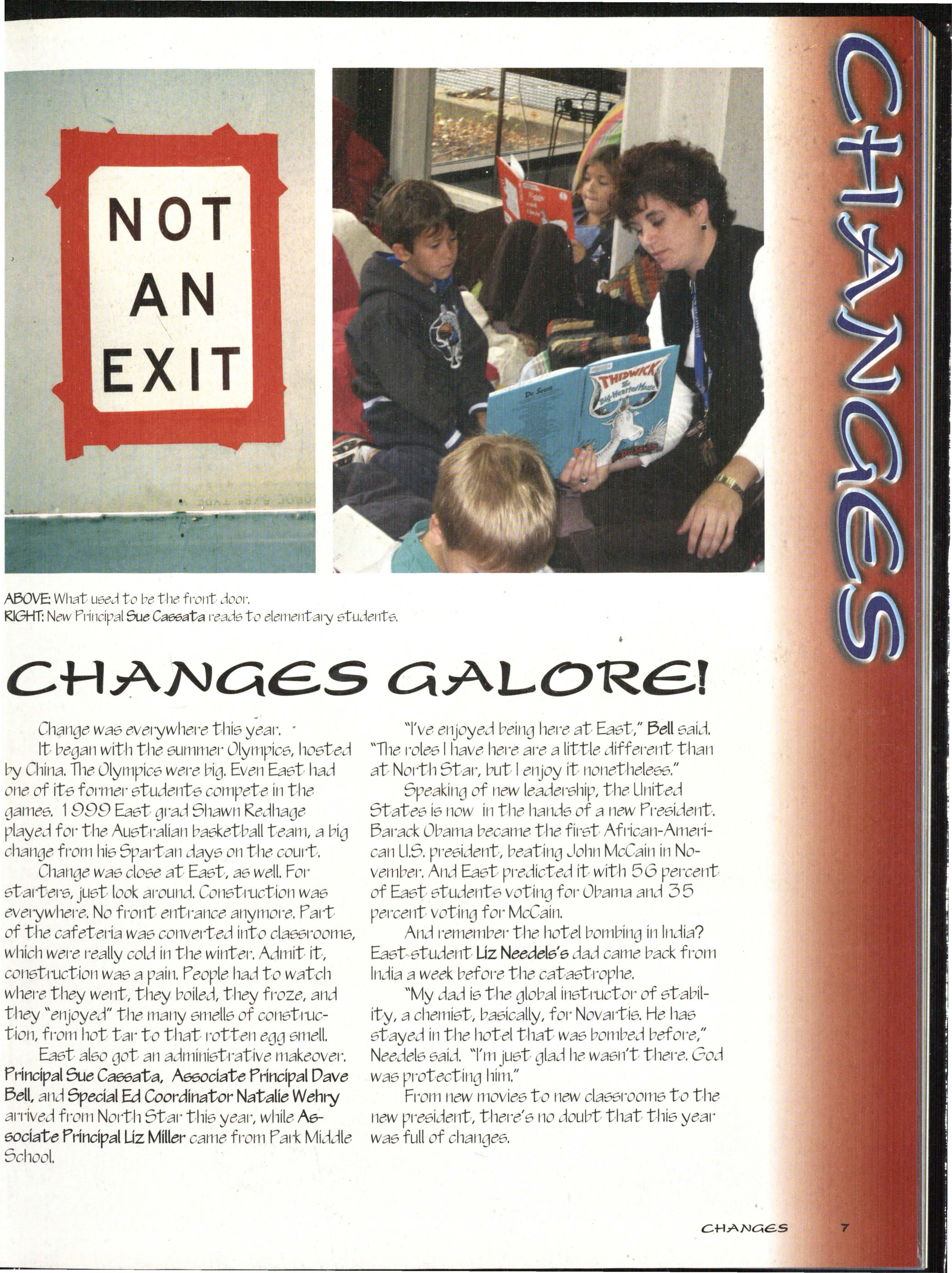 Change was close at East, as well. Fo1· sta1·te1·s, just look around. Const1·uction was eve1·ywhe1·e. No front enti-ance anymo1·e. Pa1·t of the cafetei-ia was conve1·ted into classrooms, which were 1·eally cold in the winte1·. Admit it, const1·uction was a pain. People had to watch whe1 ·e they went, they boiled, they froze, and they "enjoyed" the many smells of const1·uction, from hot ta1· to that 1·otten egg smell.