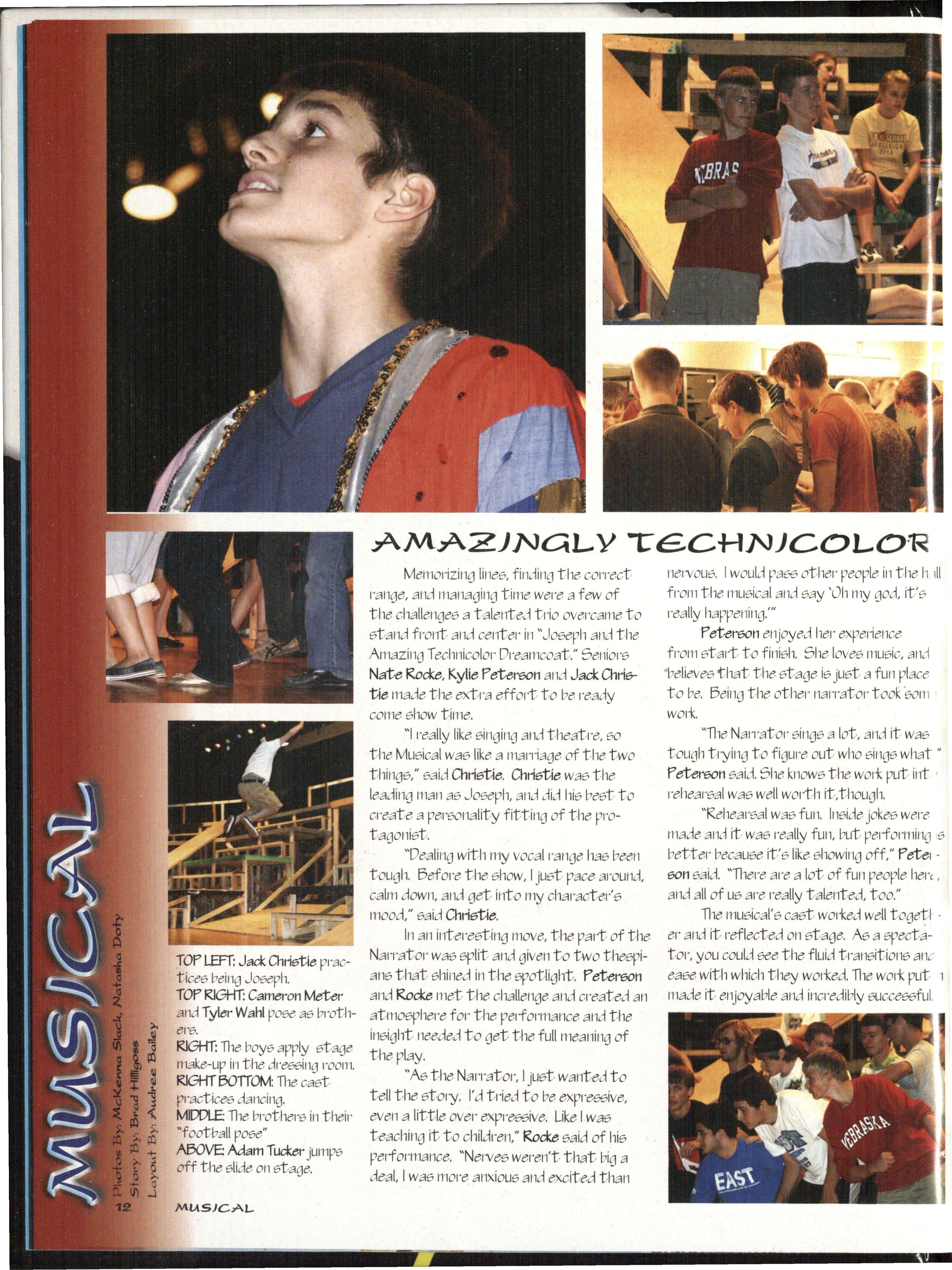 Memorizing lines, finding the correct range, and managing time we1 ·e a few of the challenges a talented trio ove1·came to stand front and cente 1 · in "Joseph and the Amazing Technicolor D1·eamcoat." Senio1·s Nate Rocke, Kylie f'e"terson and Jack Chri6tie made the extra effort to be ready come show time.