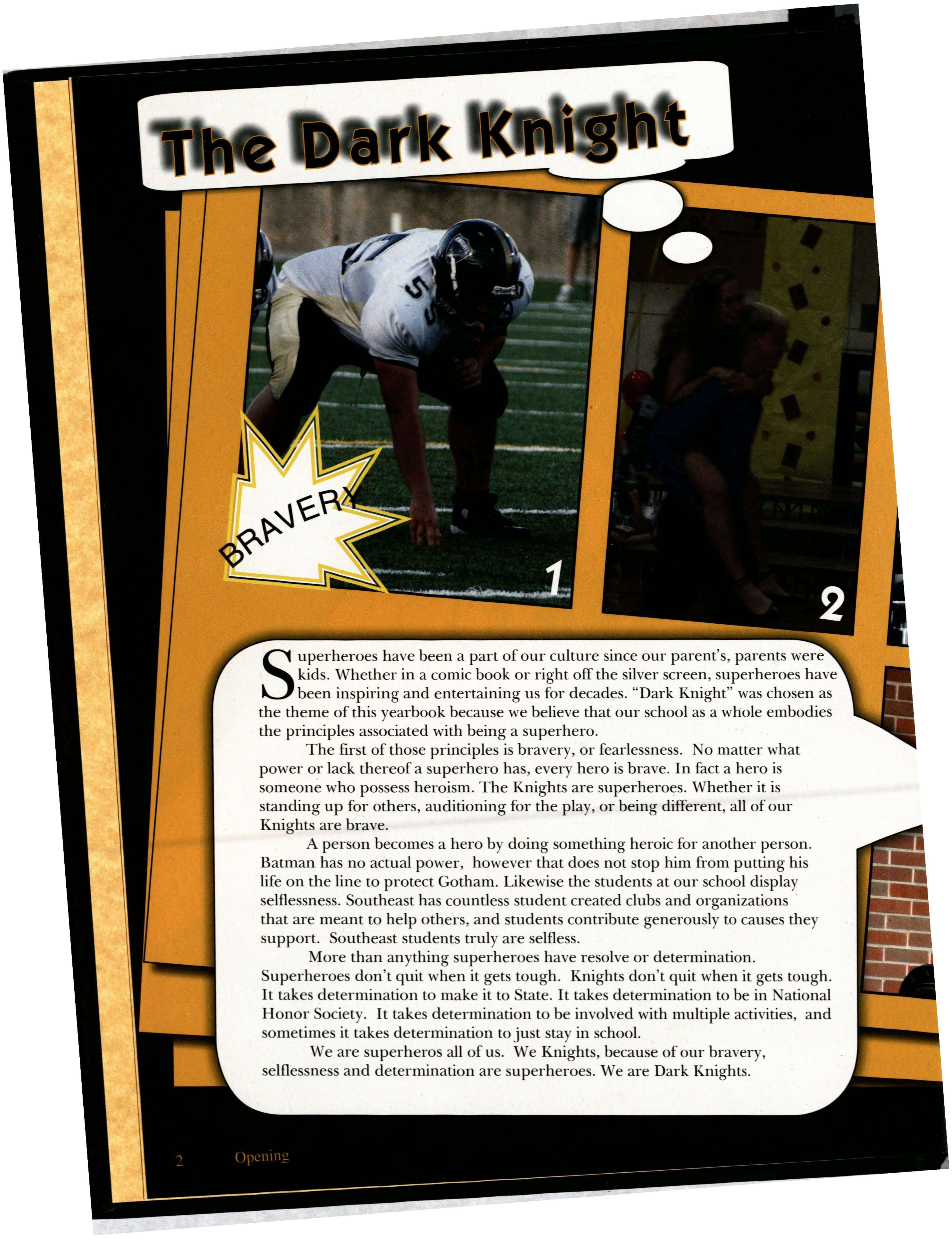 Superheroes have been a part of our culture since our parent's, parents were kids. Whether in a comic book or right off the silver screen, superheroes have been inspiring and entertaining us for decades. " Dark Knight" was chosen as the theme of this yearbook because we believe that our school as a whole embodies the principles associated with being a superhero.