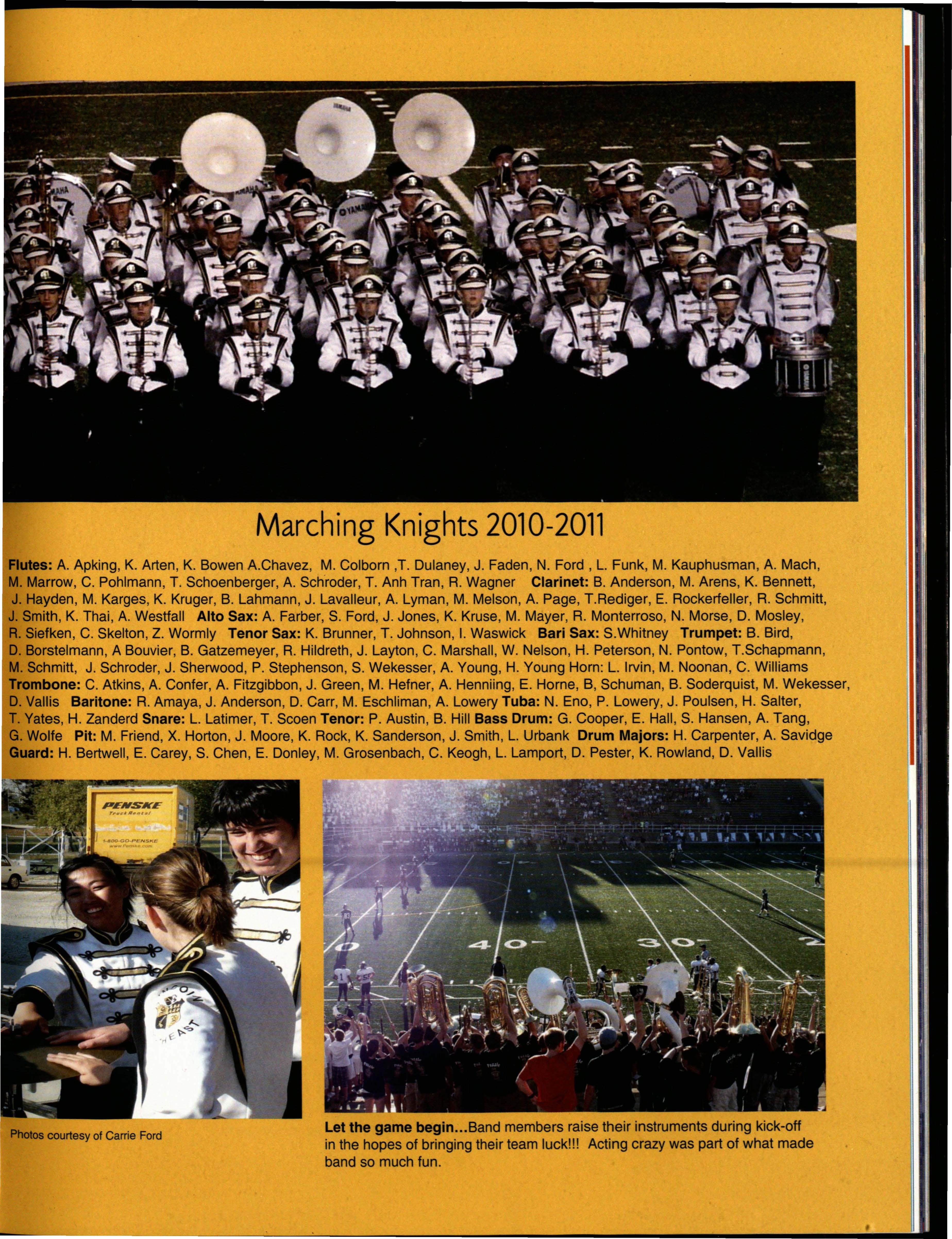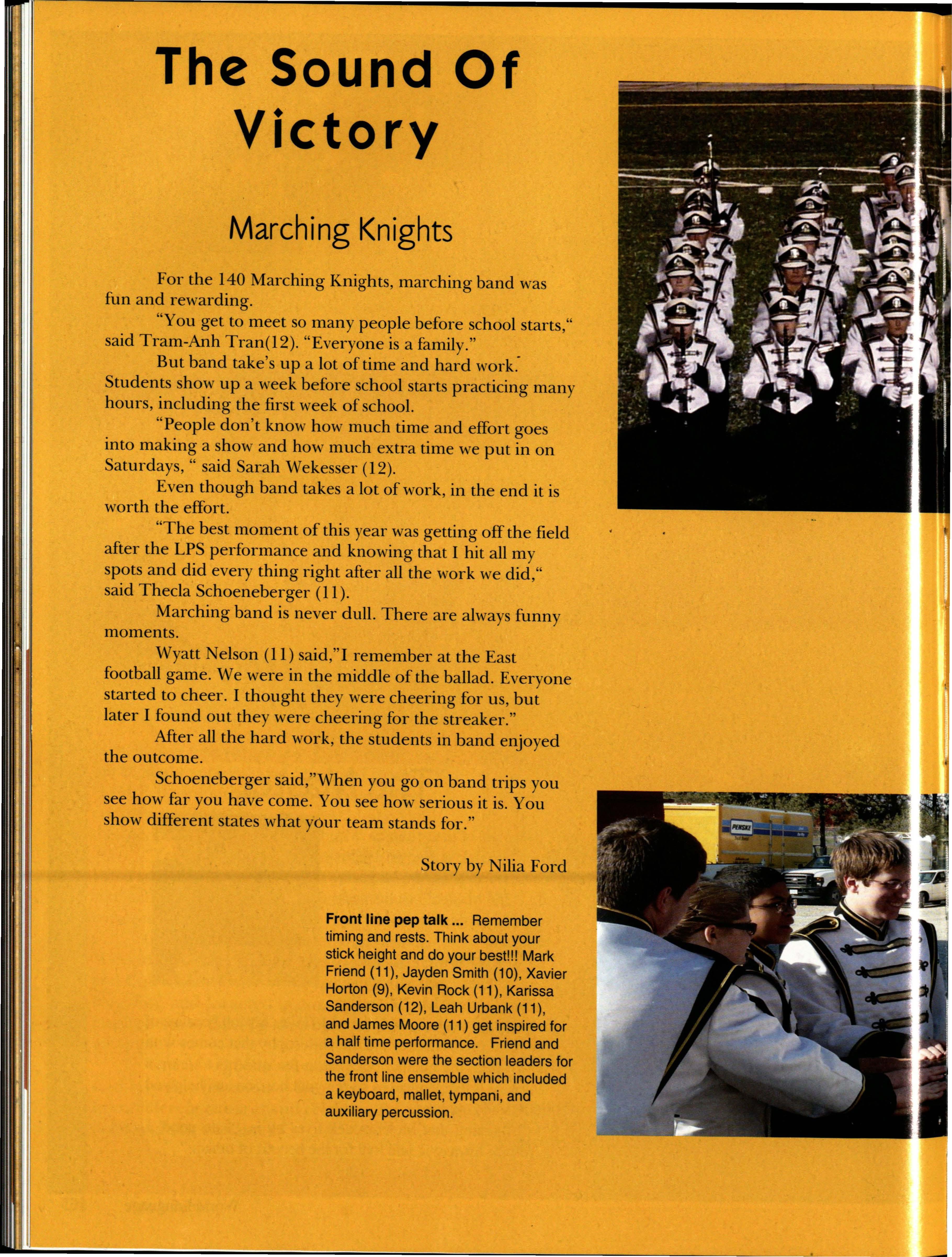 en to victory" .. As the Knights make a touchdown th e 'ffght song. Eric Hall (11) and the drumline set the beat fo r