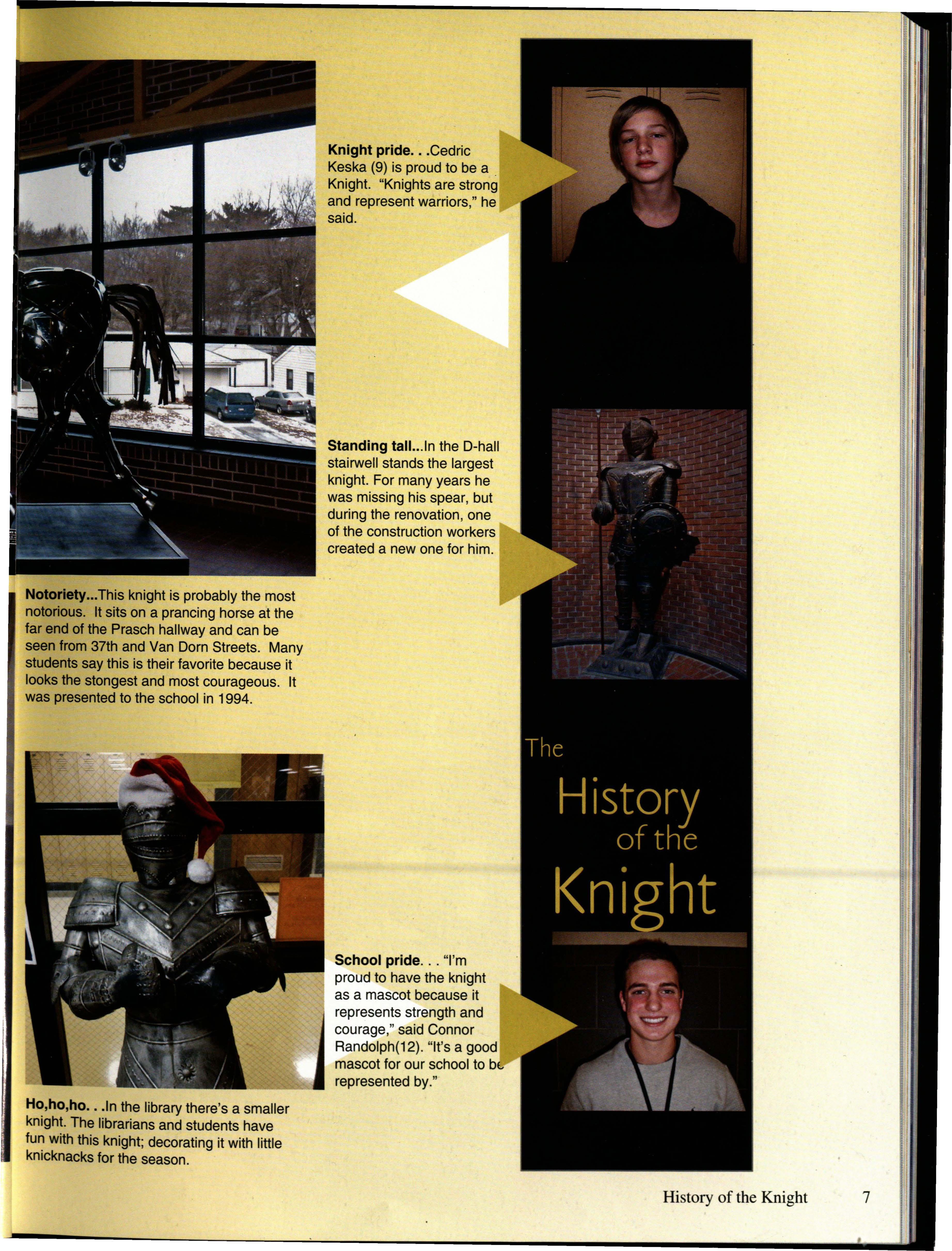 We are the Knights, and there can be no doubt in an o e's mind upon walking through our school that we are proud of that. Throughout the school, there can be £ , a at least eight different Knight sculptures. T e ve all come to us at different times and throygh ifferent sources.