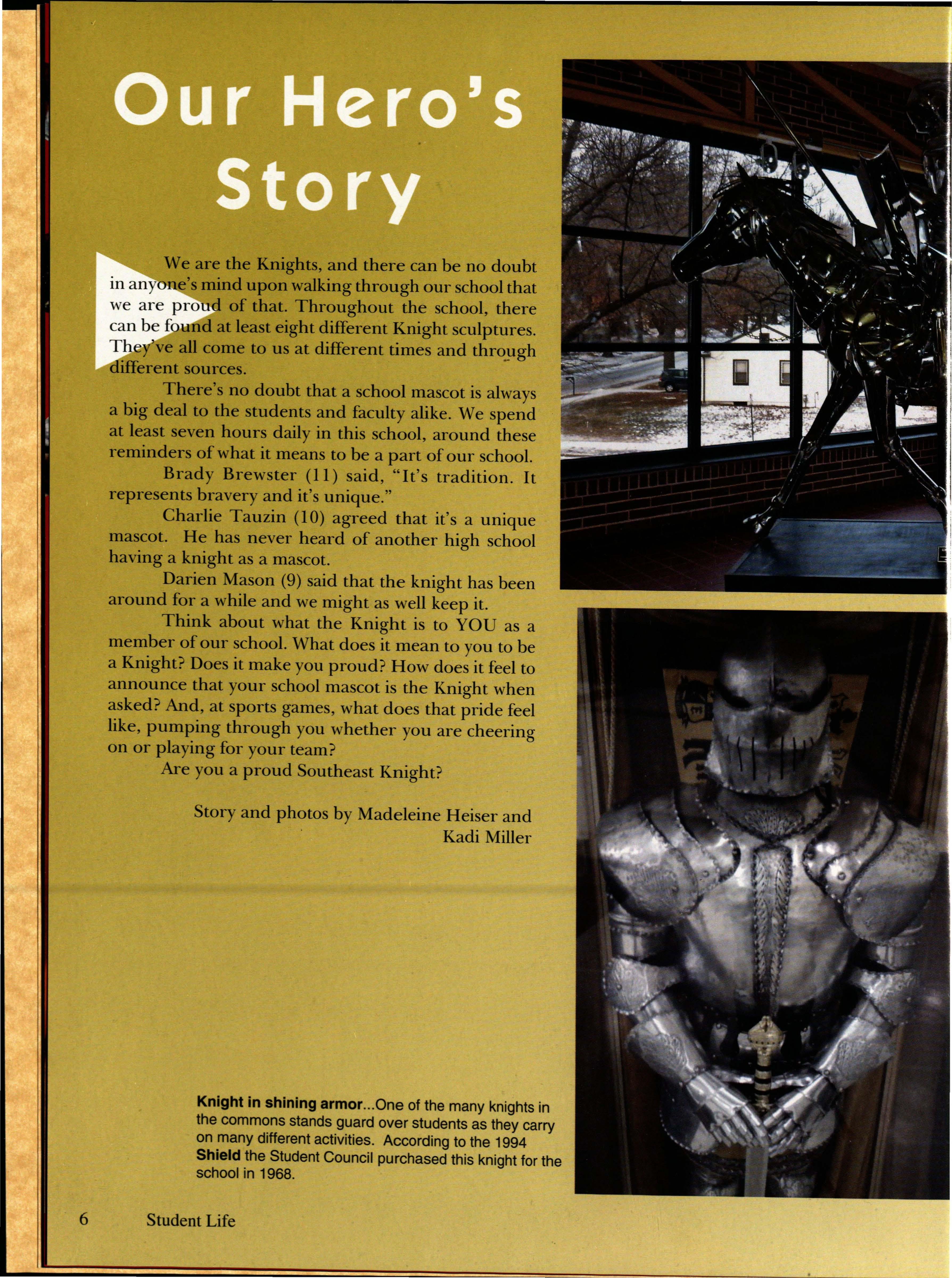 Knight in shining armor One of the many knights in the commons stands guard over students as they carry on many different activities. According to the 1994 Shield the Student Council purchased this knight for the school in 1968.