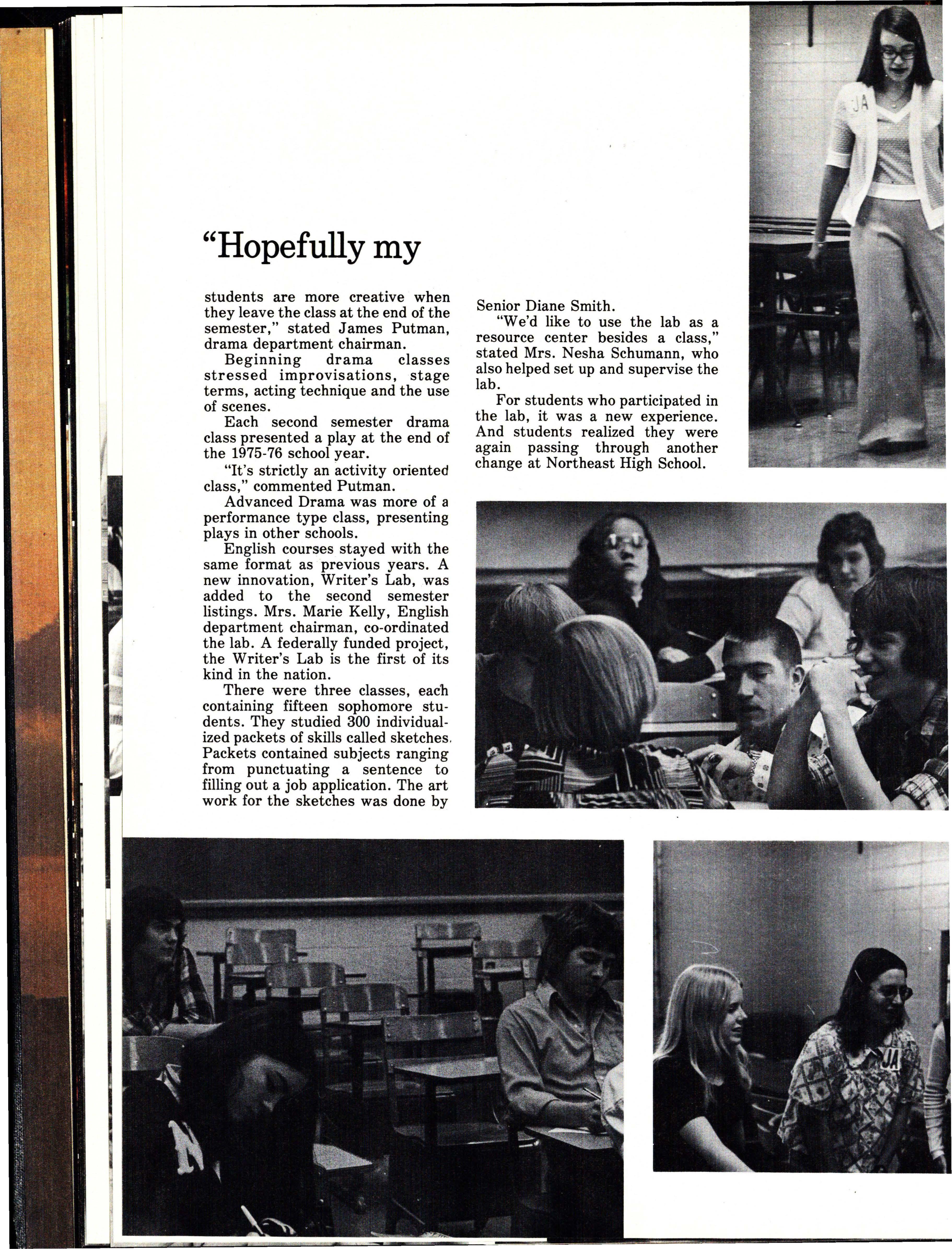 English courses stayed with the same format as previous years. A new innovation, Writer's Lab, was added to the second semester listings. Mrs. Marie Kelly, English department chairman, co-ordinated the lab._ A federally funded project, the Writer's Lab is the first of its kind in the nation.