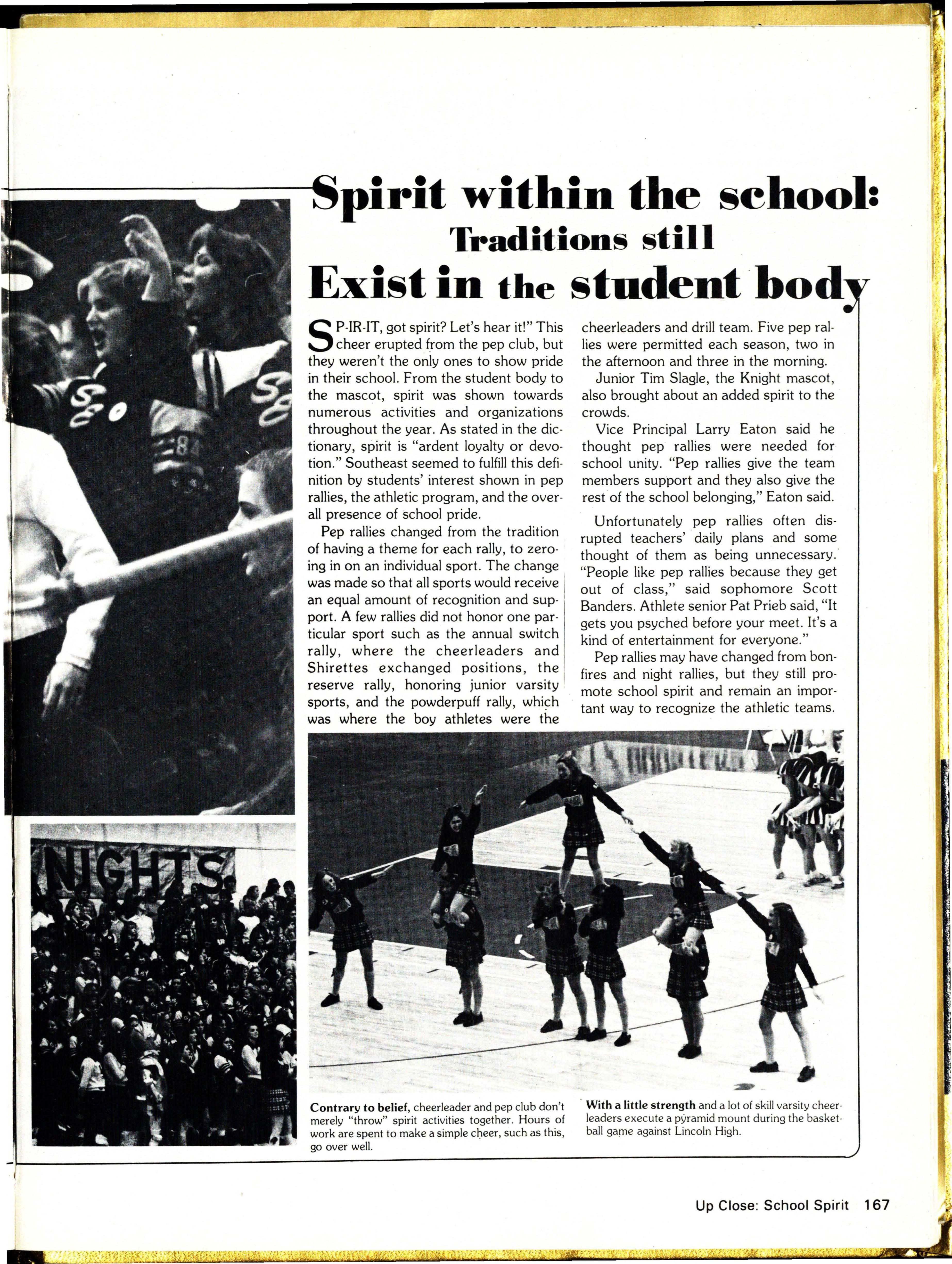 Teachers often create as · much school spirit as students do. During the third pep rally, Mick Pierce and his group of "flashers " spelled out KNIGHTS to get the varsity football team riled for the East High game.