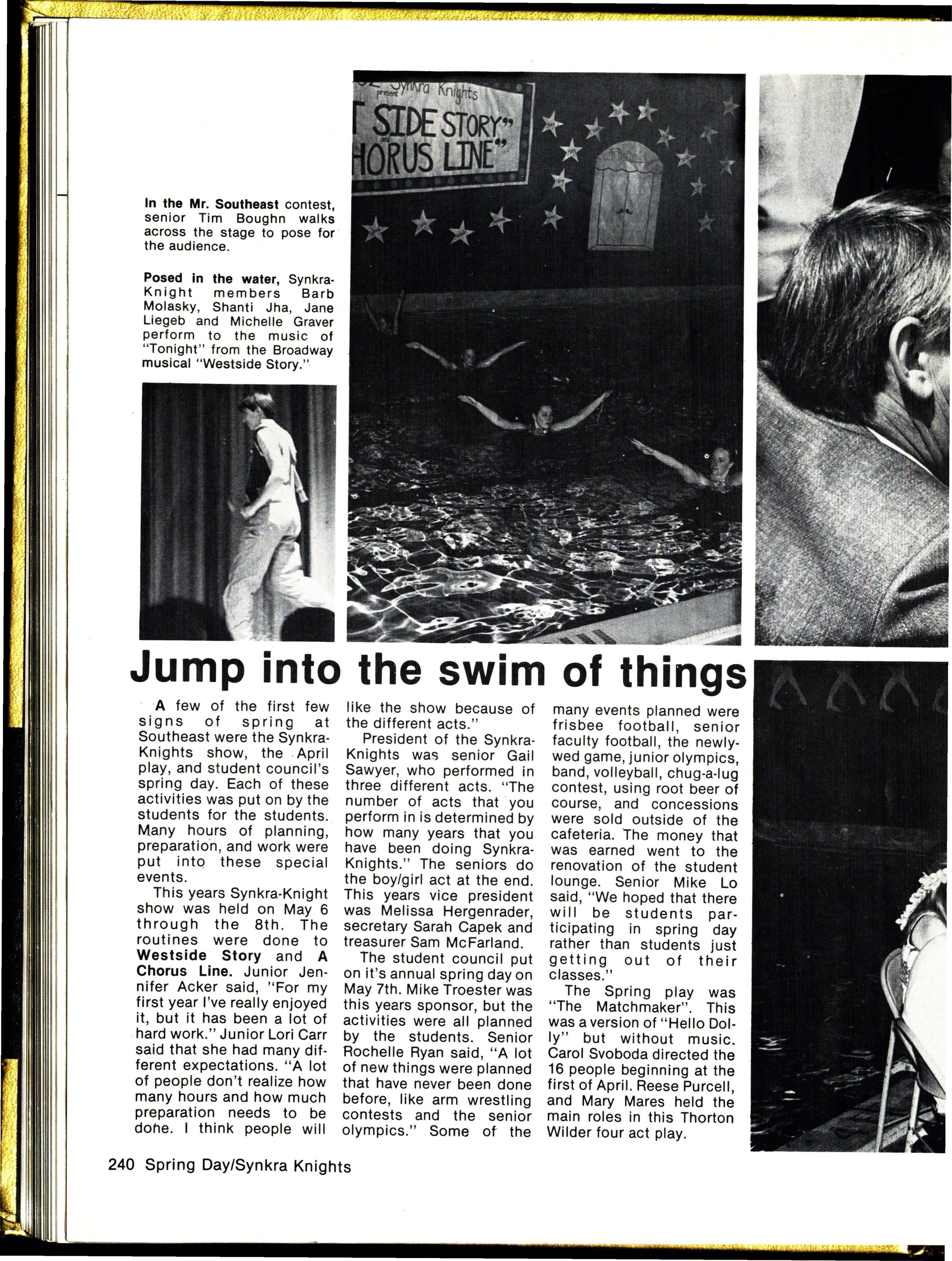 ·A few of the first few signs of spring at Southeast were the SynkraKnights show, the April play, and student council's spring day. Each of these activities was put on by the students for the students Many hours of planning, preparatio'n, and work were put into these special events.