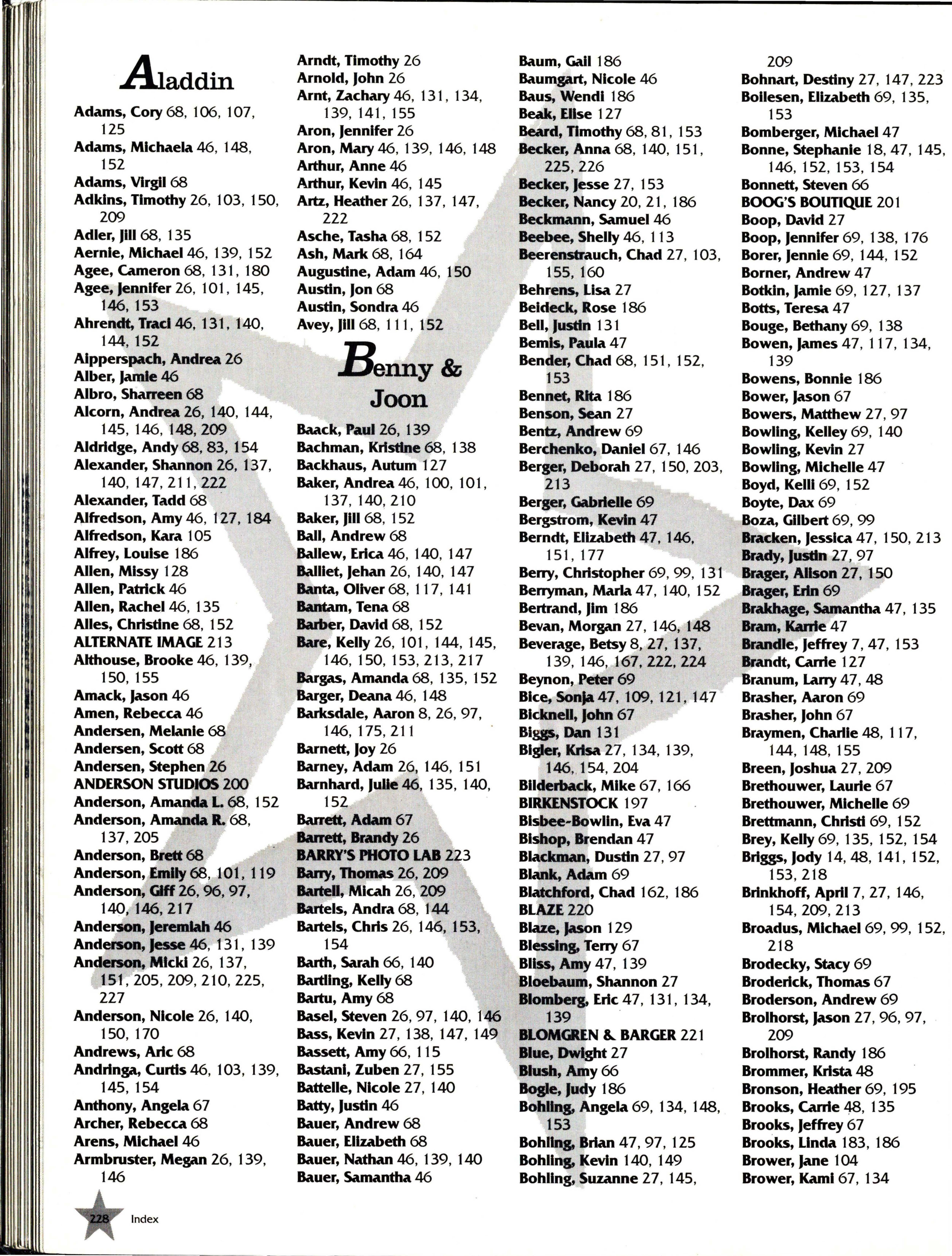Bigler, Krlsa 27 , 134 , 139 , 144 , 148, 155 Andersen, Stephen 26 Barney, Adam 26, 146, 151 146, 154, 204 Breen, Joshua 27 , 209 ANDERSON STUDIOS 200 Barnhard, Julle.46, 135 , 140, Bilderback, Mike 6 7, 166 Brethouwer, Laurie 6 7 Anderson, Amanda L 68 , 152 152