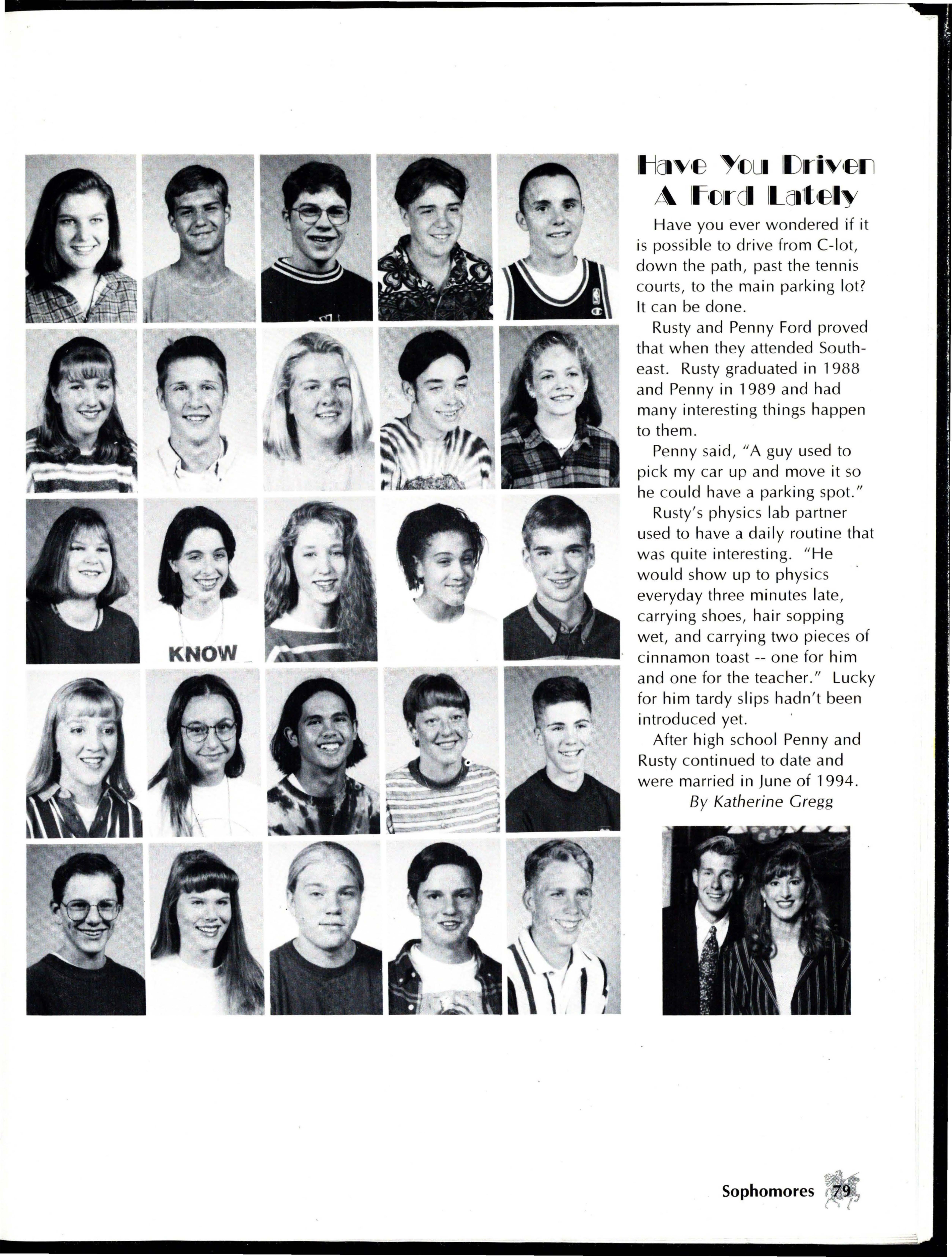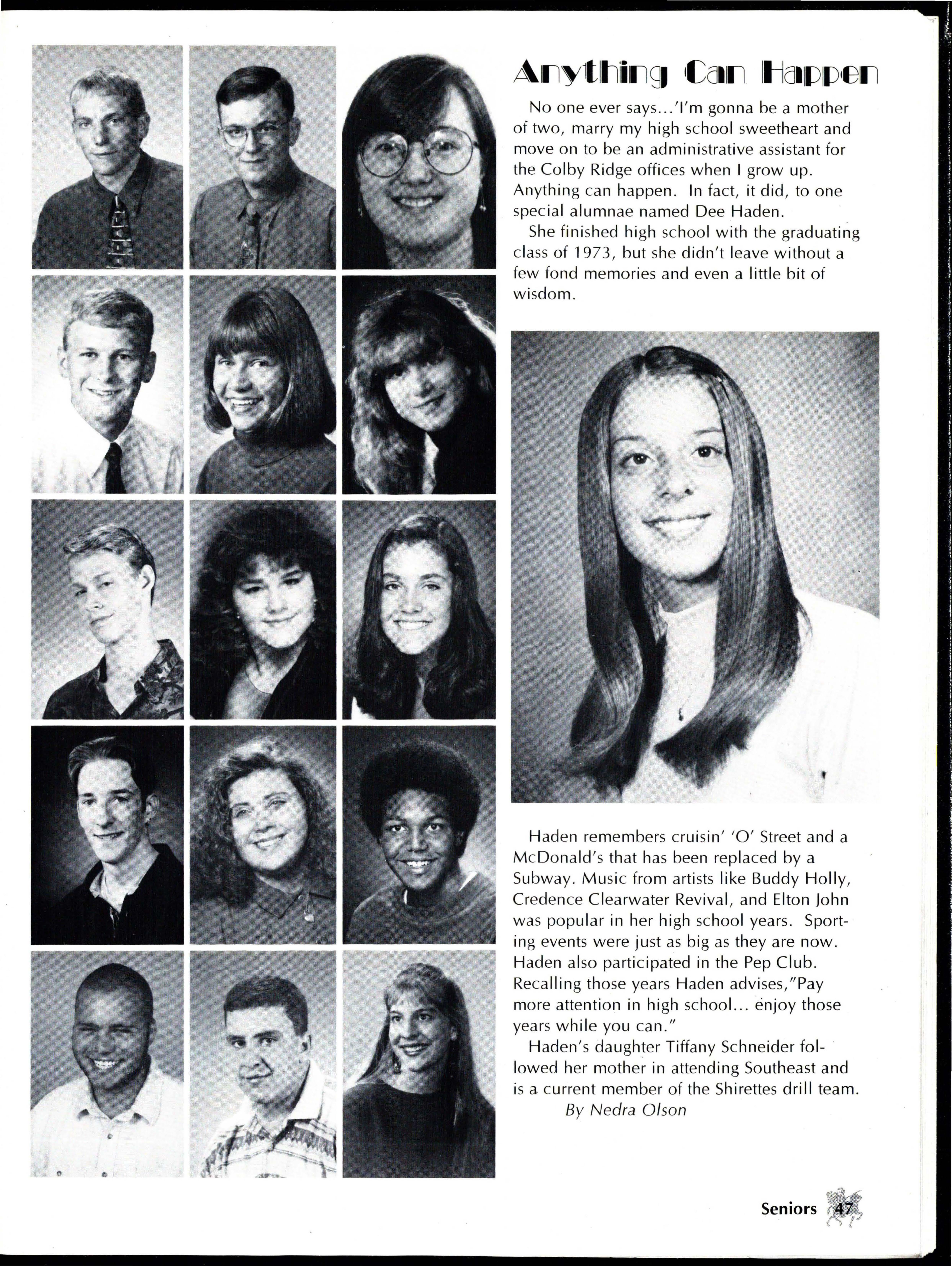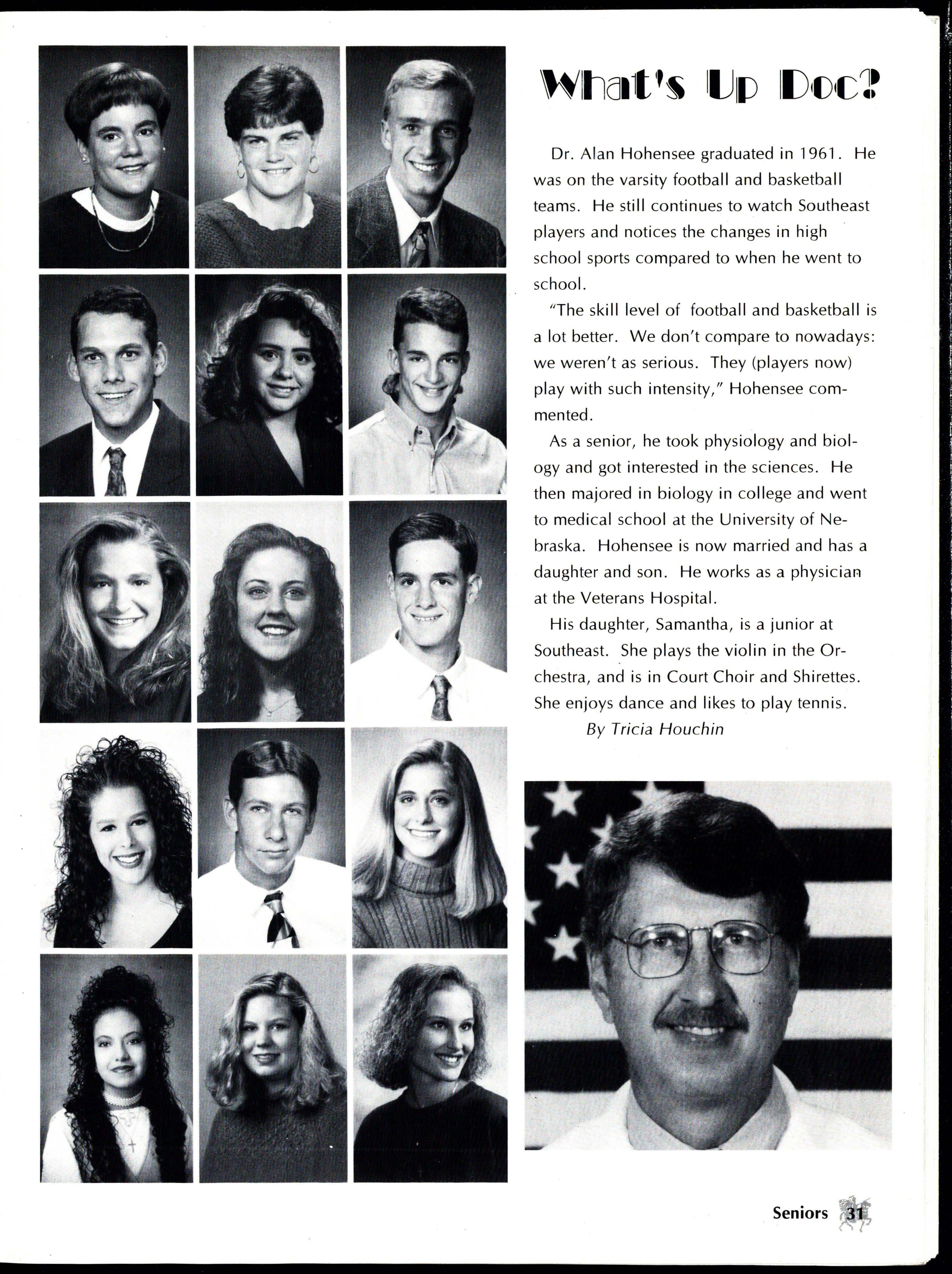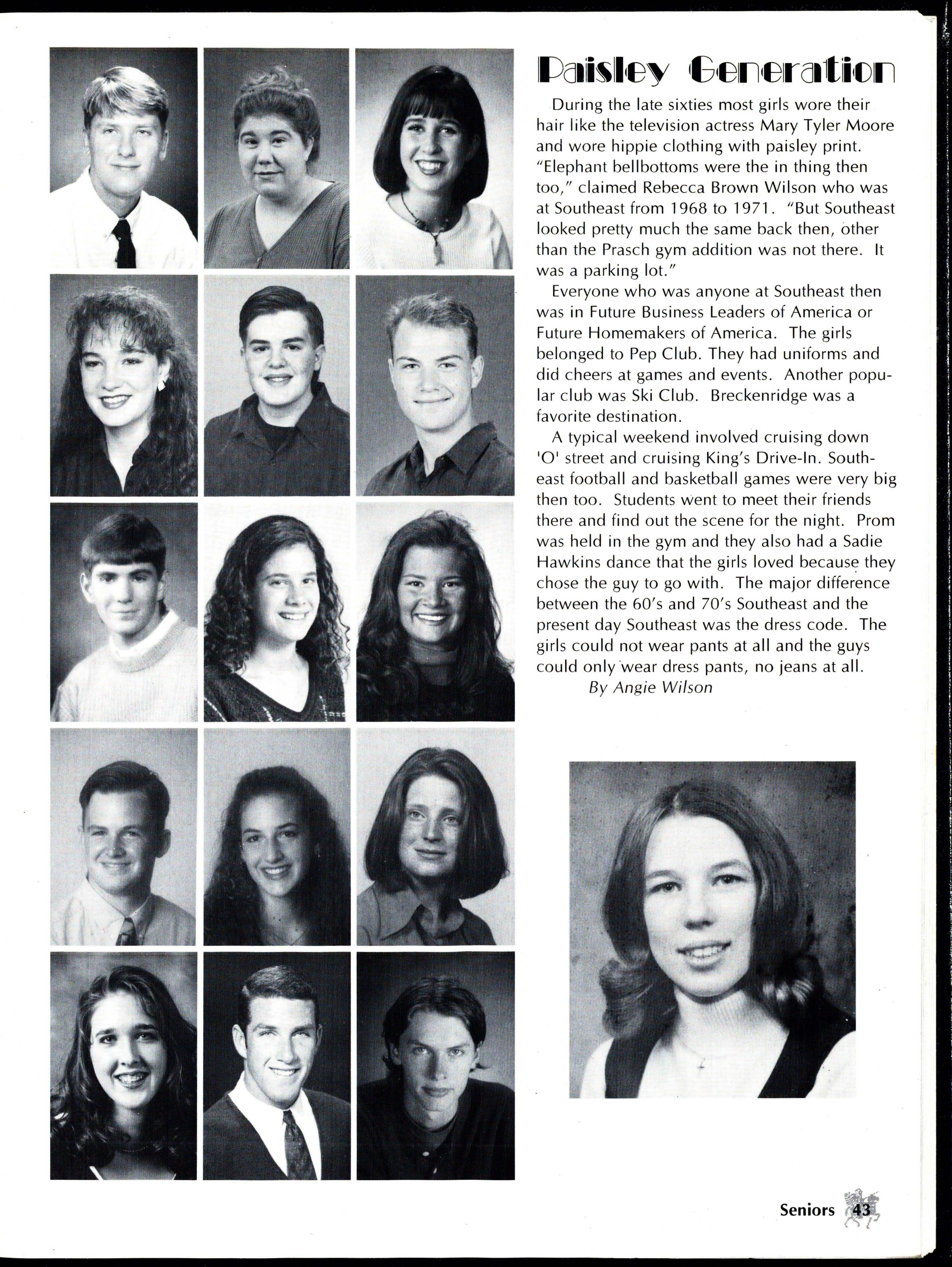 Southeast graduates live in all 50 sta t es and 35 foreign countries. They have a vast array of jobs ranging from state senators to do c tors to housewives to hundred s of other lfurt~ professions The y have been there, done that, and pulled every prank in the book Th ey played football, ba sketball , baseball, and even tiddlywinks They have go n e ~eaI1rs through all the fads: bellbottoms , platform shoes, b ee hives , and wearing their c lothe s ba c kwards. They hav e been in every club , have taken every c la ss, and some hav e tried A\lll dl to drive their tea c hers in sa ne