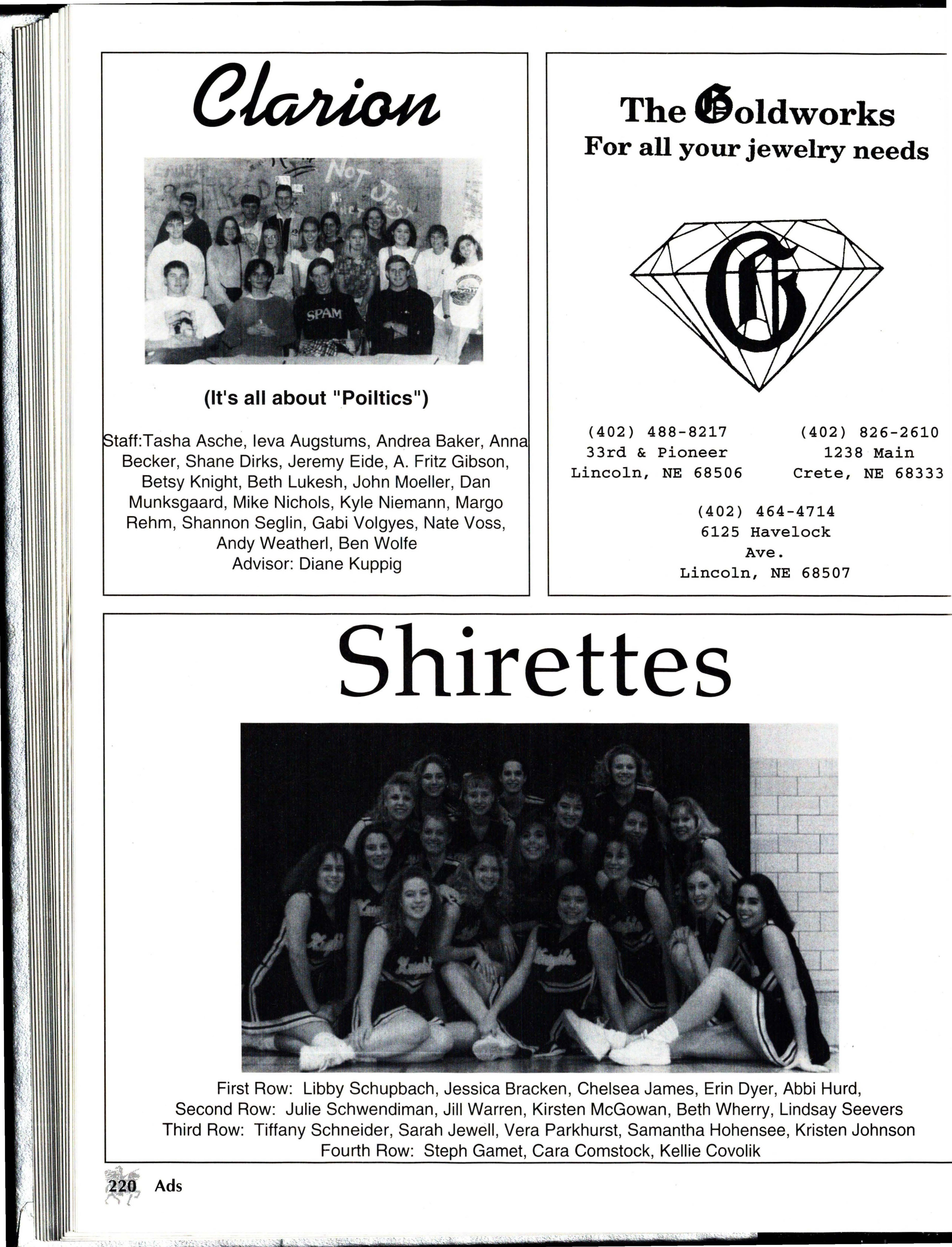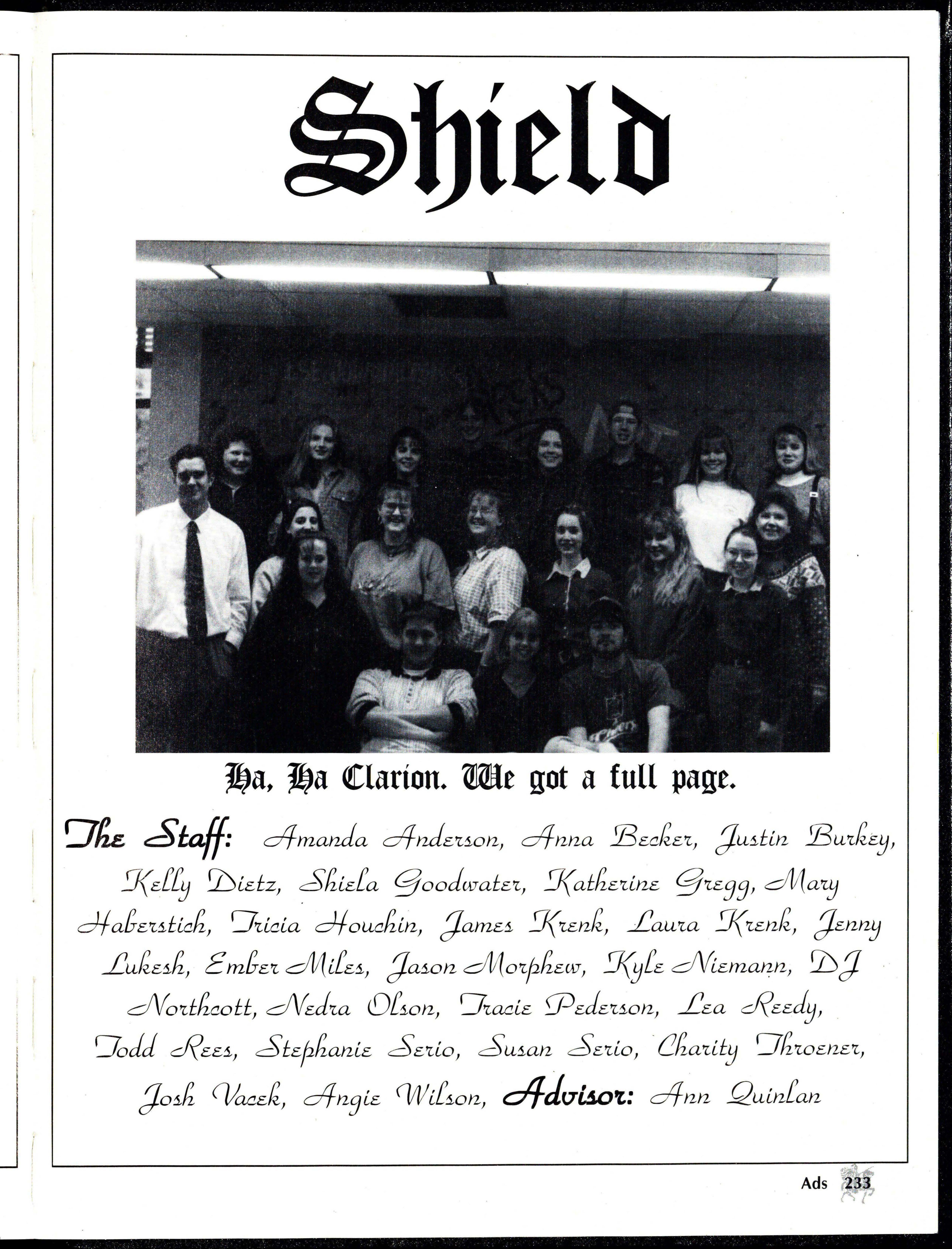 Mr Emr y, Mrs. Leiter, Mr. Reiman, and M rs. Kuppi g and the Clarion staff for the tec hn ica l and moral support all h ave gi ven u s. Thanks to Mrs. Smith's computer aide d d rawing class for the divider page :art w o rk and to Lea's mom for th e c rea ti ve ar two rk i n the student life se c tion. Th e st ude n t bo dy , adverti sers , and co mmun ity deserve the large st thanks fo r all owing u s to cr eate the Shi e ld .
