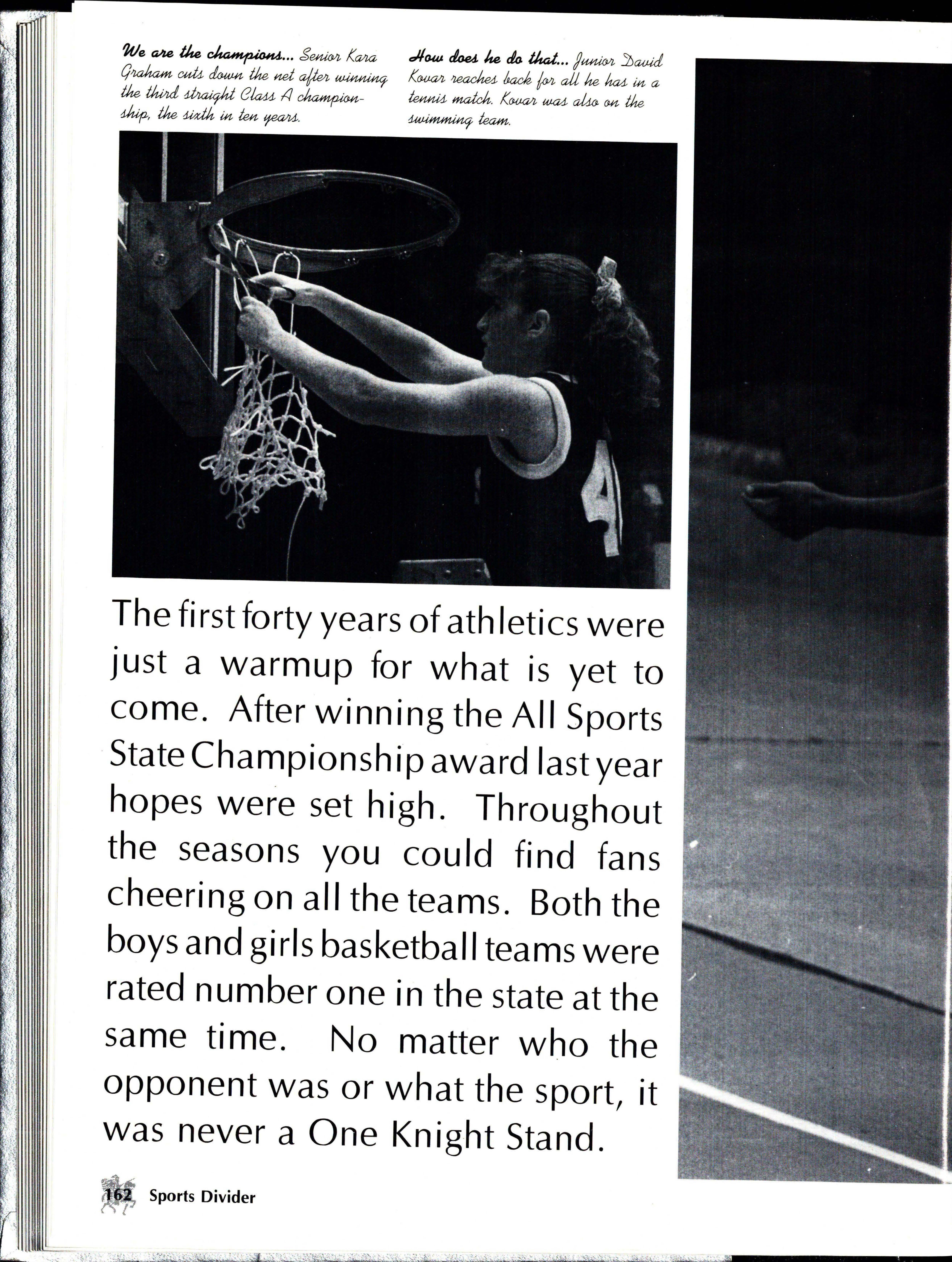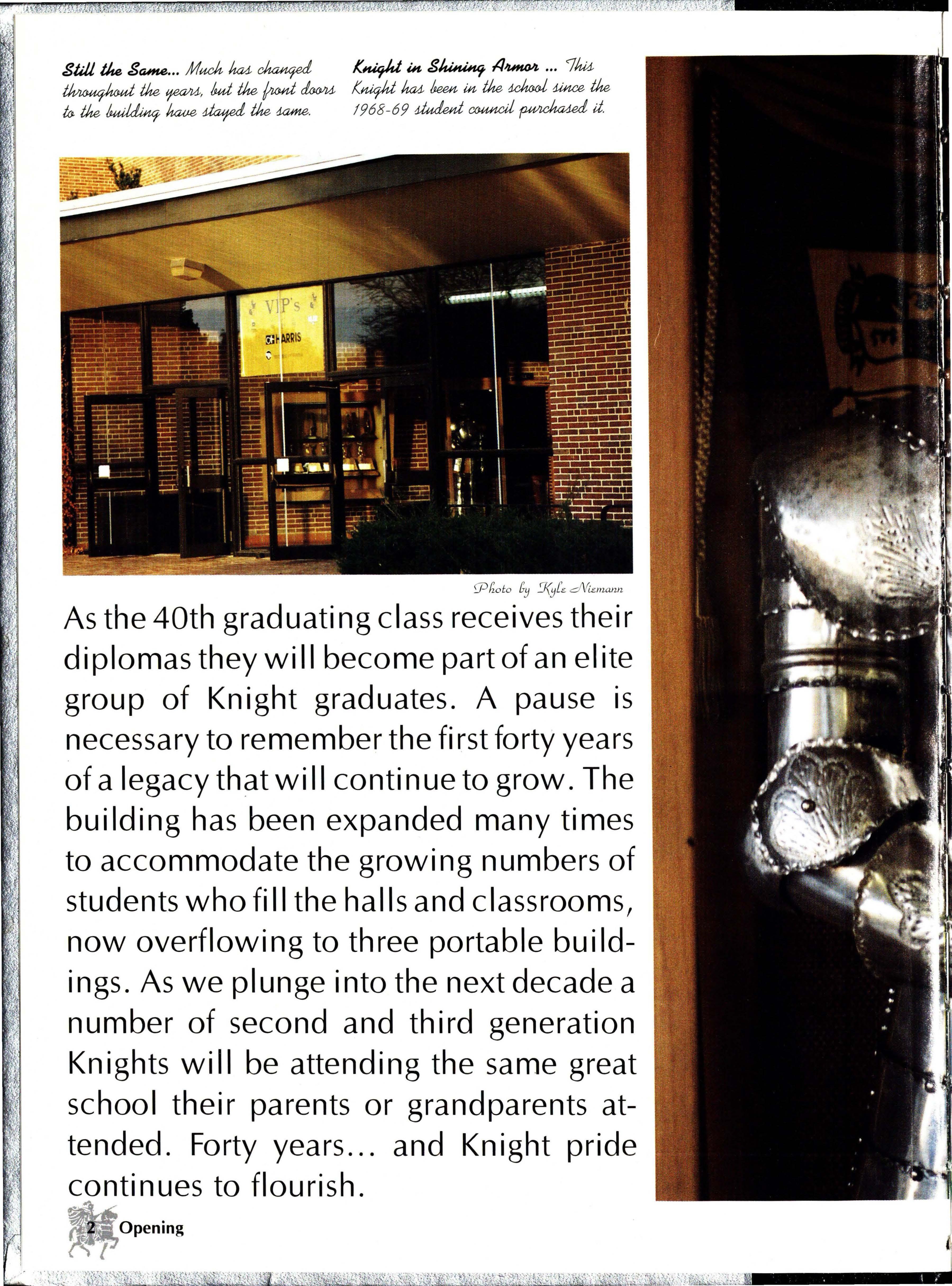 As the 40th graduating class receives their diplomas they will become part of an elite group of Knight graduates. A pause is necessary to remember the first forty years of a legacy th~t wi II continue to grow. The building has been expanded many times to accommodate the growing numbers of students who fill the halls and classrooms, now overflowing to three portable buildings. As we plunge into the next decade a number of second and third generation Knights will be attending the same great school their parents or grandparents attended. Forty years ... and Knight pride continues to flourish.