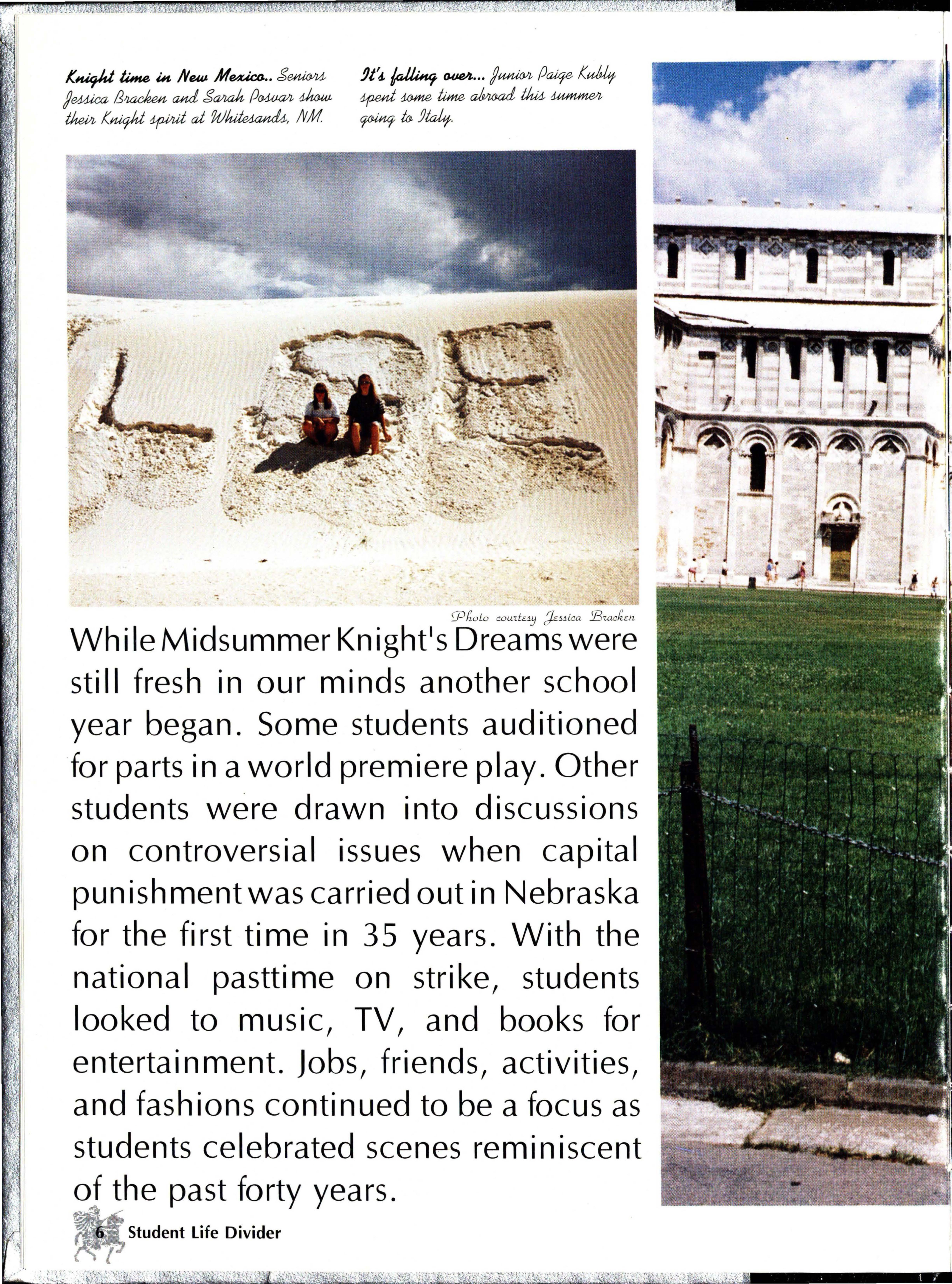 <:Pl',oto coutl£iy :J.£i i ica 23,ackw While Midsummer Knight 1s Dreams were stil I fresh in our minds another school year began. Some students auditioned for parts in a world premiere play. Other students were drawn into discussions on controversial issues when capital punishment was carried out in Nebraska for the first time in 35 years. With the national pasttime on strike, students looked to music, TV, and books for entertainment. Jobs, friends, activities, and fashions continued to be a focus as students celebrated scenes reminiscent of the past forty years.