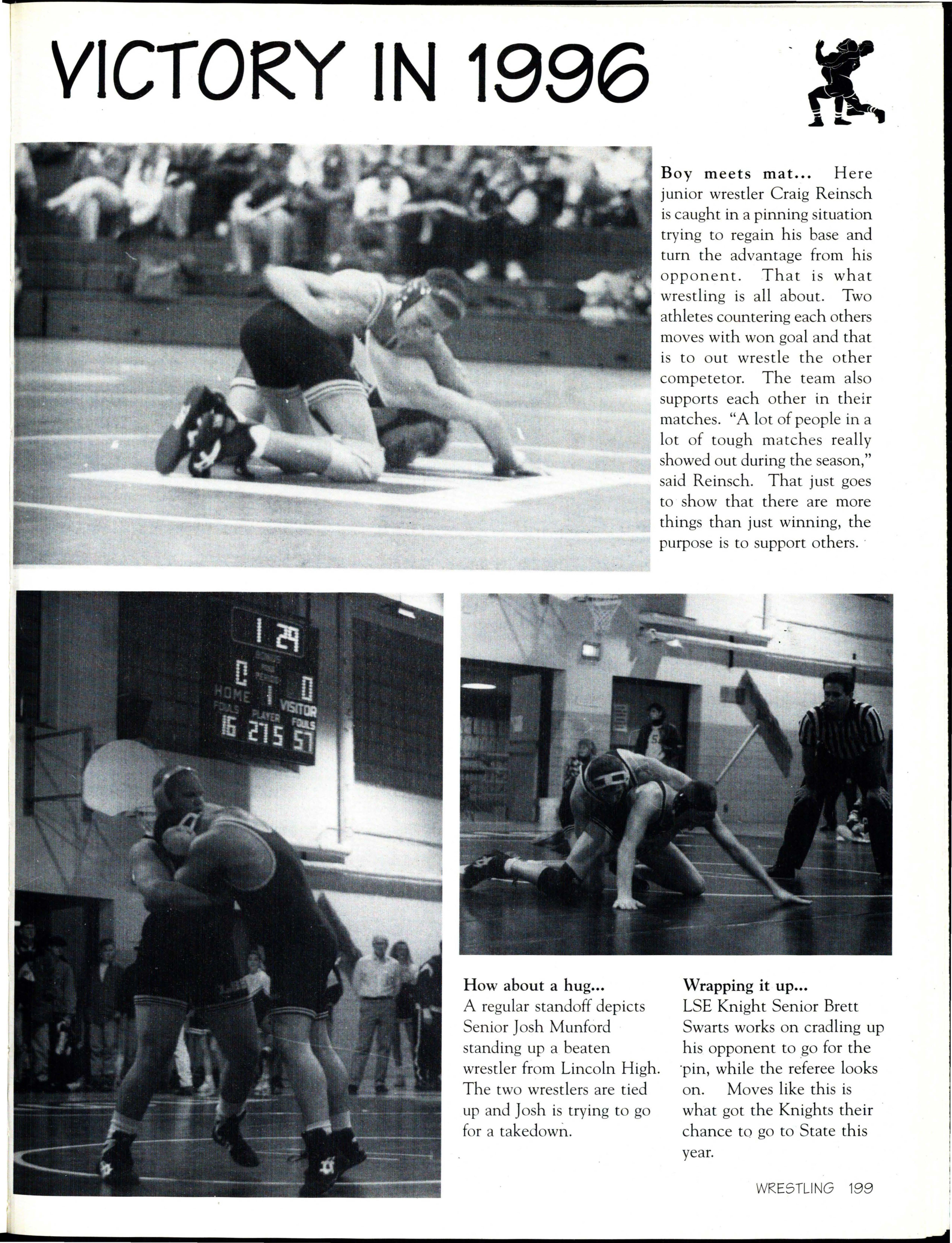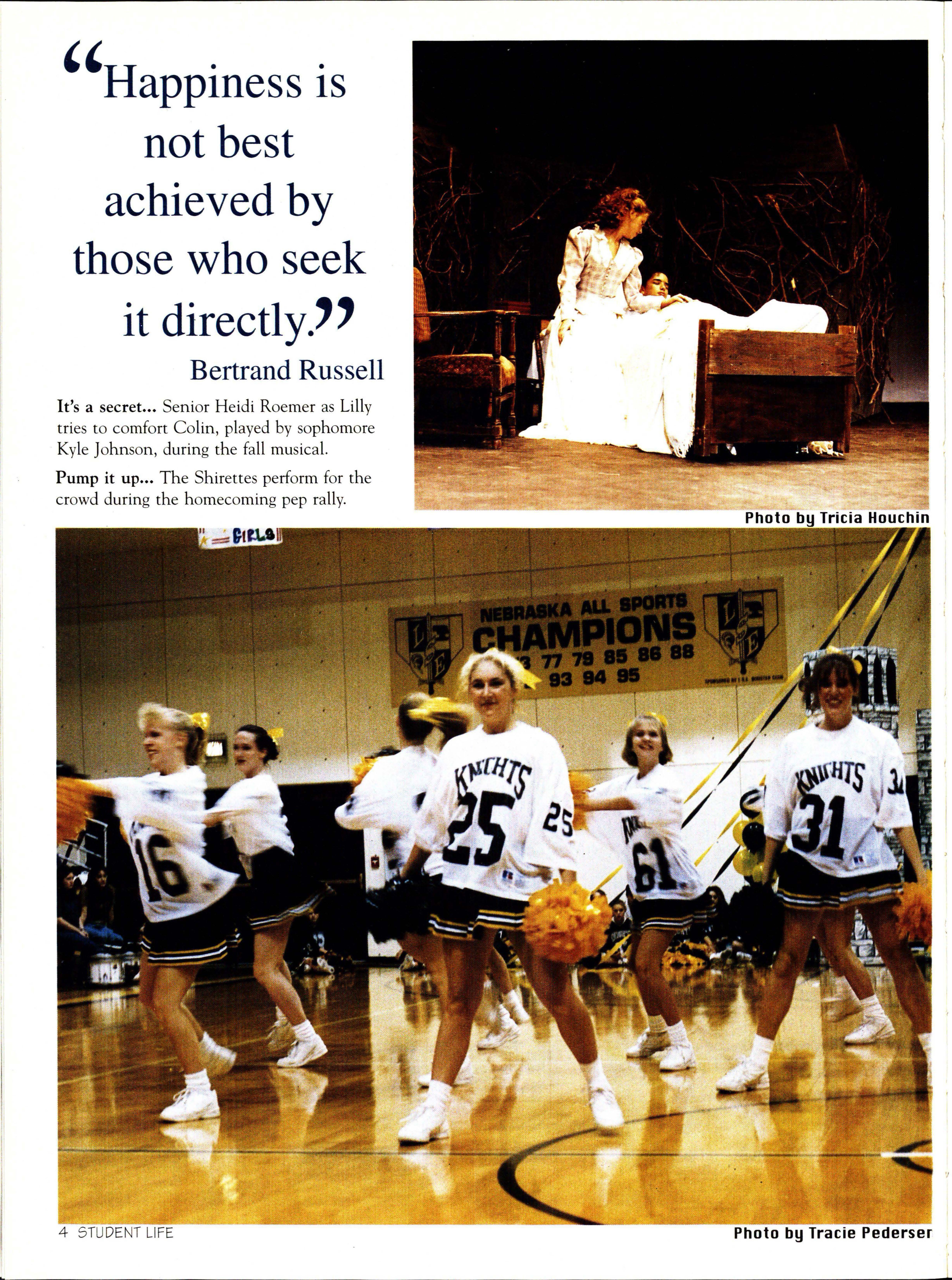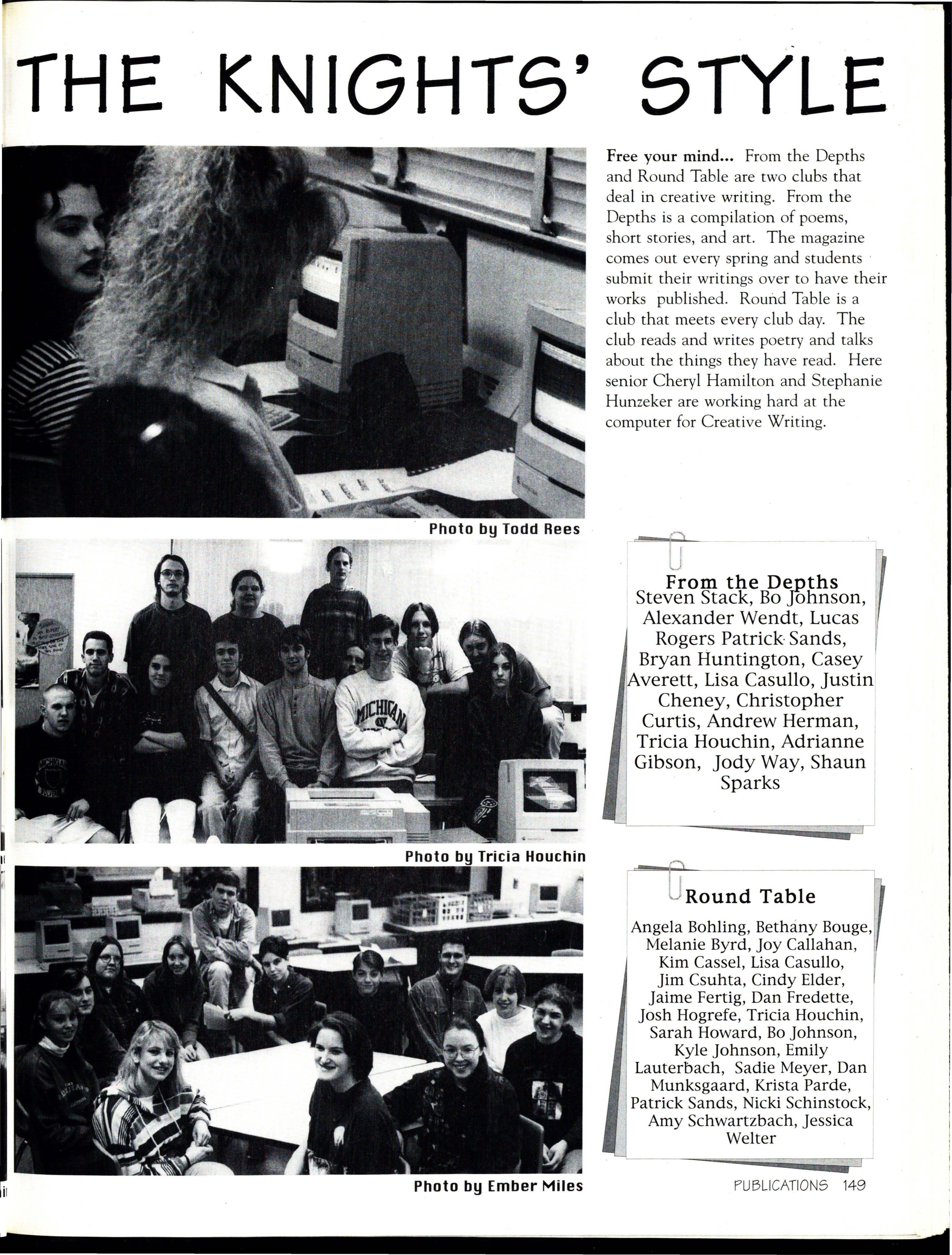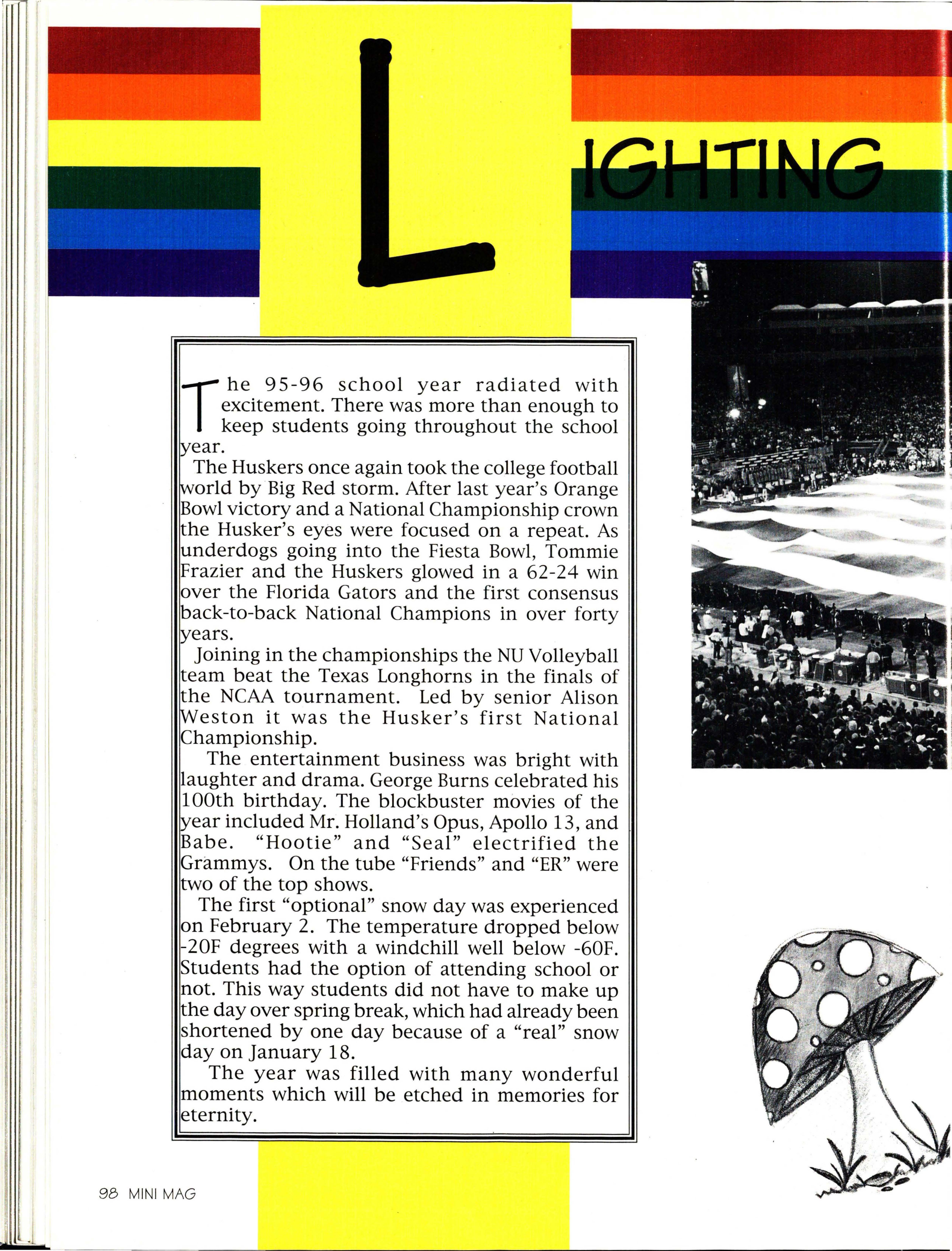 The 1996 Shi e ld was Printed b y Walsworth Publishing Co mp any ir, Marce lin e , Missouri. 1500 copies of the 41s t Shie ld were orde red After c h a nging themes many times t h e Co lo r of Knights was crea te c an d carri ed o ut throughout the book by Editor s Kyle Nie m ann, Char it ) Throene r , Jenny Lukesh , an d t h e entire yearbook staff. Usi n g Page m a ke r 5 0 the book was completed in six deadlines Th f fonts used for the Shie ld we re New York , Technical, Chi cago, Gild e Times, a nd Za pf Dingbats