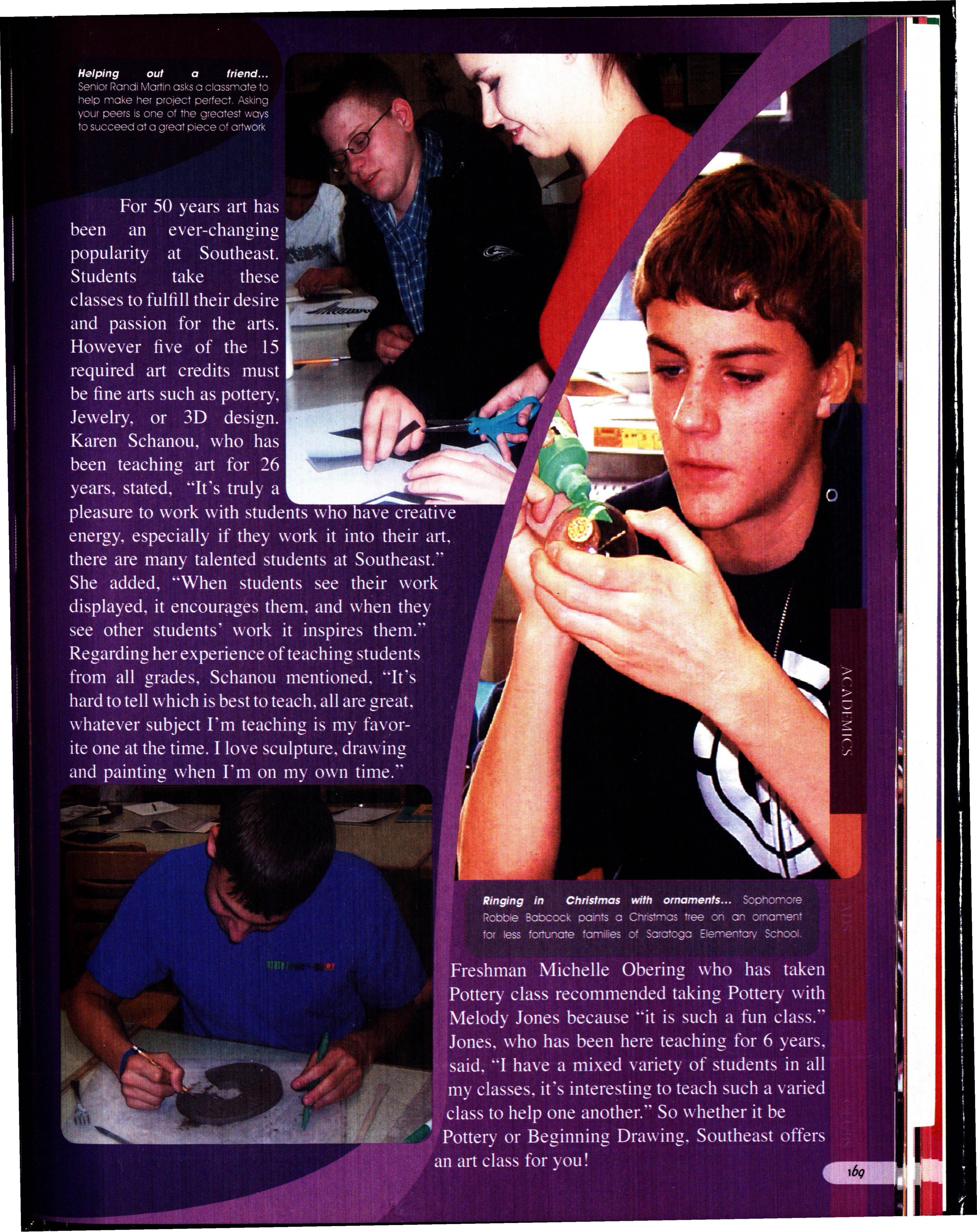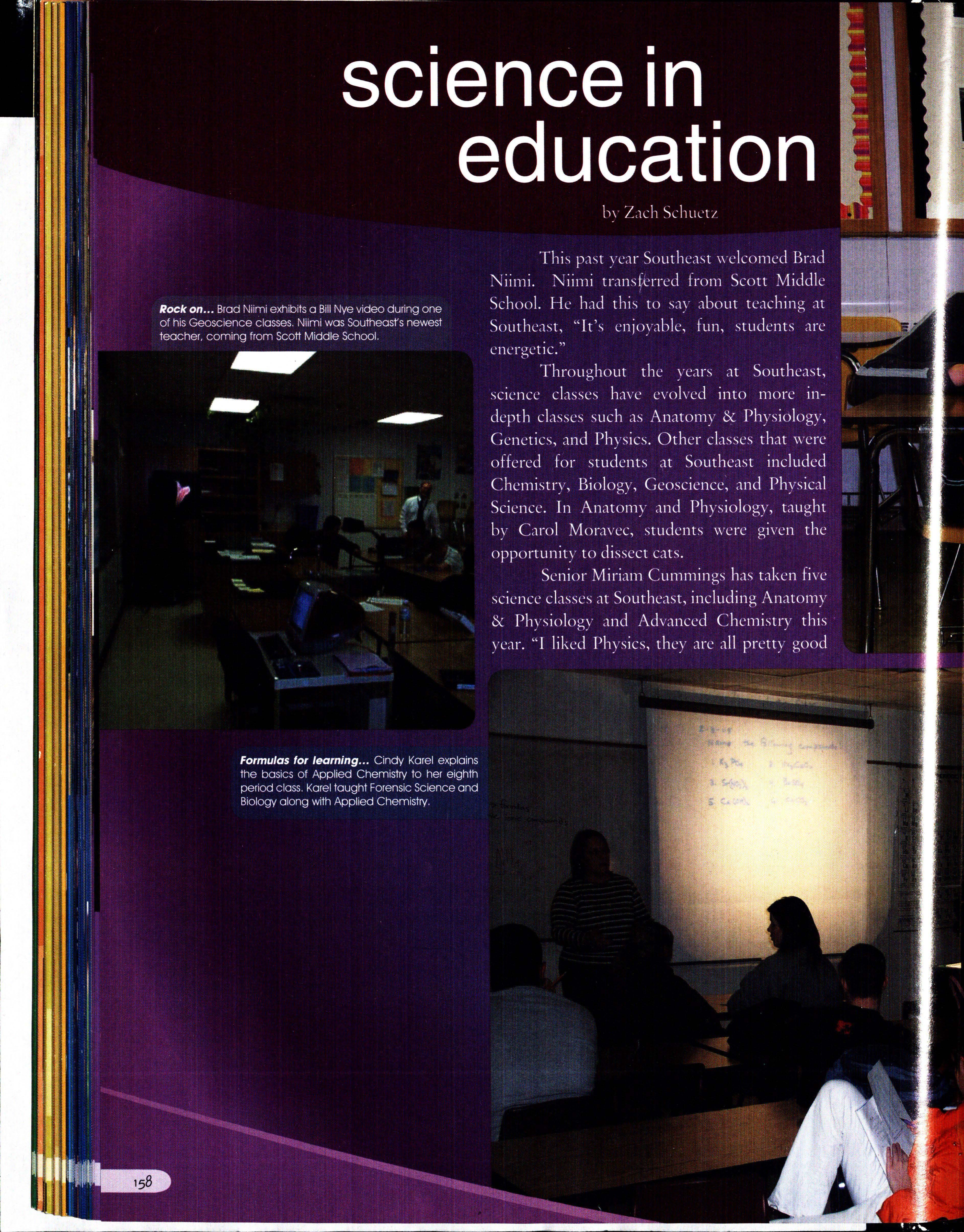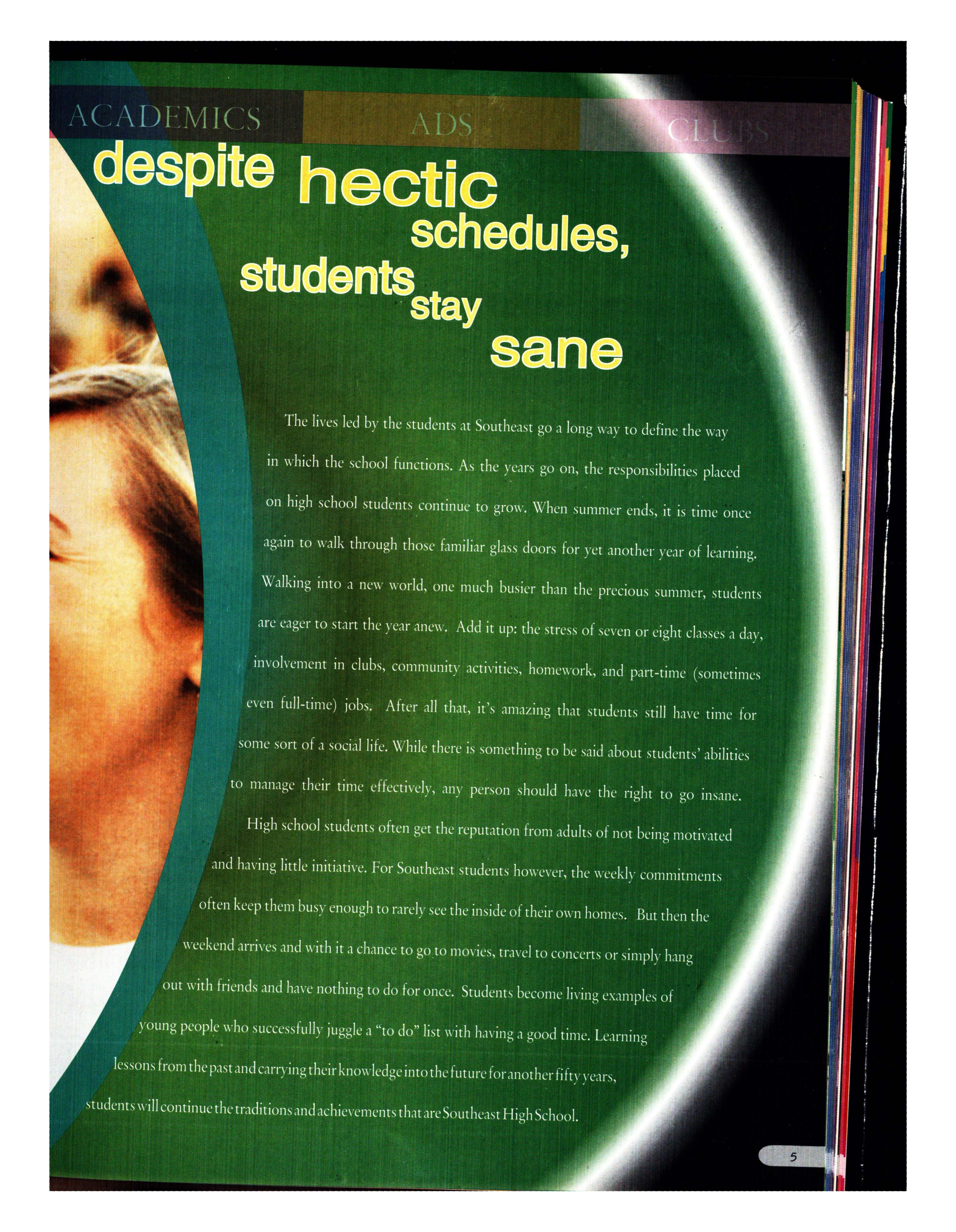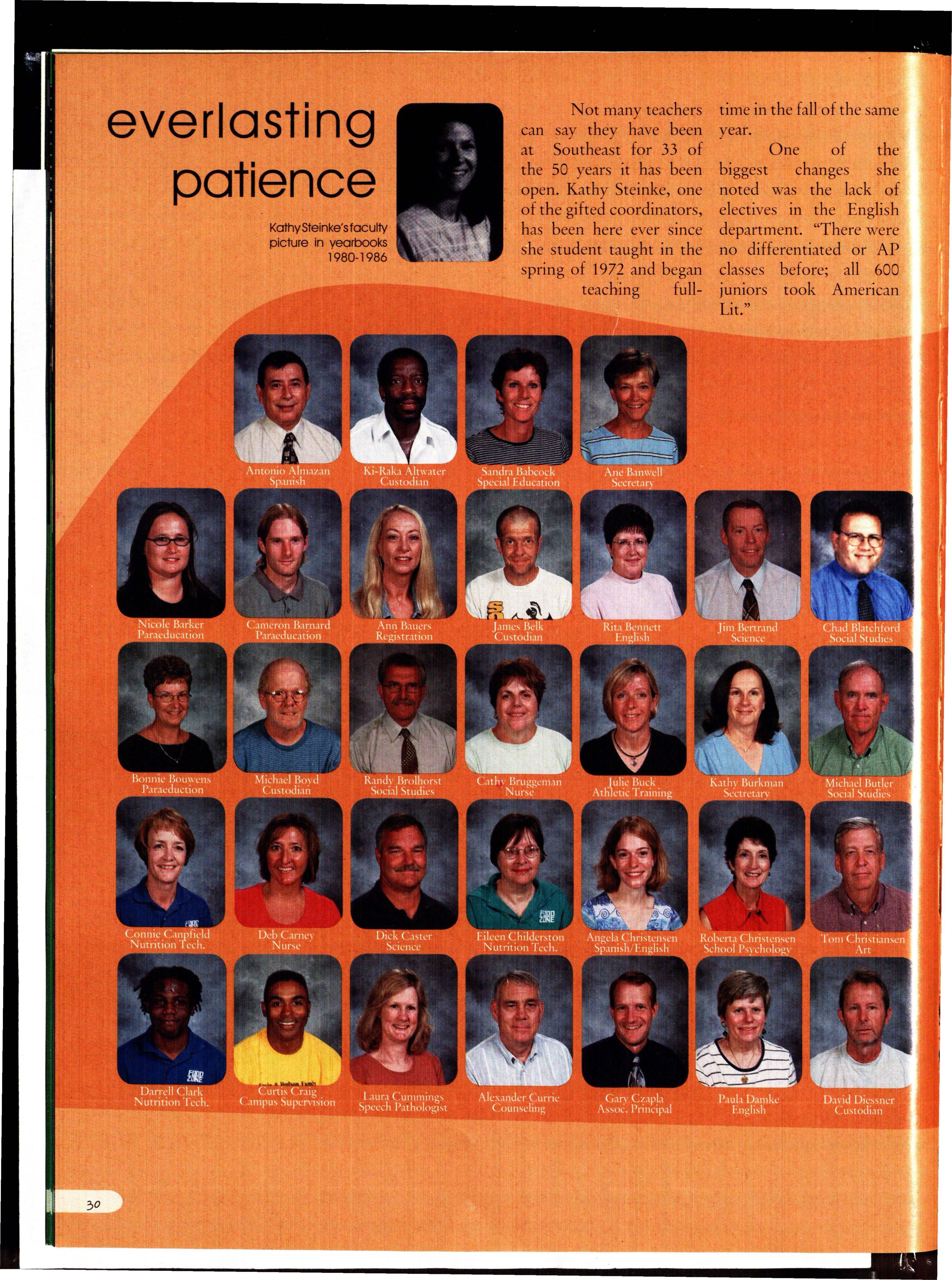 Finally, after thre e yea rs of high school, most seniors are ready to move on, as sen ior Sean Flowerday remarked, "I enjoy being able to look b~c;k on my academic career." While students work through these pr~xesses, the teachers and staff who surro und them do everything possible to provide a nurturing and po sitive learning environment. For the past fifty years, the character of Southeast ha s refused to be determined by the condition of the building. Its nature will always be a reflection of it s people