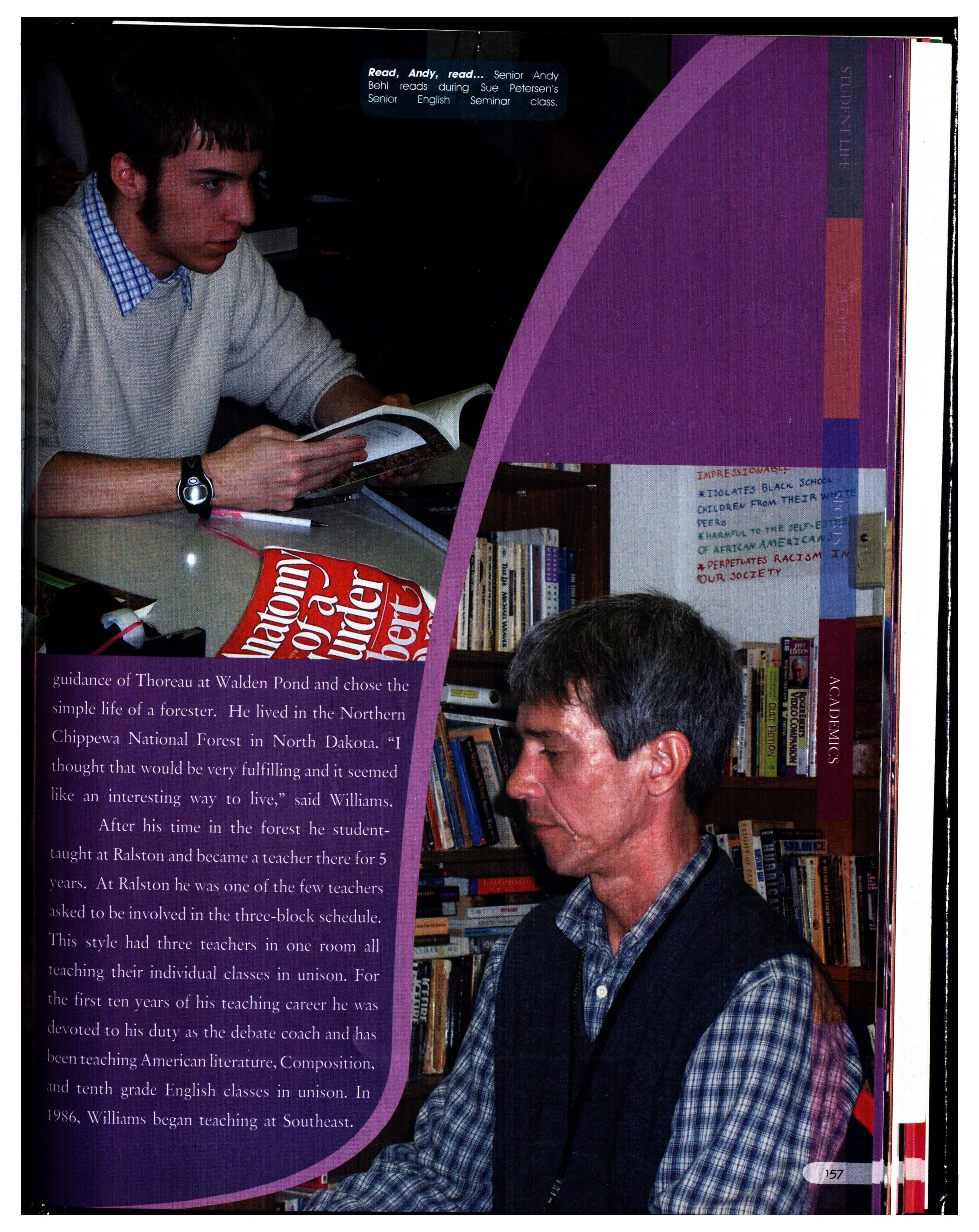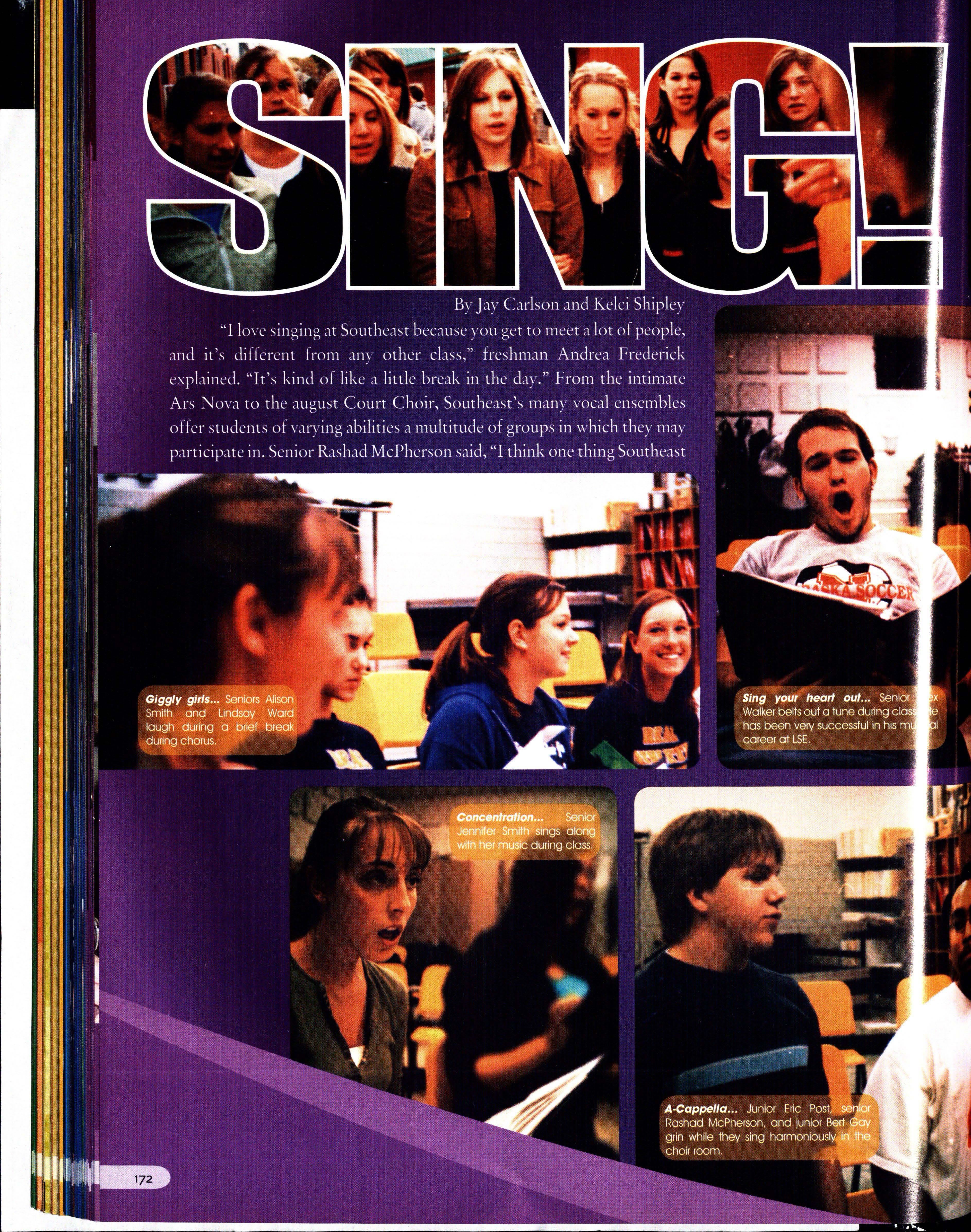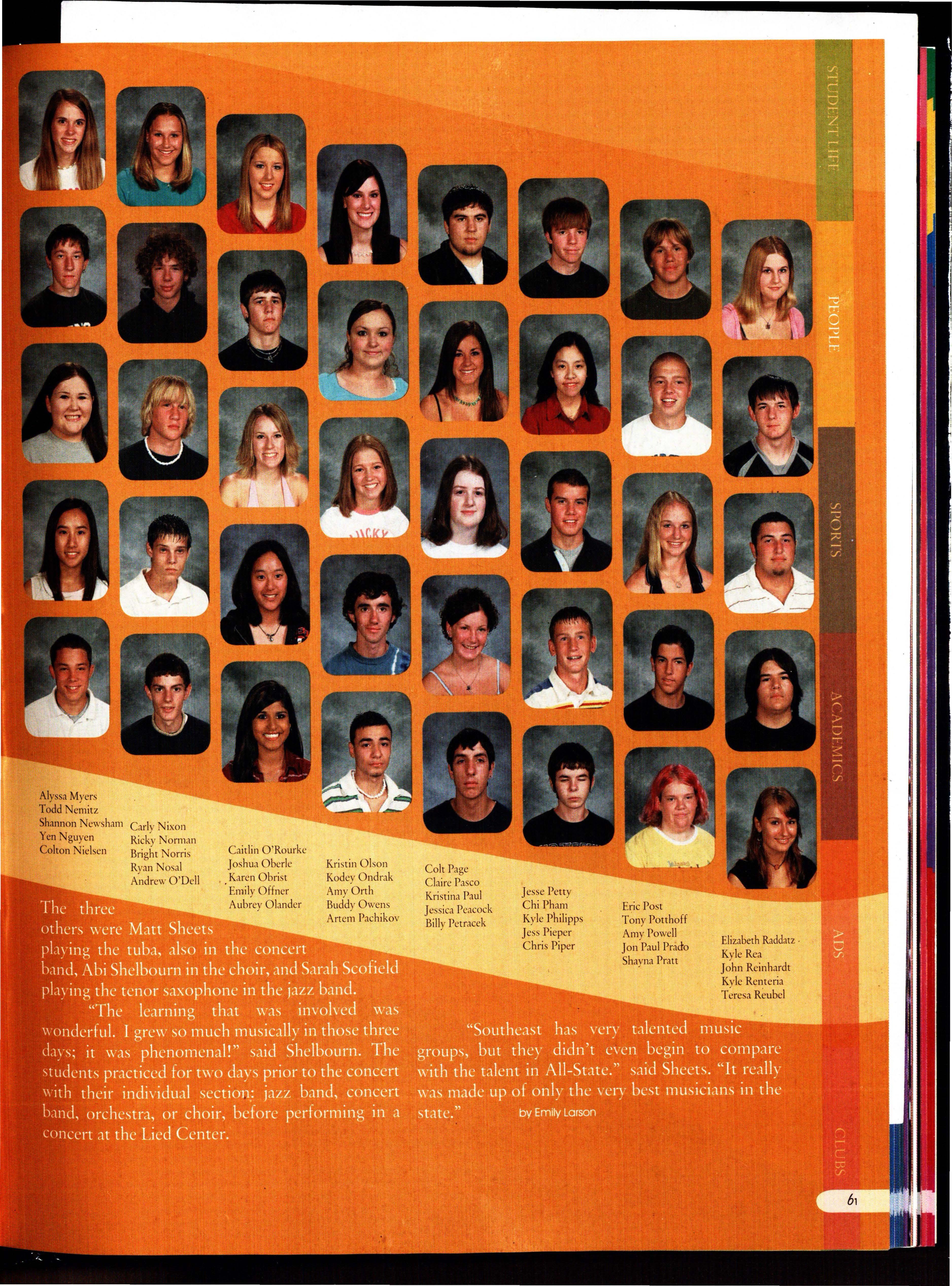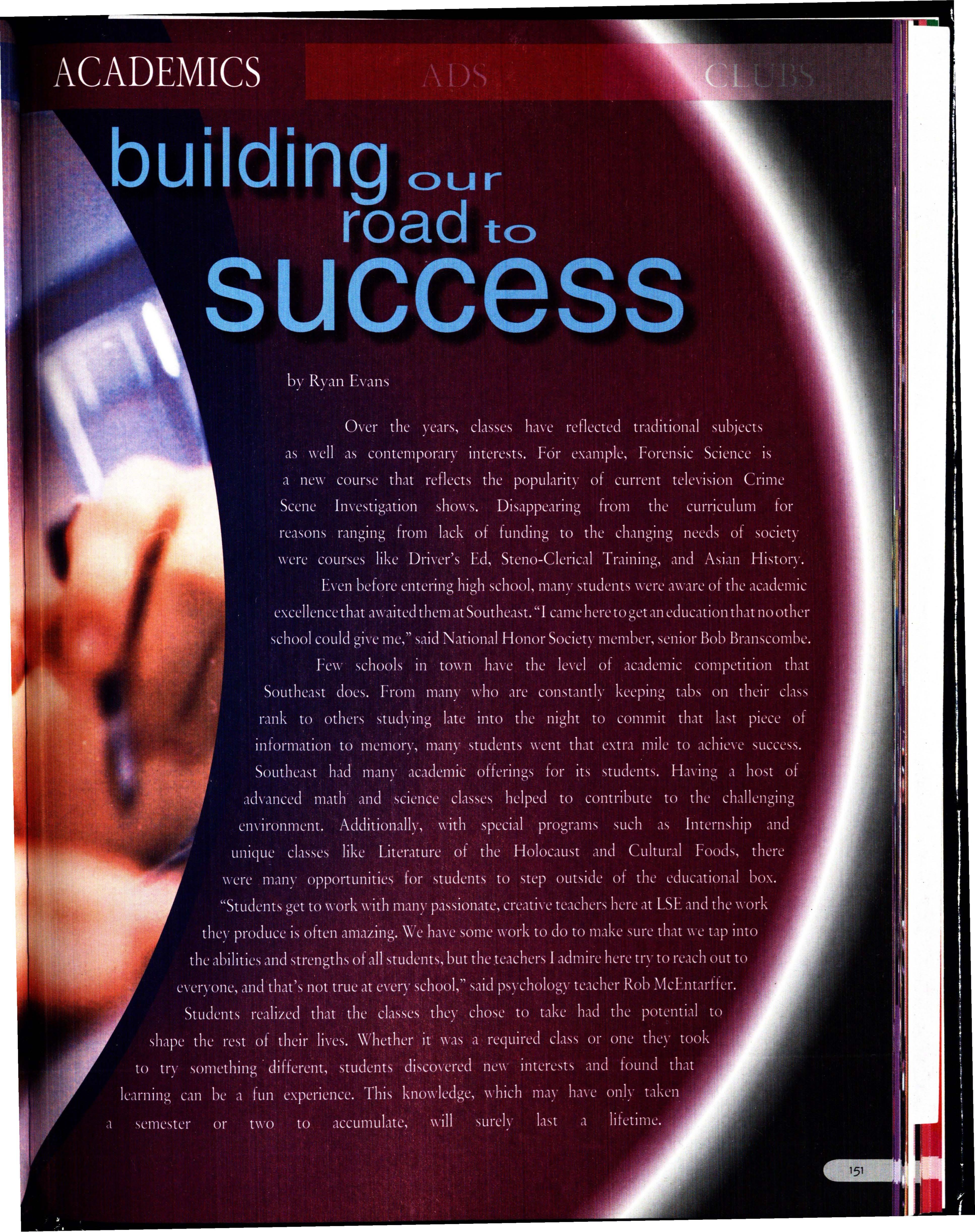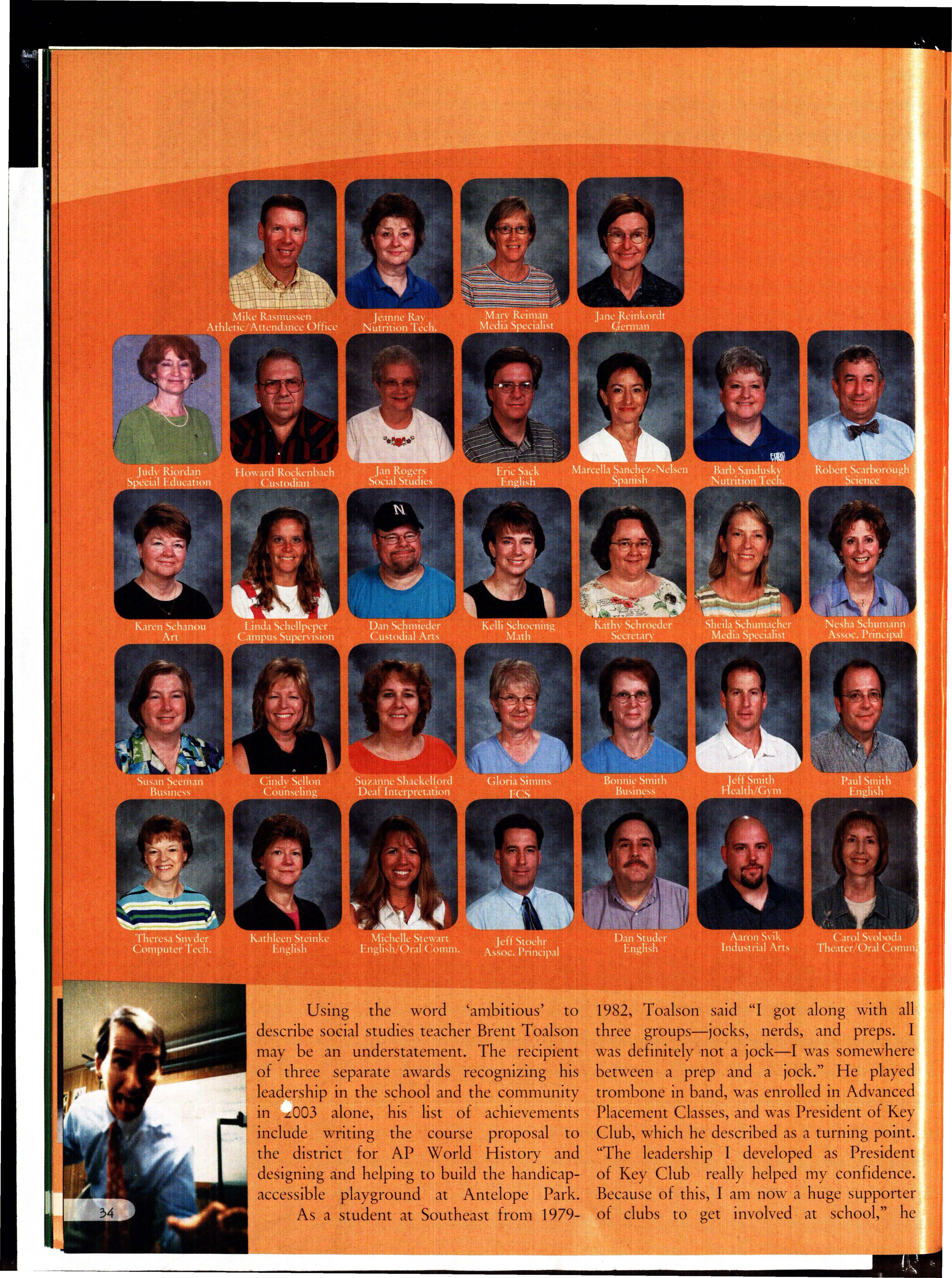 Finally, after thre e yea rs of high school, most seniors are ready to move on, as sen ior Sean Flowerday remarked, "I enjoy being able to look b~c;k on my academic career." While students work through these pr~xesses, the teachers and staff who surro und them do everything possible to provide a nurturing and po sitive learning environment. For the past fifty years, the character of Southeast ha s refused to be determined by the condition of the building. Its nature will always be a reflection of it s people